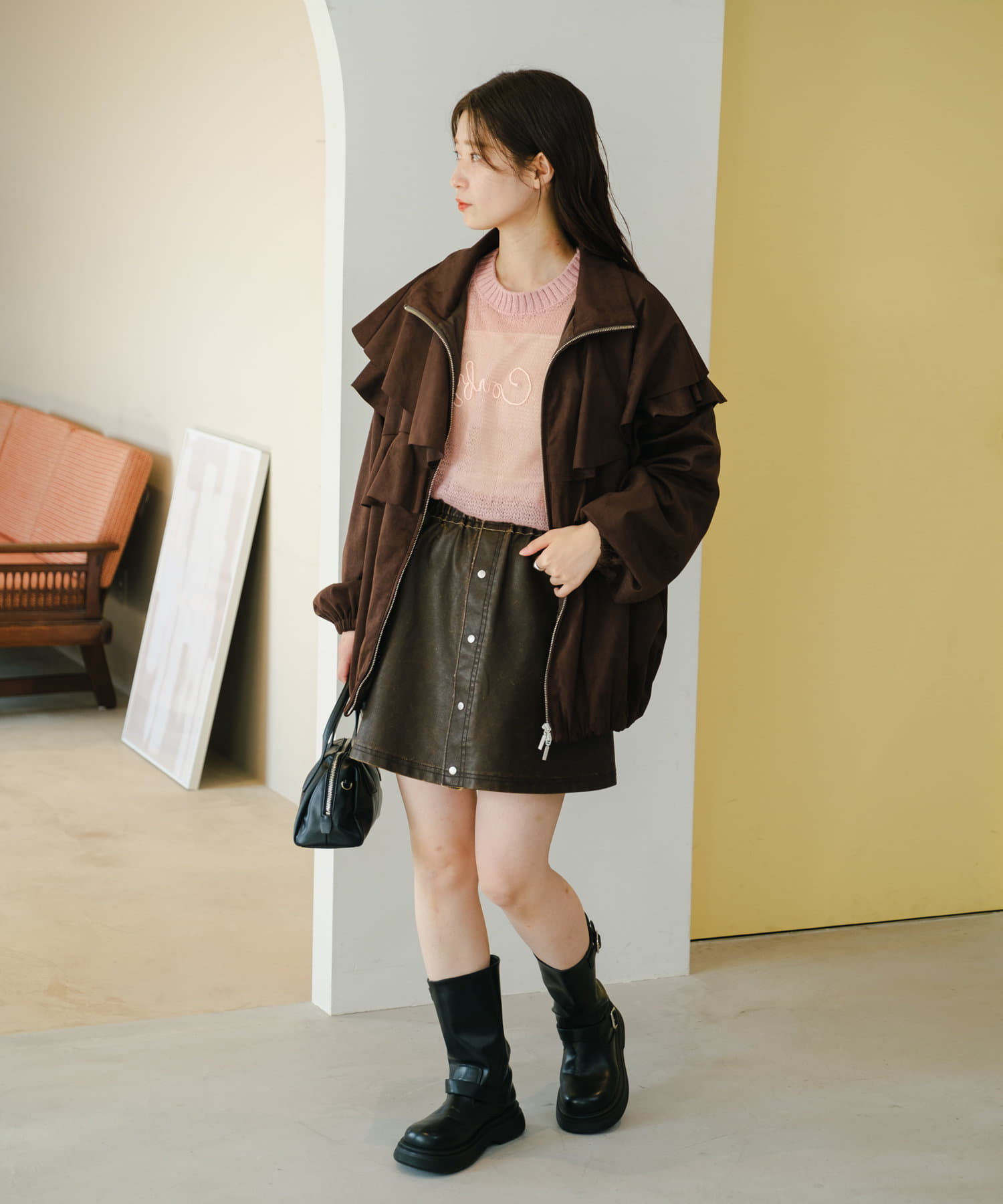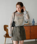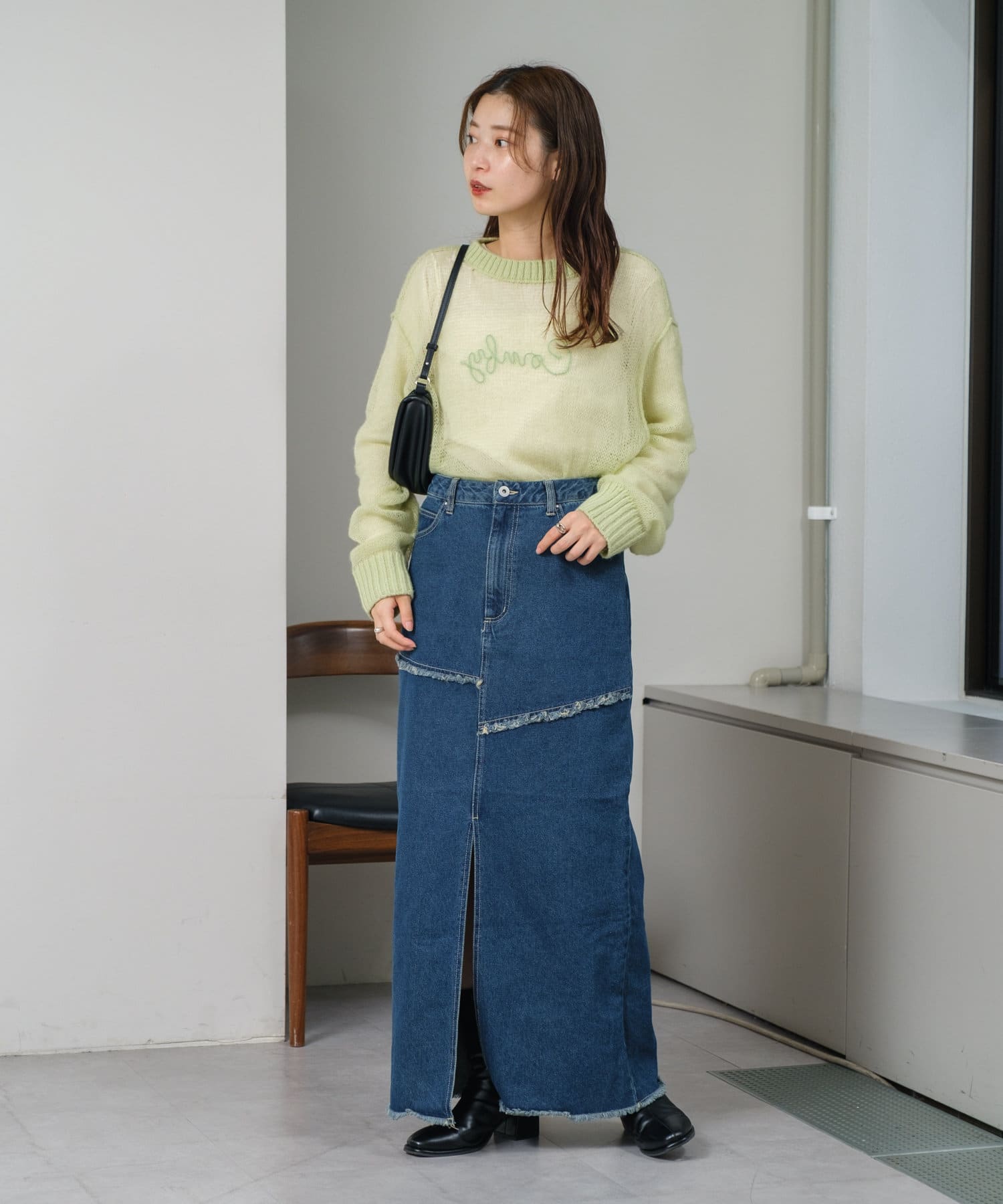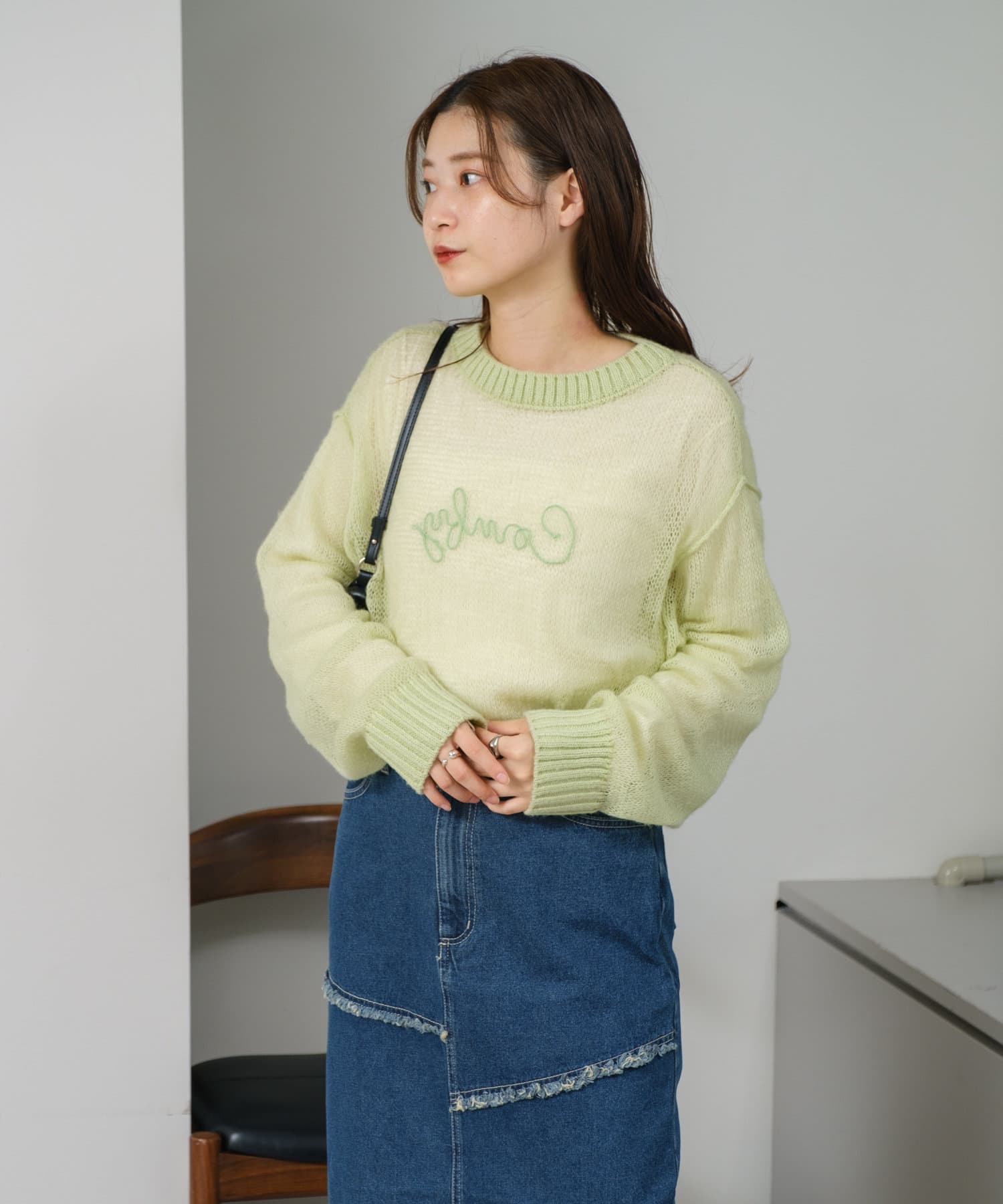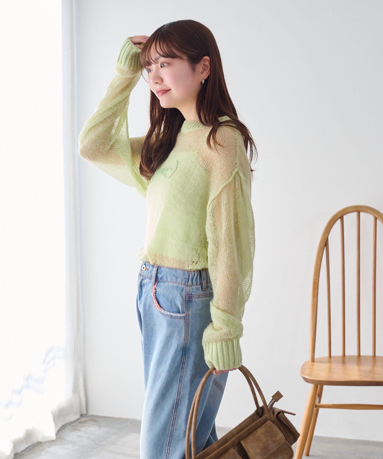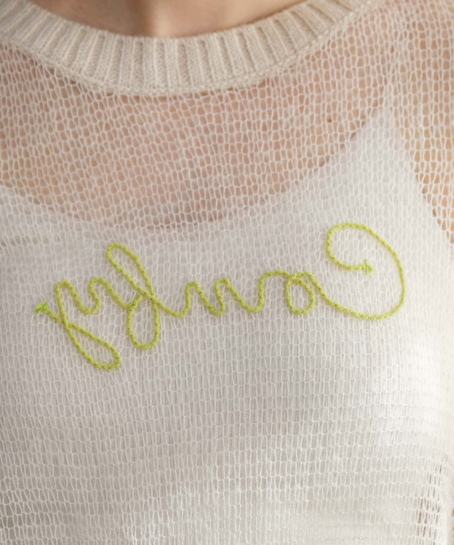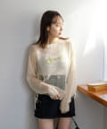 インナーにはロゴや柄入りのキャミソールやタンクトップをレイヤードすると、アクセントが加わります。