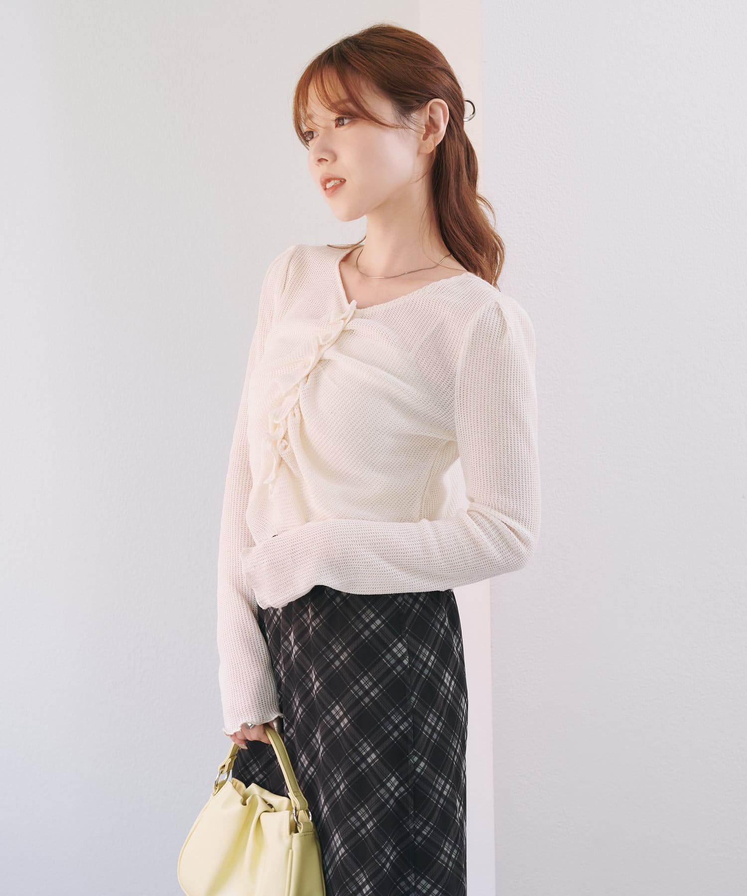 Vネックラインがデコルテをきれいに見せ、顔周りをすっきりとした印象に。