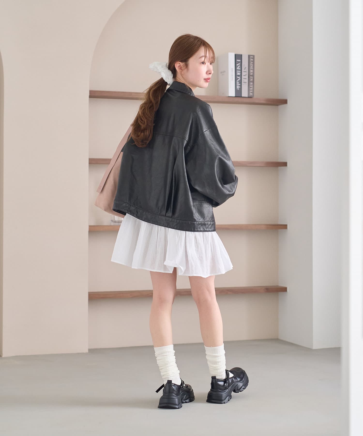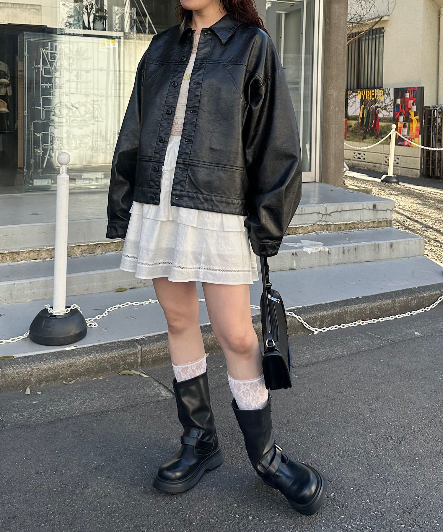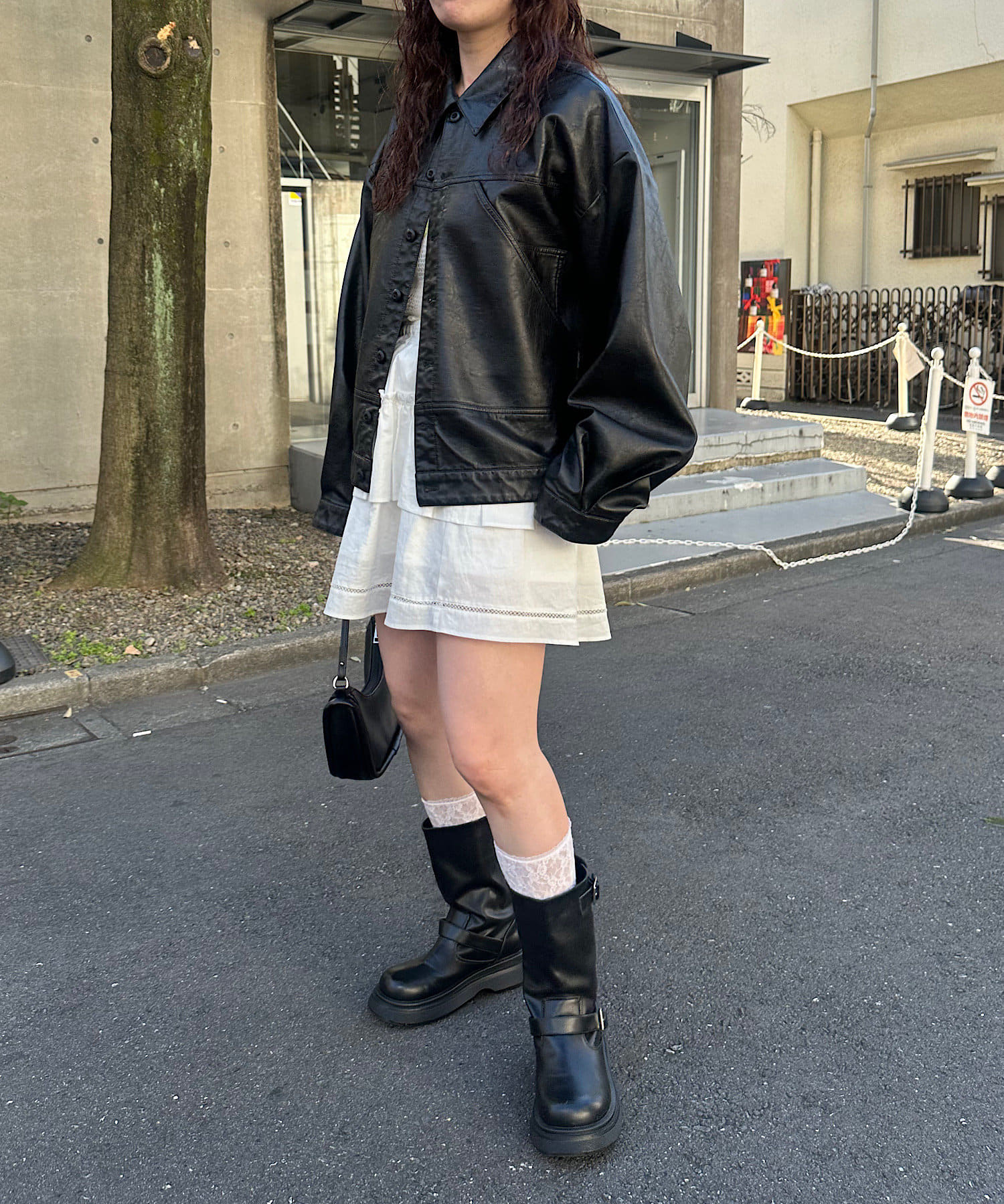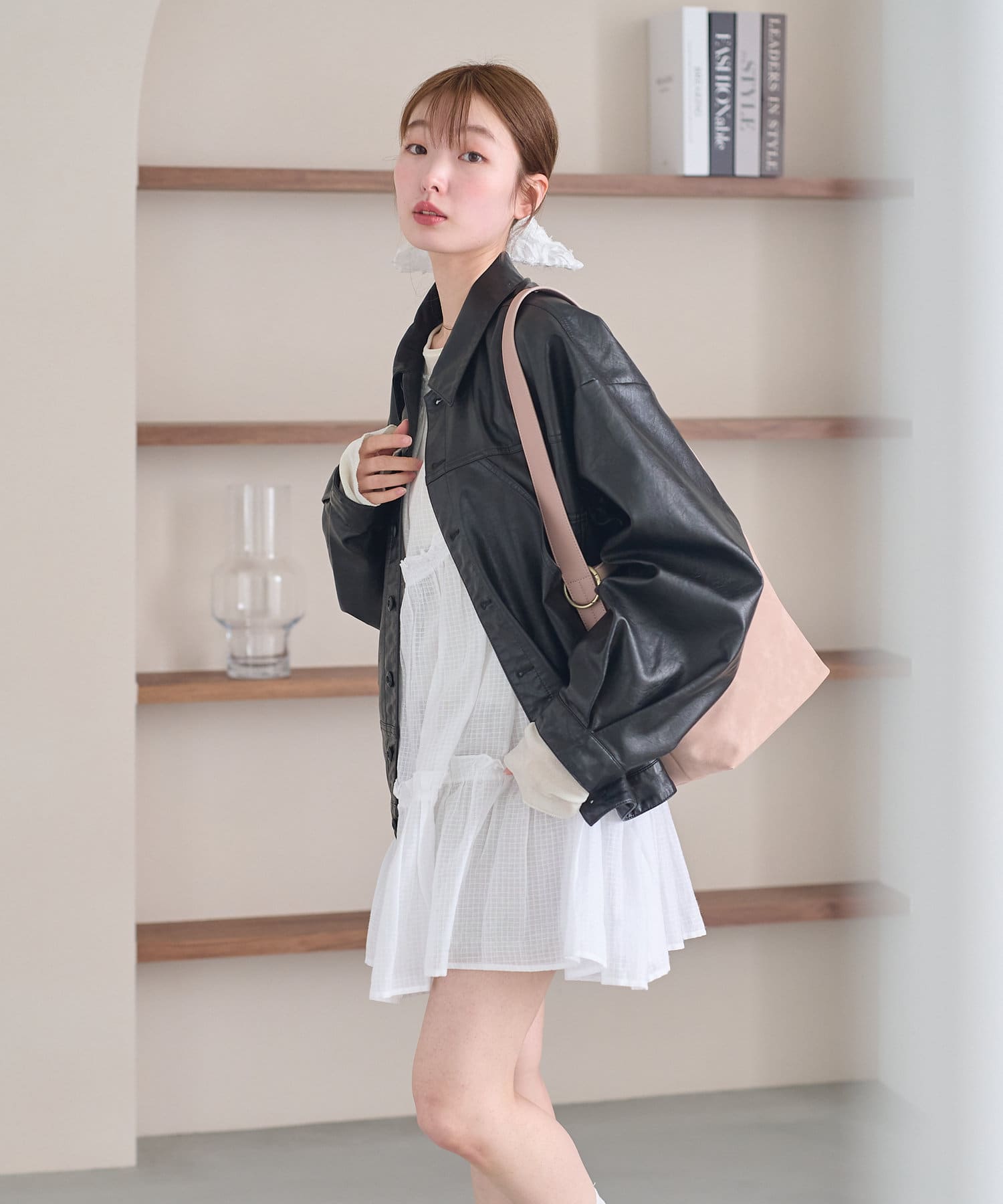 フェミニンなワンピースやフレアスカートと合わせると、レザーアイテムに柔らかさを加えたバランスの良いコーディネートに仕上がります。