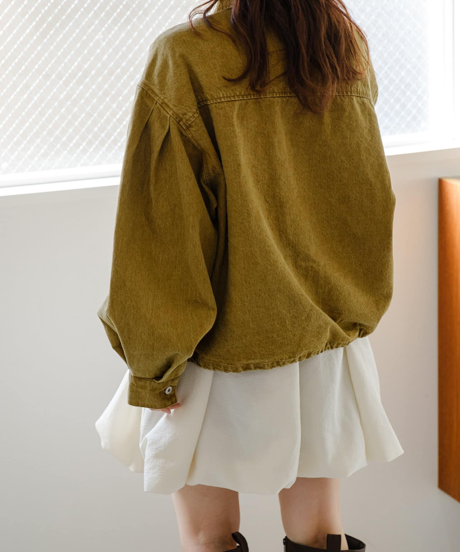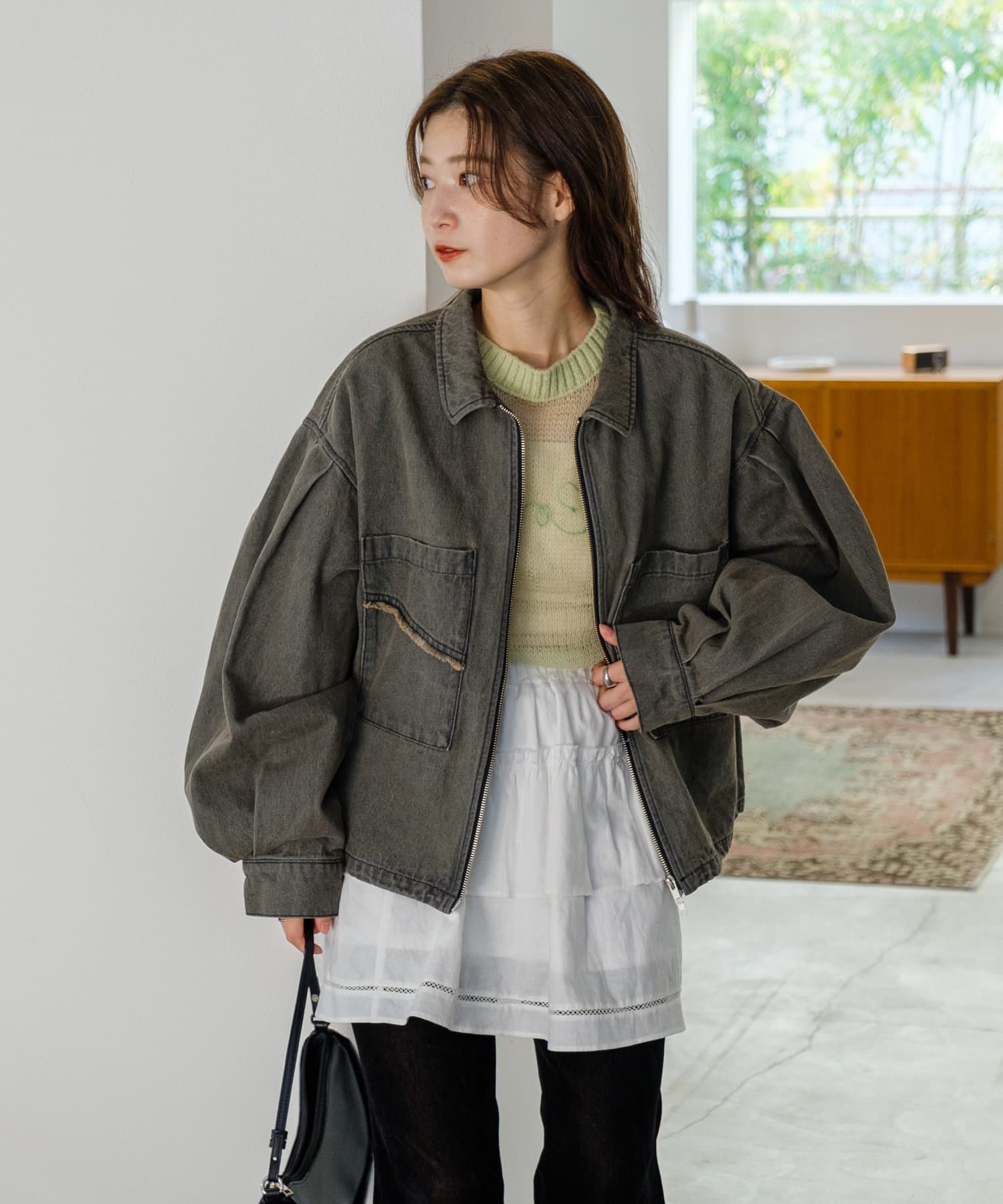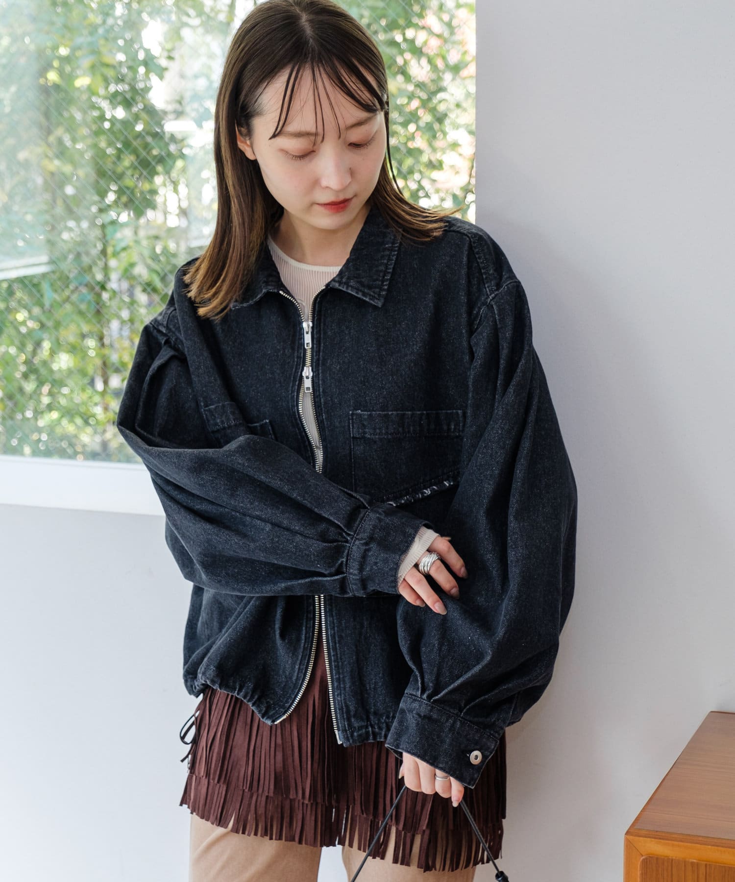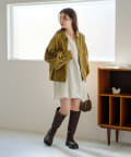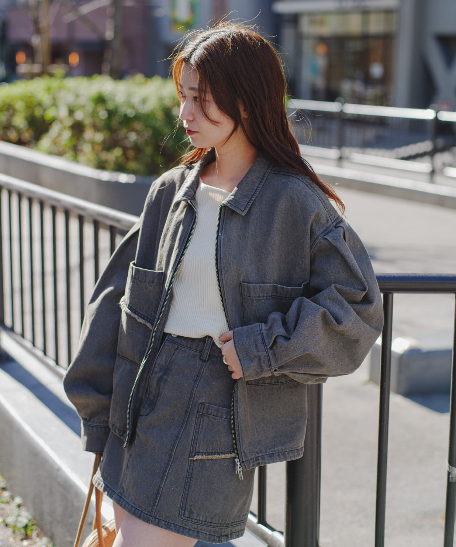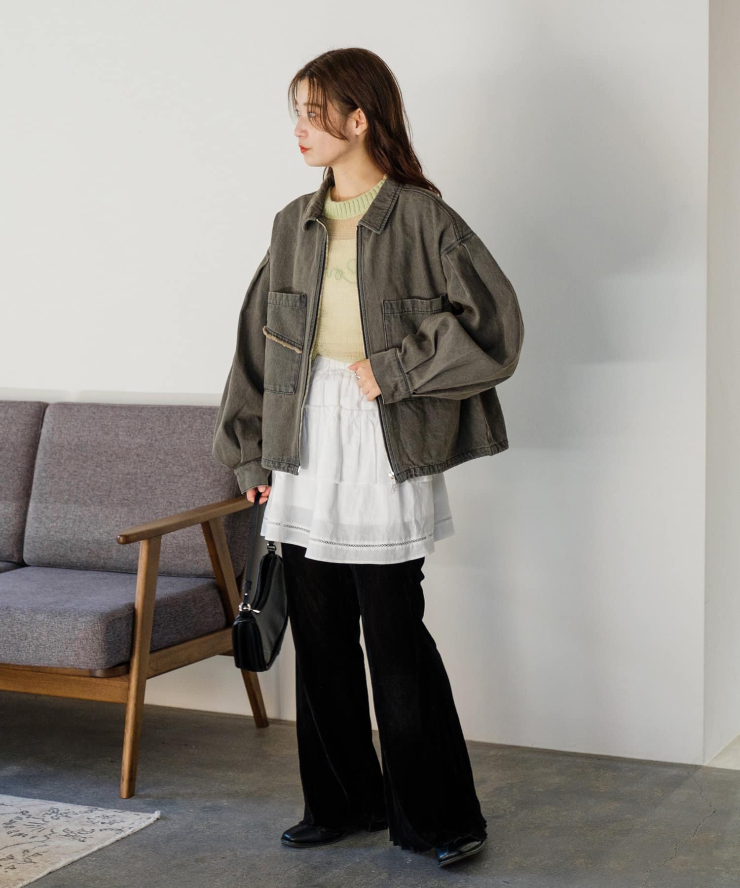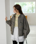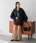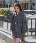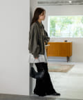 同素材のスカートと合わせて、セットアップでの着こなしもおすすめ。