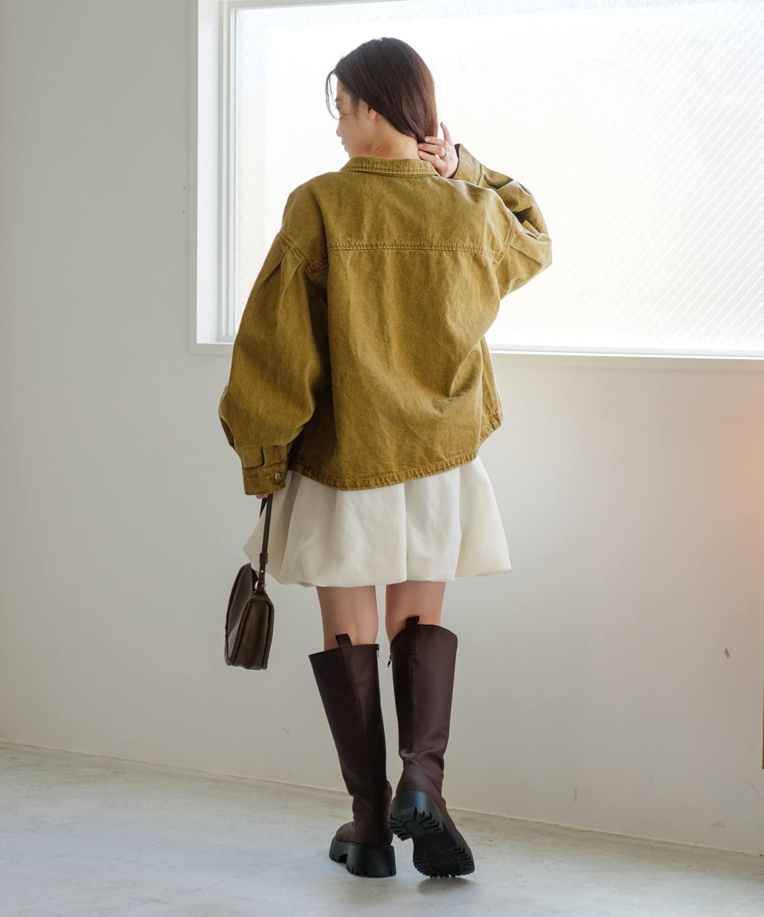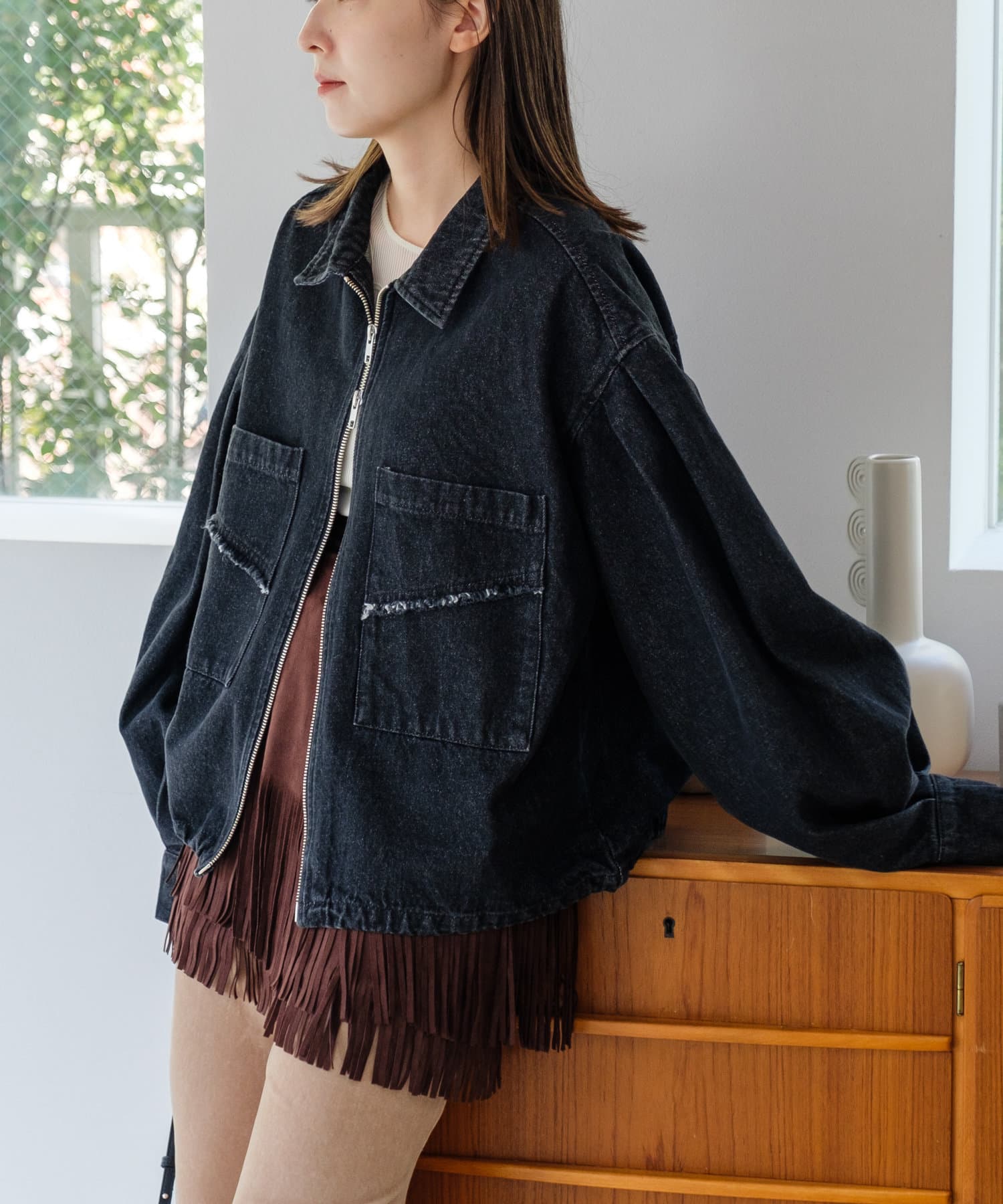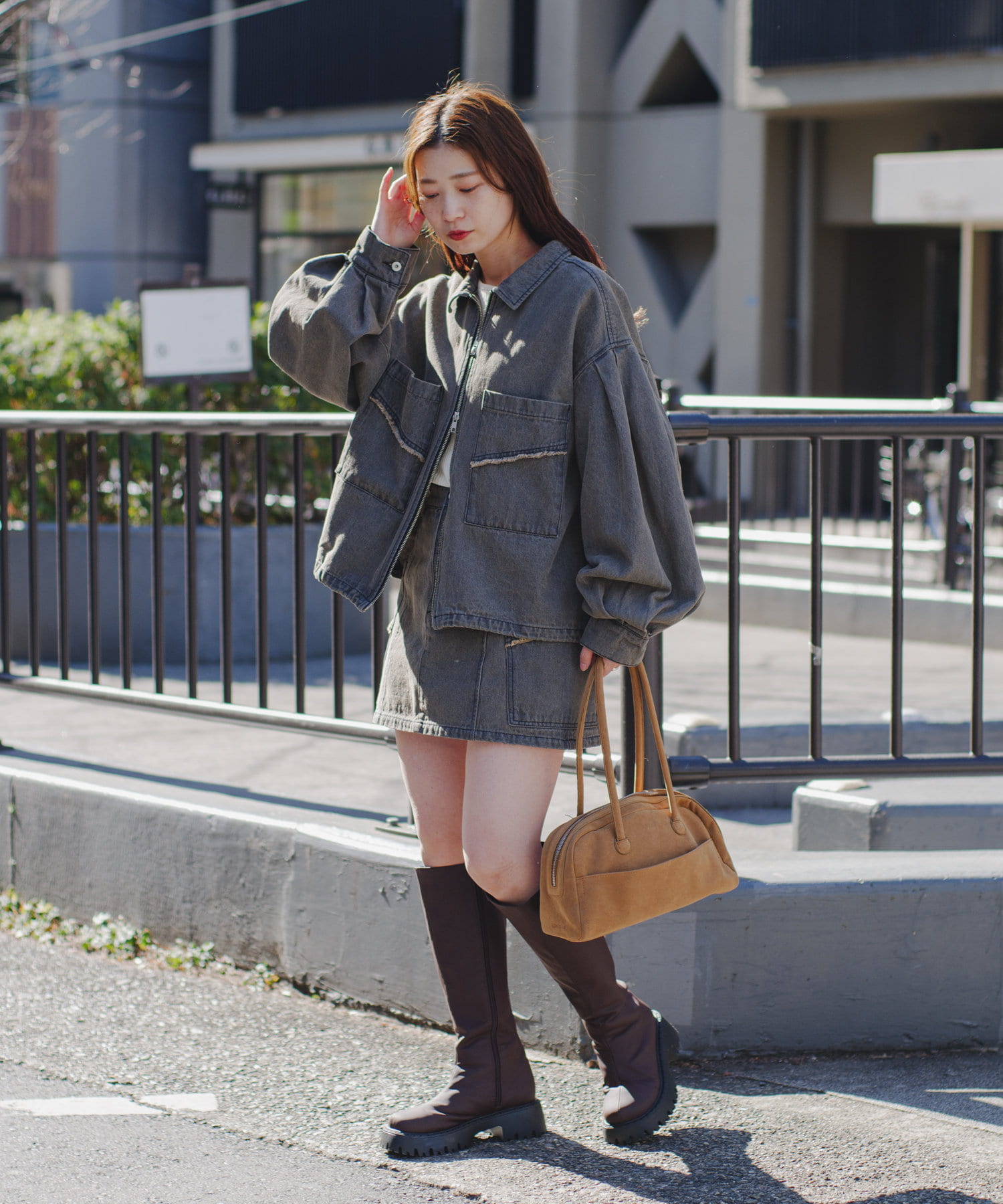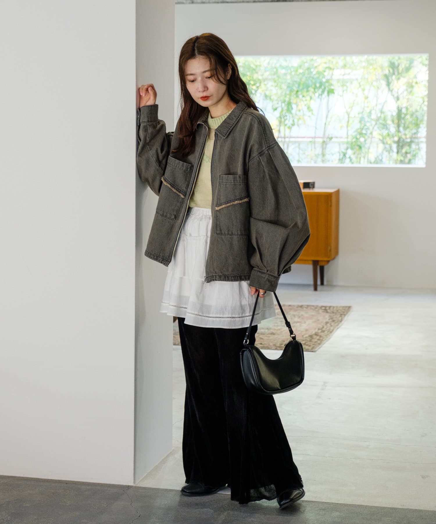同素材のスカートと合わせて、セットアップでの着こなしもおすすめ。