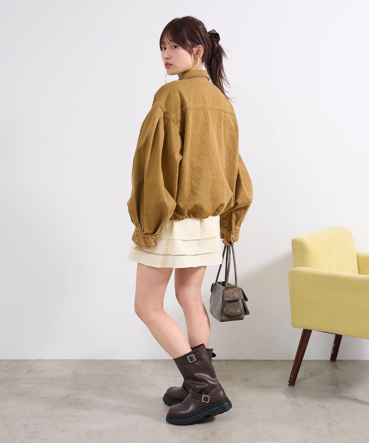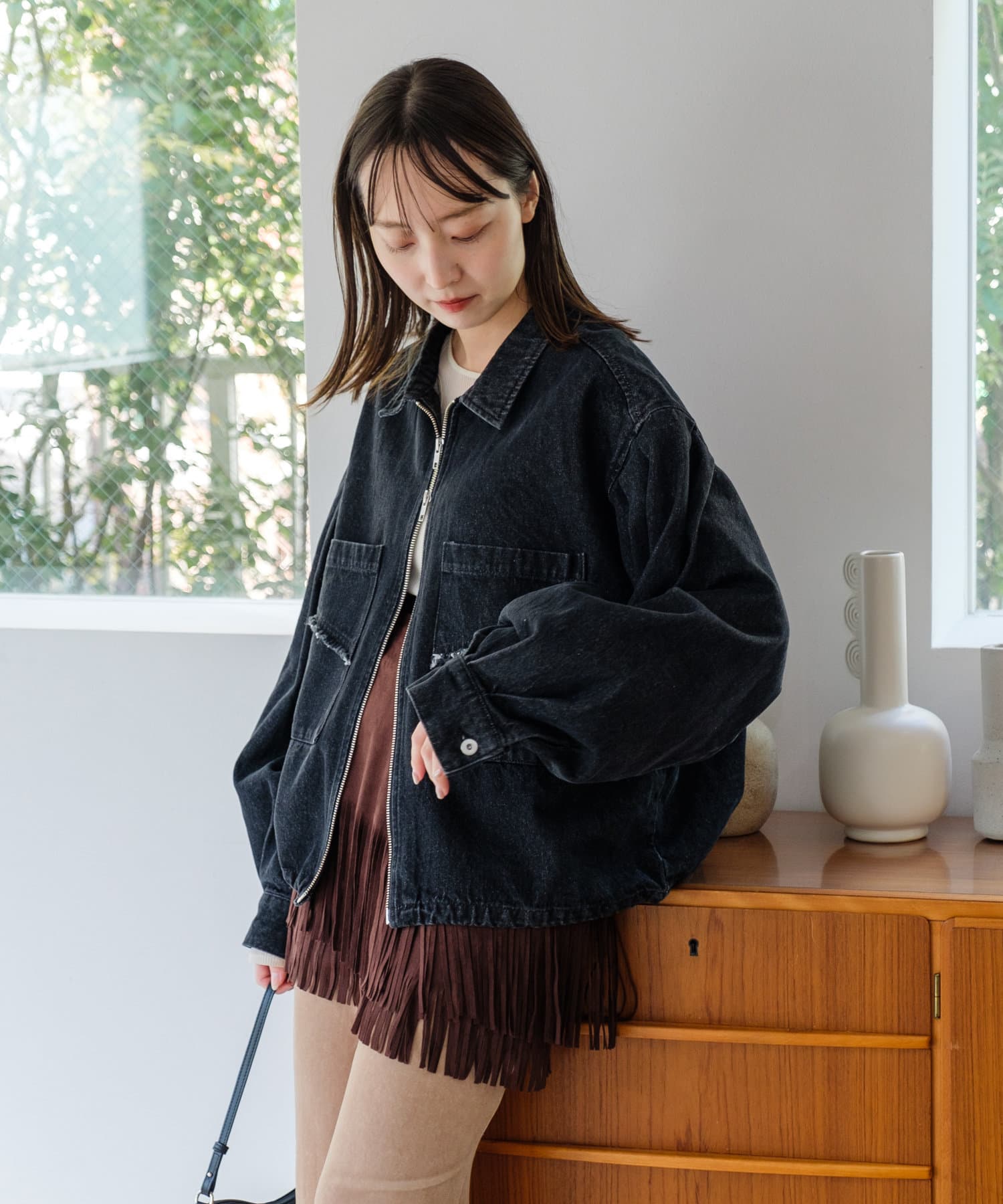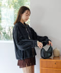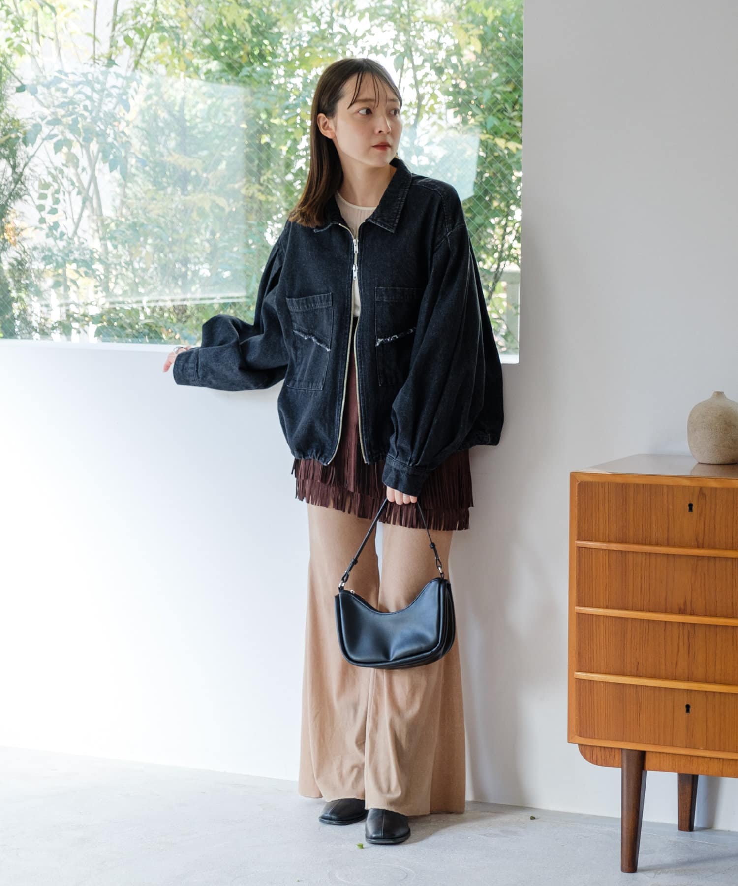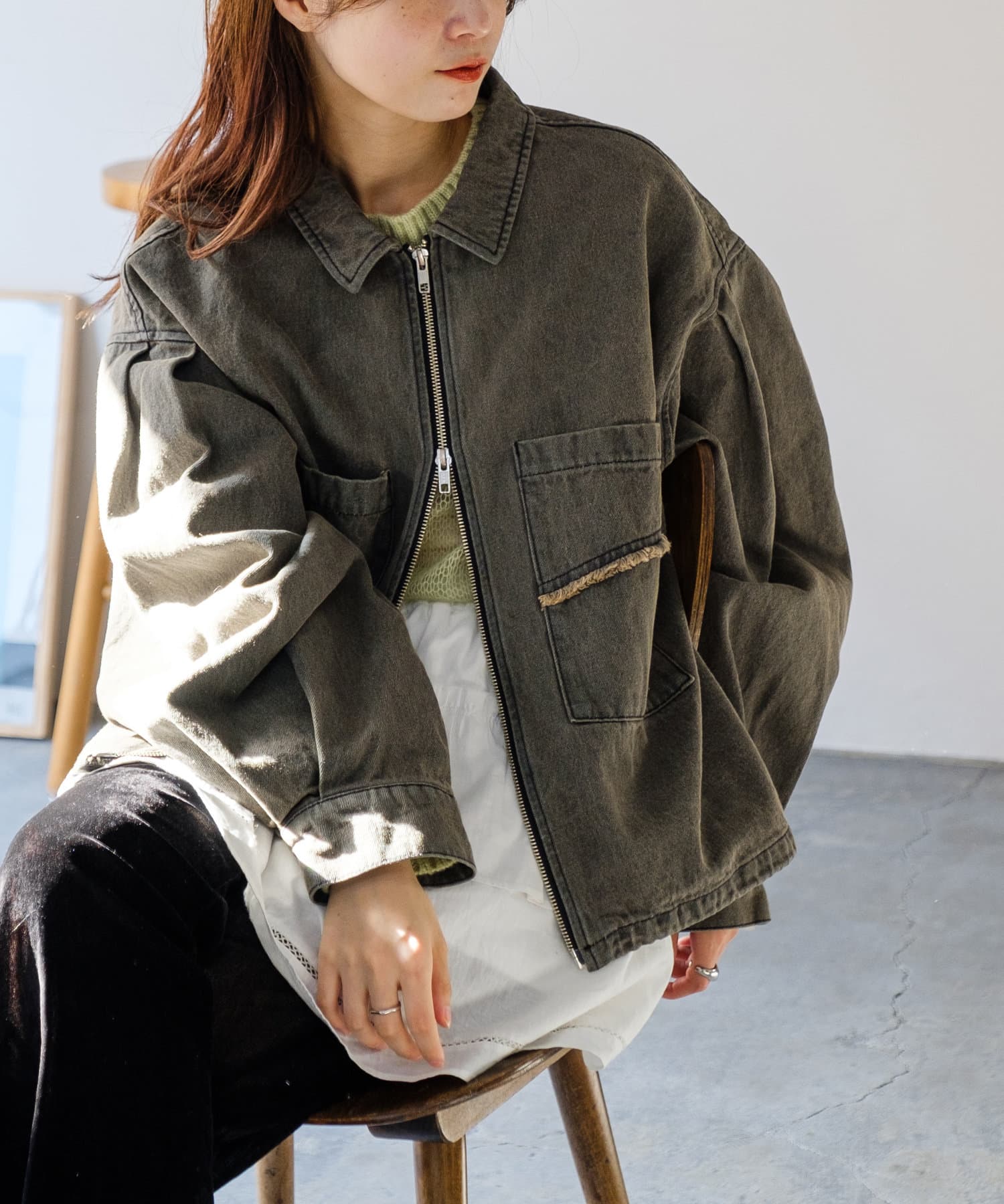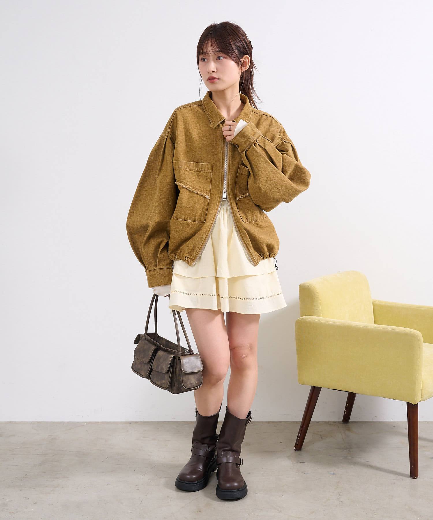 同素材のスカートと合わせて、セットアップでの着こなしもおすすめ。