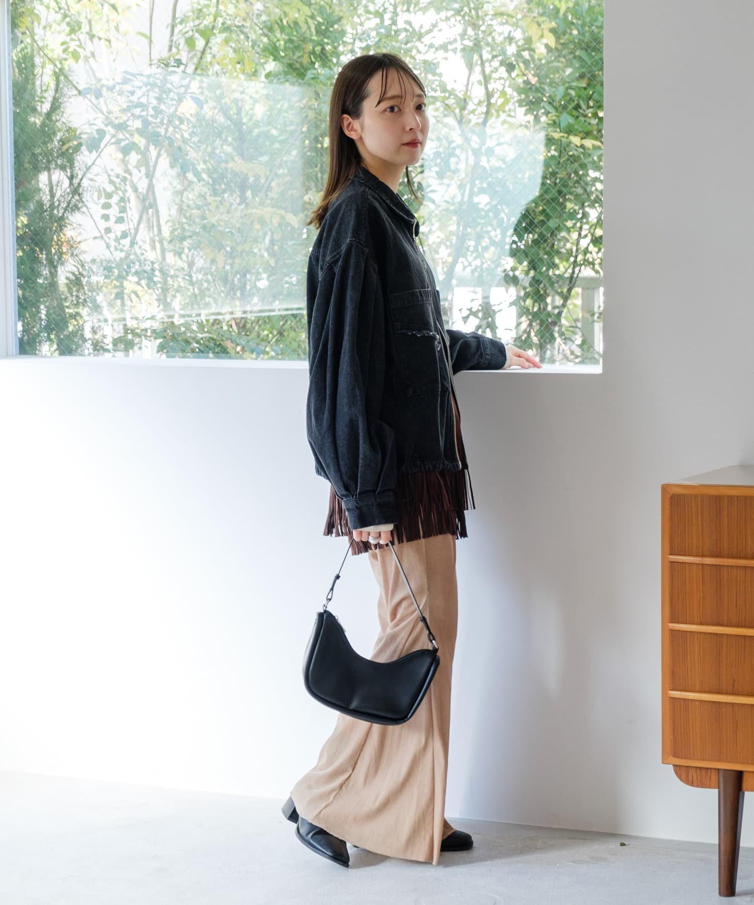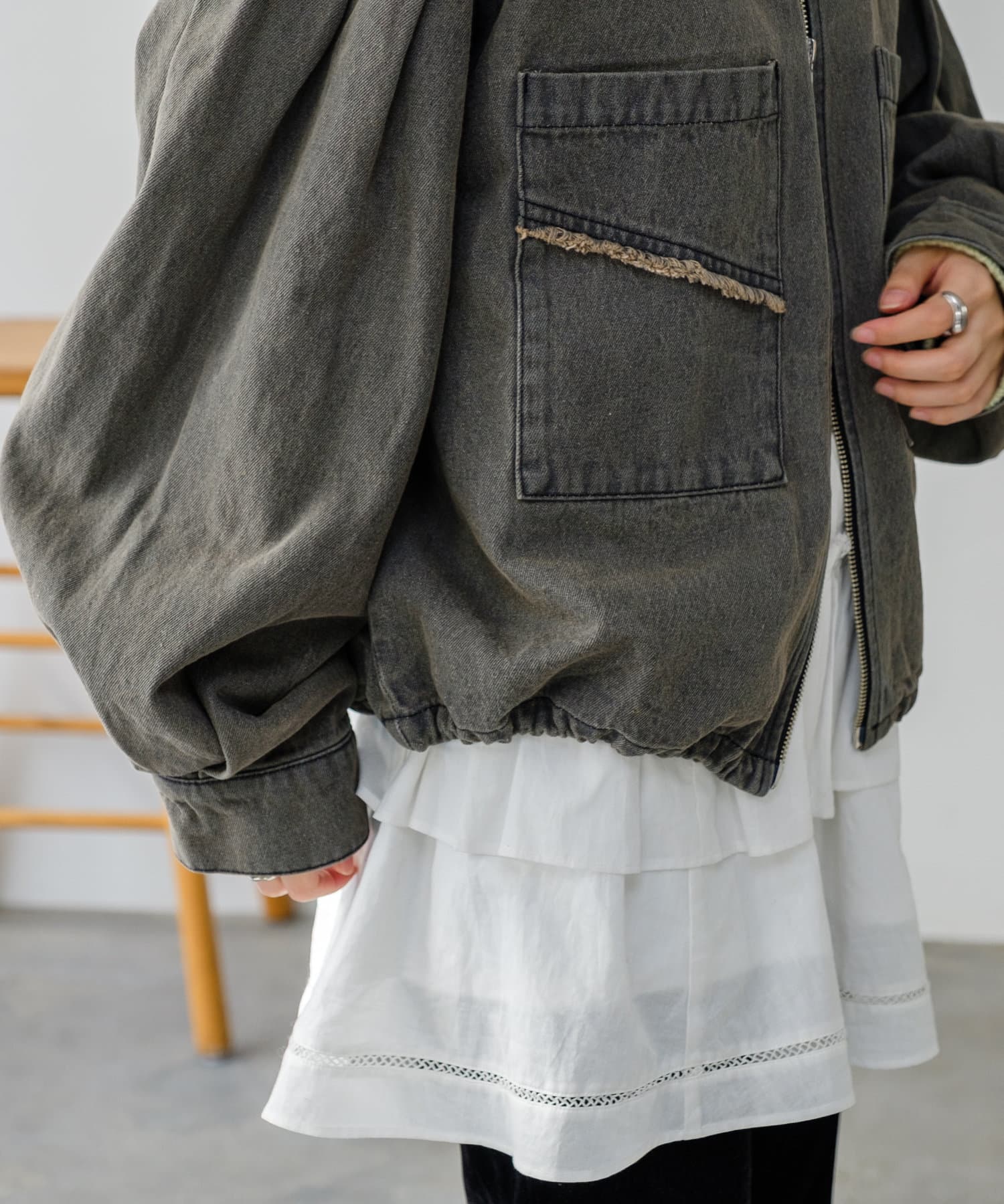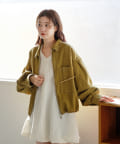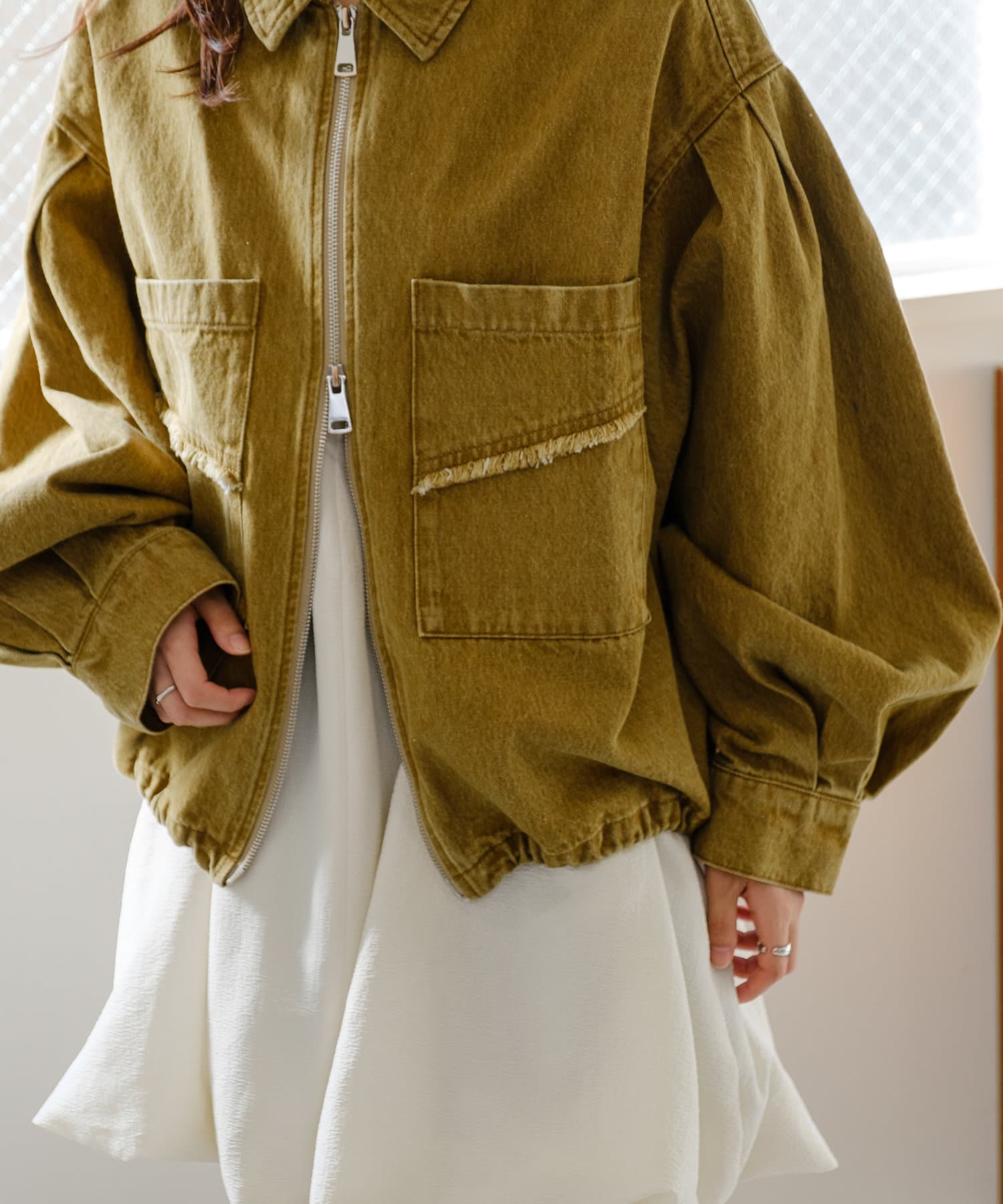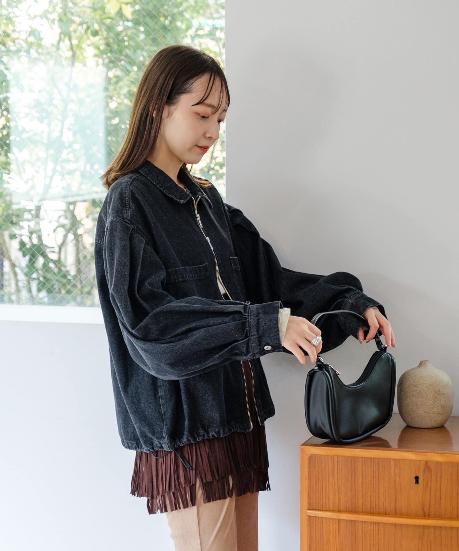 同素材のスカートと合わせて、セットアップでの着こなしもおすすめ。