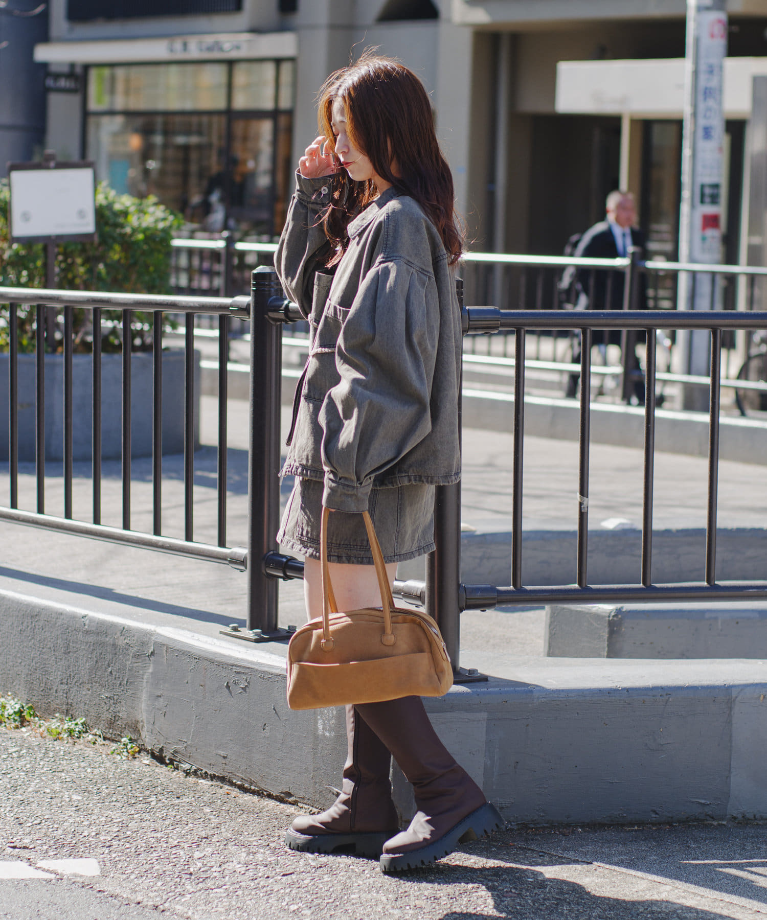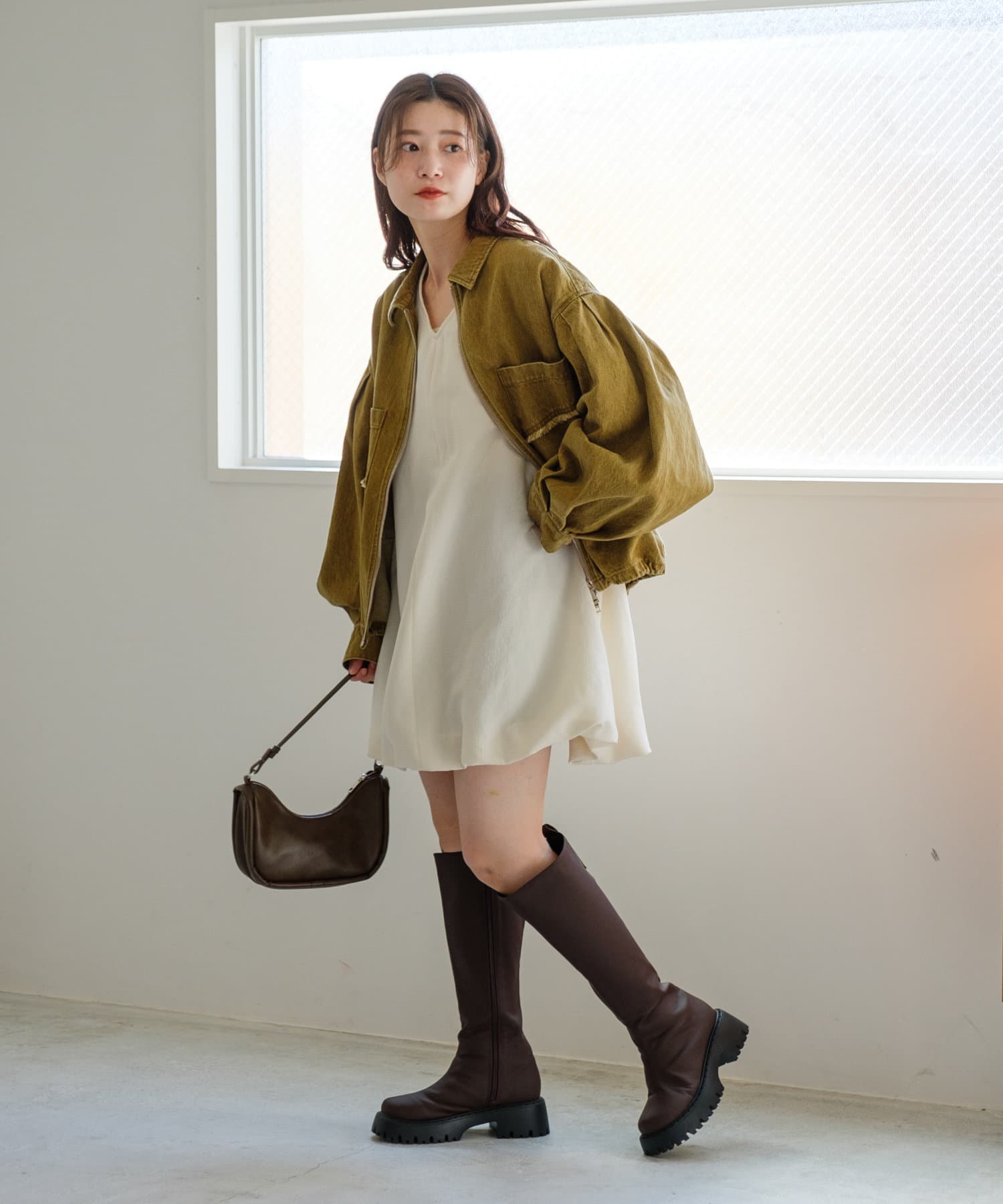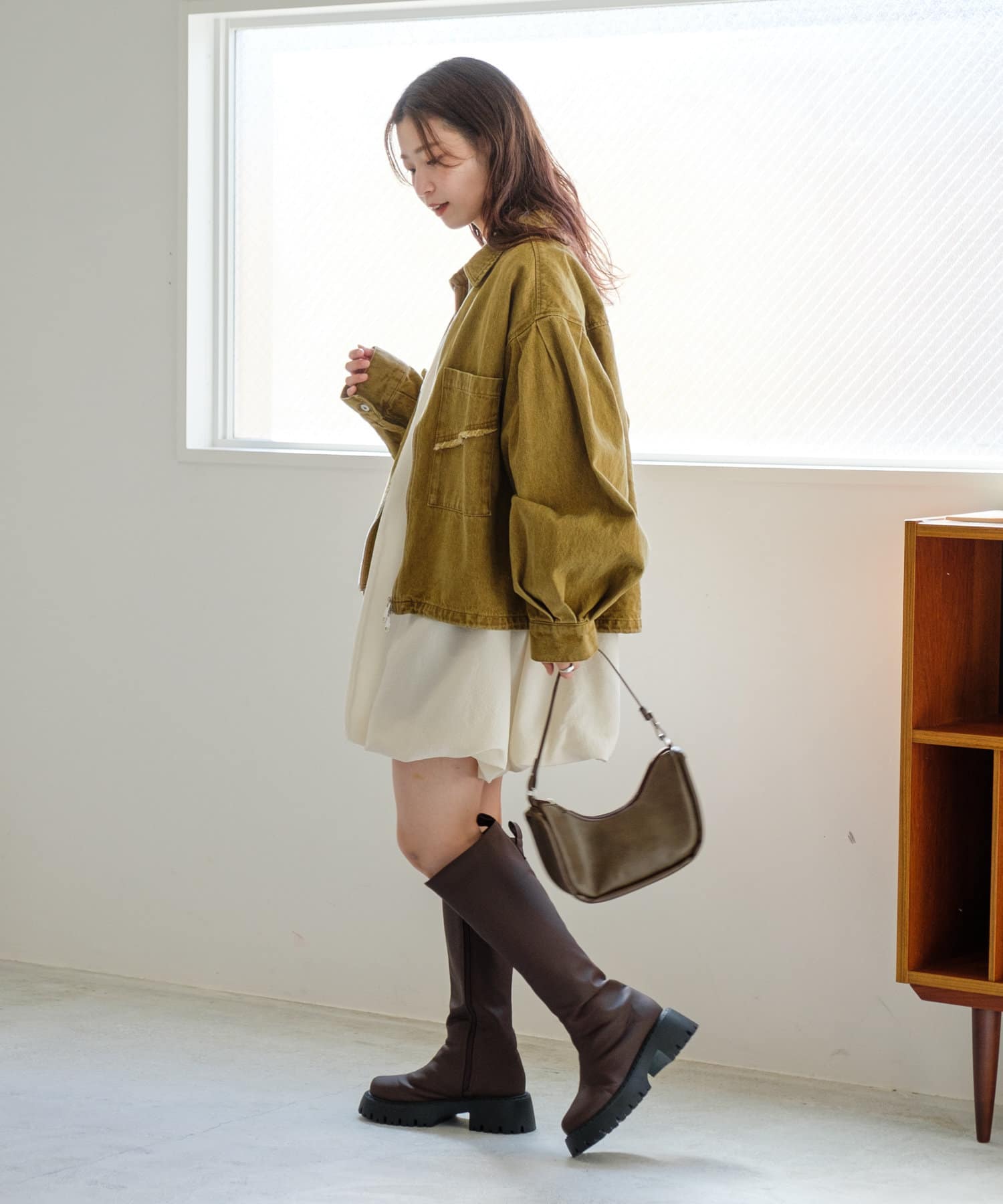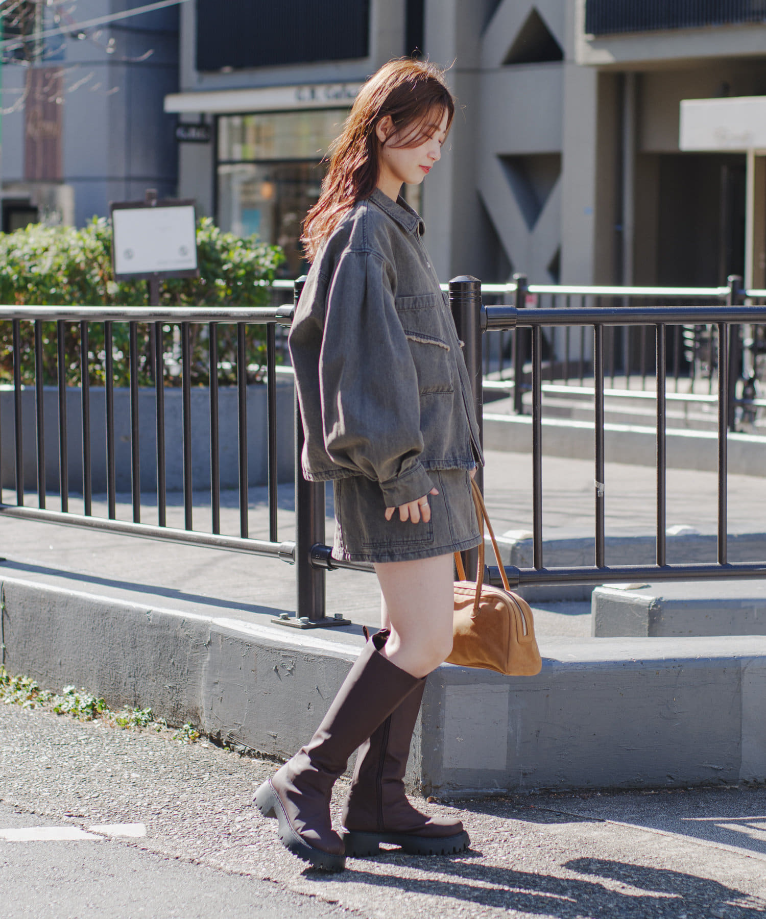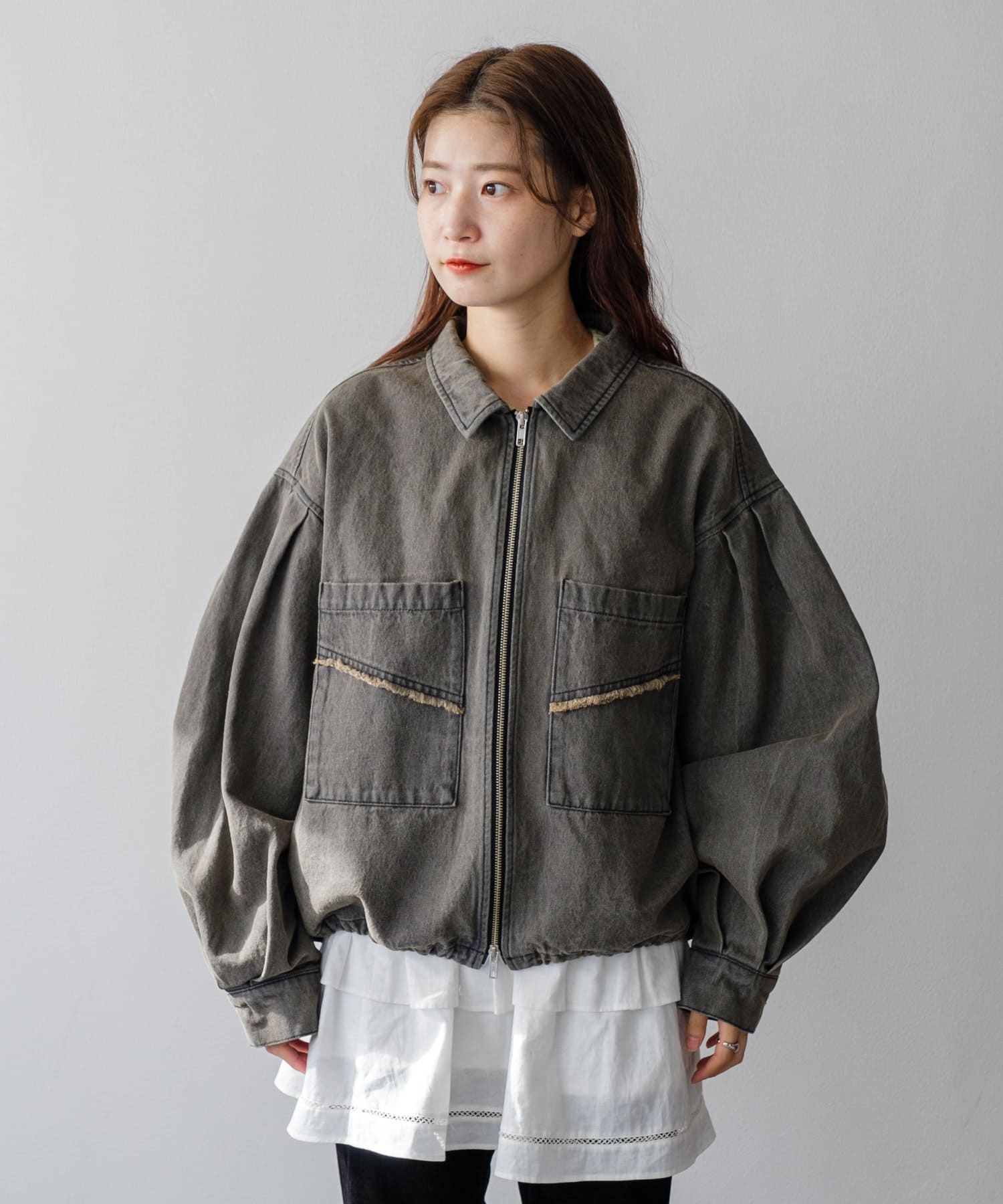 同素材のスカートと合わせて、セットアップでの着こなしもおすすめ。