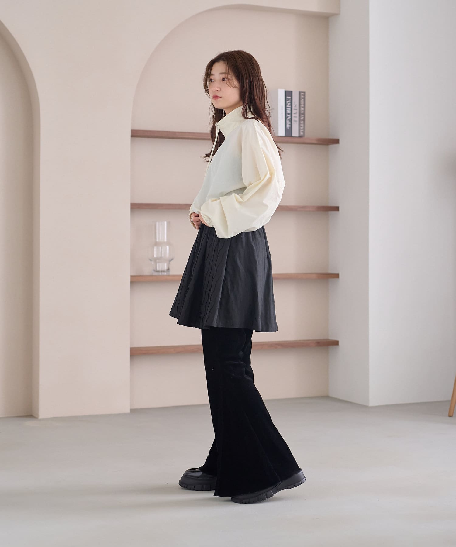 レーススカートやプリーツスカートを合わせた甘辛MIXなスタイリングもおすすめです。