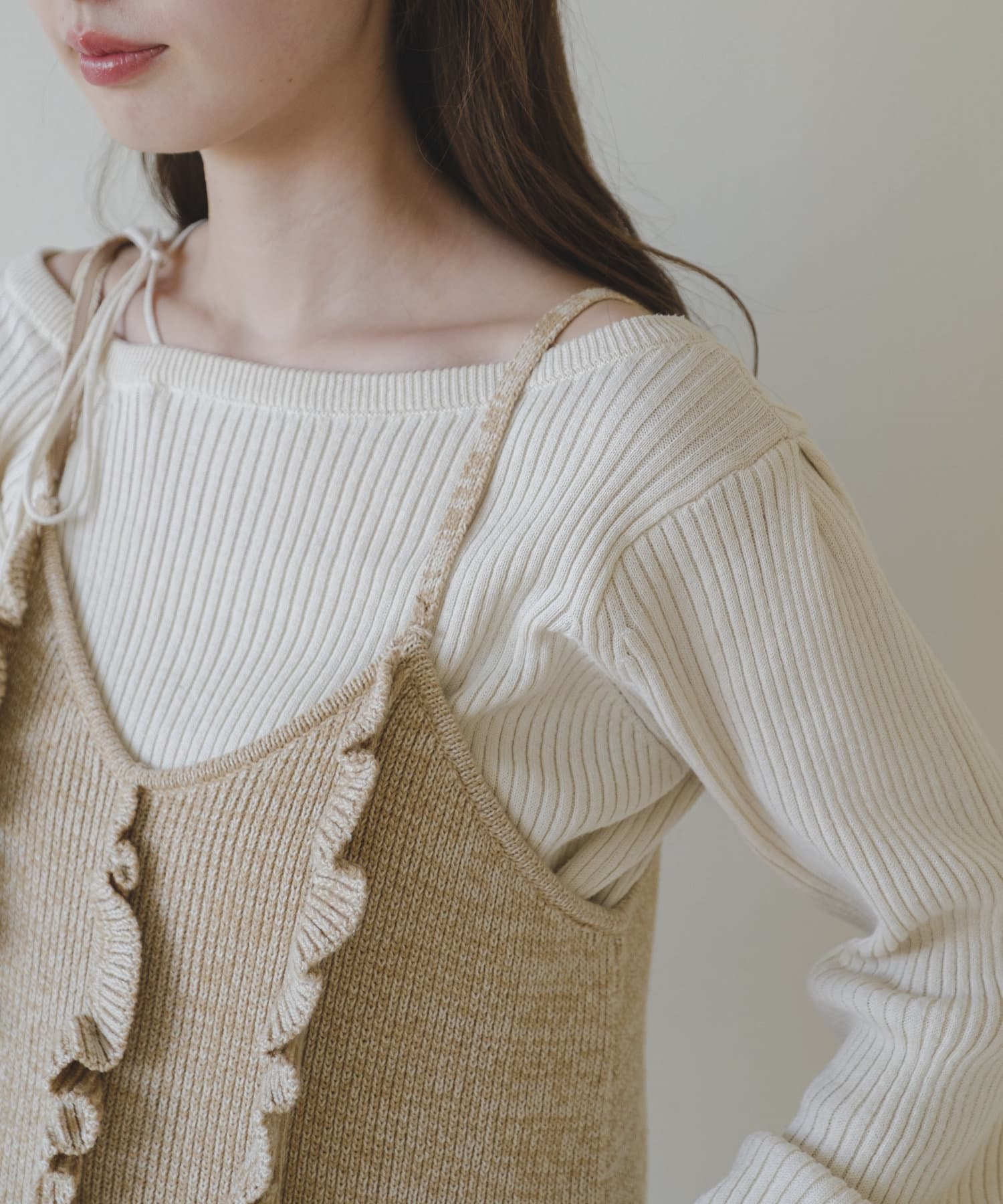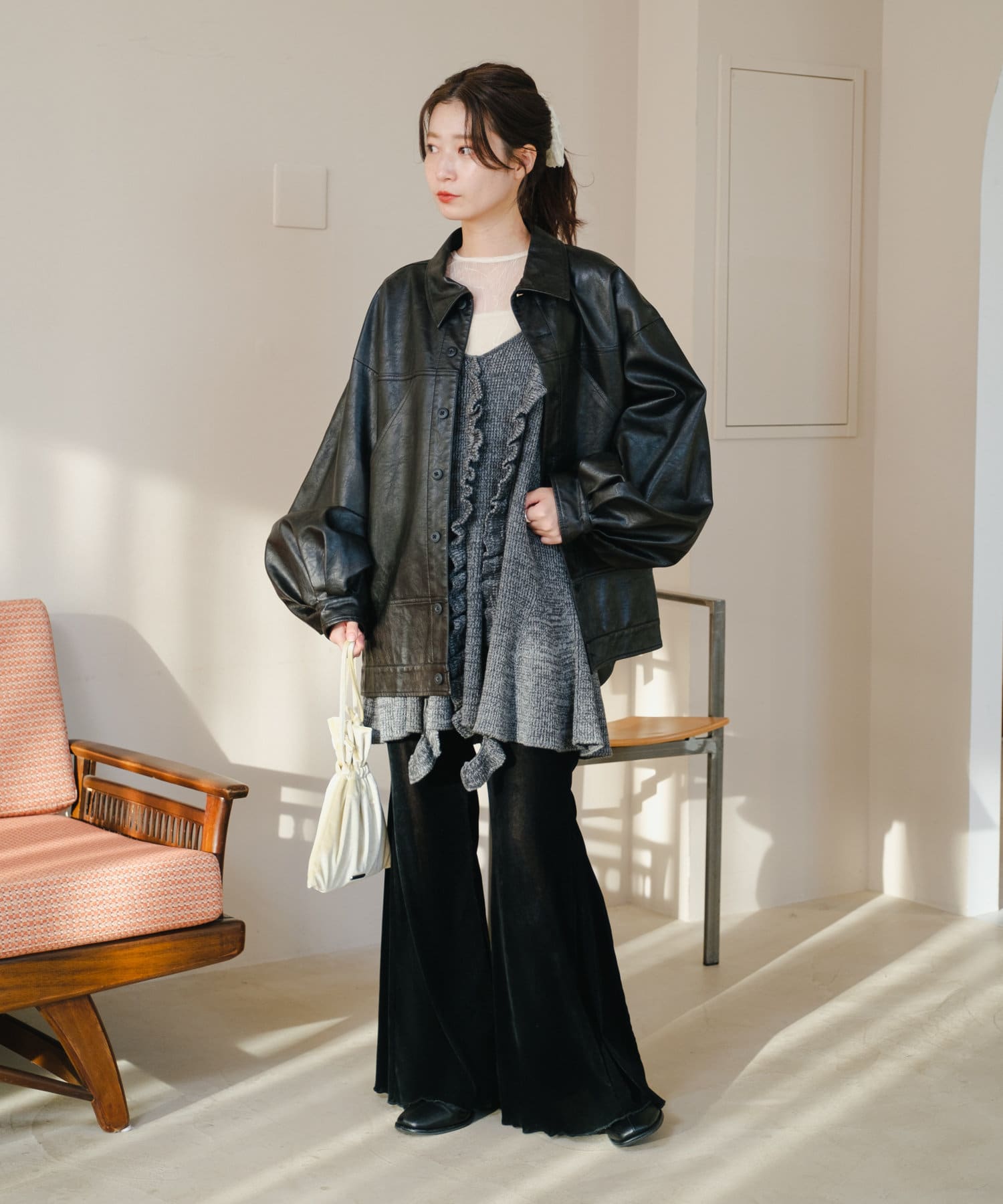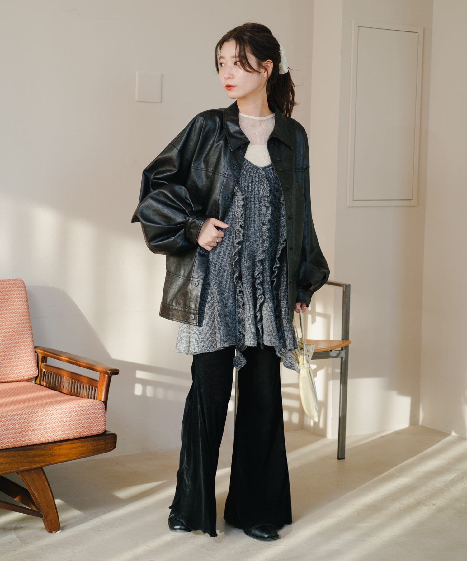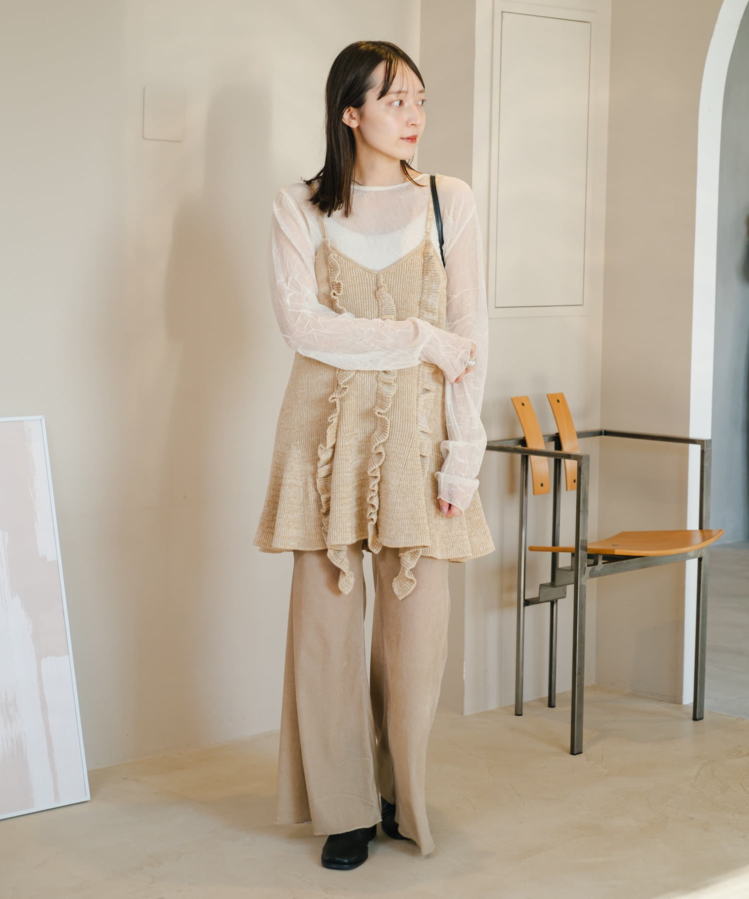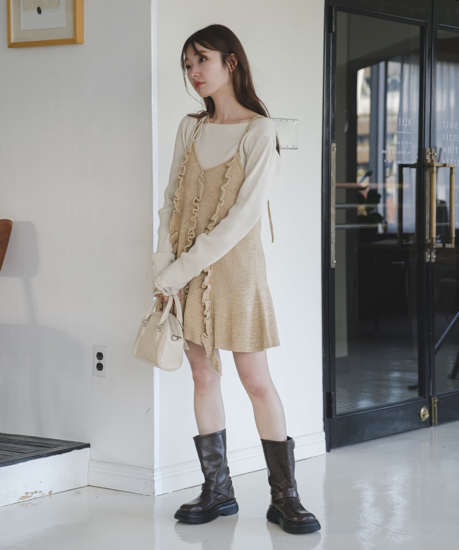 リブニットやフリルブラウスをインナーに合わせるとフェミニンなスタイルに仕上がります。