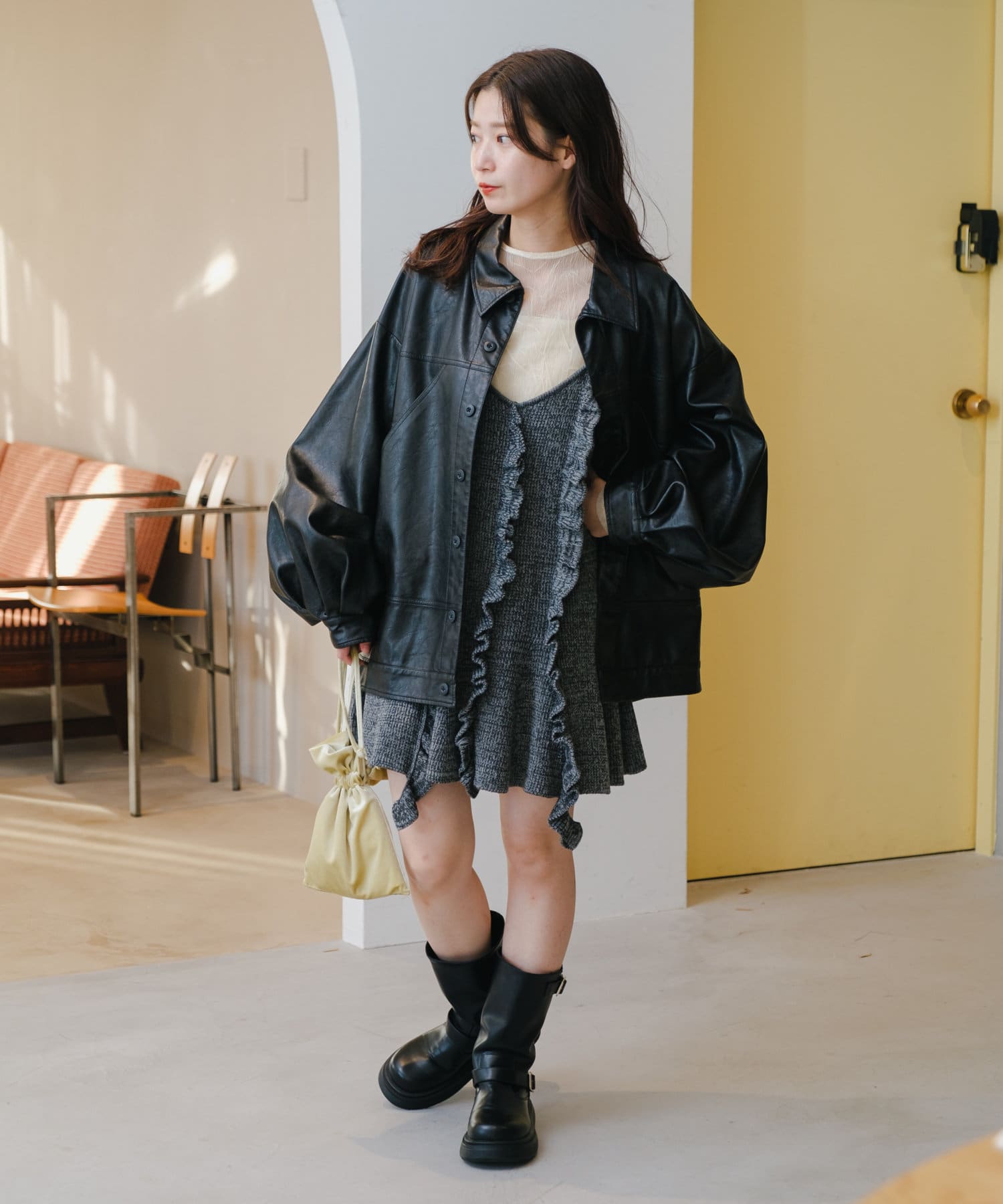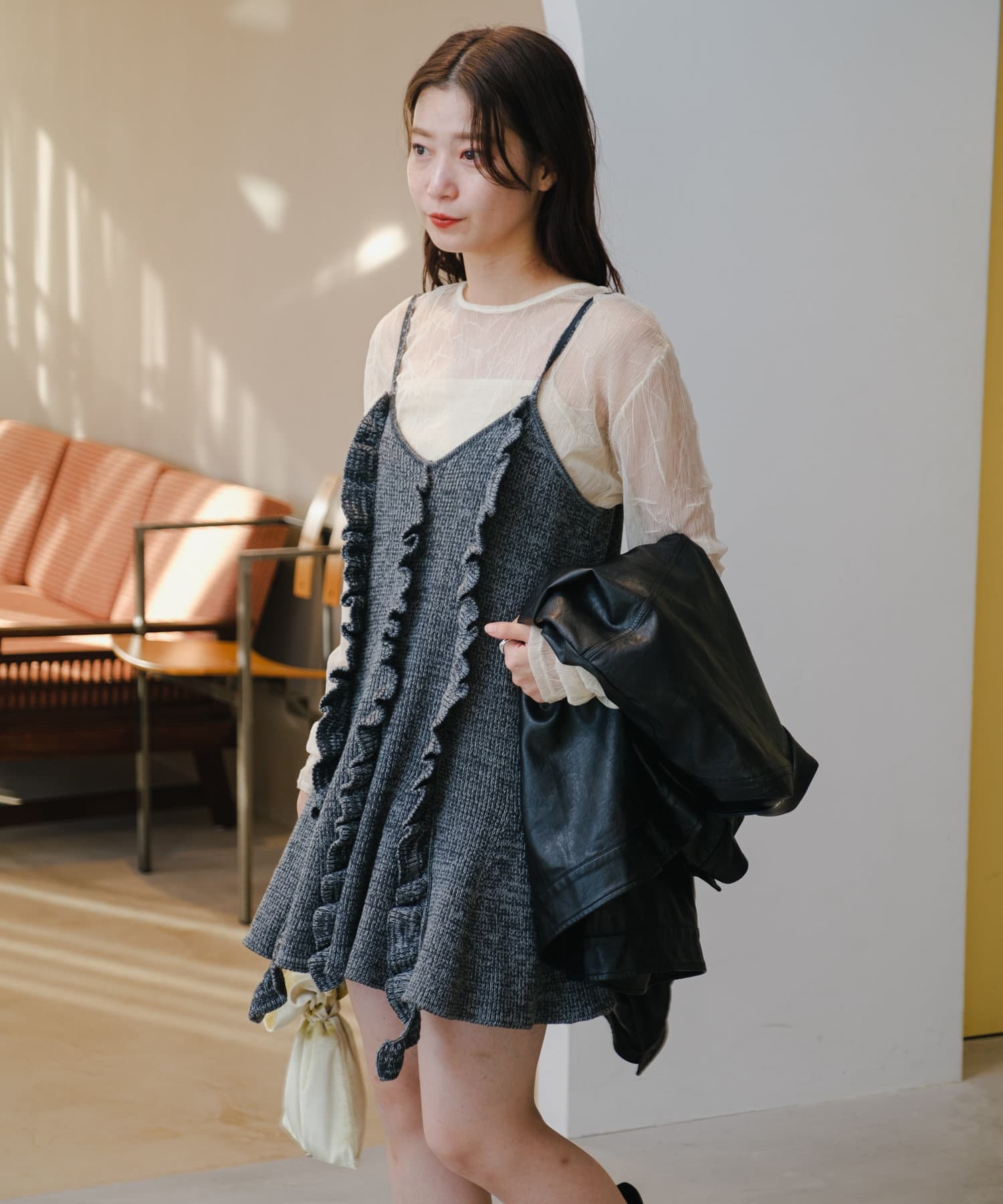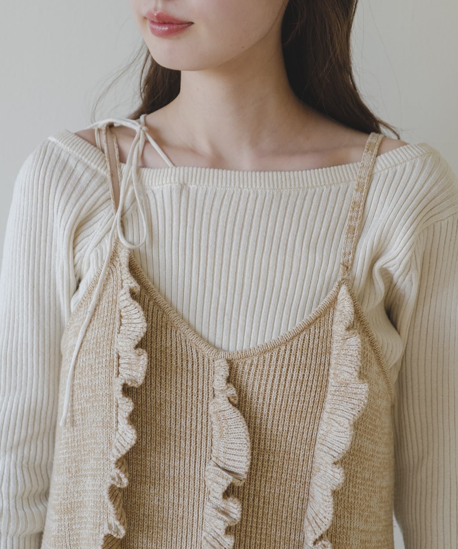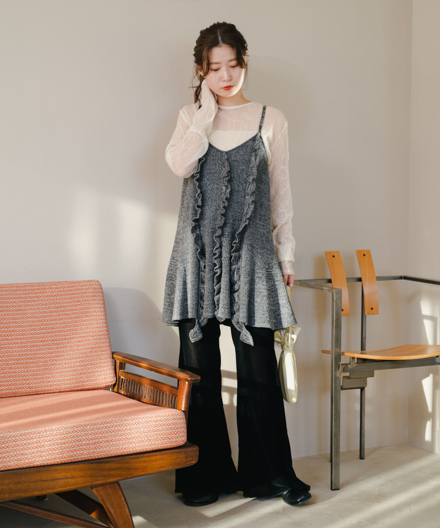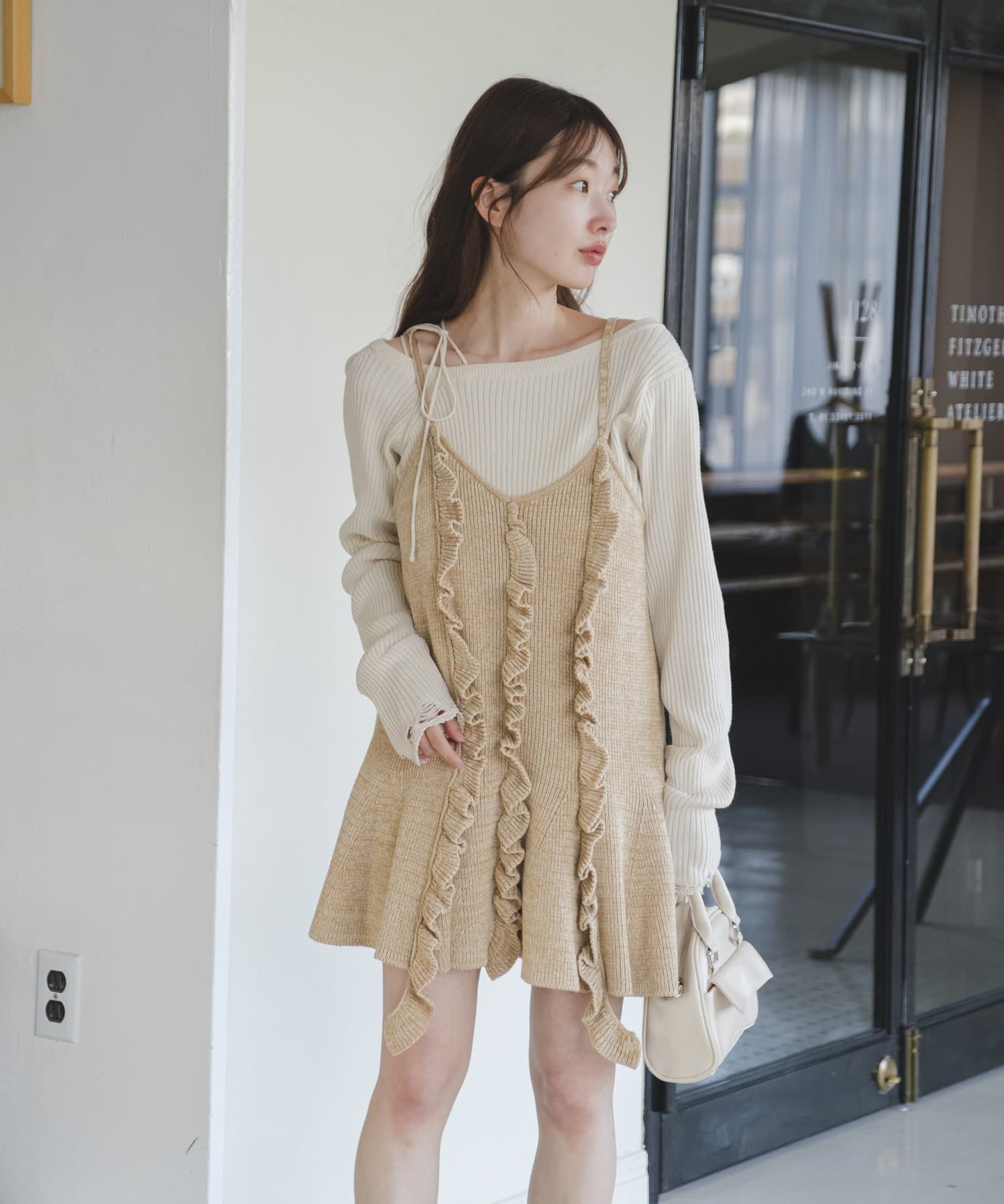 リブニットやフリルブラウスをインナーに合わせるとフェミニンなスタイルに仕上がります。