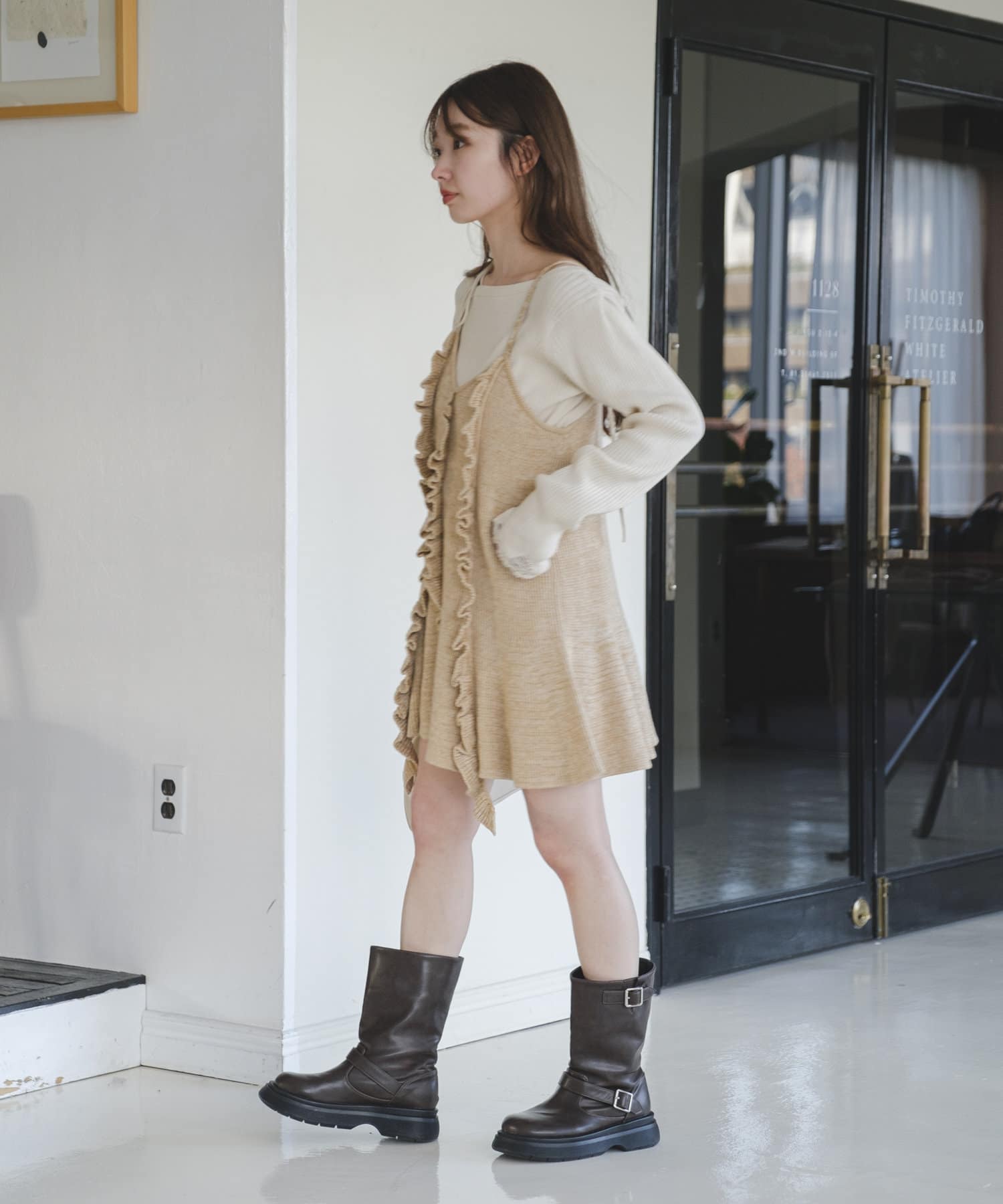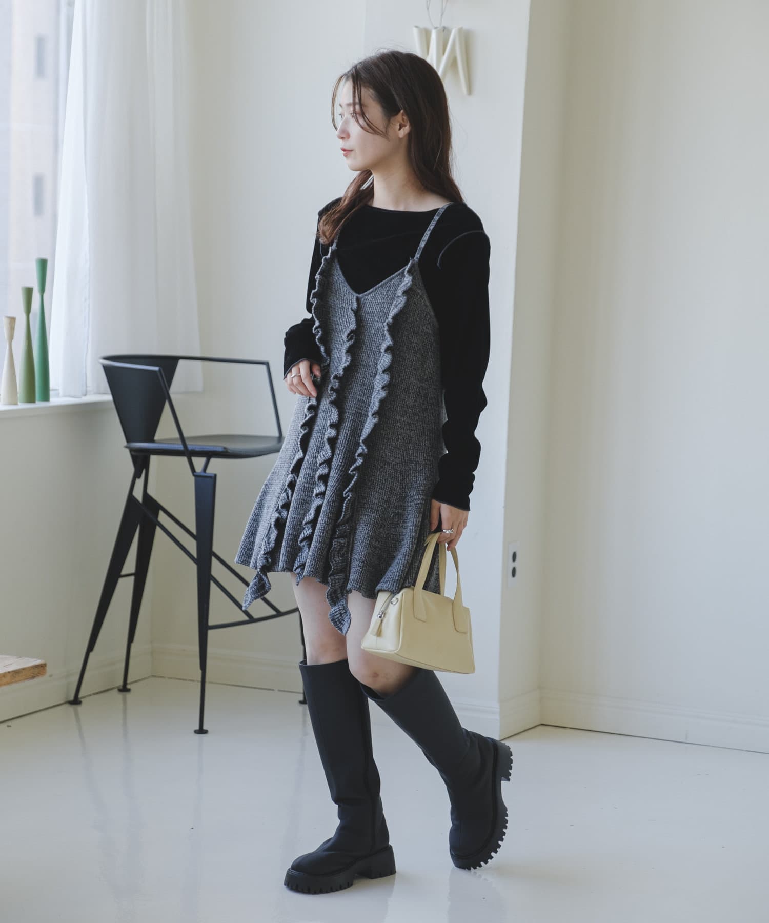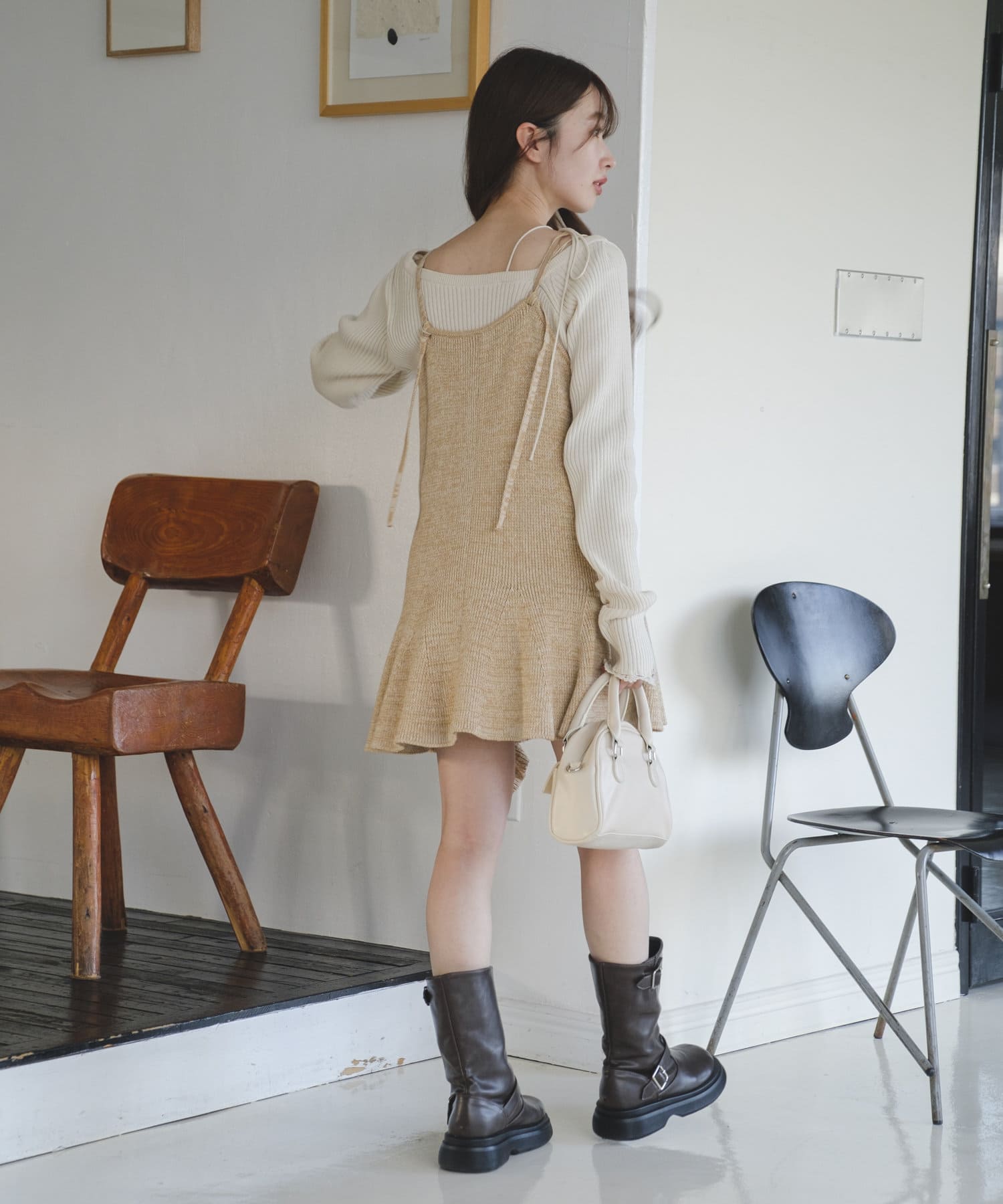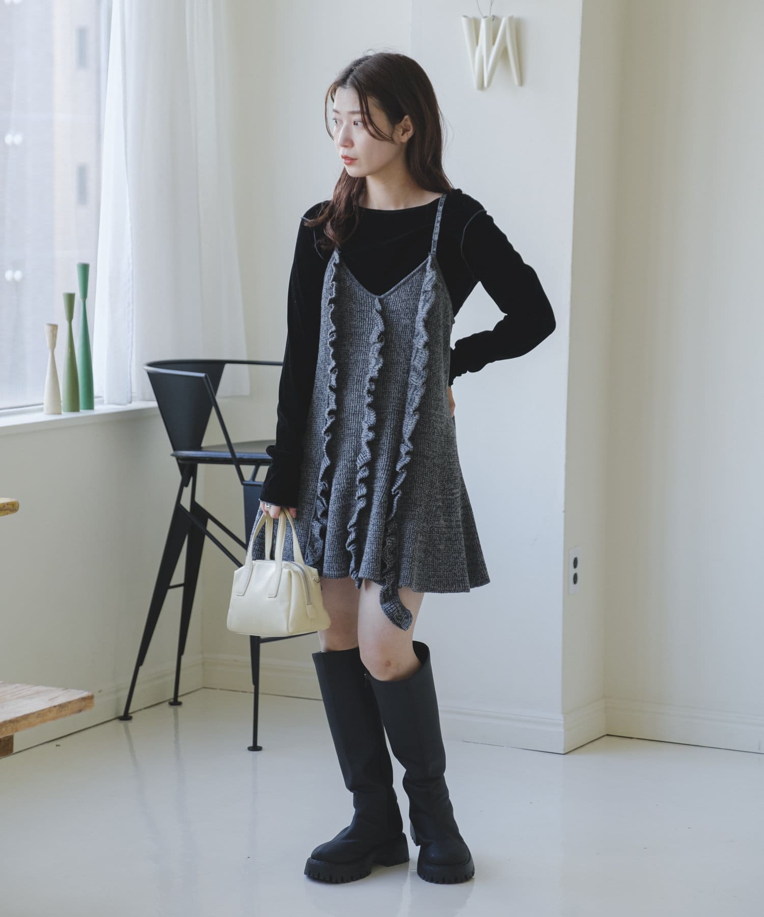 リブニットやフリルブラウスをインナーに合わせるとフェミニンなスタイルに仕上がります。