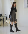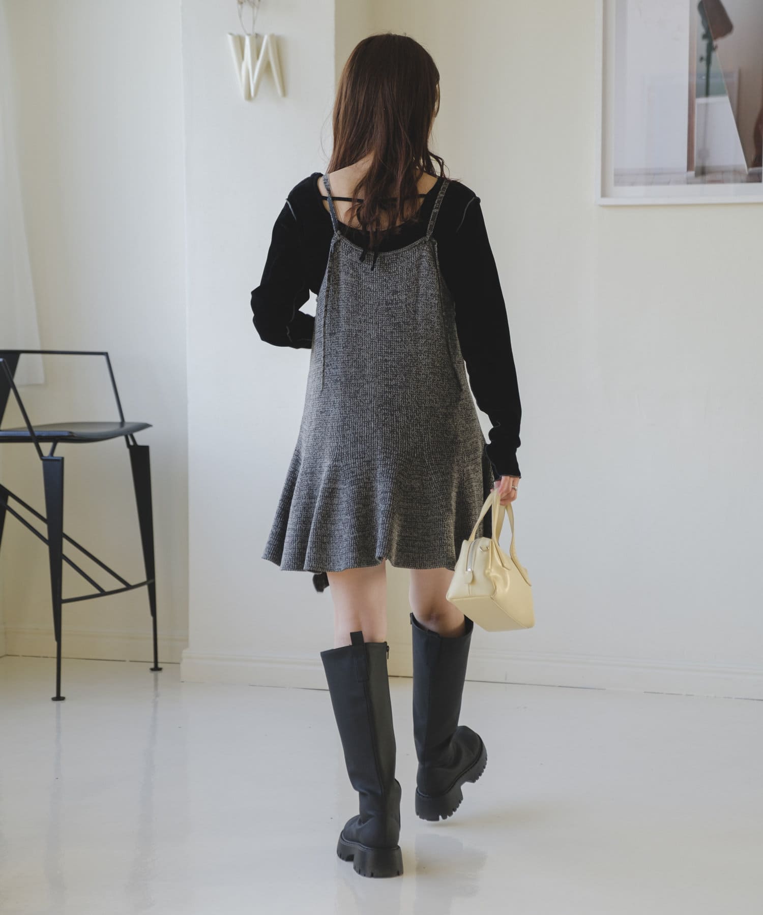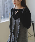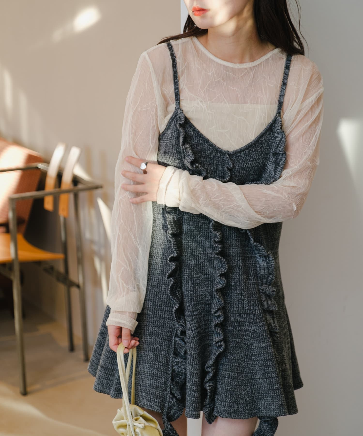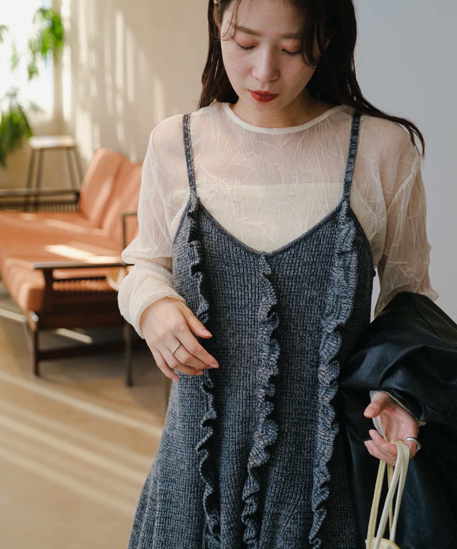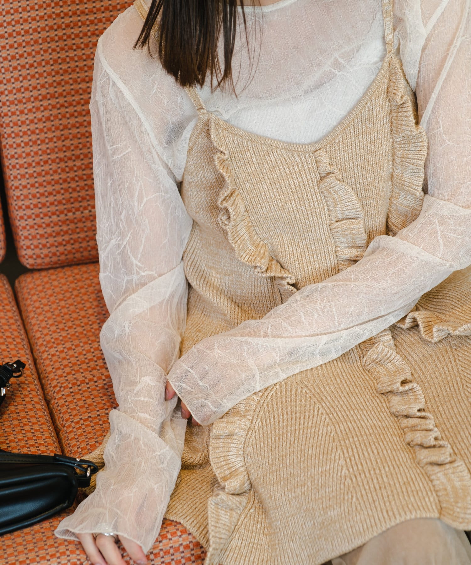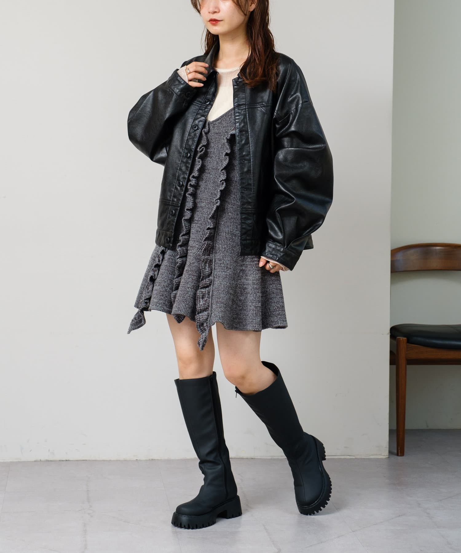 リブニットやフリルブラウスをインナーに合わせるとフェミニンなスタイルに仕上がります。