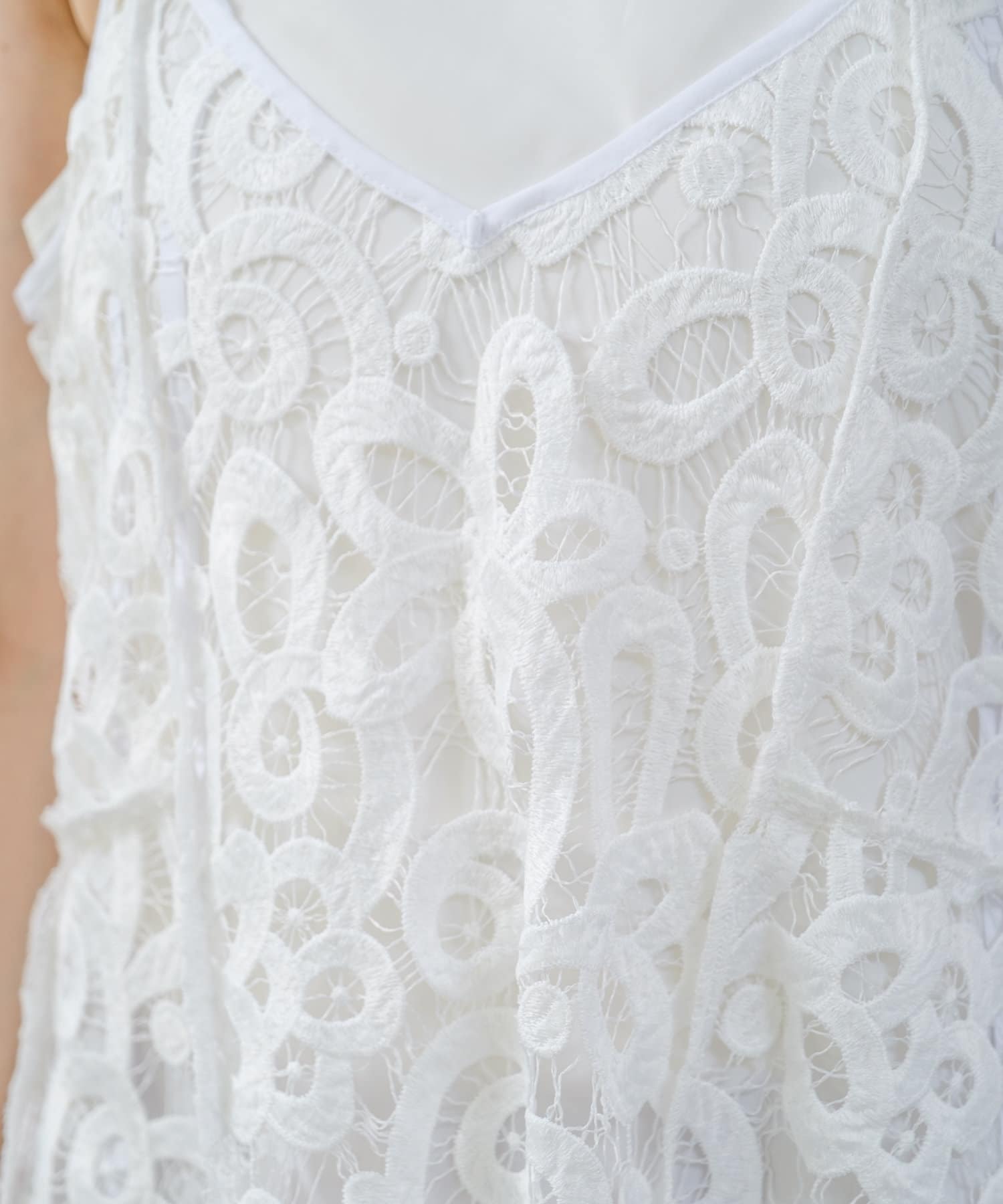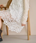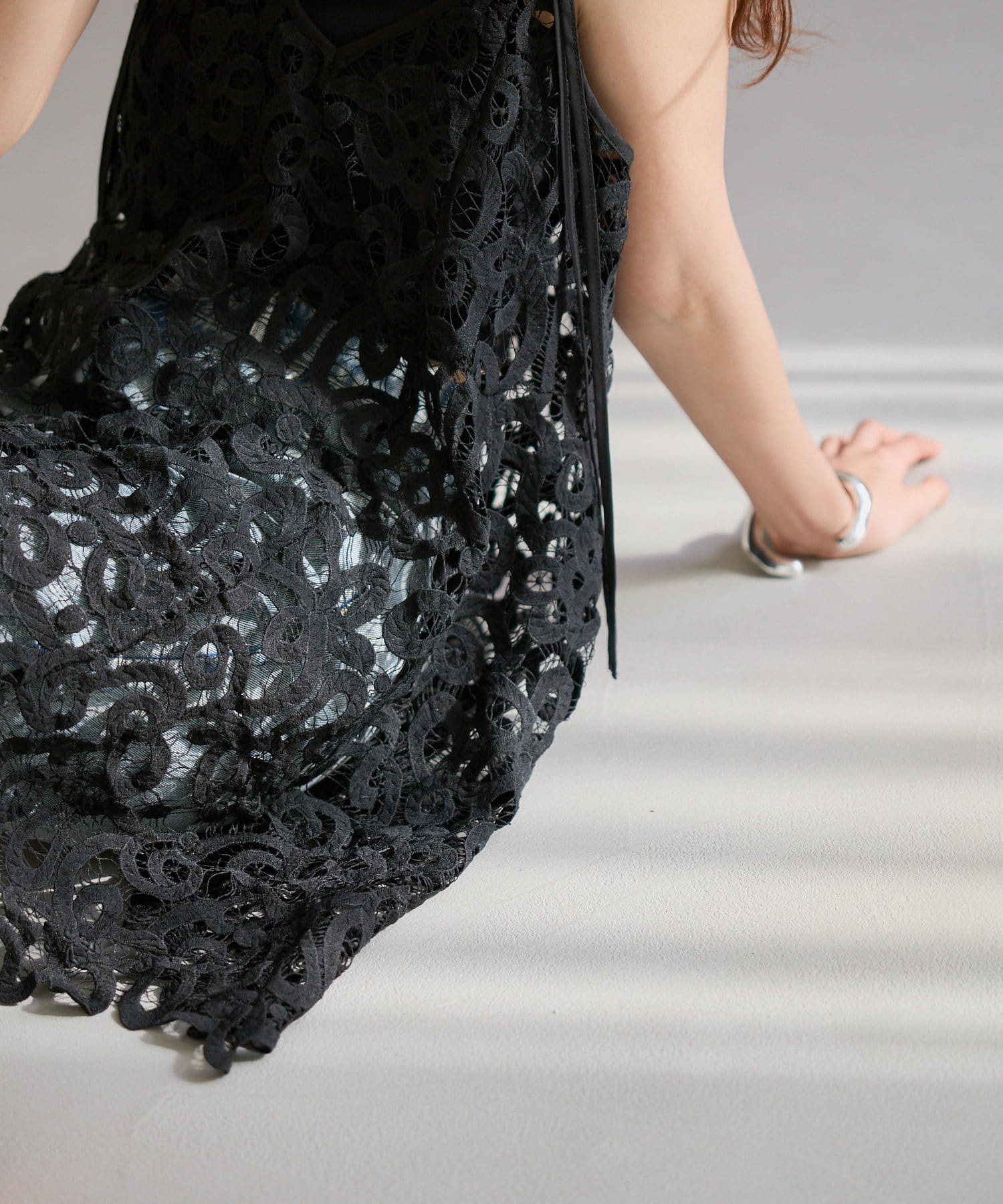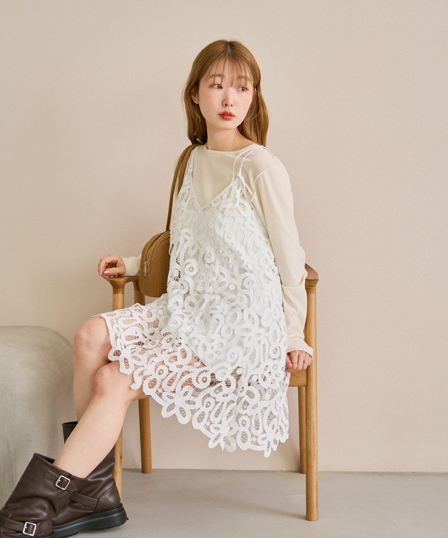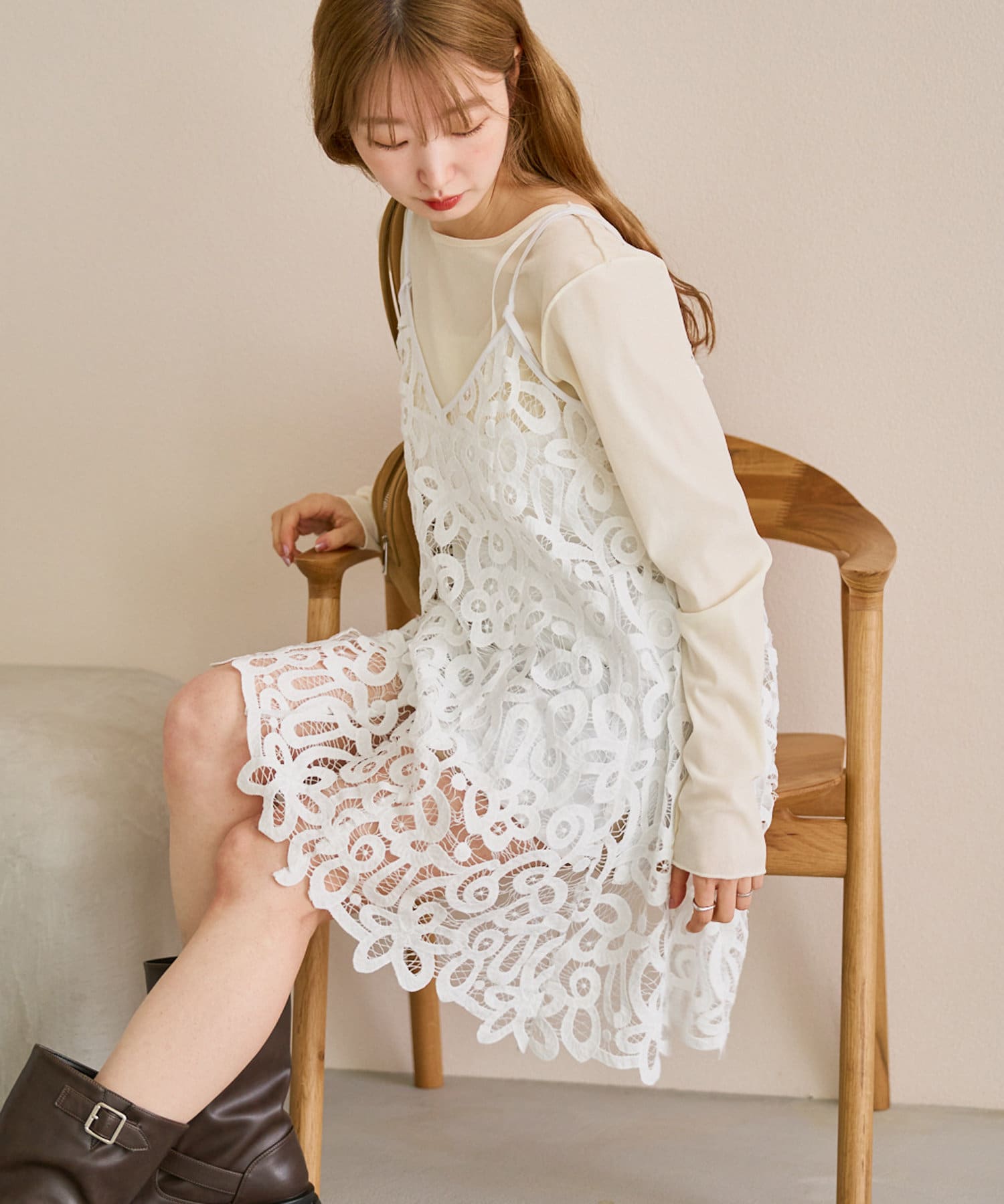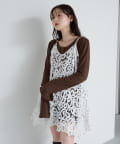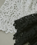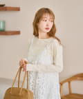 全体に施された繊細なレースと透け感のある素材が上品で女性らしい雰囲気を演出してくれます。