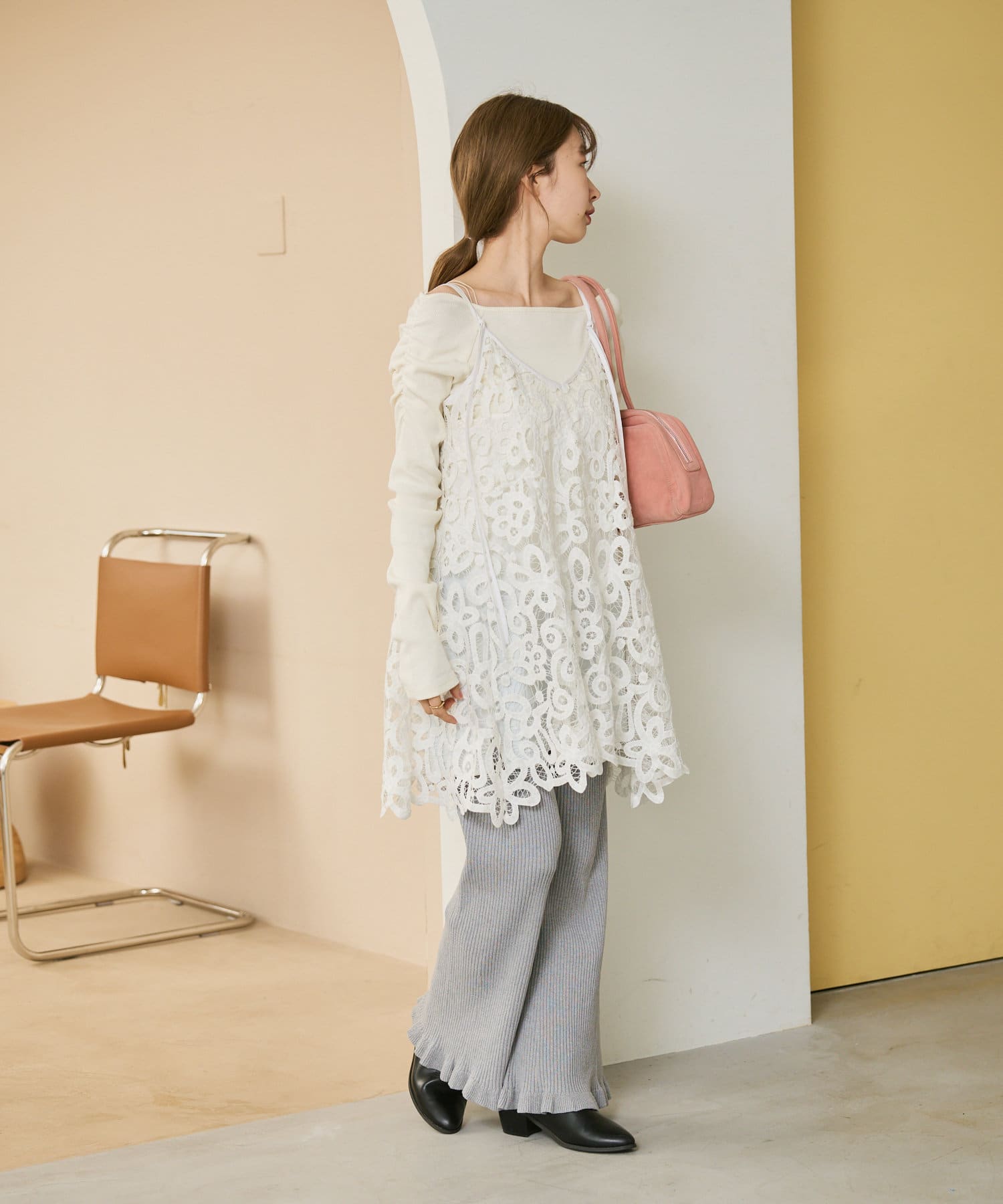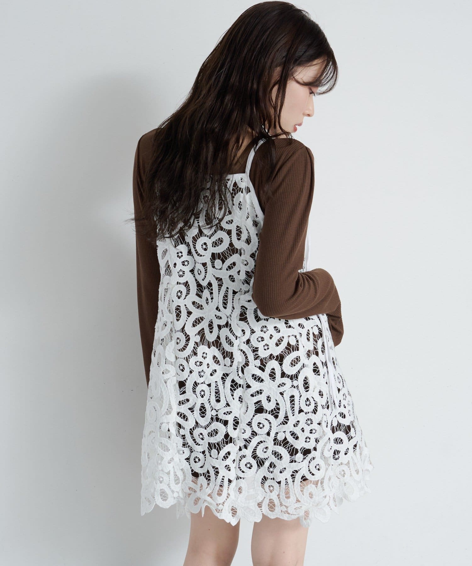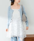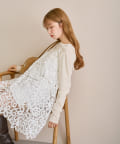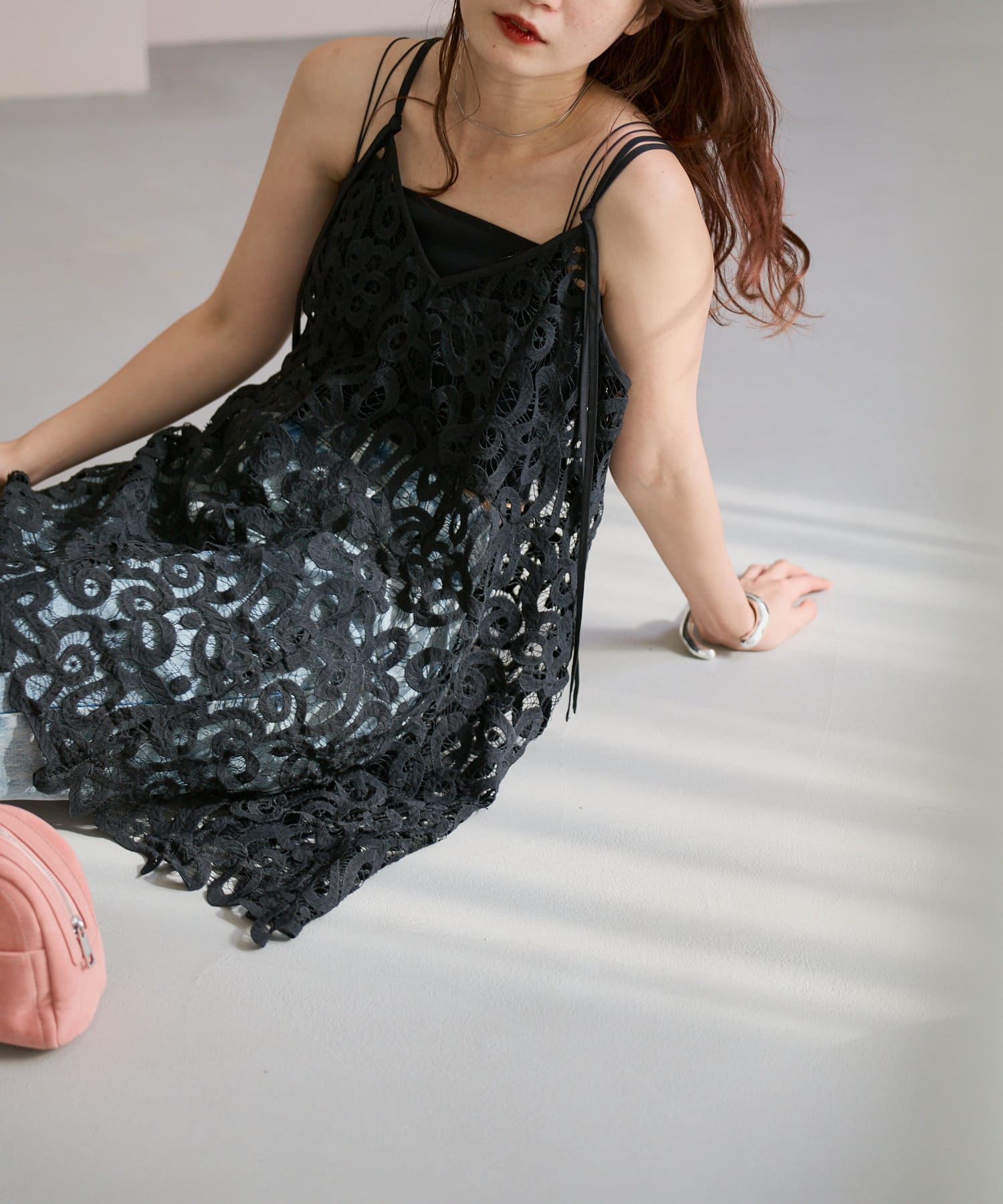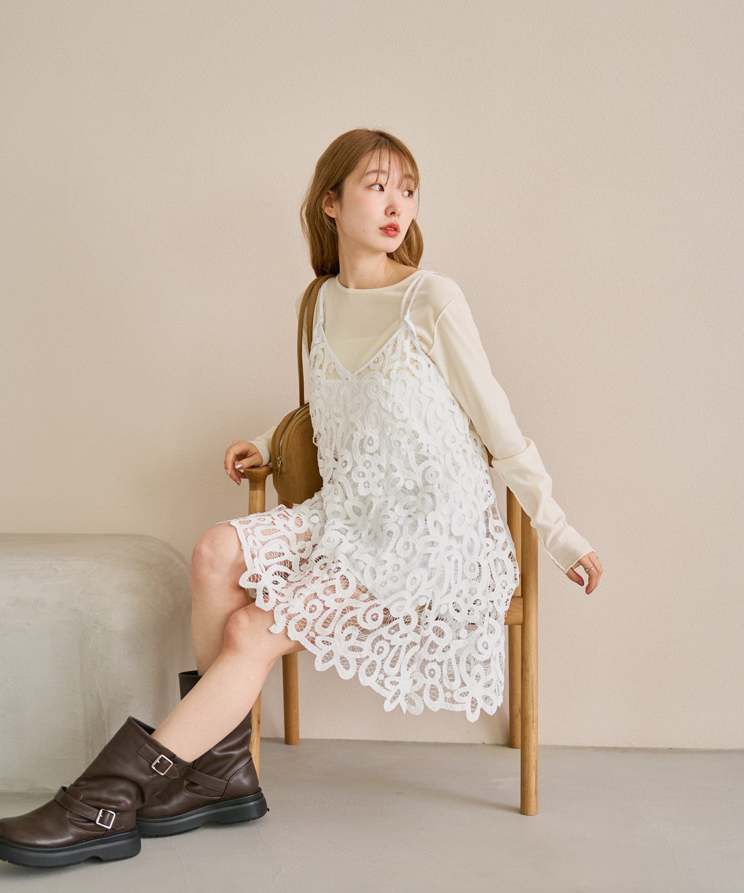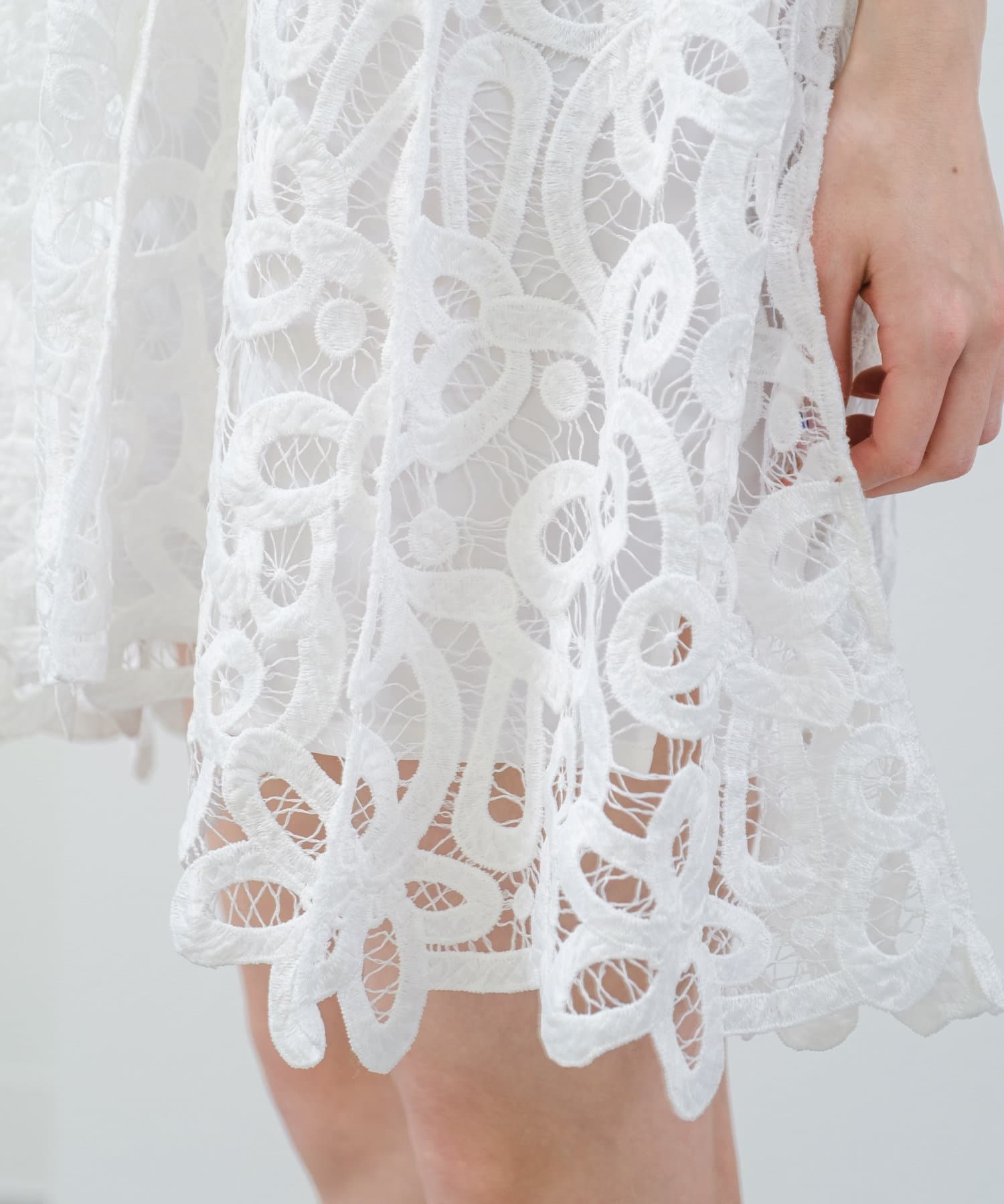 全体に施された繊細なレースと透け感のある素材が上品で女性らしい雰囲気を演出してくれます。