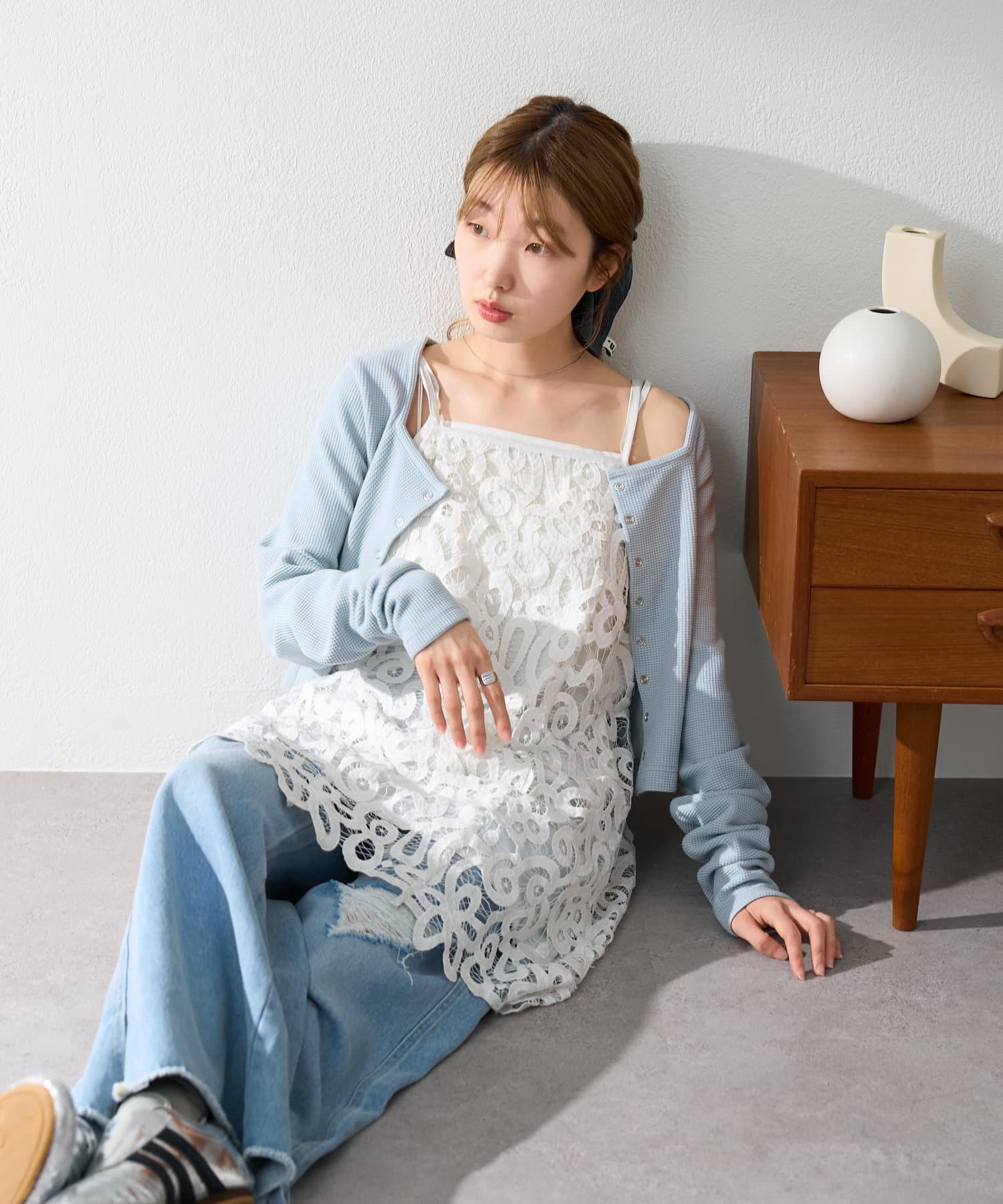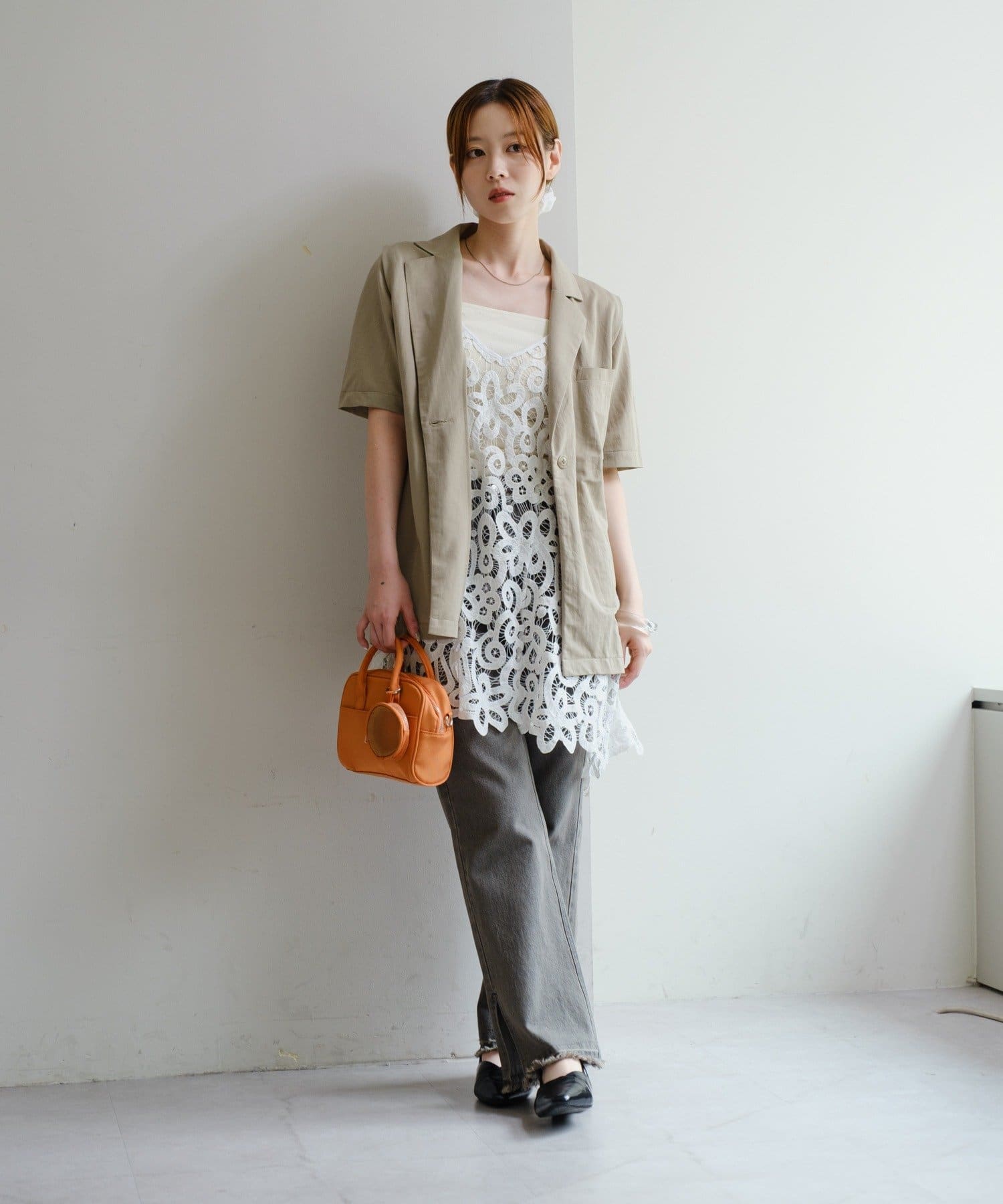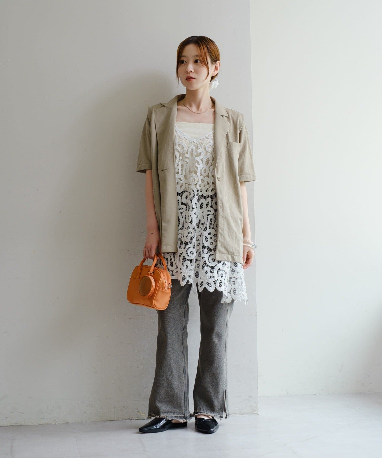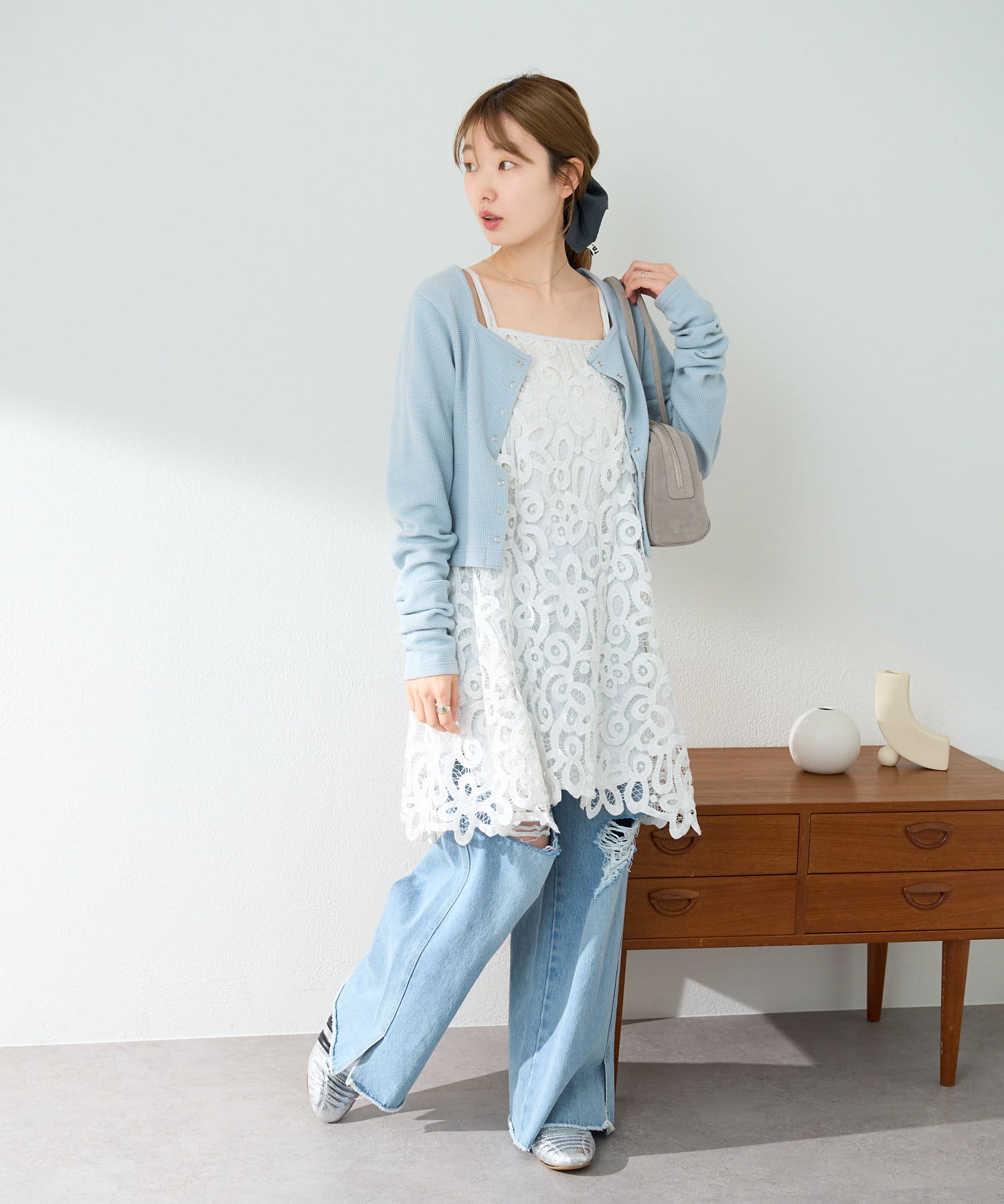 デニムパンツと合わせるとレースの華やかさが程よくカジュアルダウンされ、デイリー使いにぴったりです。