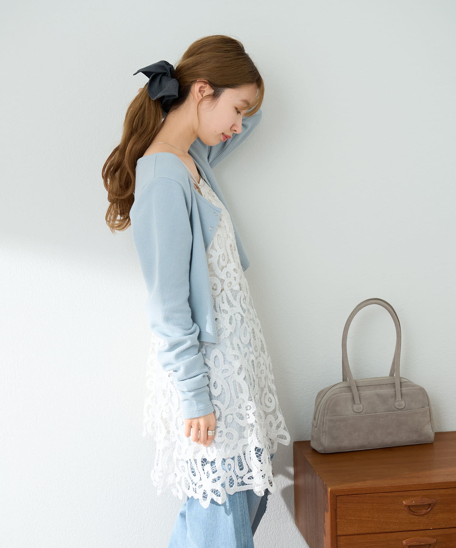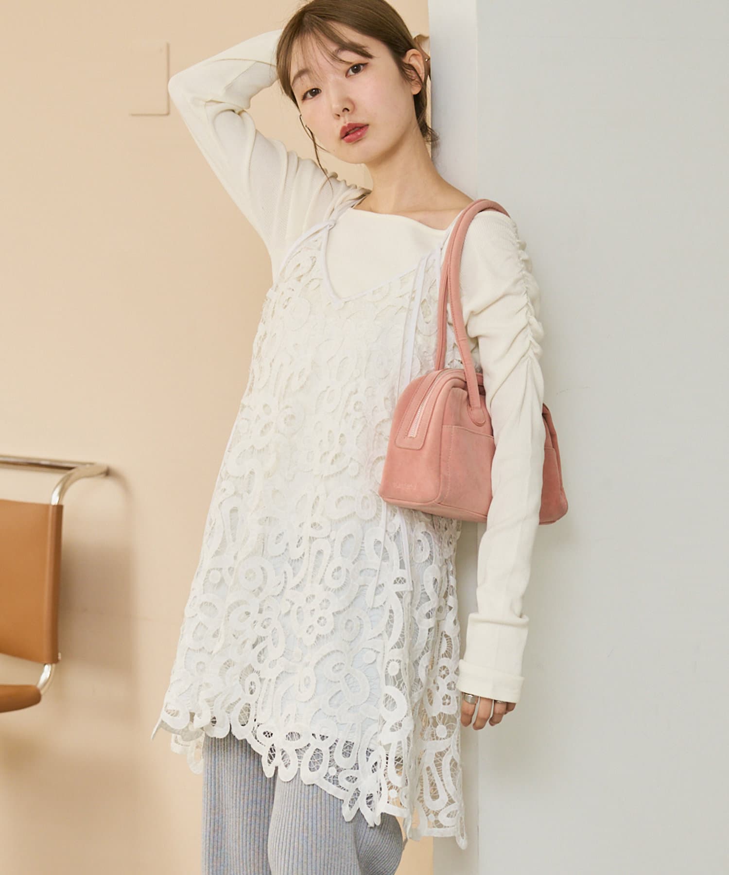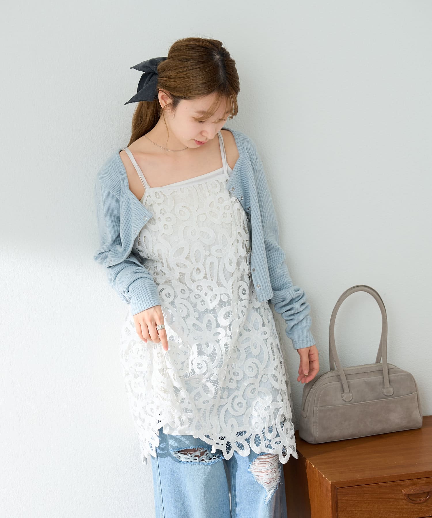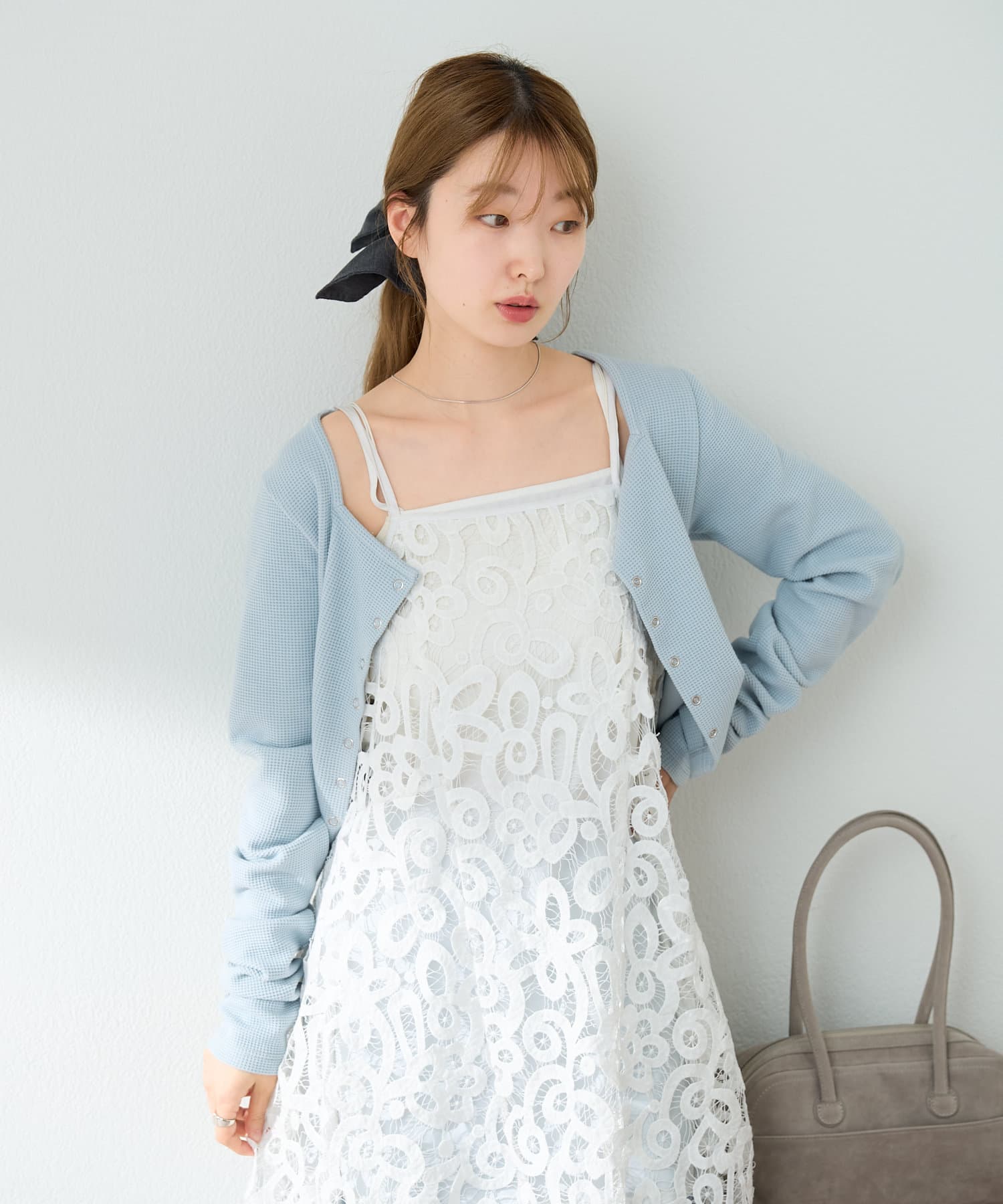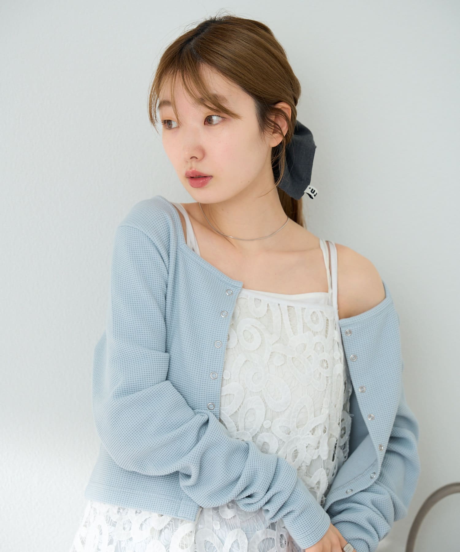 購入場所:店舗ずっと狙っていたやつだったので買おうと思いつつもタイミングがなく、ついこの間購入しました!!もう店頭にあるだけとのことで店舗でギリギリ買えました。店員さんも全員これを着用していて人気なんだと実感しました。そして、レースの感じが可愛すぎてthe春!みたいな感じがたまらないです!