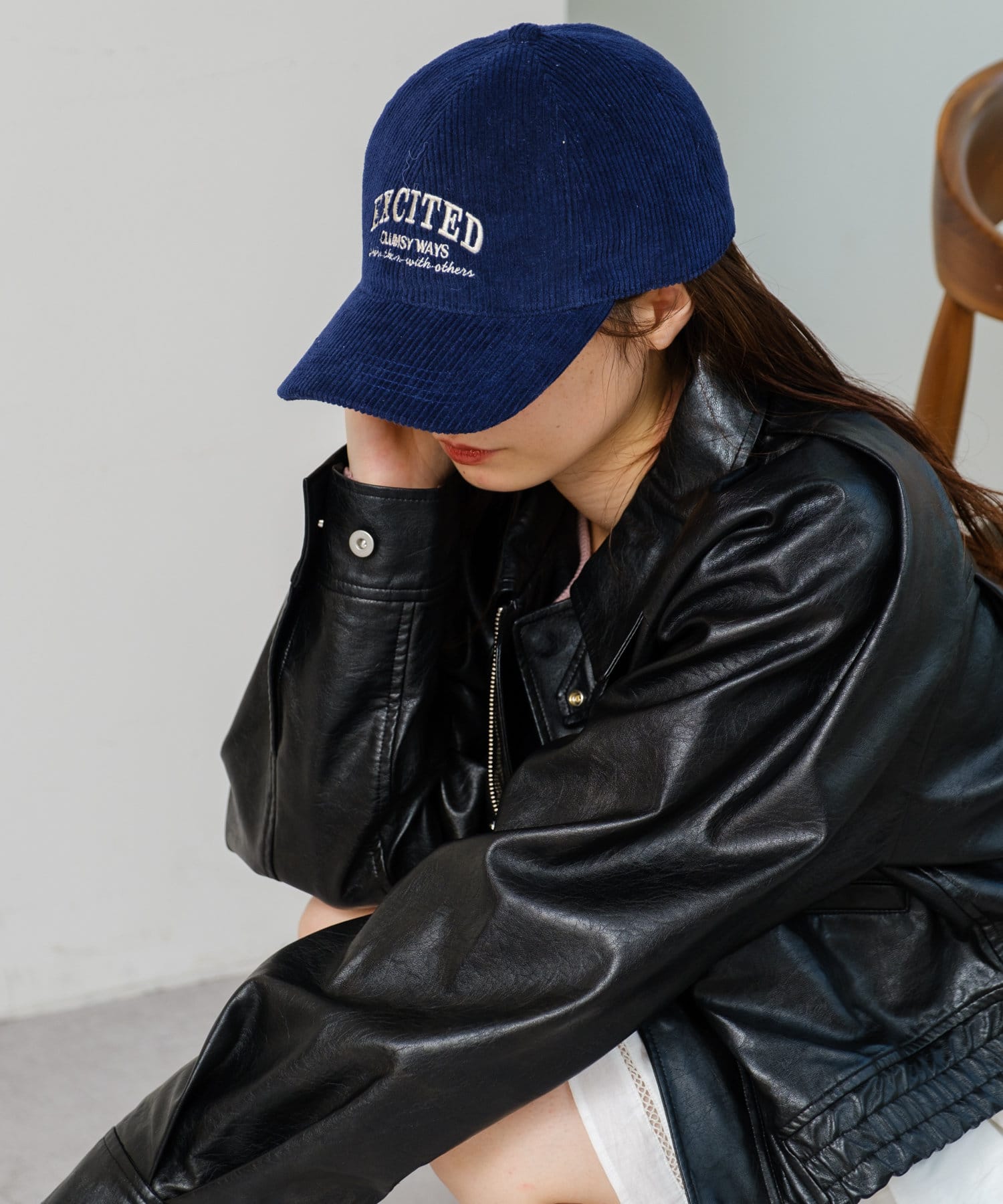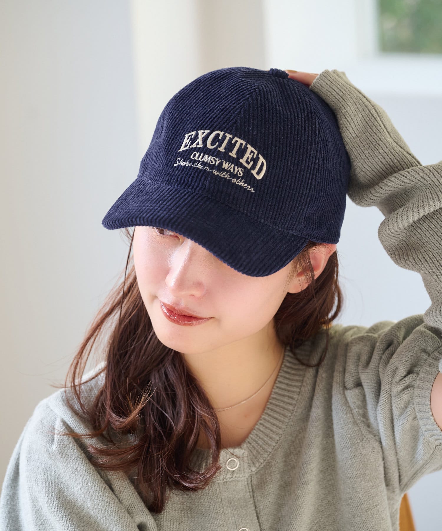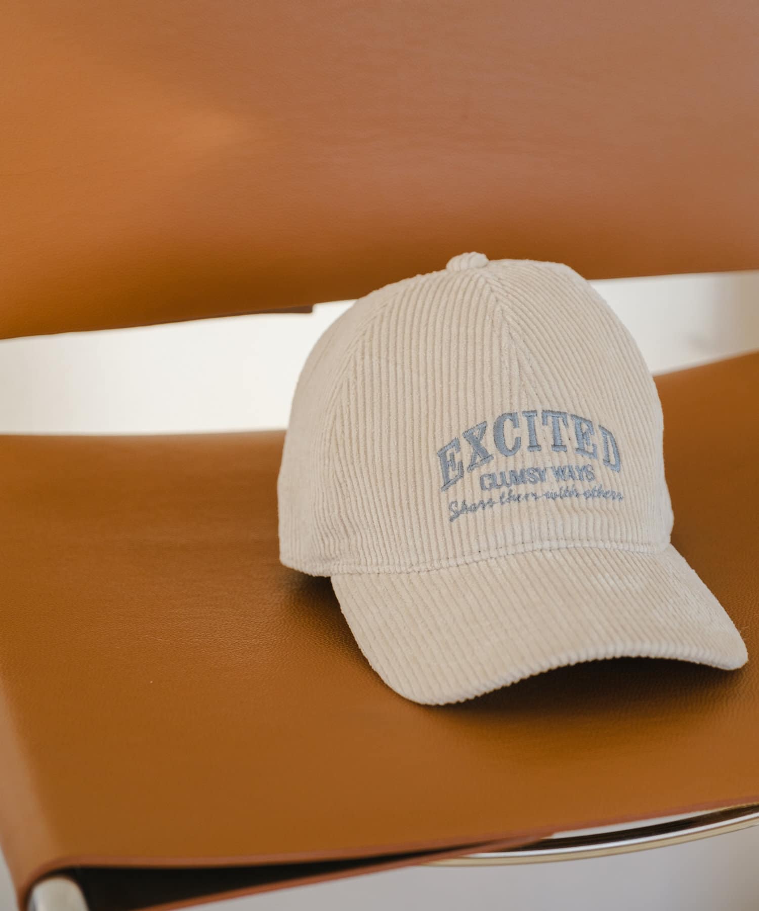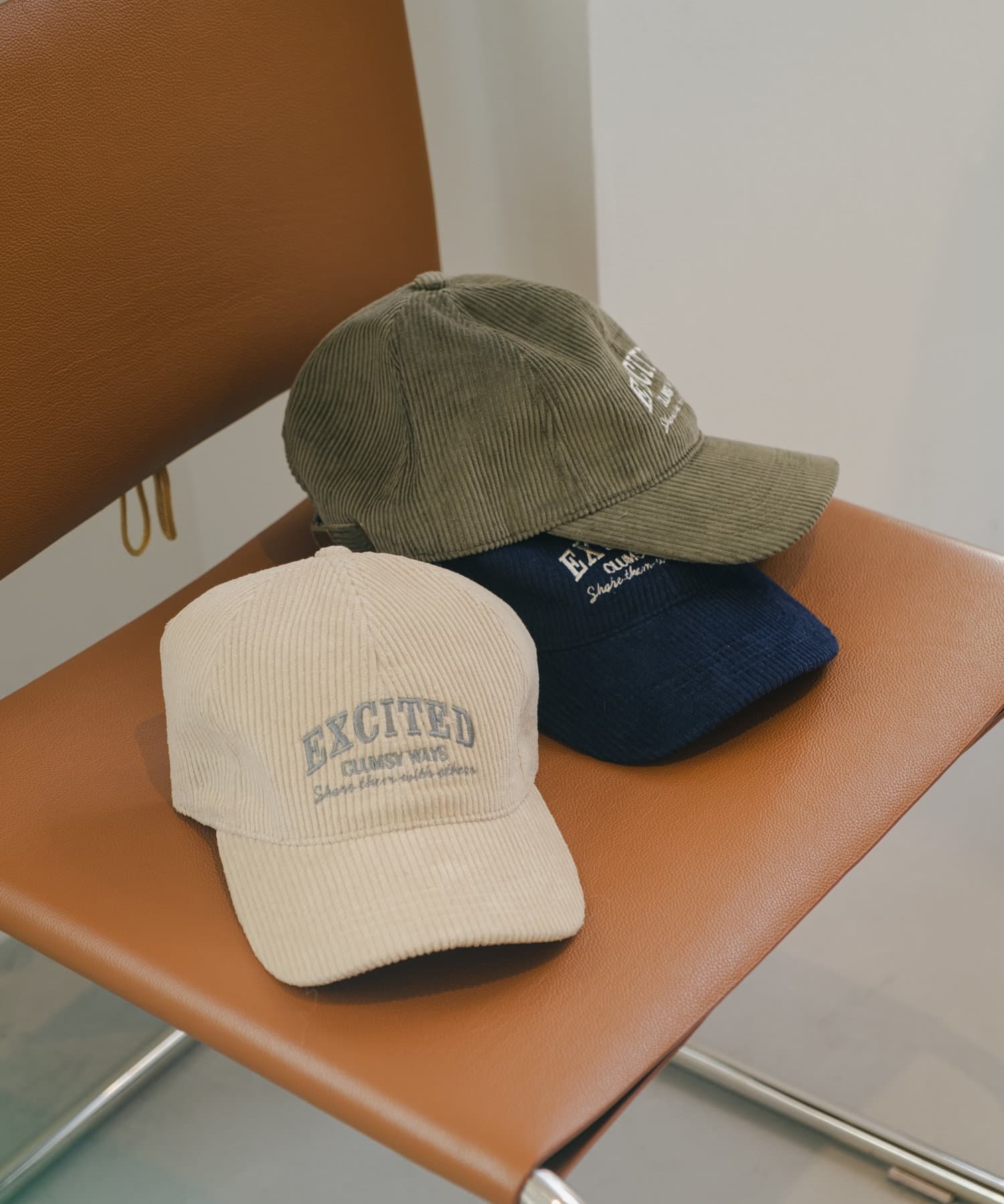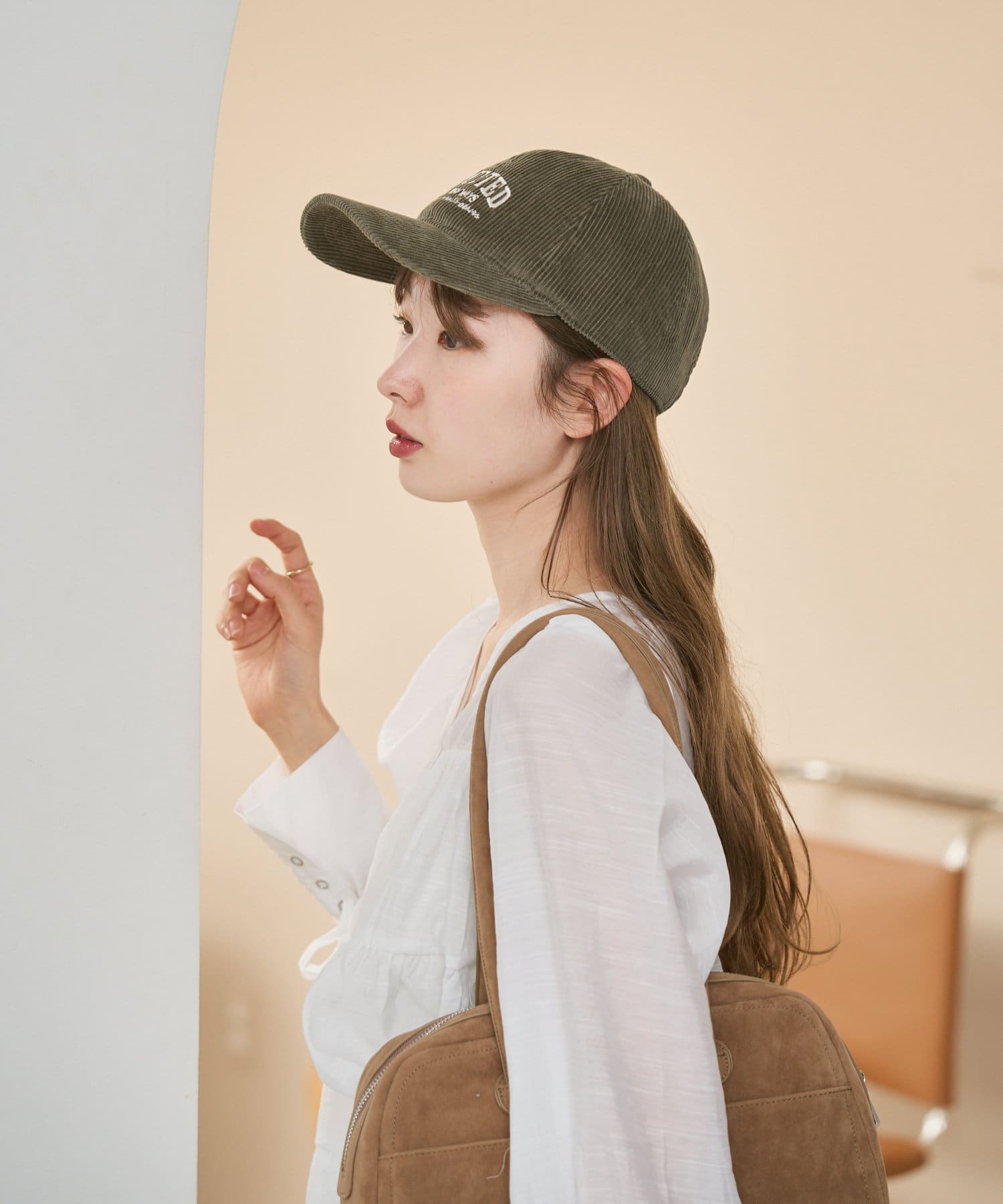 柔らかくて温かみのある素材に、ロゴが目を惹くコーデュロイキャップ。
