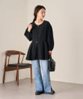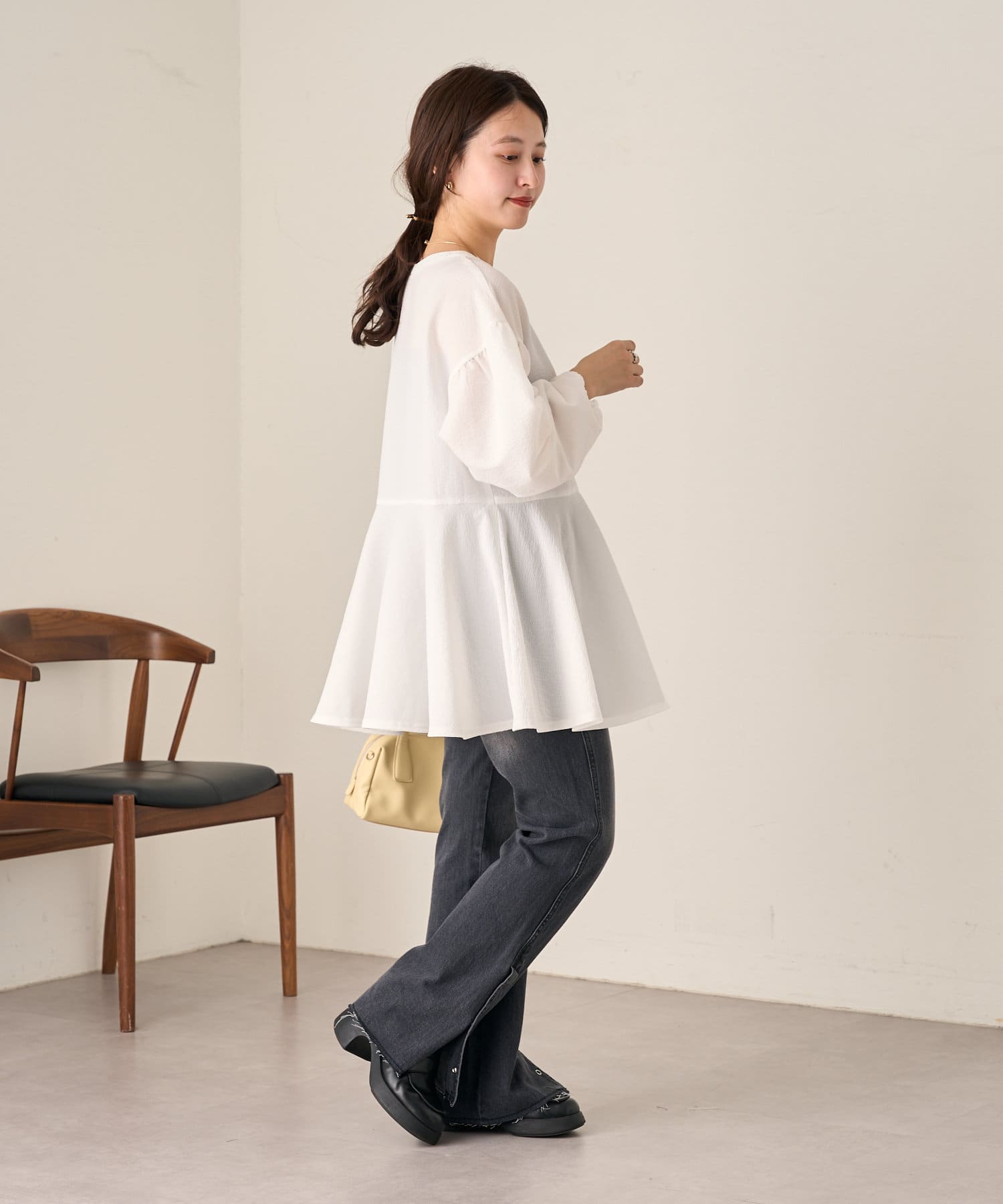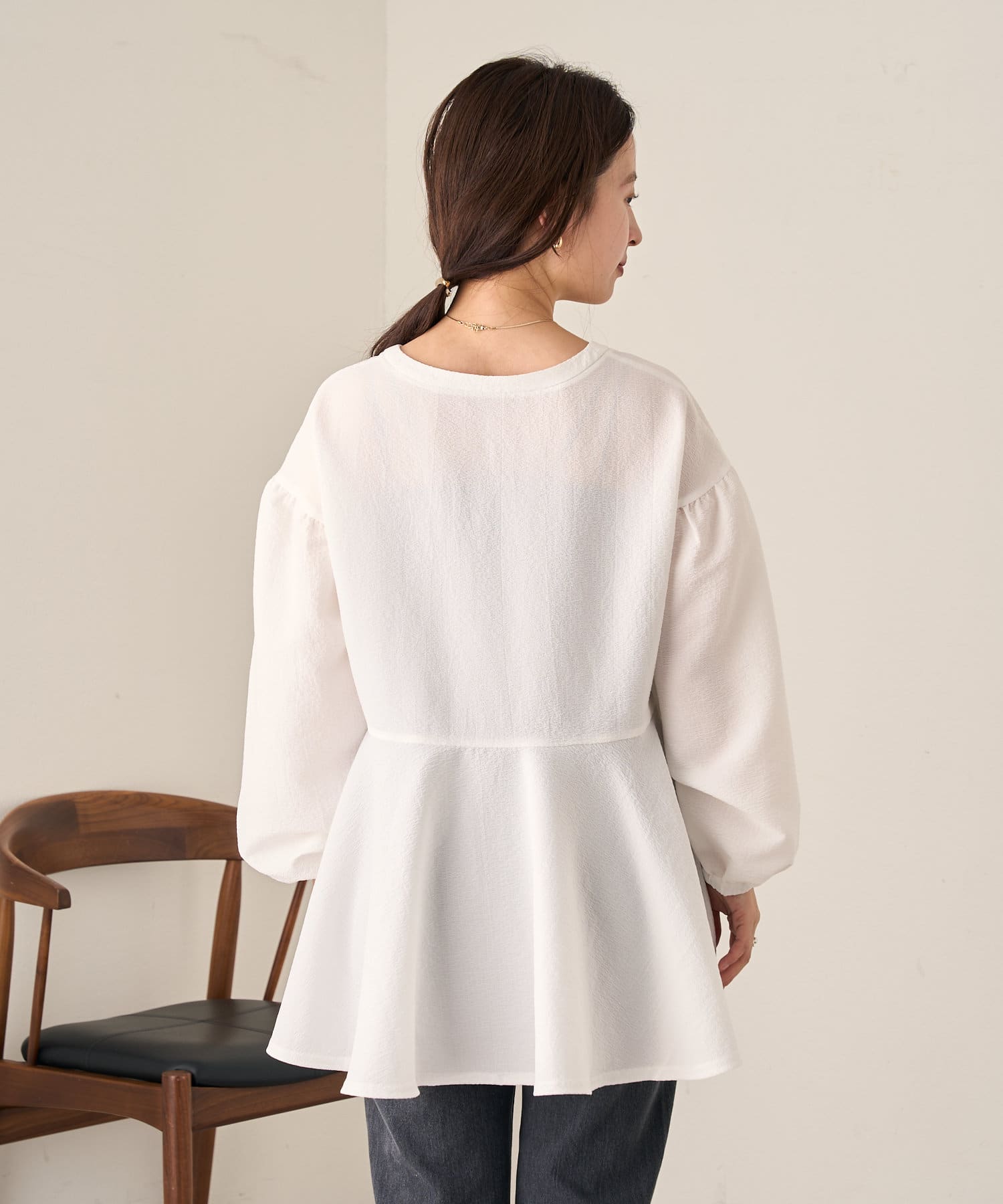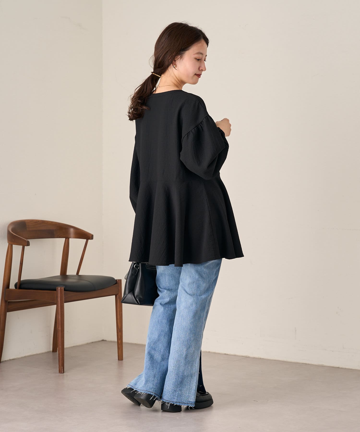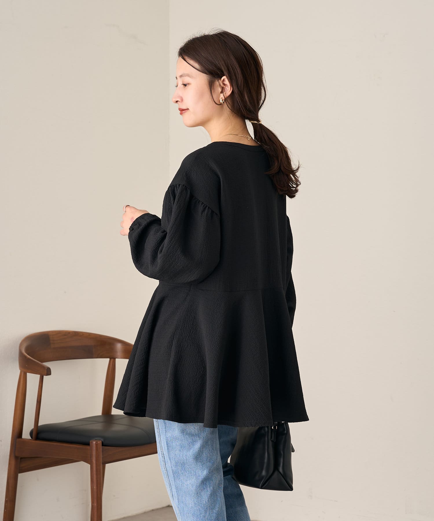 たぽっとしたボリューム袖とペプラムが着映えるデザイントップス。