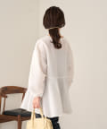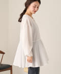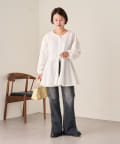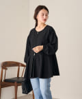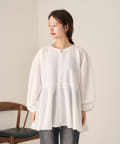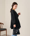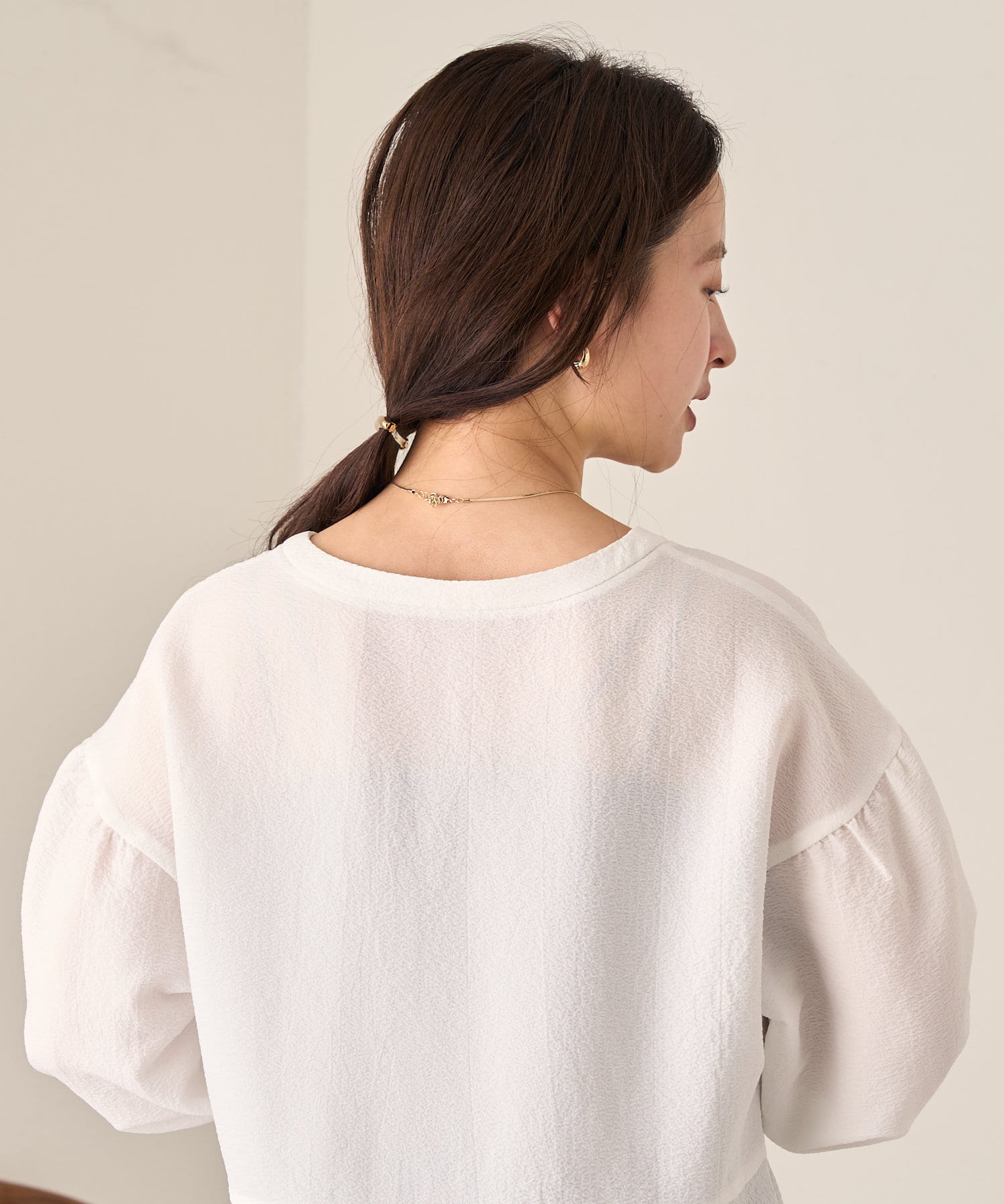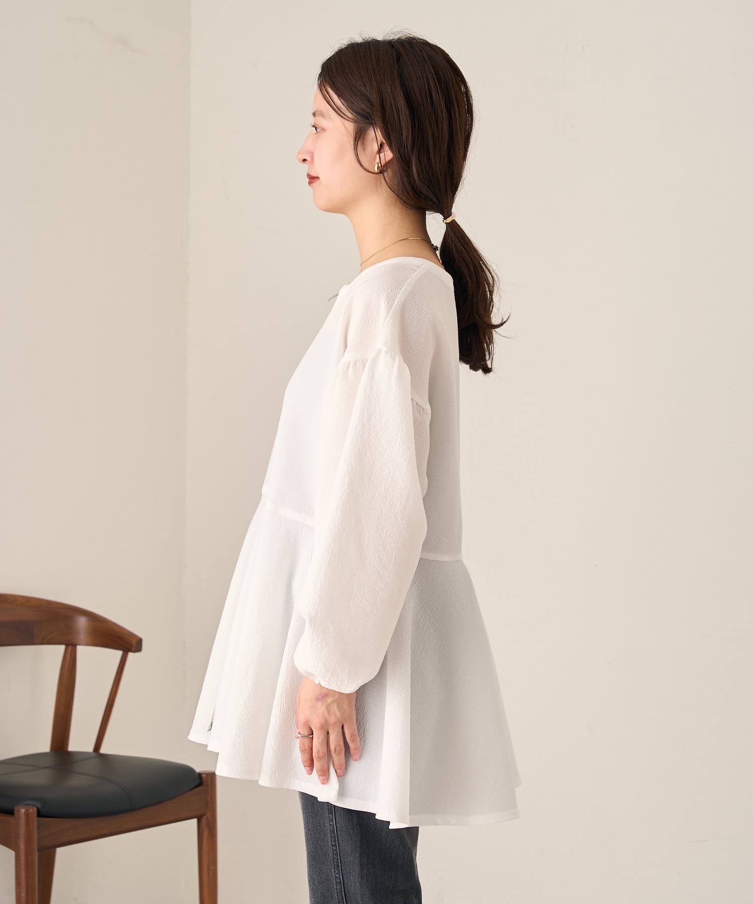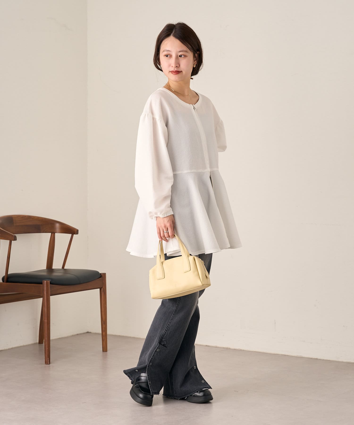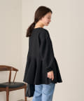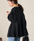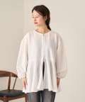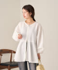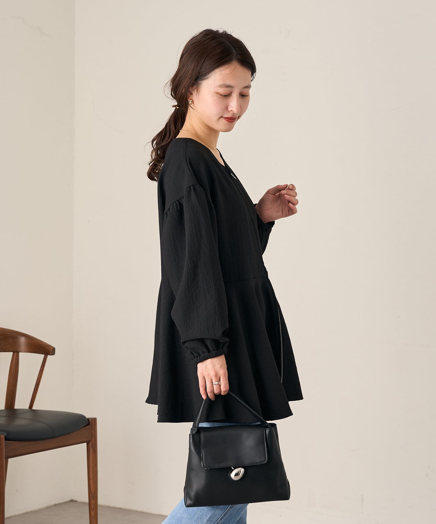 たぽっとしたボリューム袖とペプラムが着映えるデザイントップス。