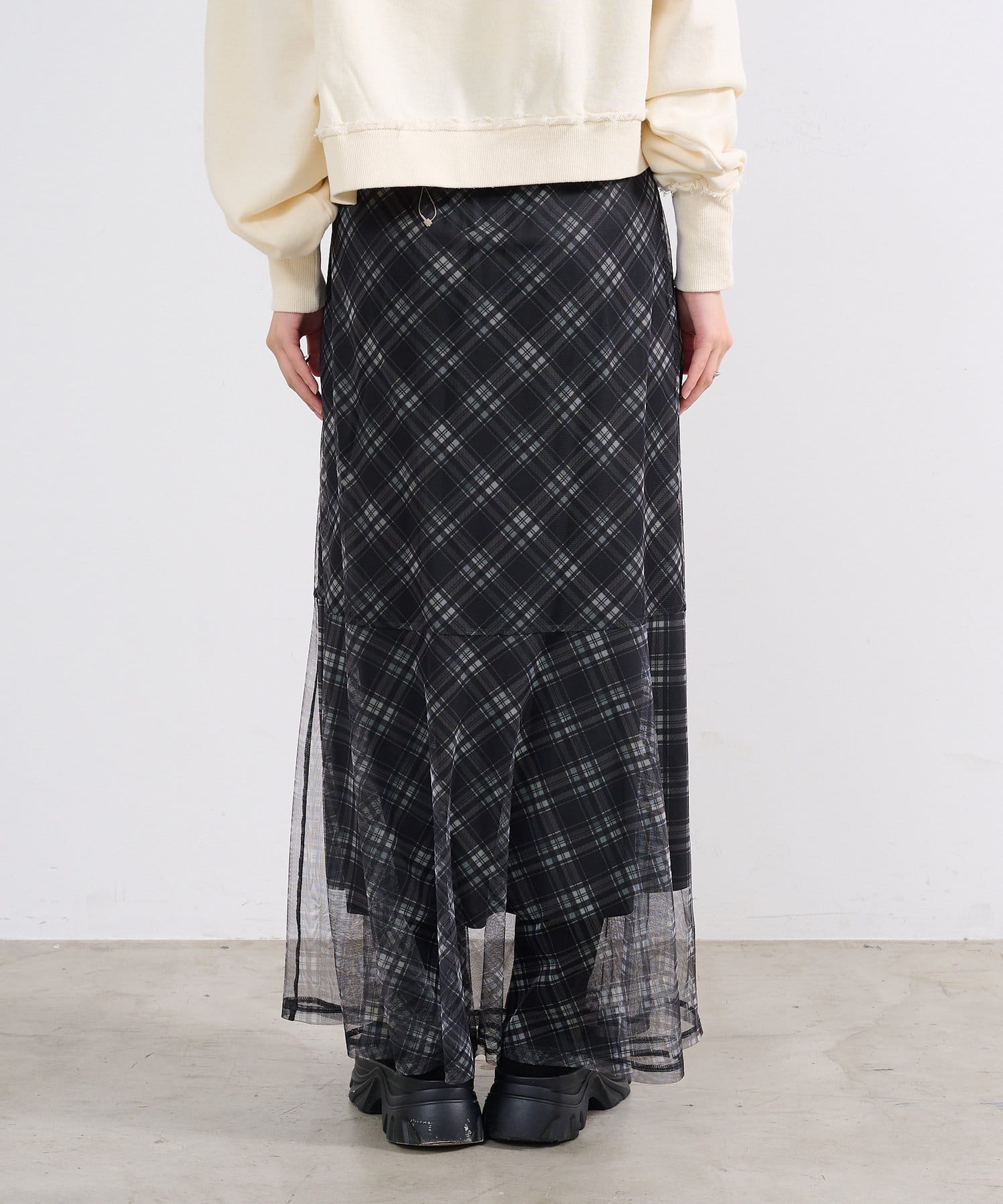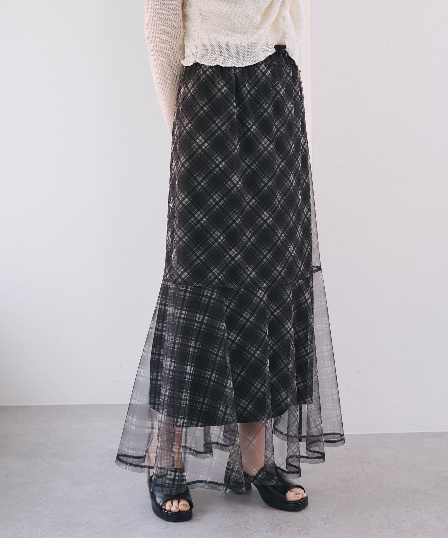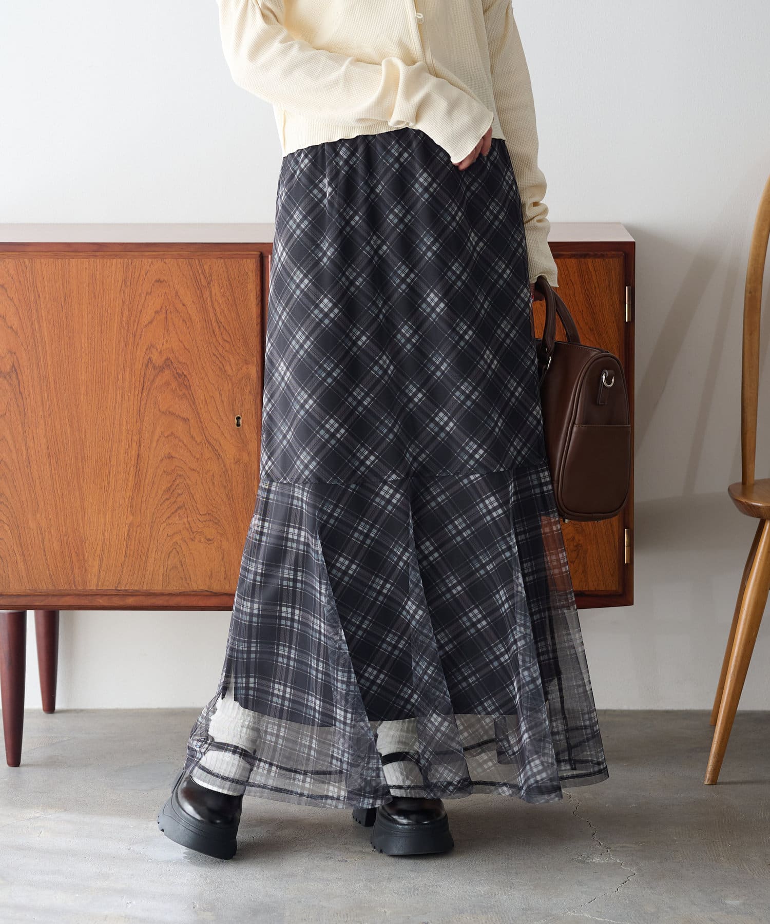 クラシックなチェック柄とシアー素材が魅力のスカート。