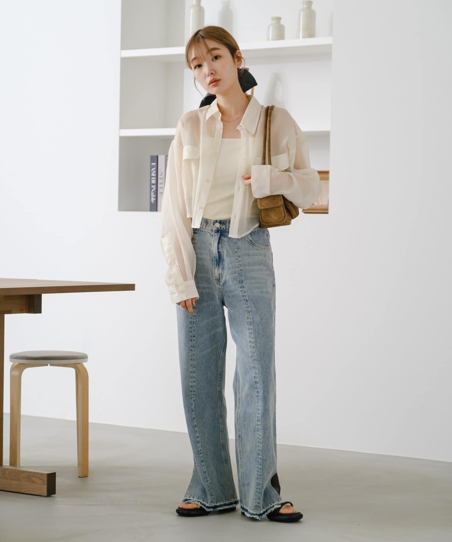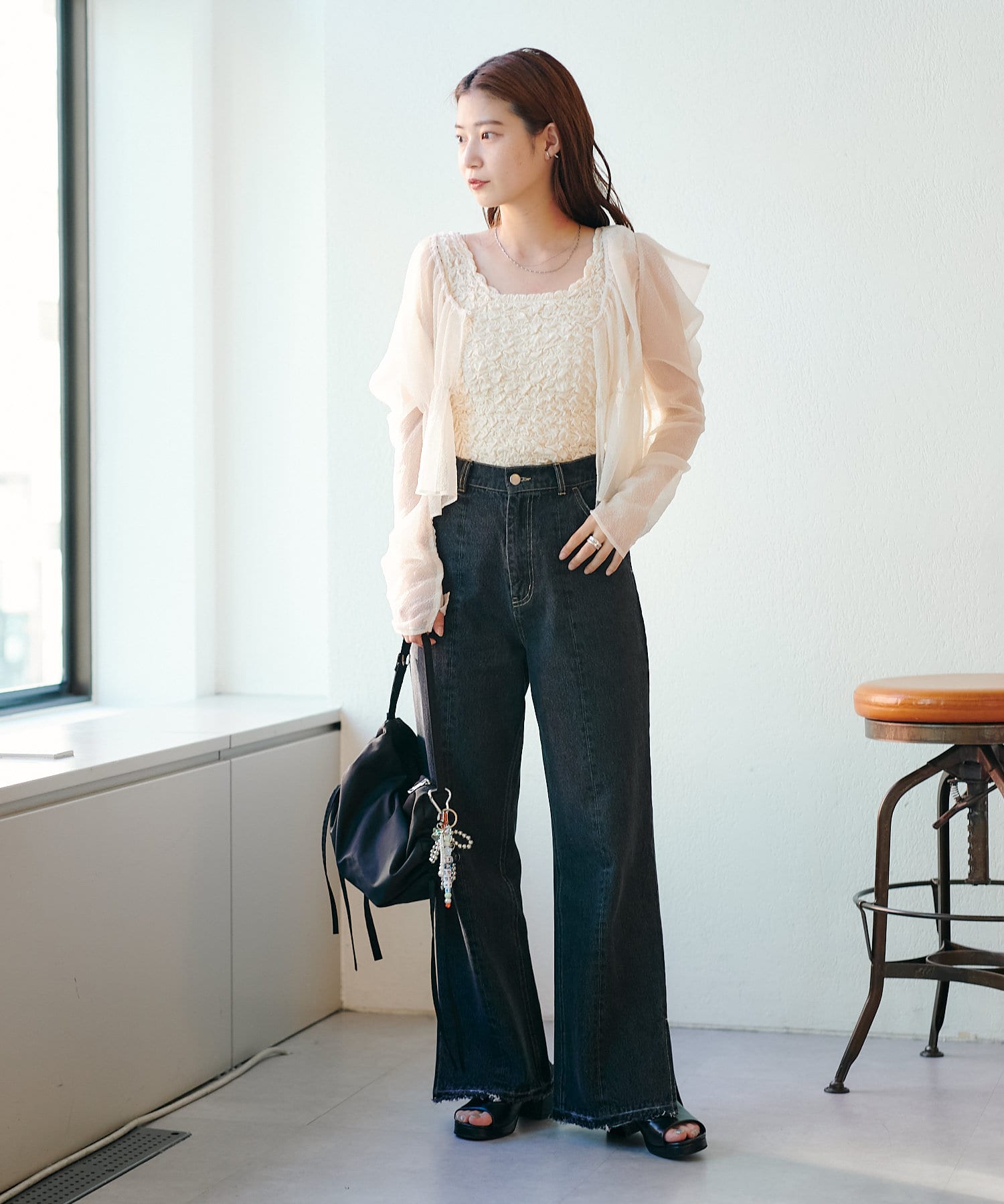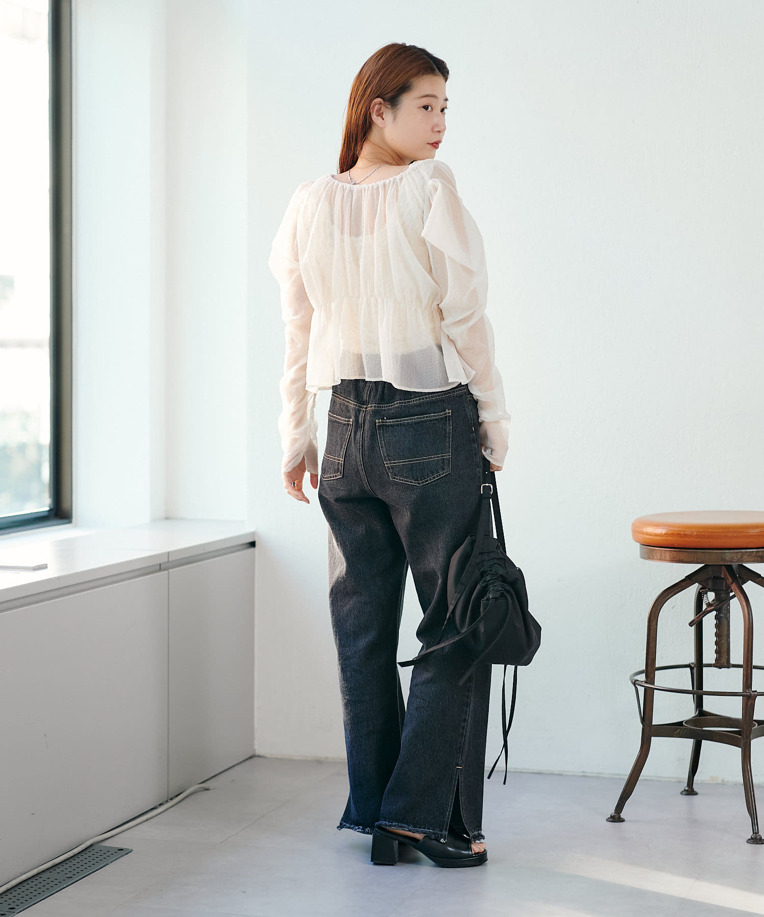 シアーなブラウスやシャーリングトップスを合わせるときれいめカジュアルに仕上がります。