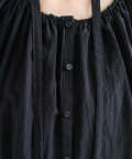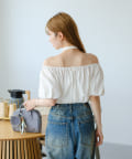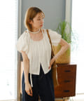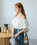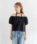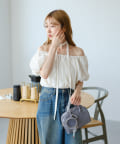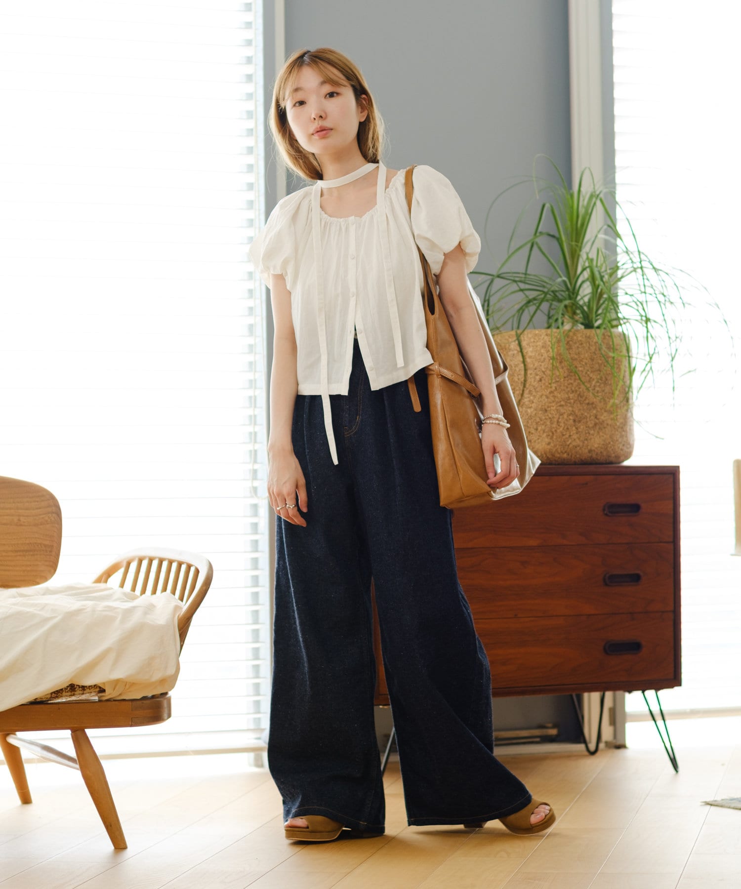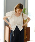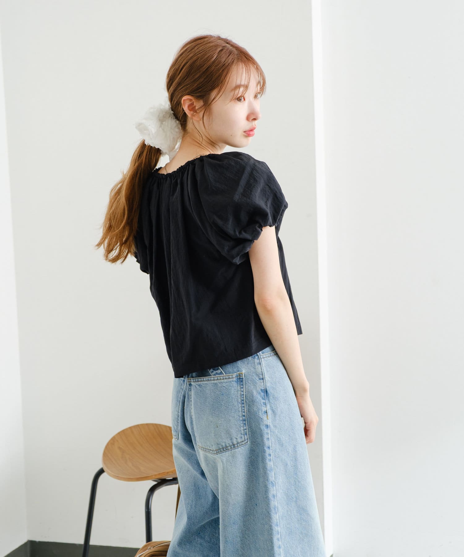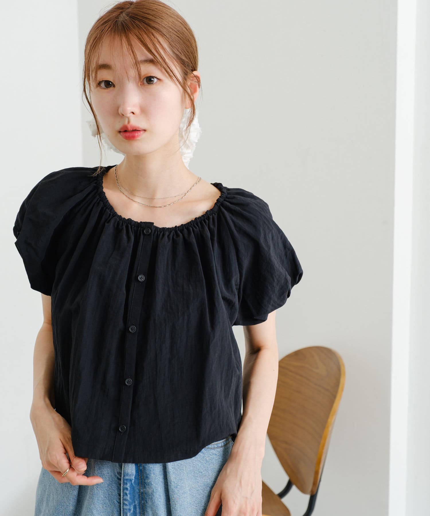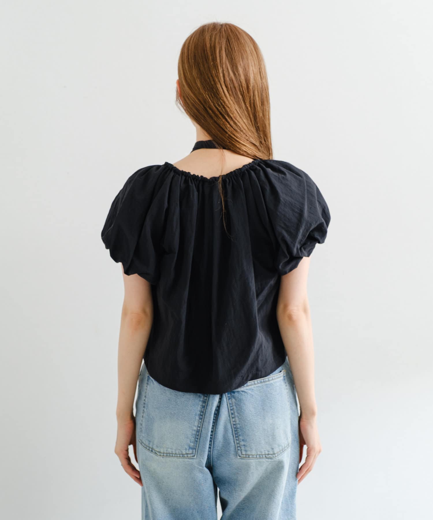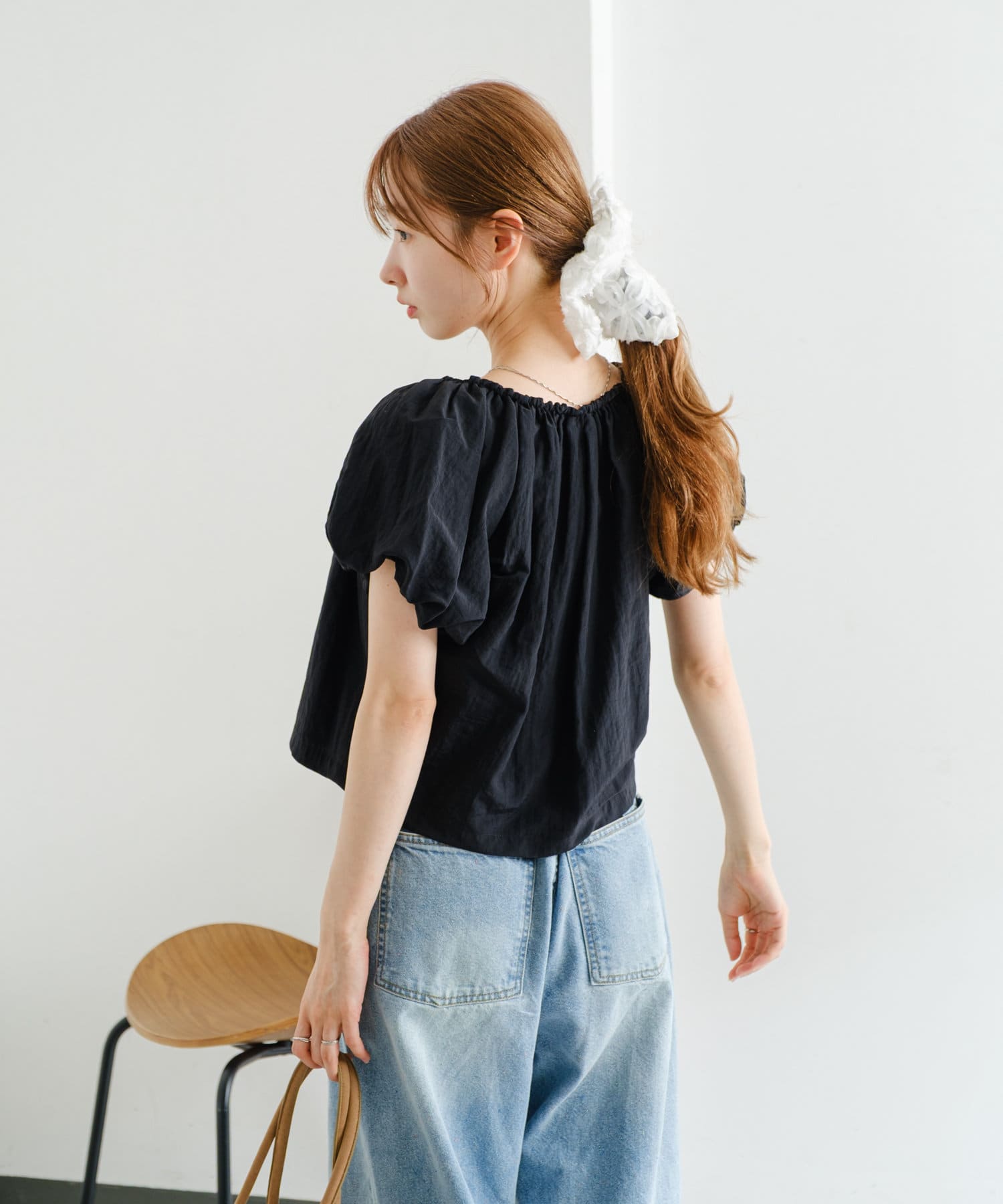 ギャザー入りのネックラインとふんわりとしたパフスリーブが、女性らしい柔らかさを演出。