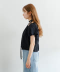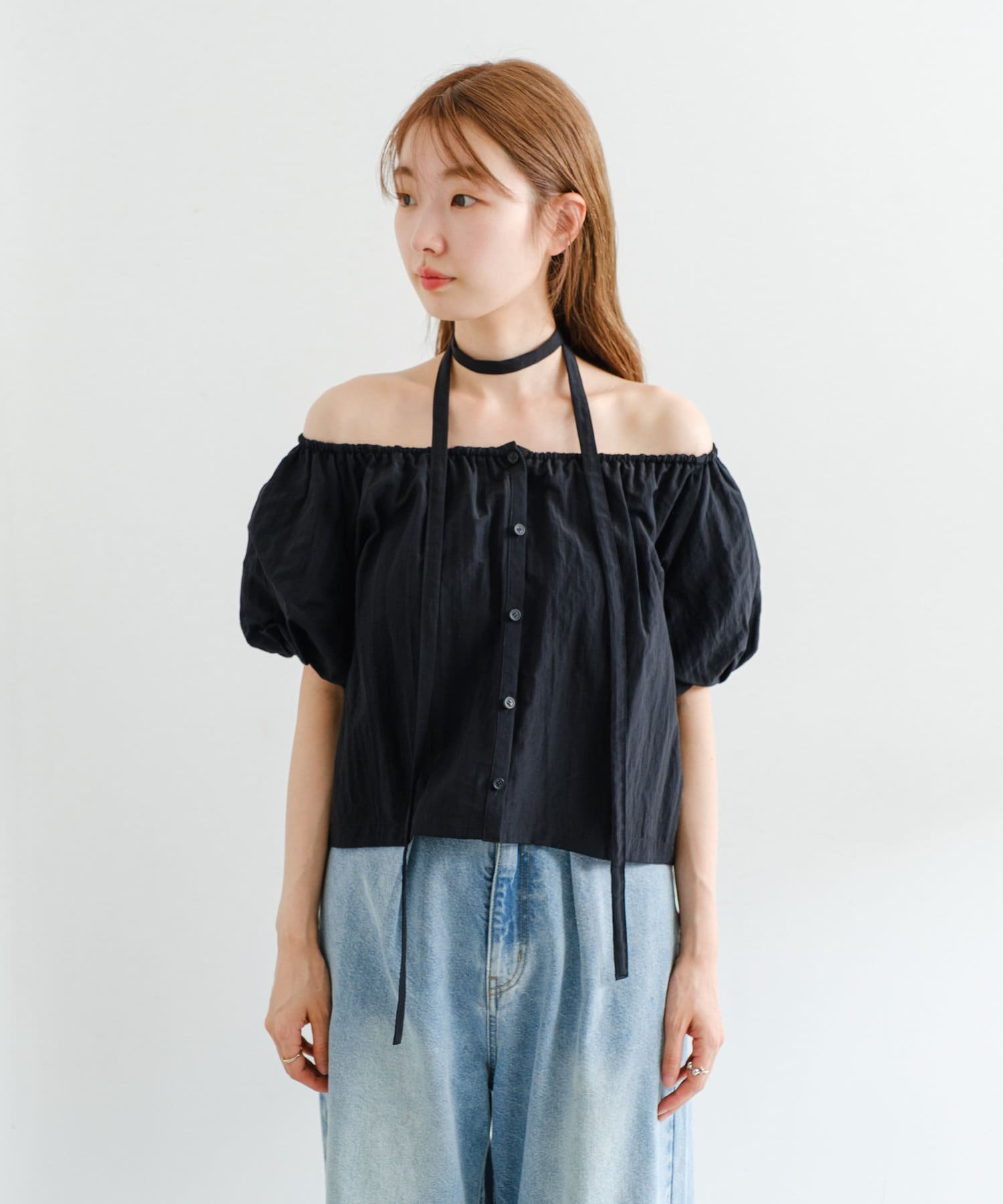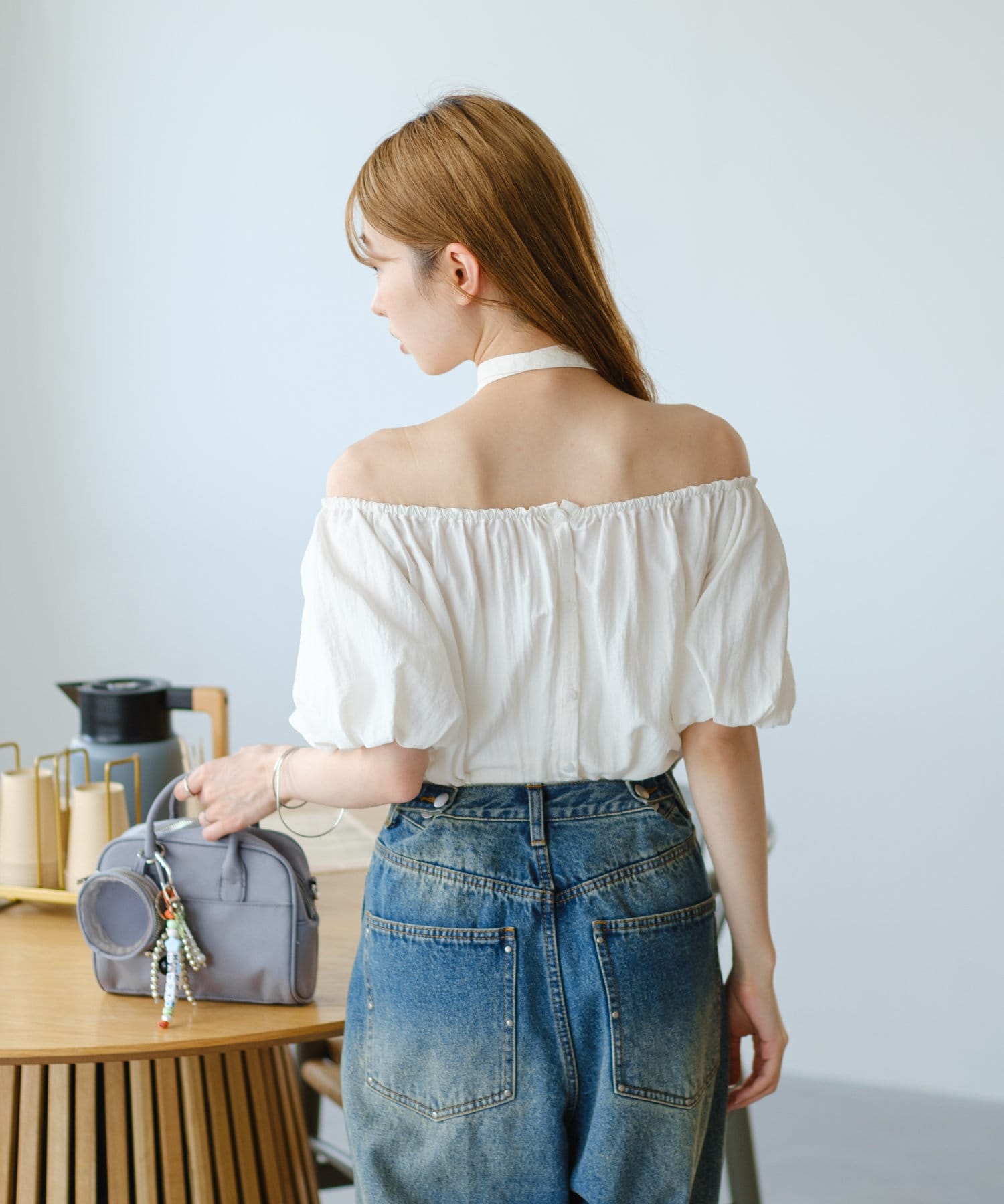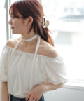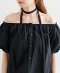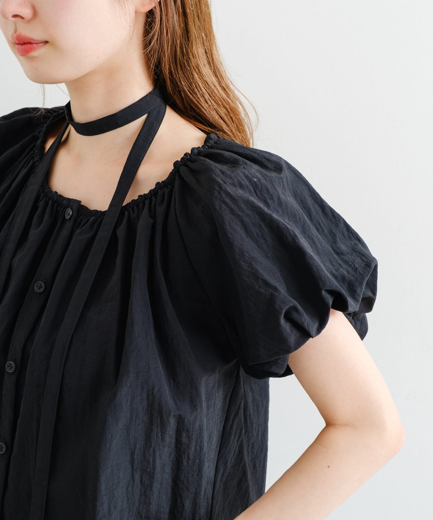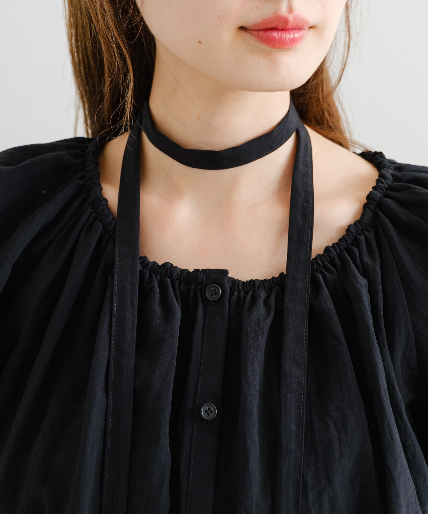 首元のチョーカーデザインが目を引く、旬なデザインのコンパクトブラウス。