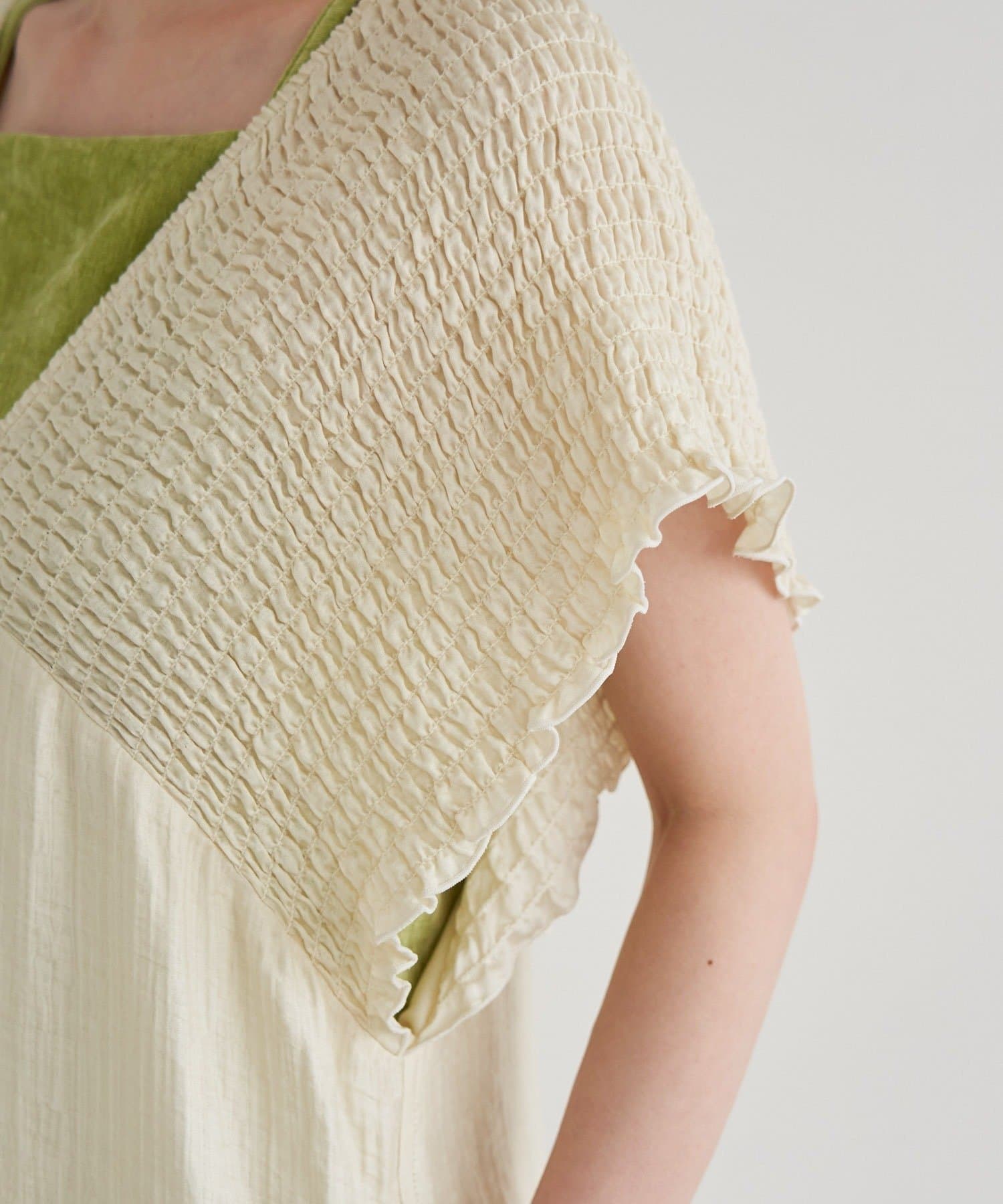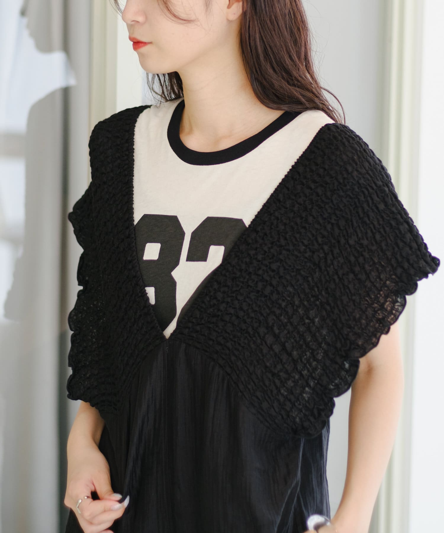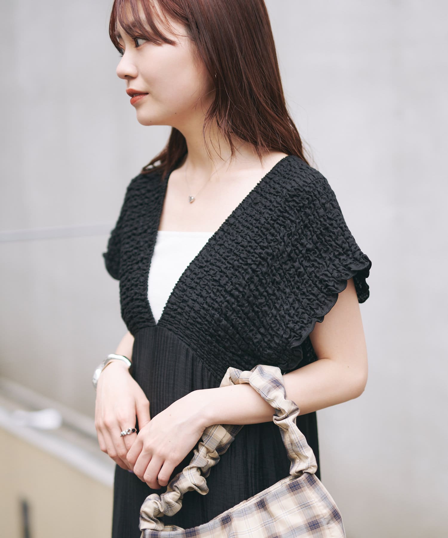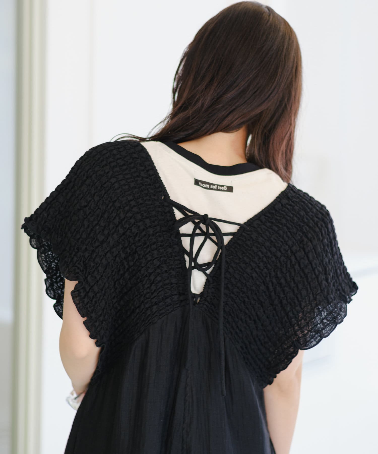 デザイン性があるのでカップ付きのキャミソールやタンクと合わせて一枚で着ていただくのがオススメです。
