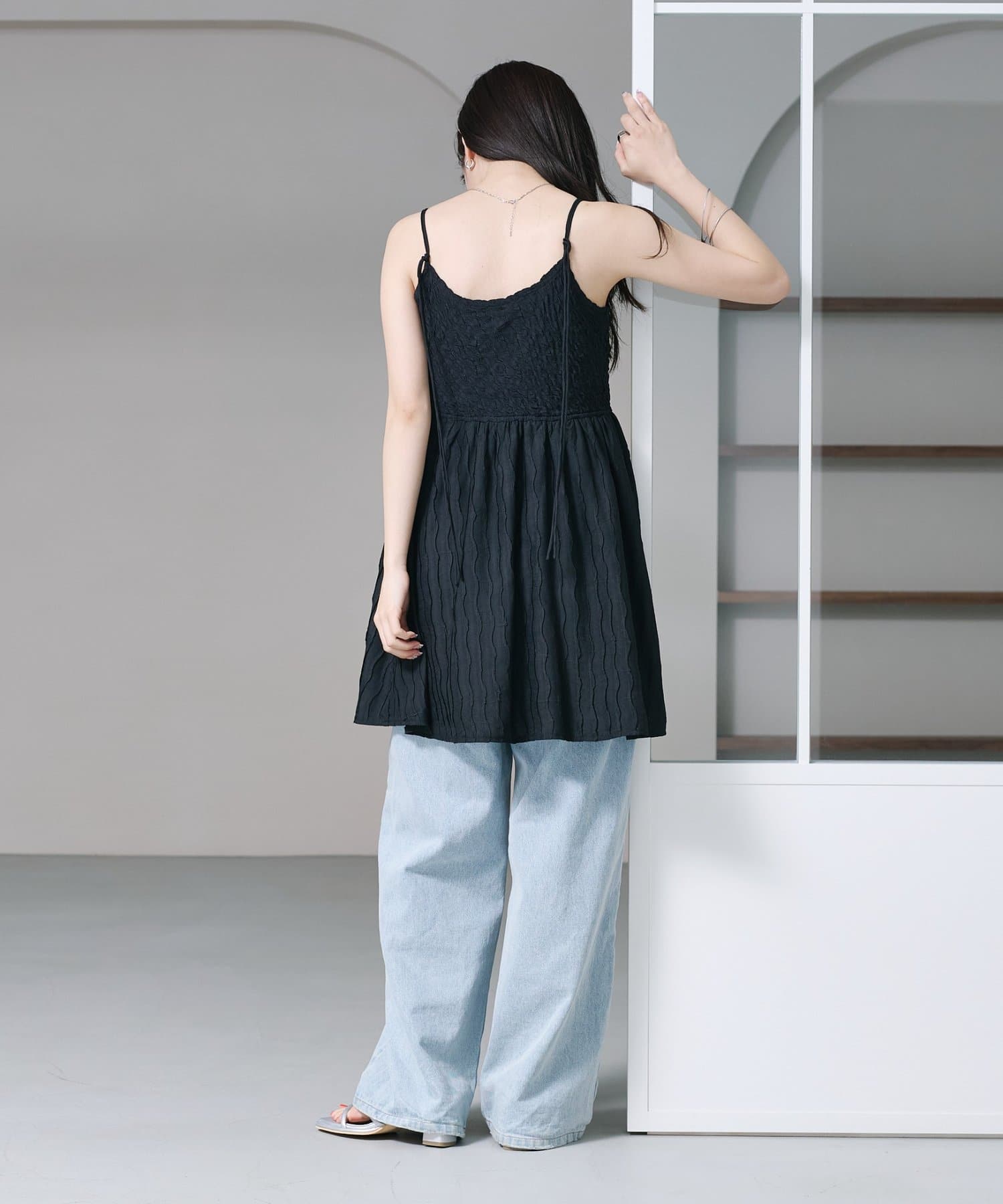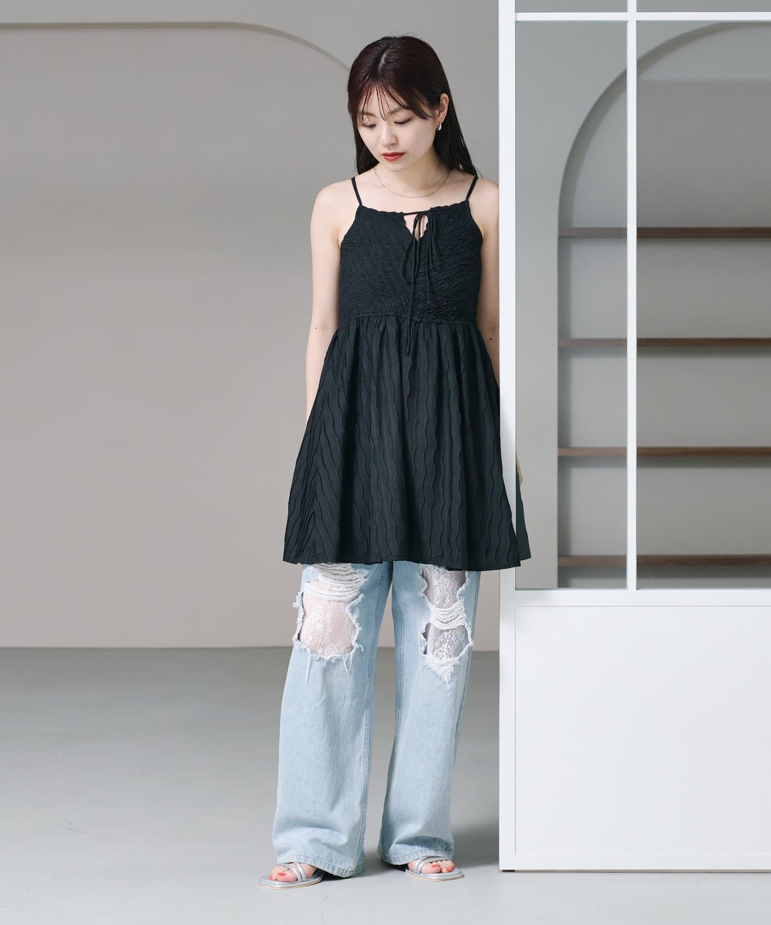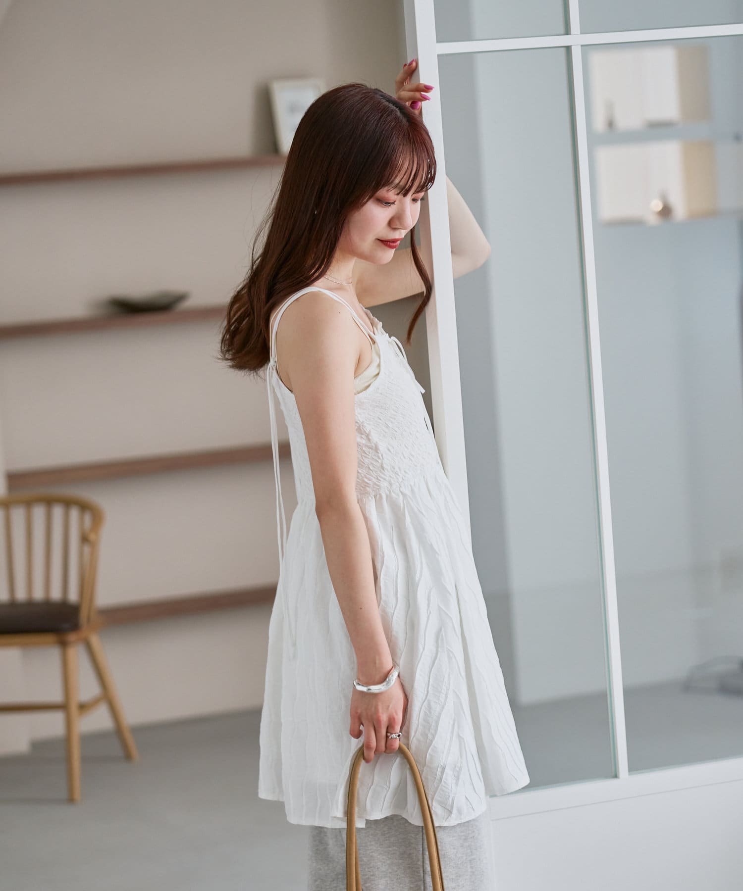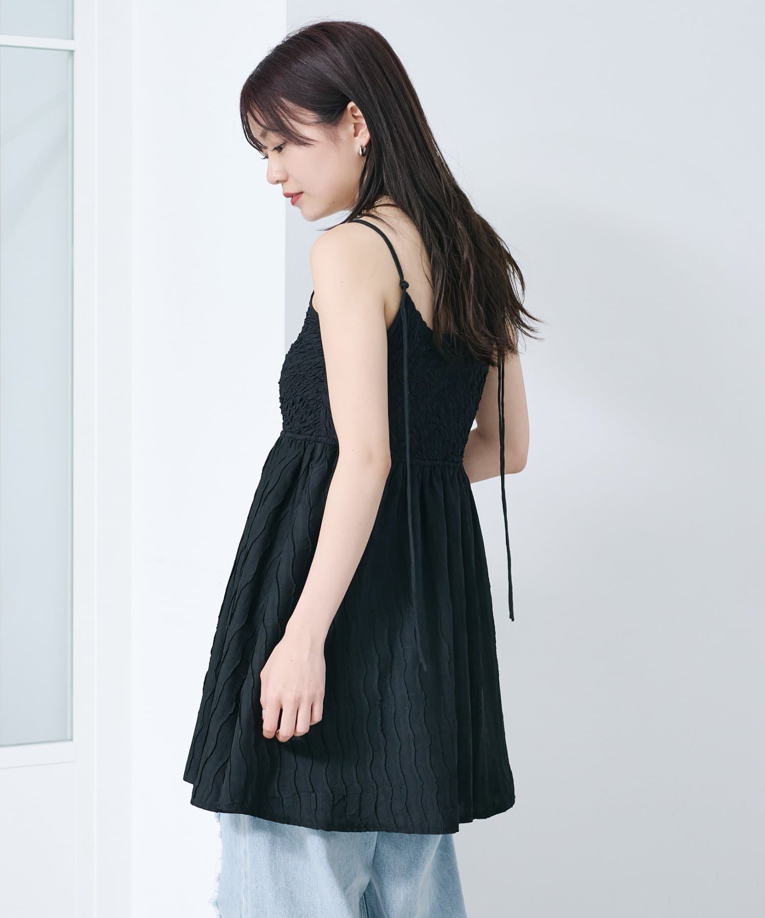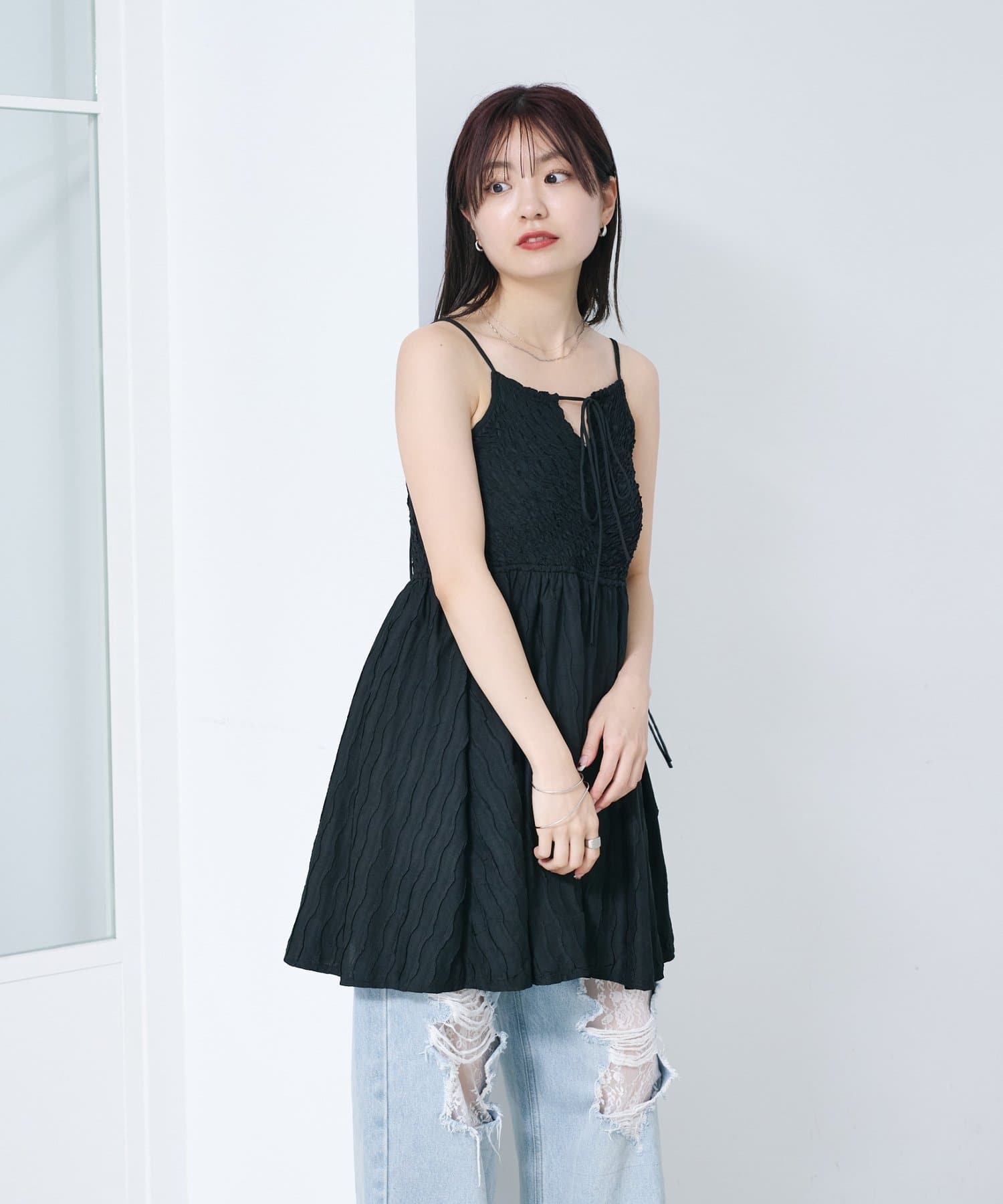 ウェーブ柄と胸元のリボンが女性らしい裏地付きのチュニック。