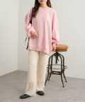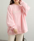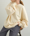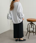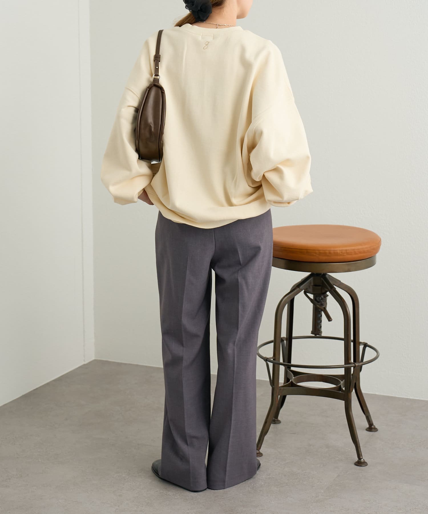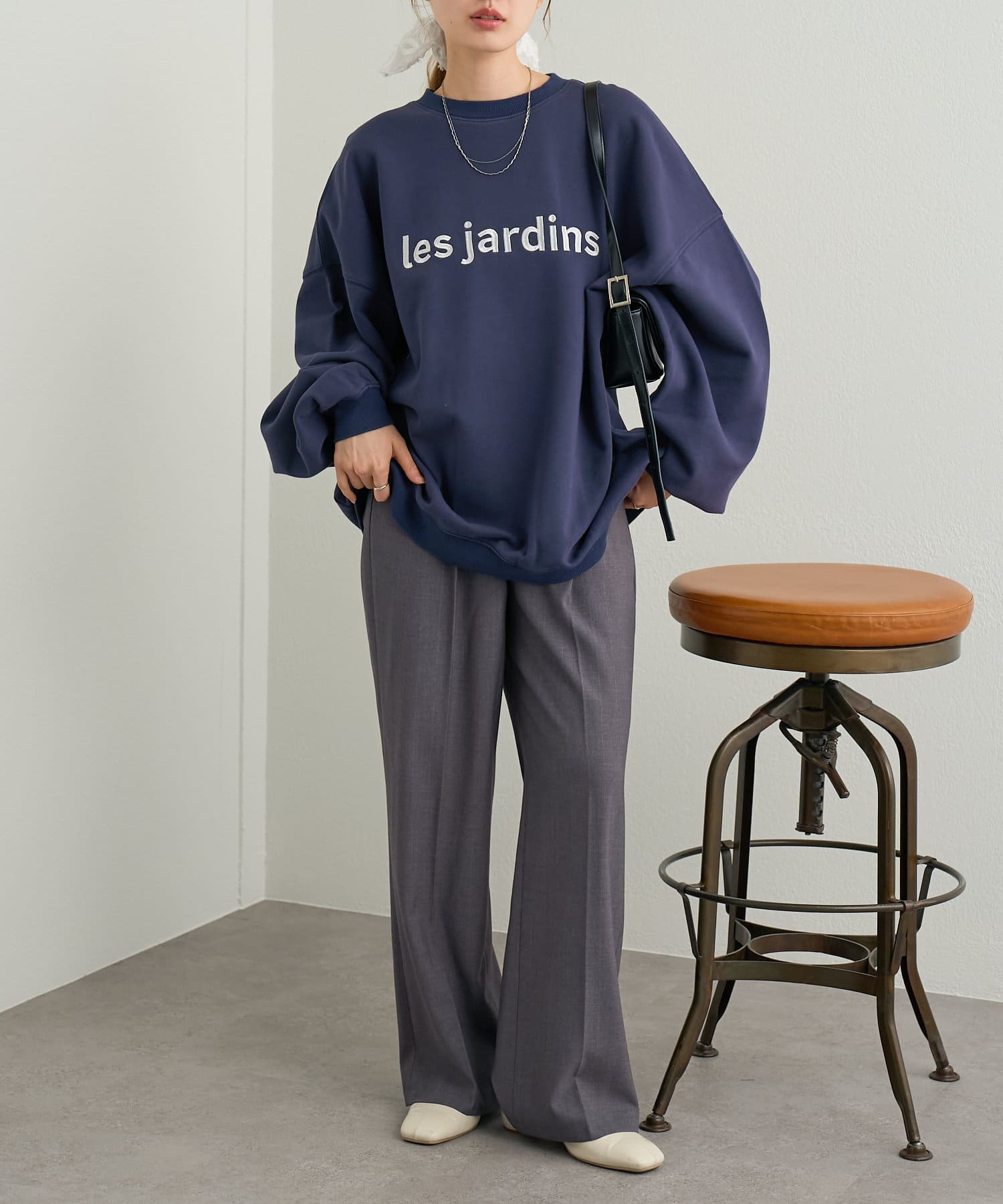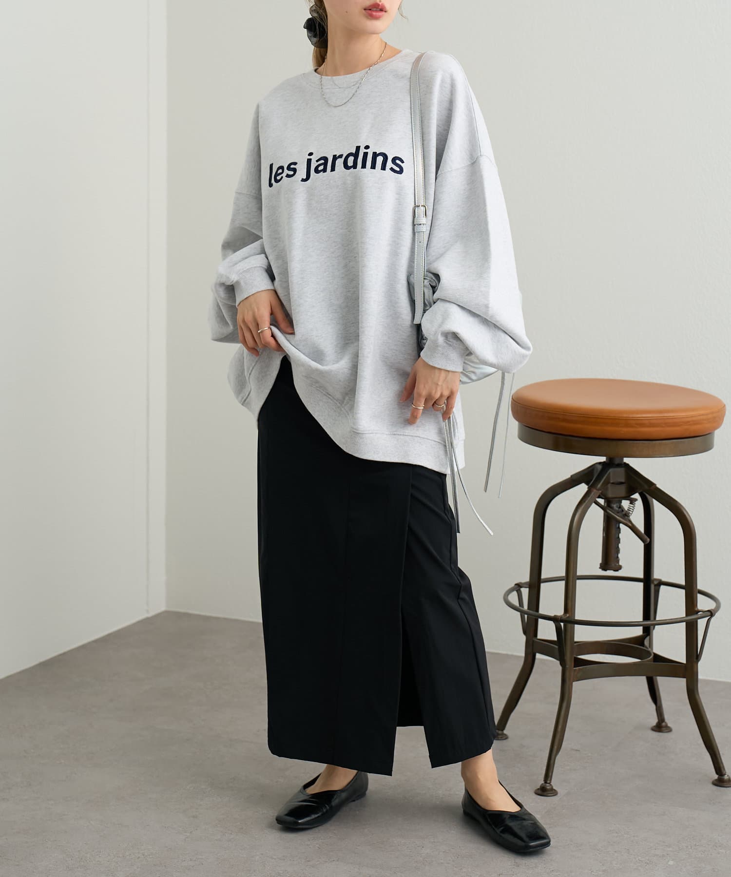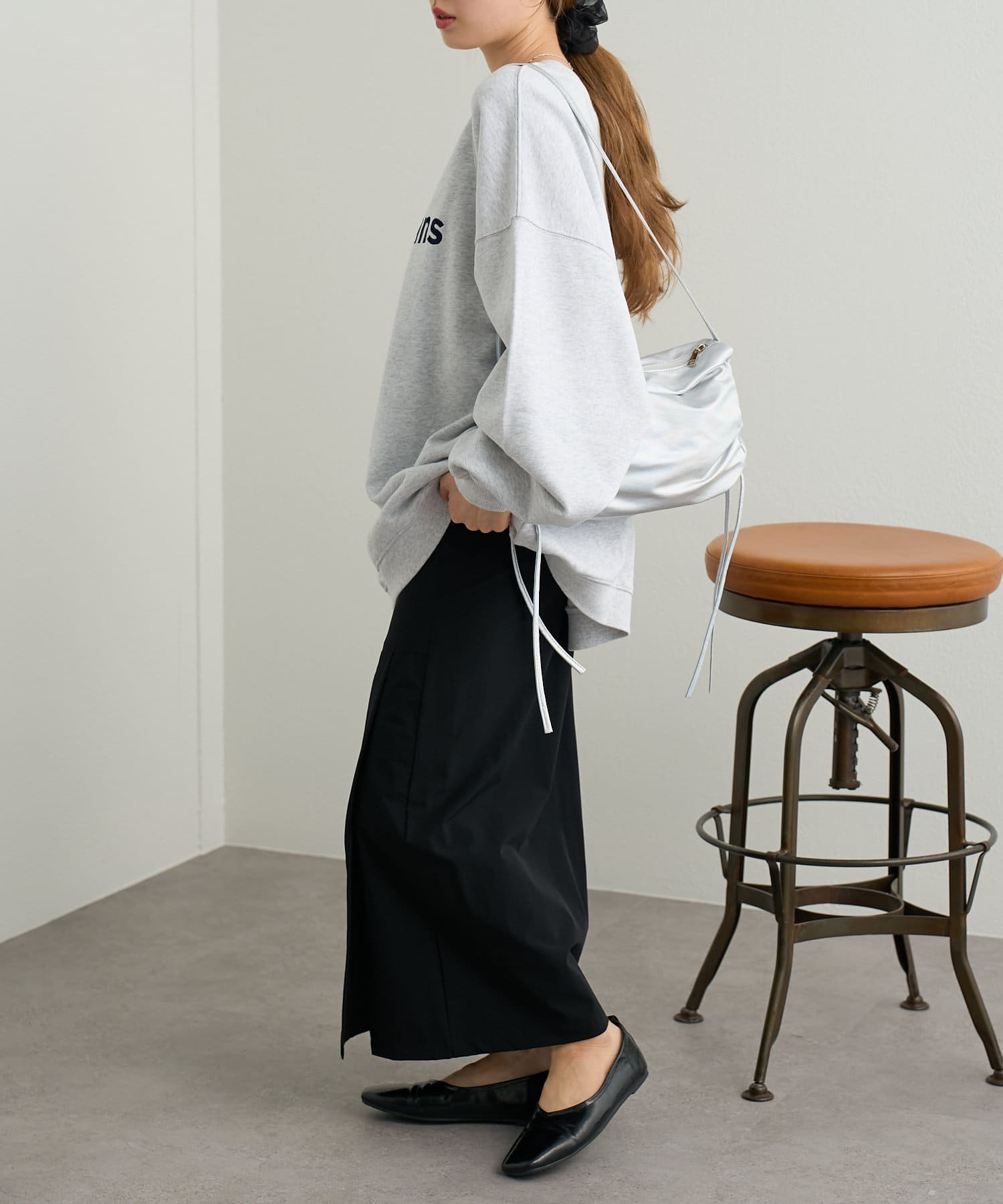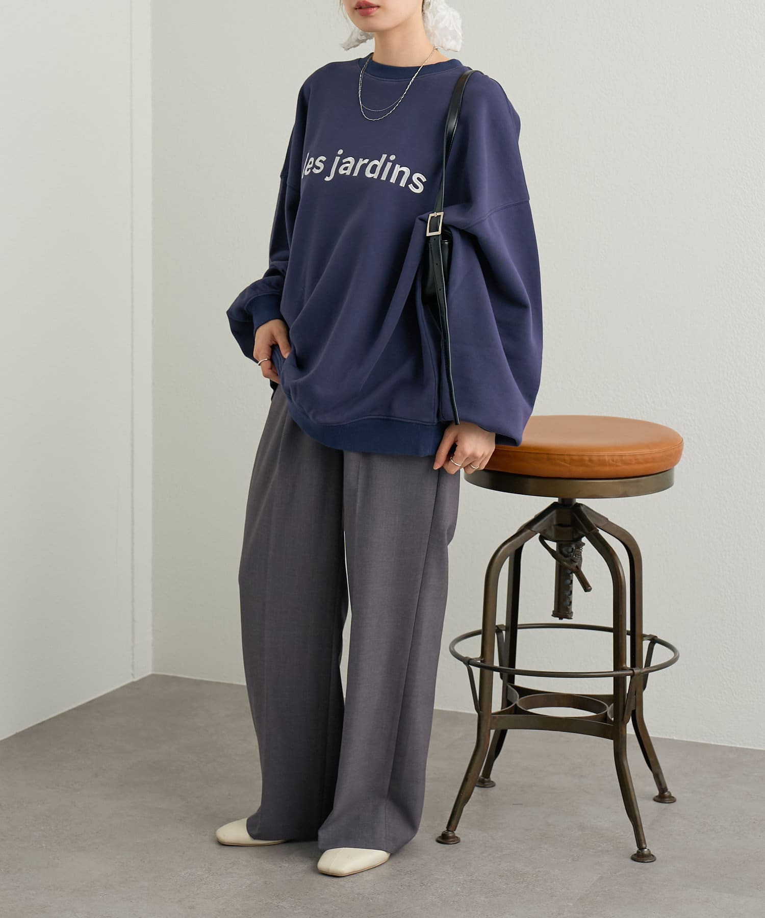 スウェットのカジュアルさに、プリーツスカートやフレアスカートを組み合わせると、女性らしいやわらかな印象に。