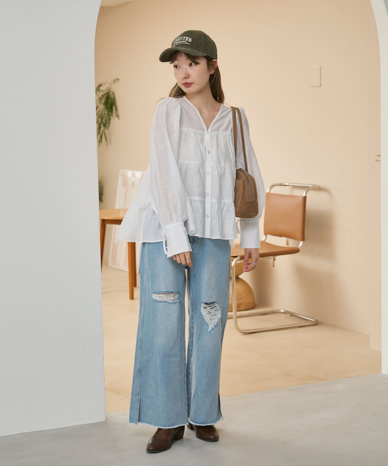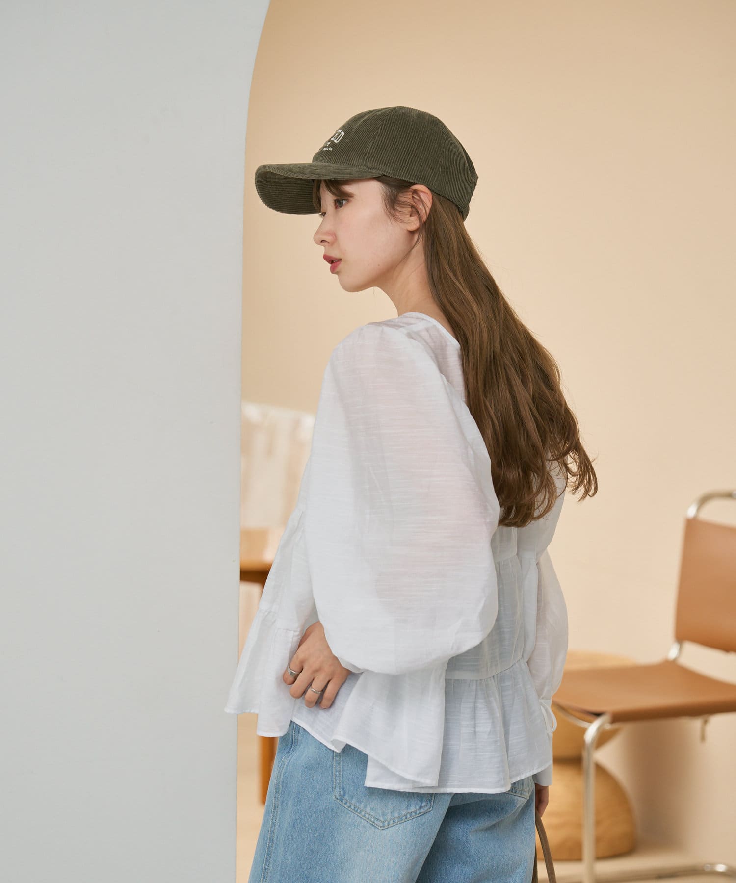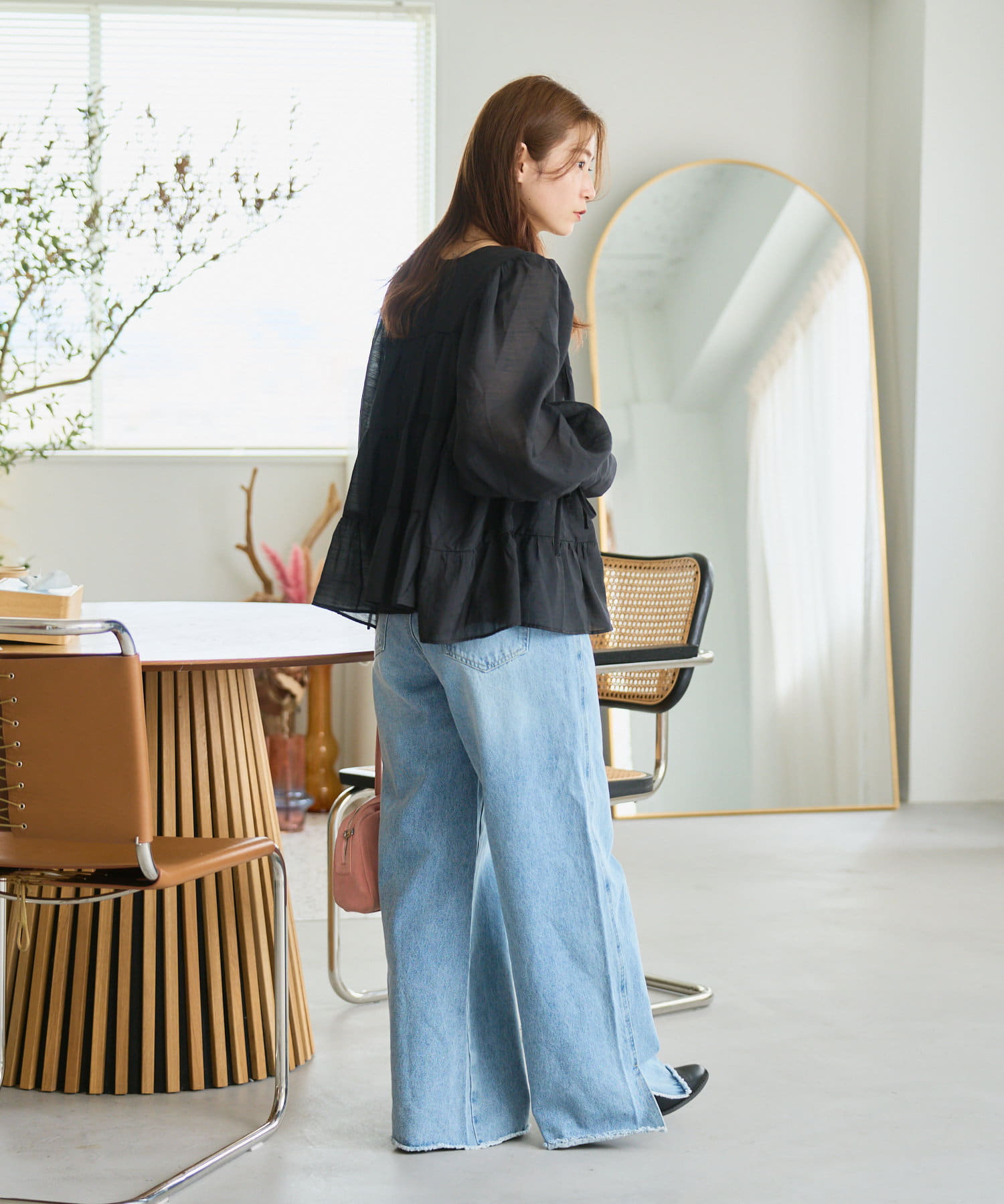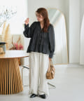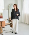 袖はゆったりとしたバルーンスリーブになっているので、手元に女性らしいニュアンスをプラス。