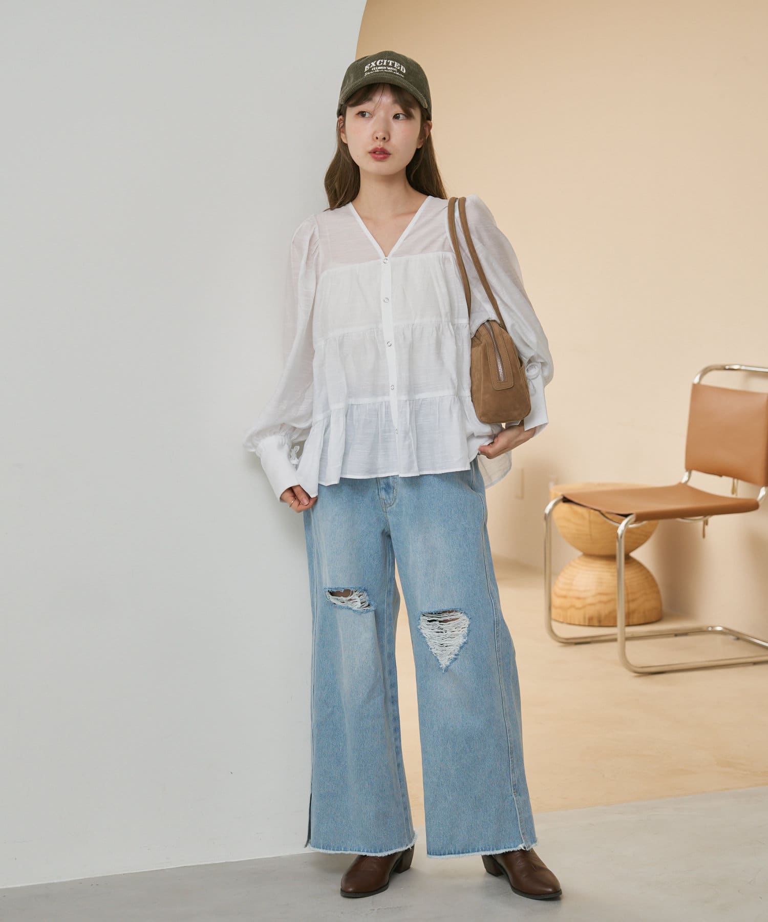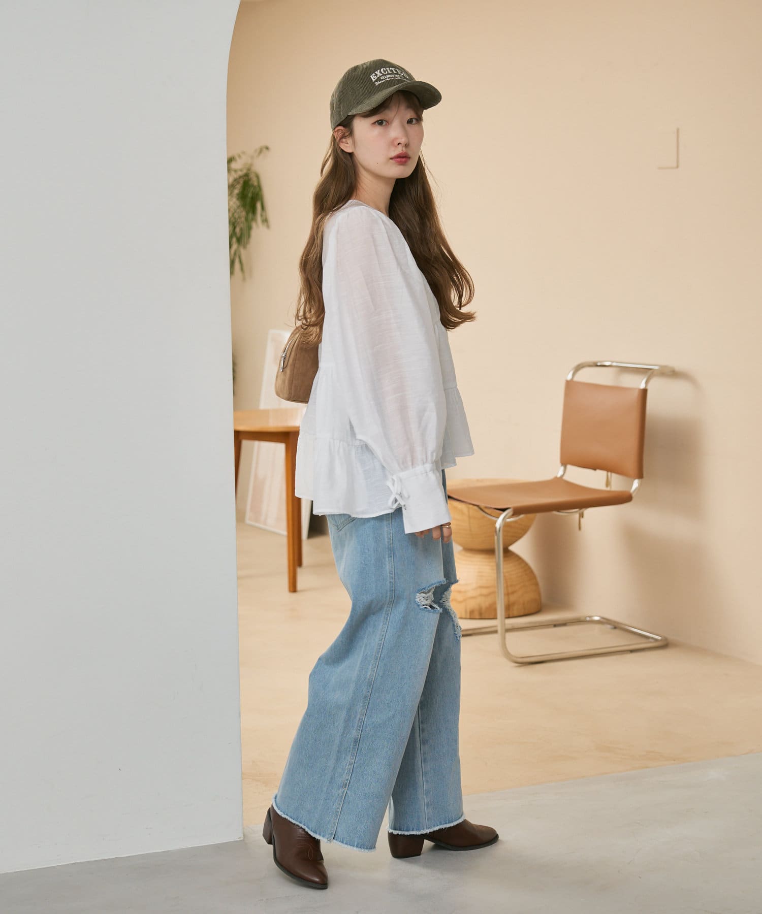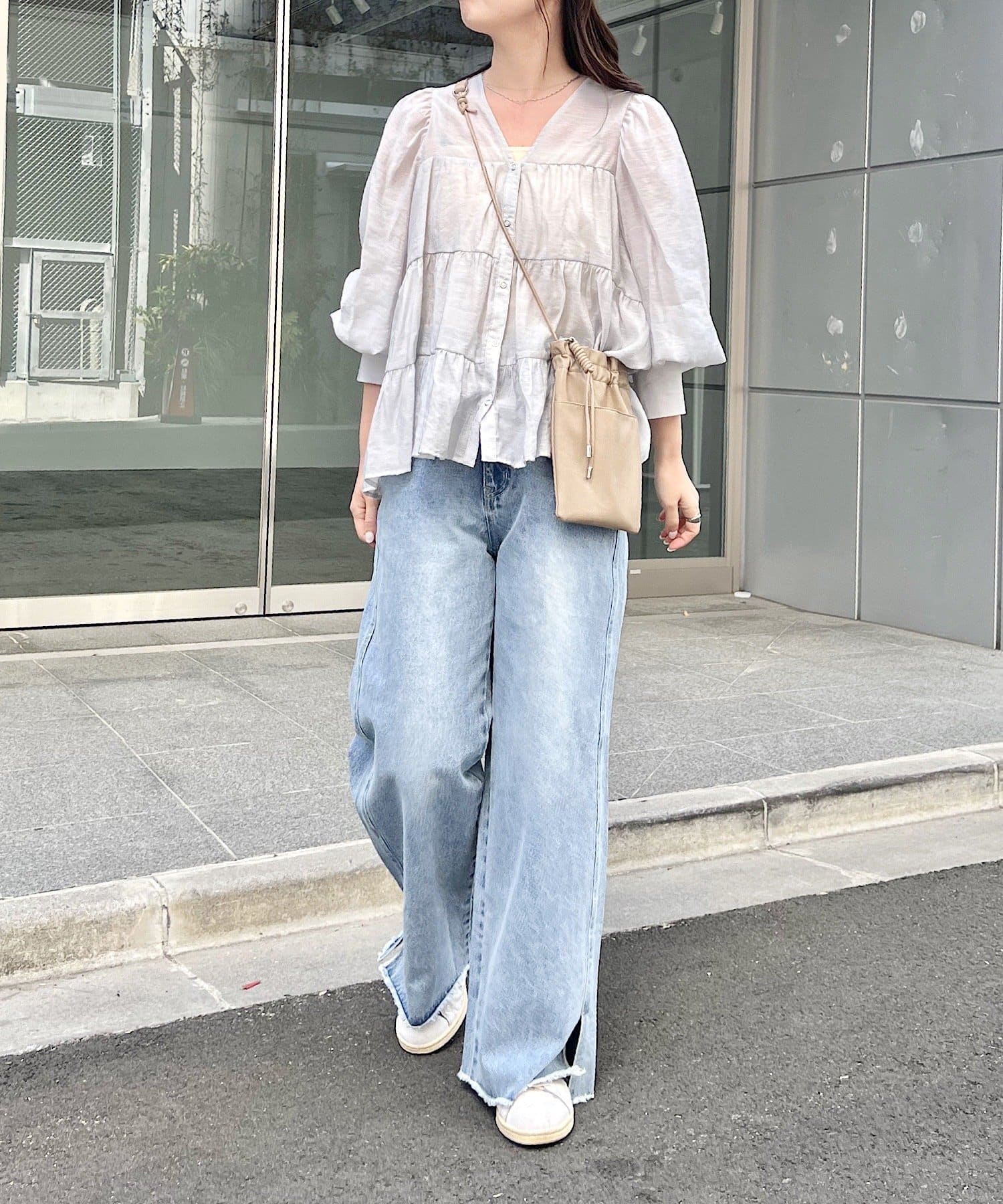 袖はゆったりとしたバルーンスリーブになっているので、手元に女性らしいニュアンスをプラス。