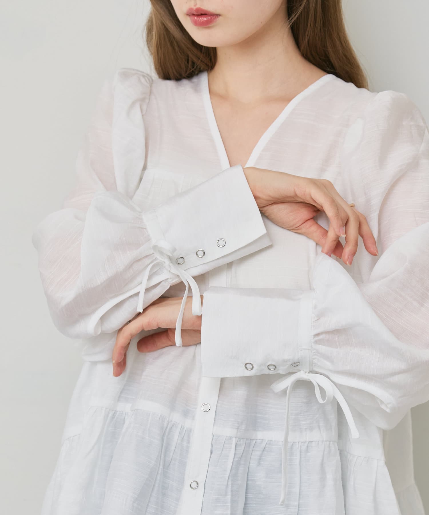 胸元から裾にかけてティアードデザインが施されており、ナチュラルなボリューム感が魅力です。