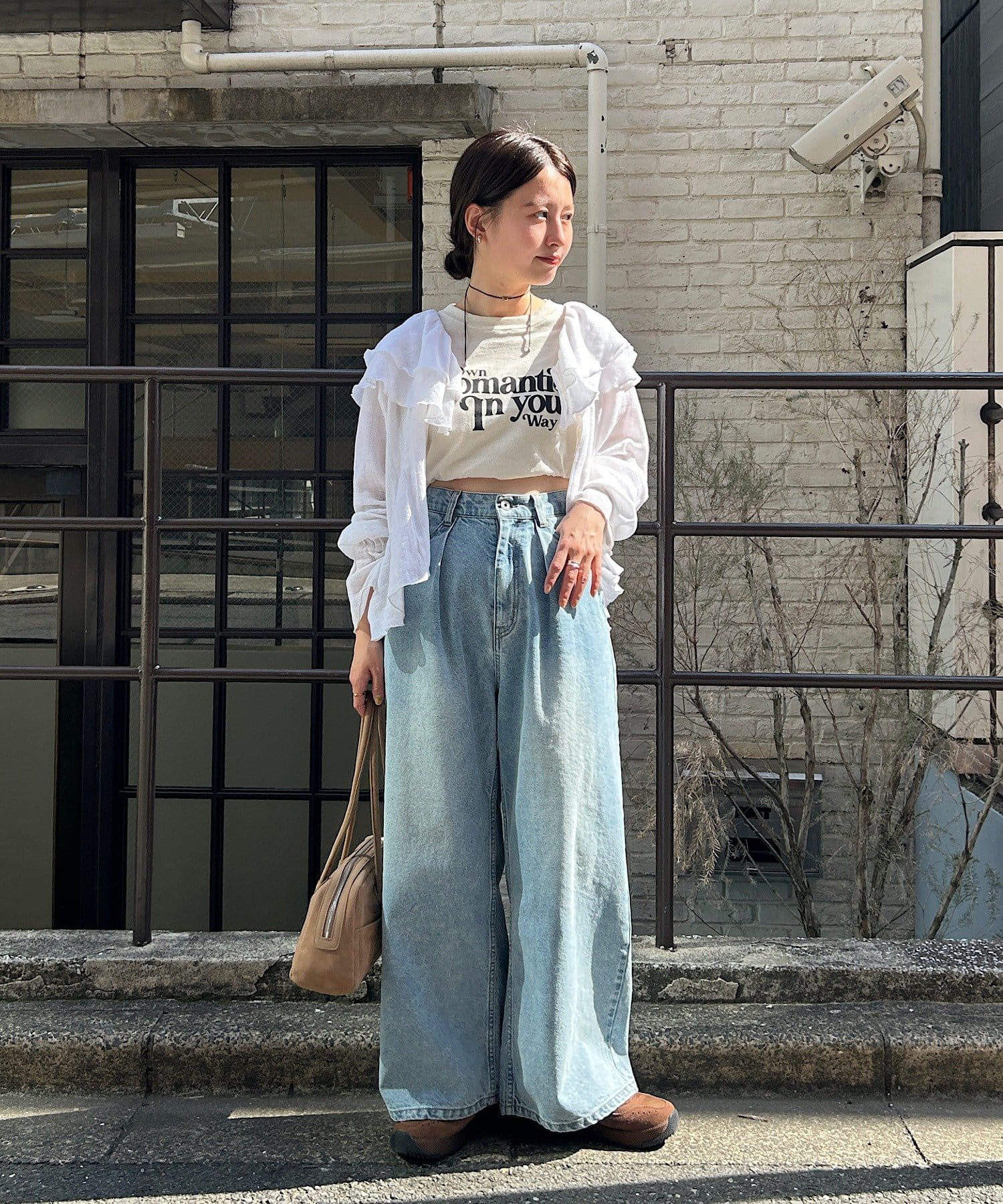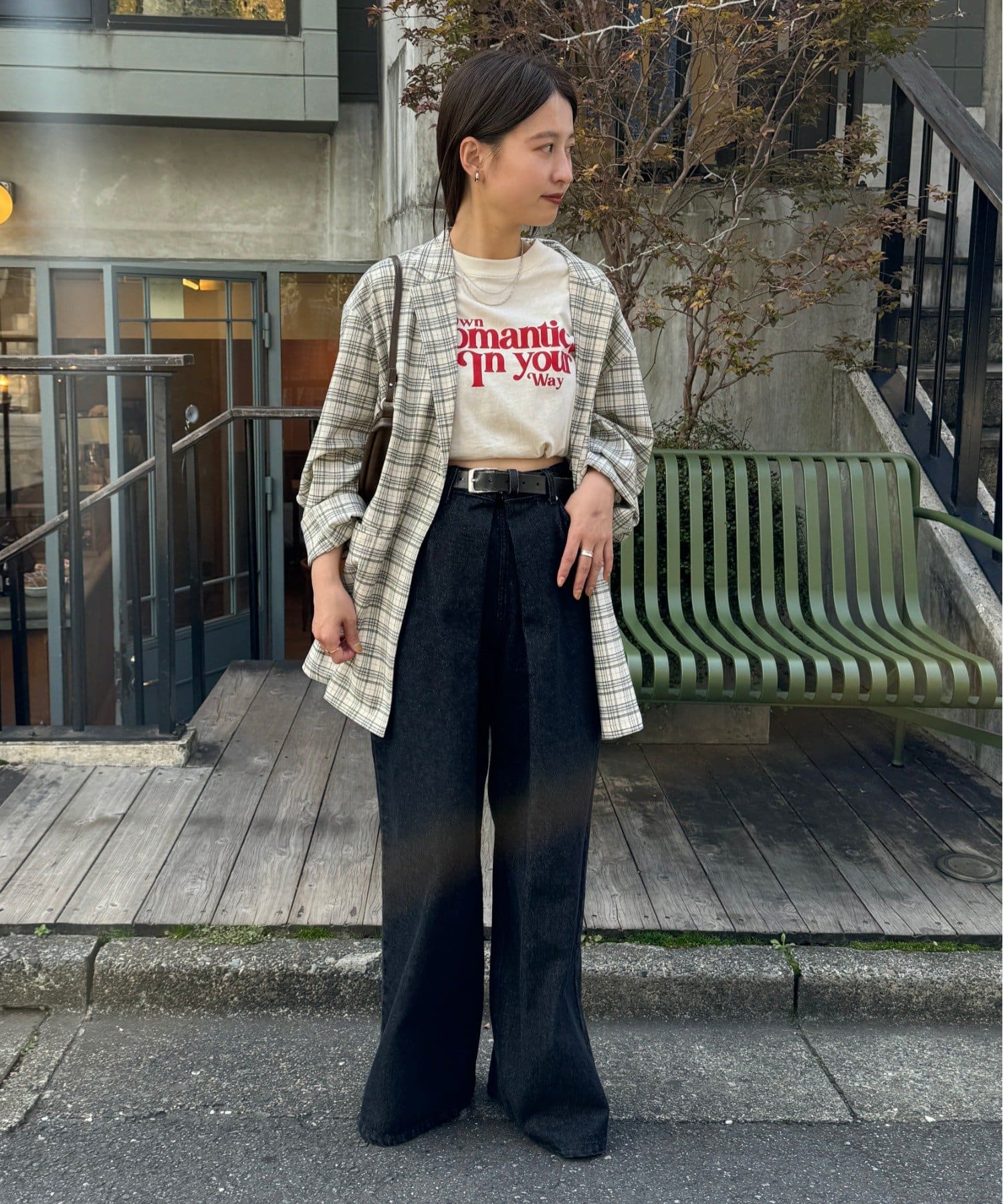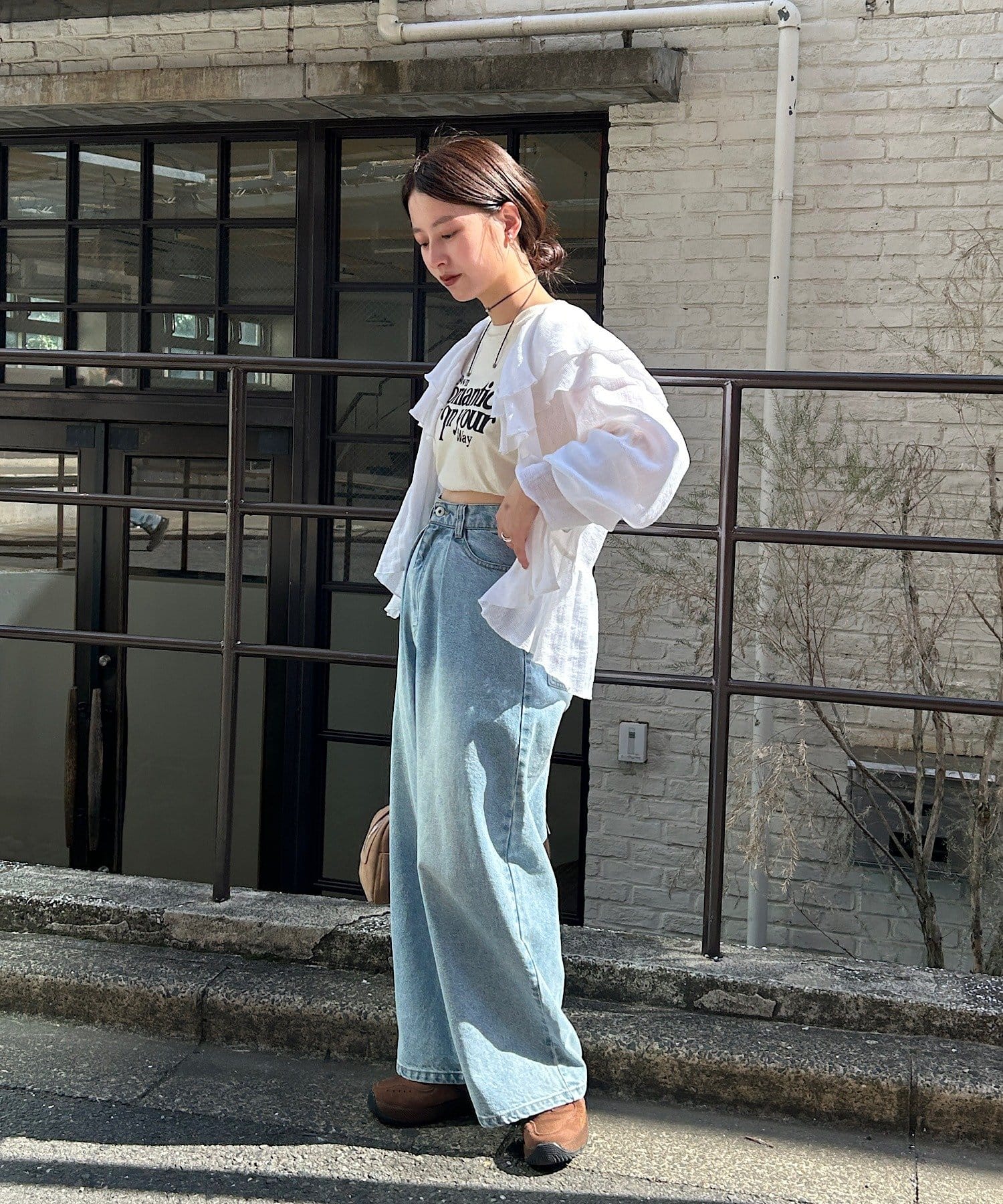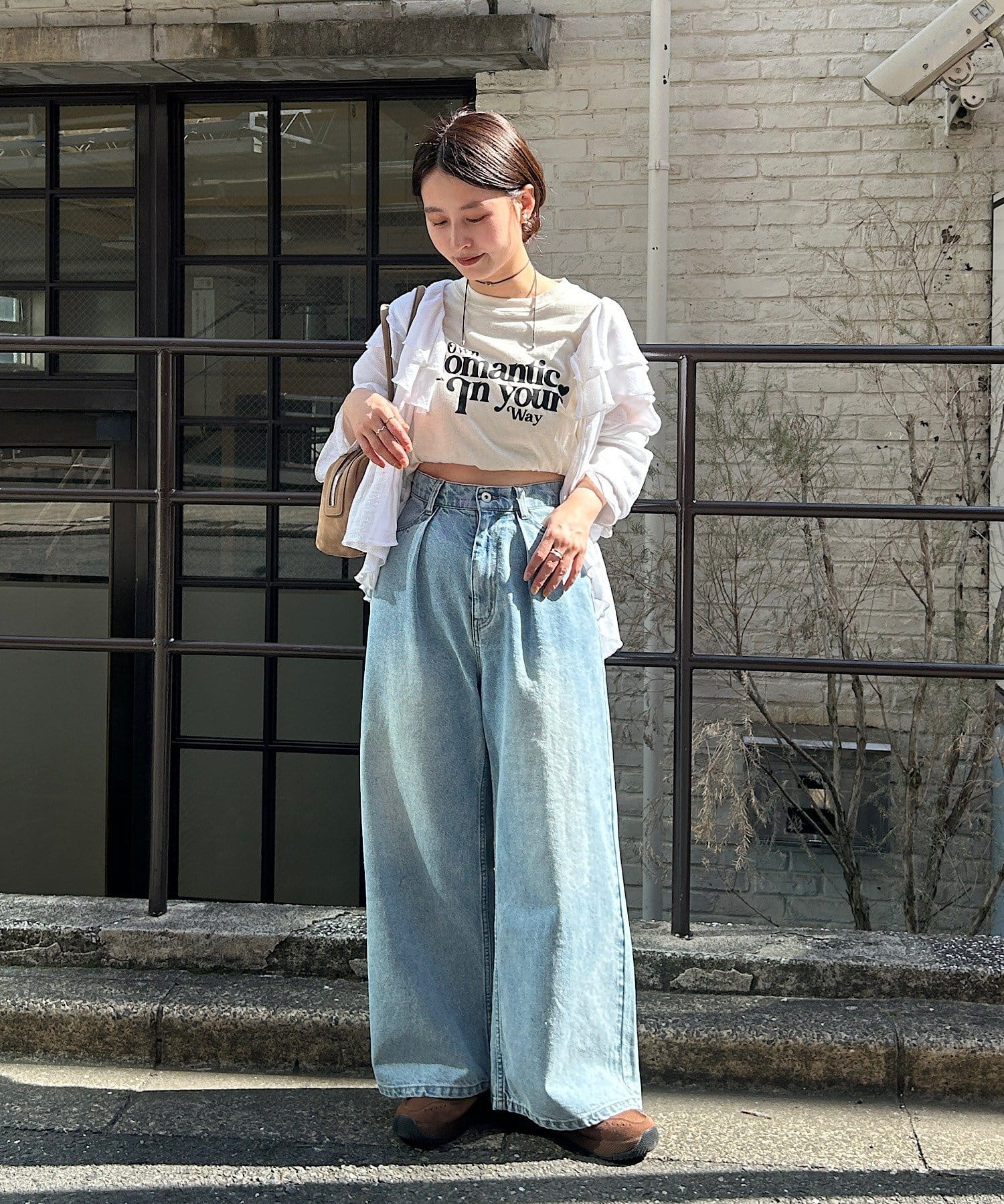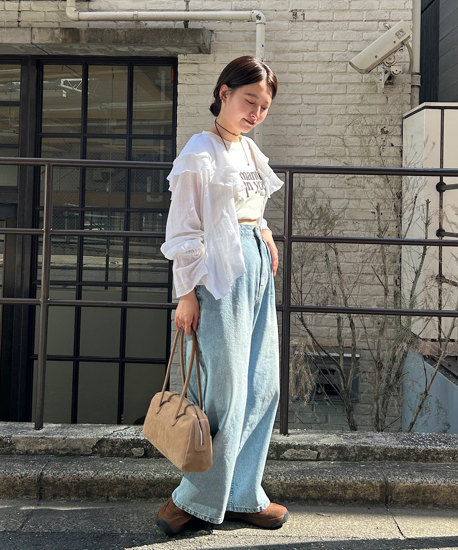 ハイウエストデニムやワイドパンツと合わせたカジュアルスタイルがオススメ。
