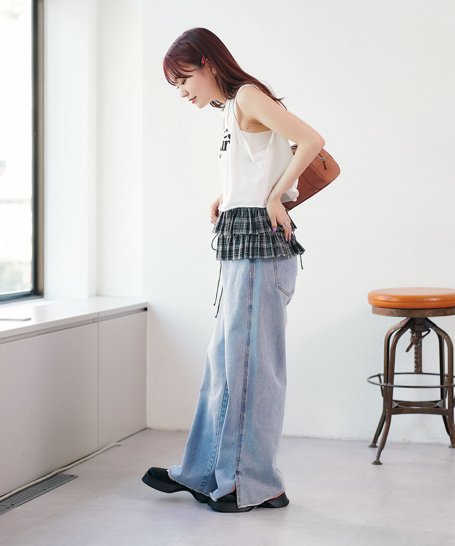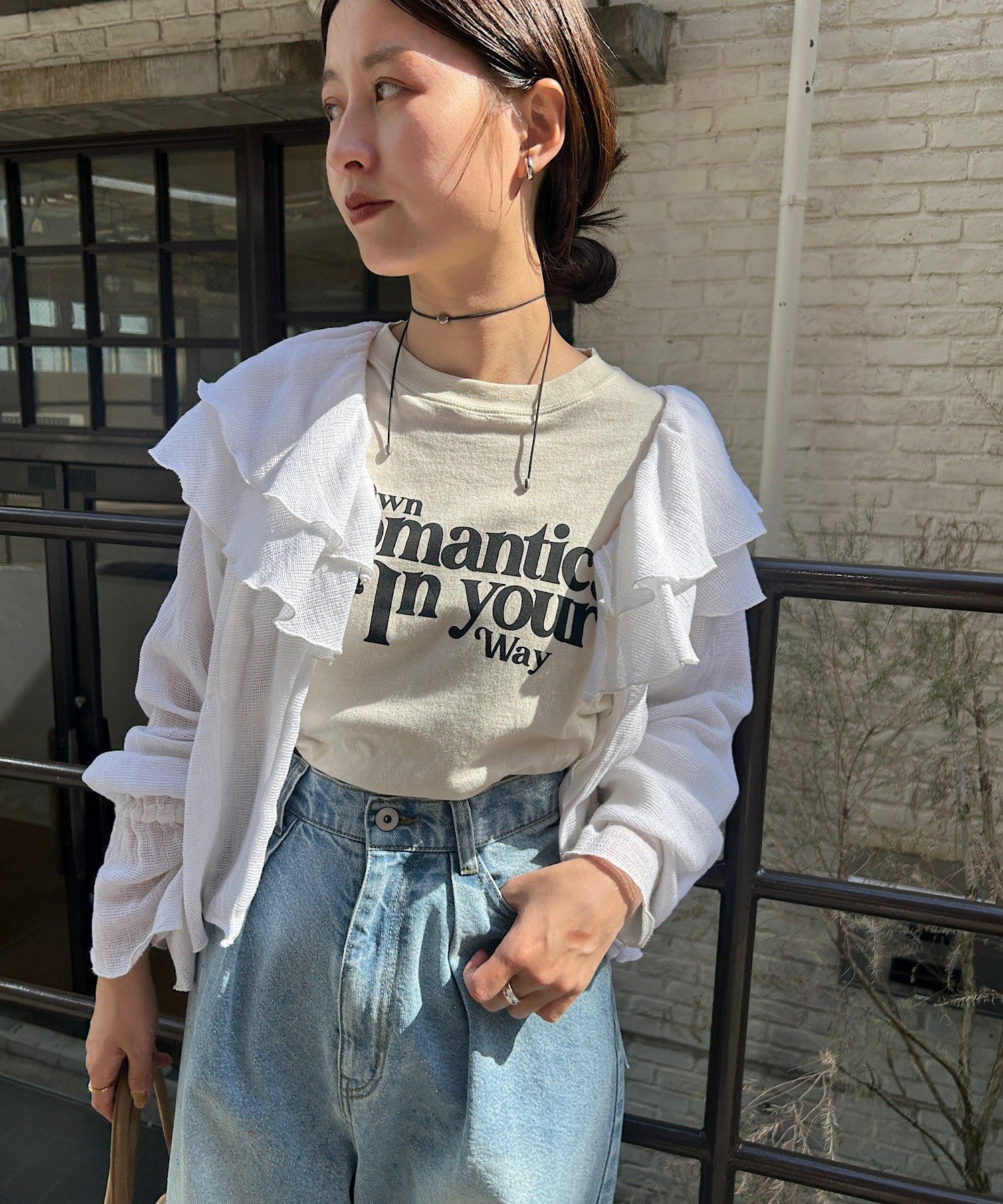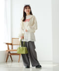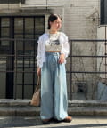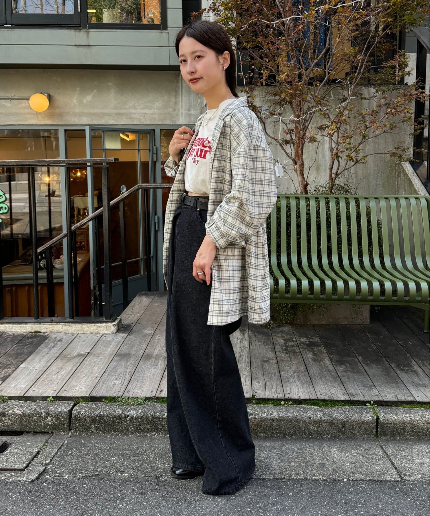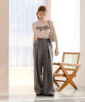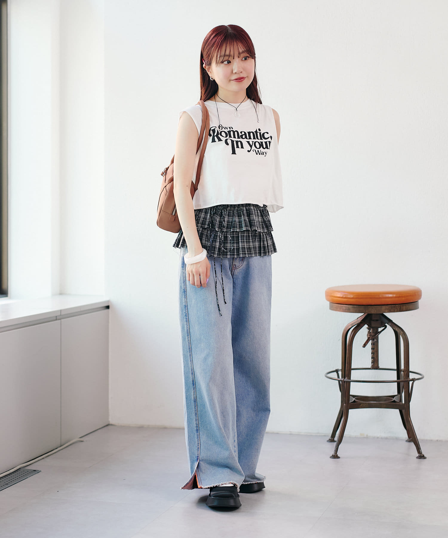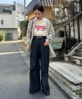 ハイウエストデニムやワイドパンツと合わせたカジュアルスタイルがオススメ。