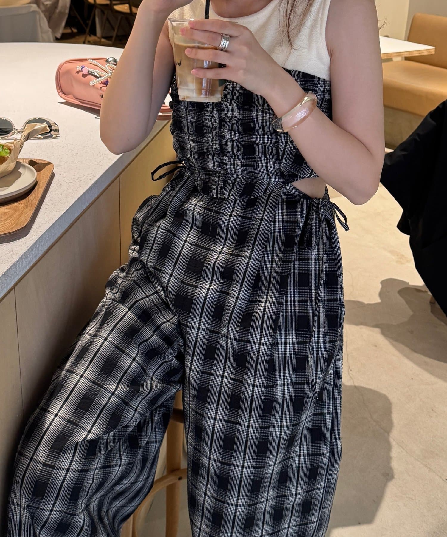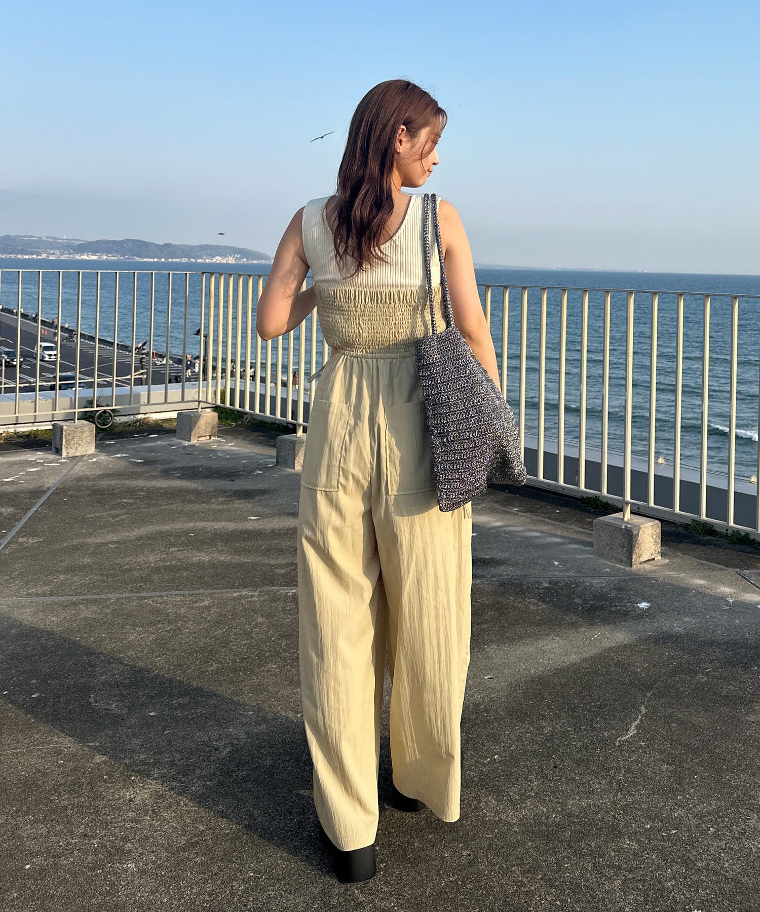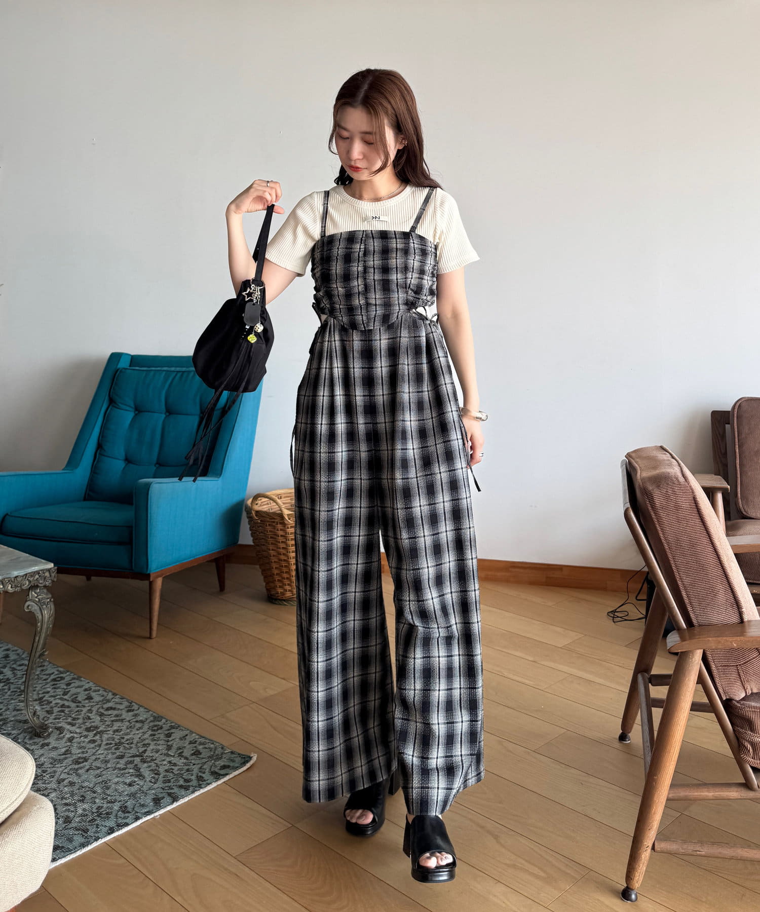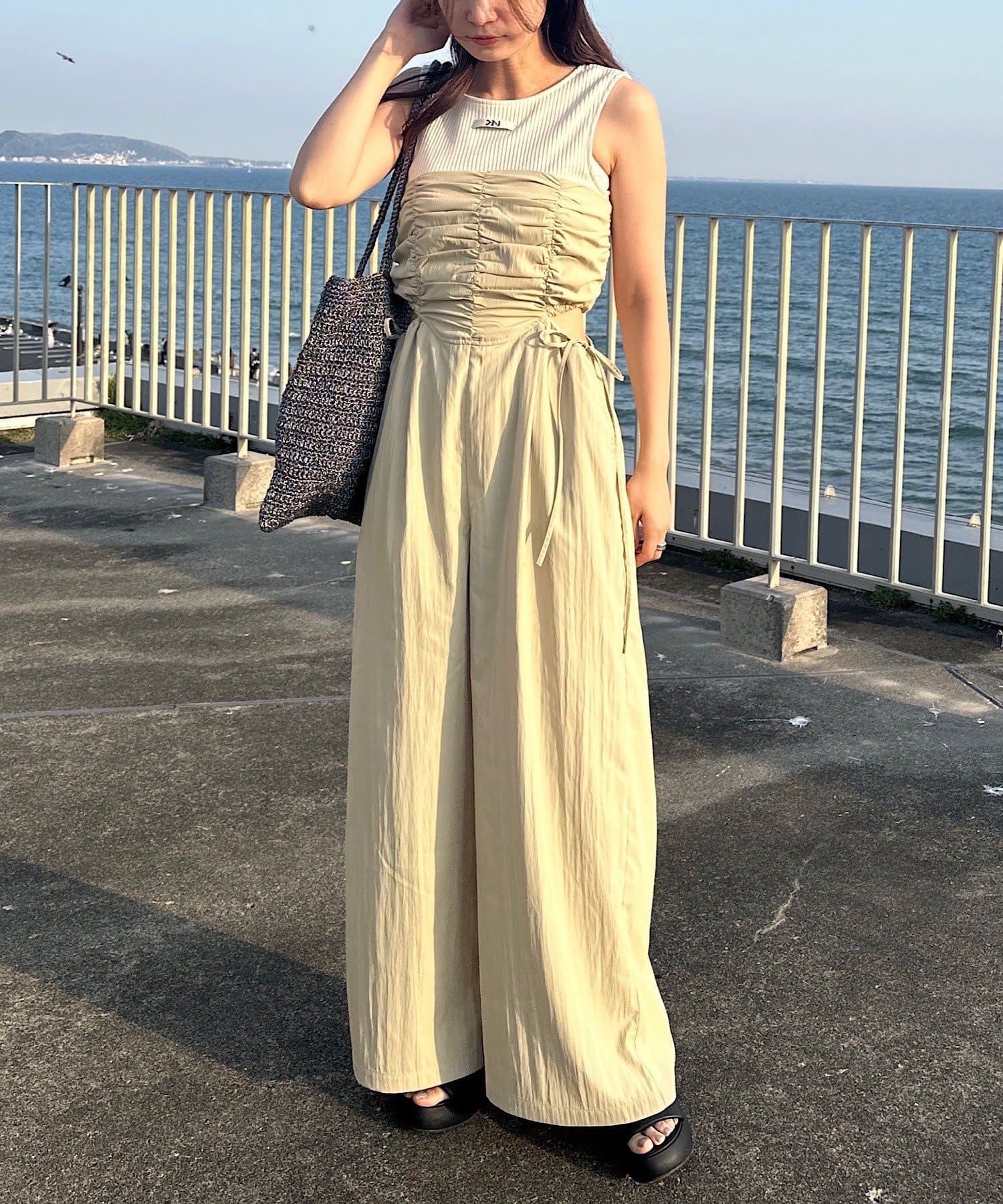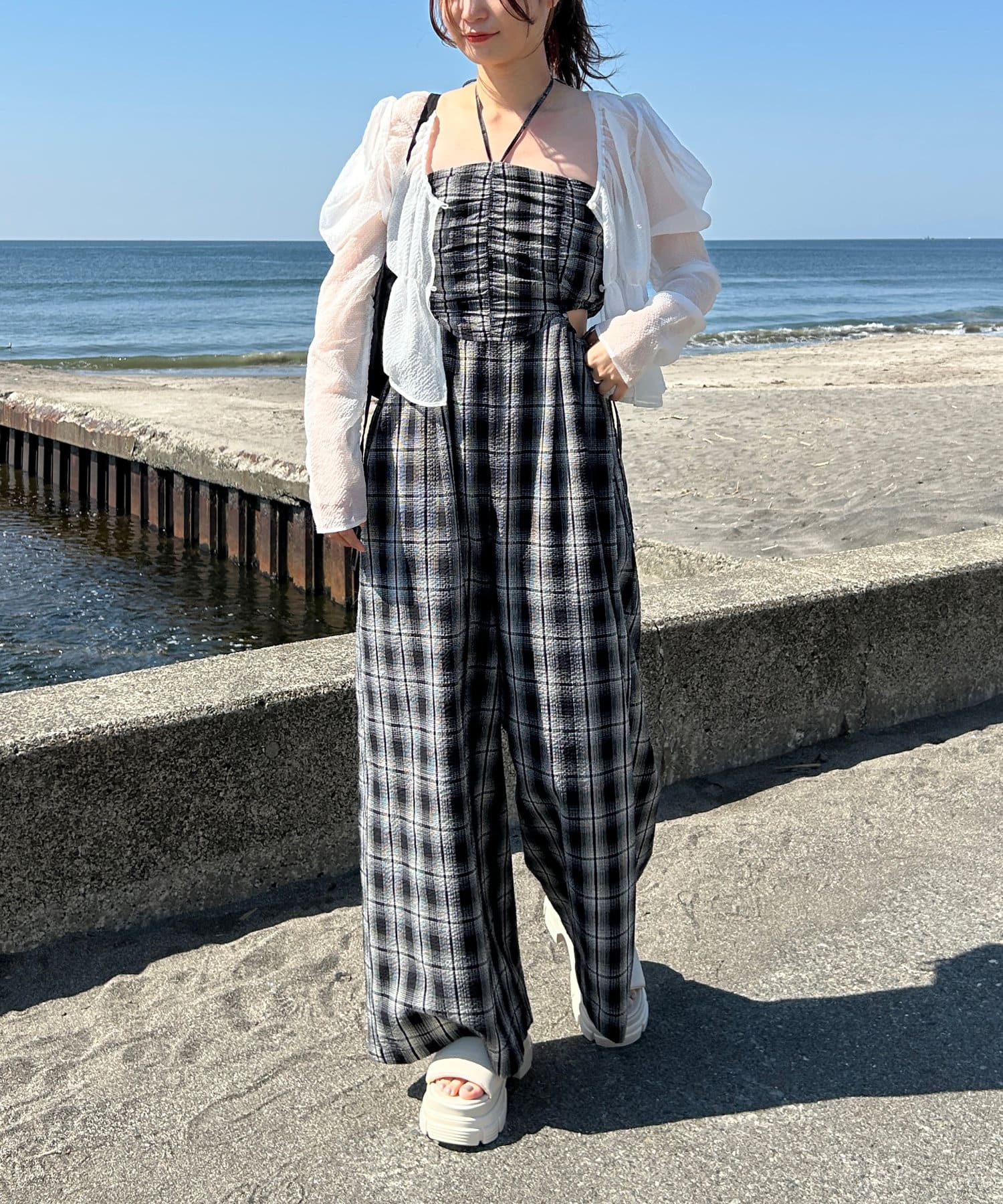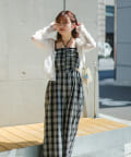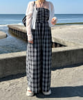インナーはキャミ、タンク、半袖などを合わせて一枚で着映えするサロペットです。