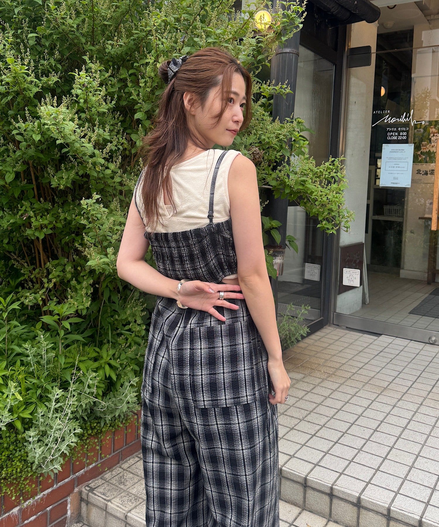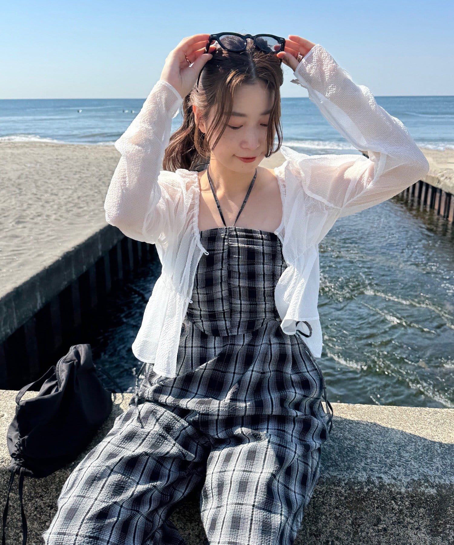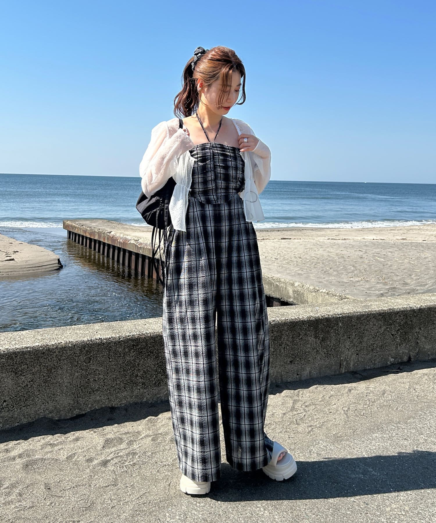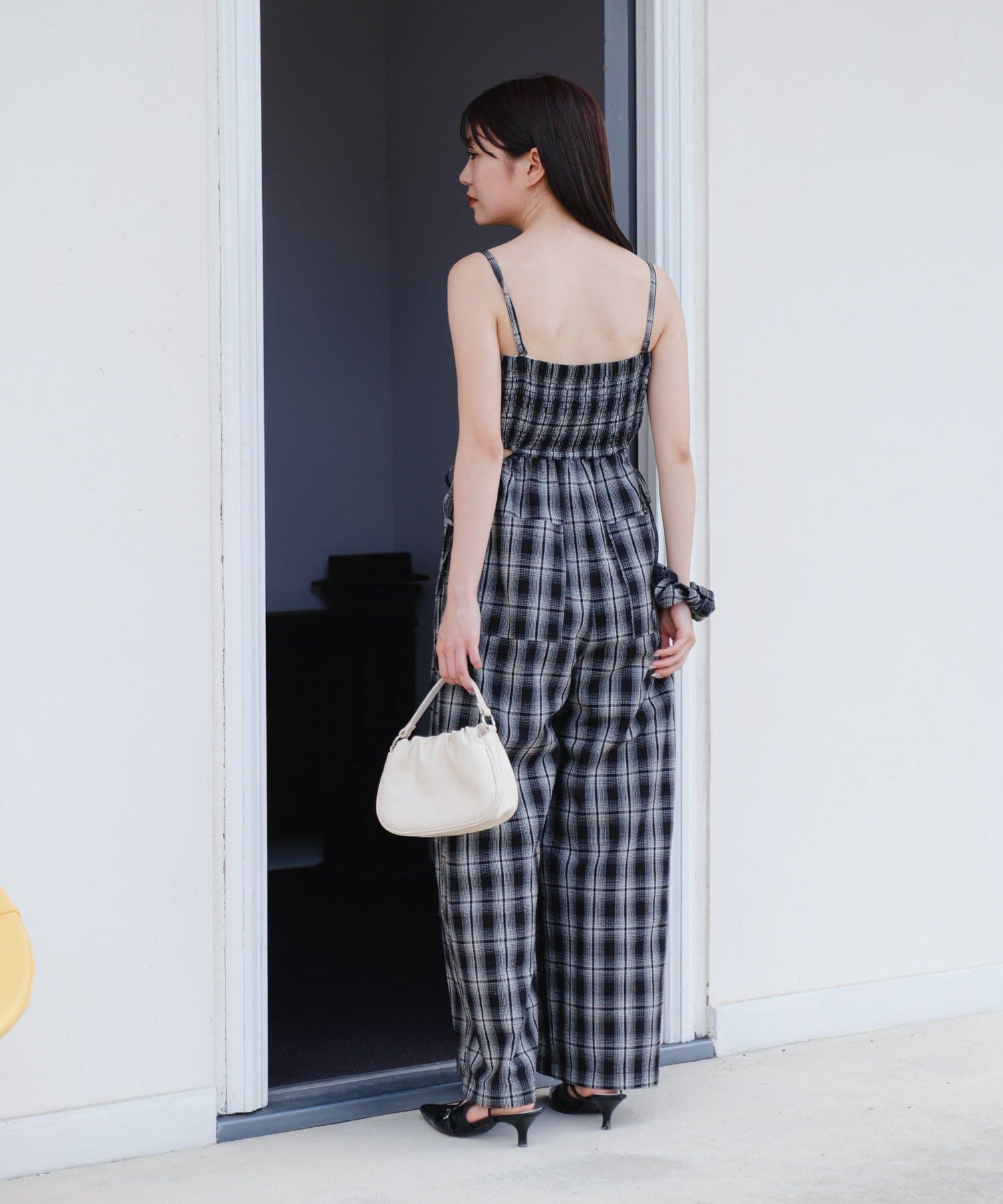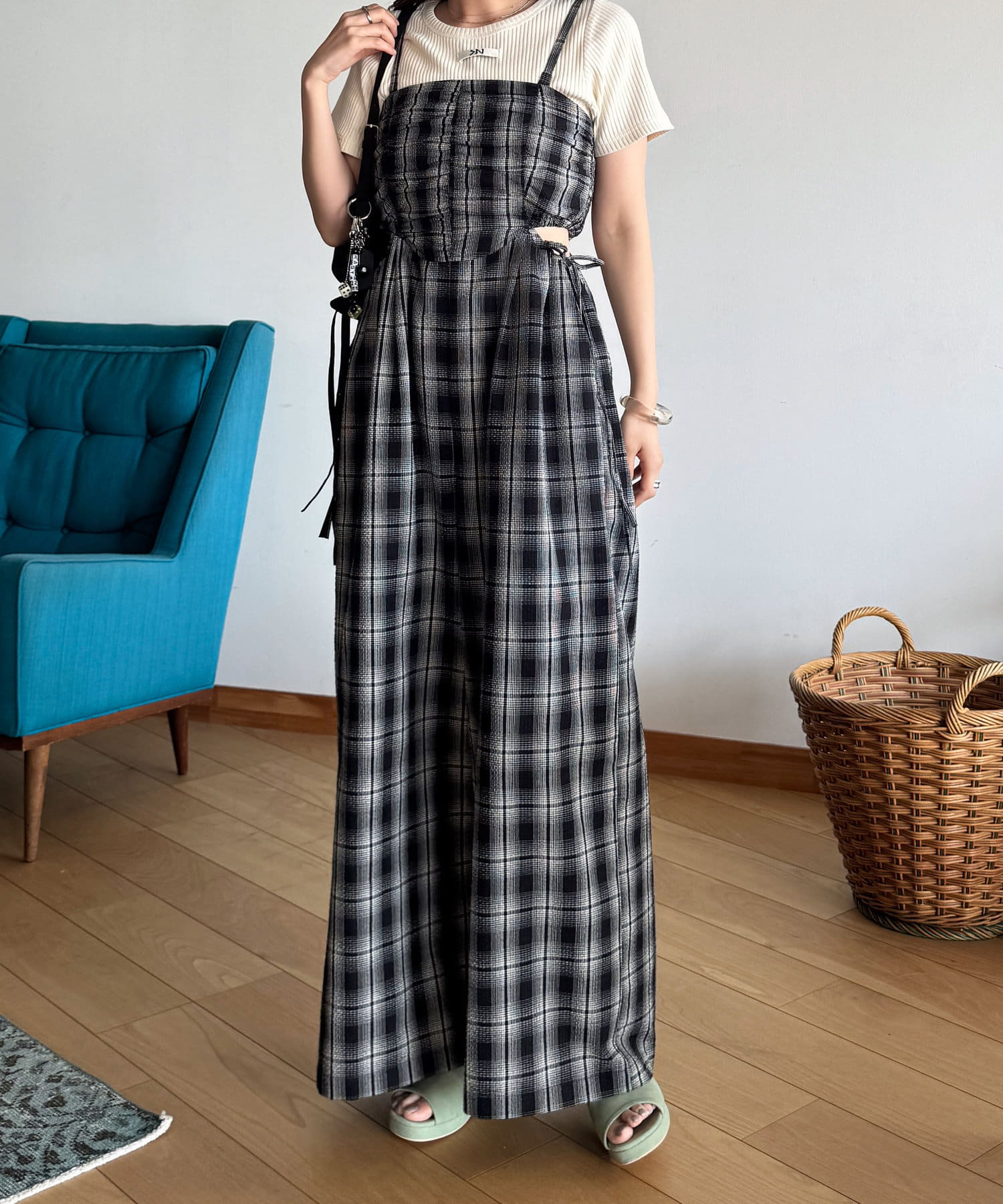 インナーはキャミ、タンク、半袖などを合わせて一枚で着映えするサロペットです。