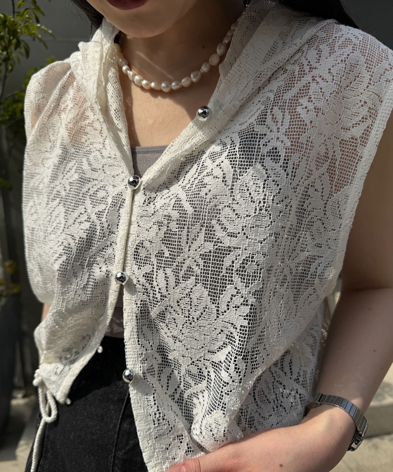 シアーインナーをレイヤードすると、ベスト見えします。