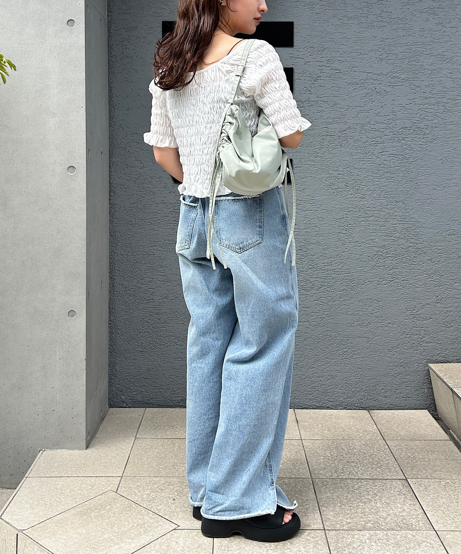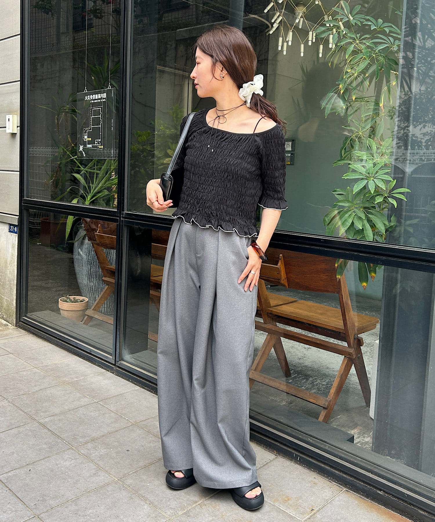 袖口やウエストに施されたシャーリングがさりげなくスタイルアップを叶えてくれます。