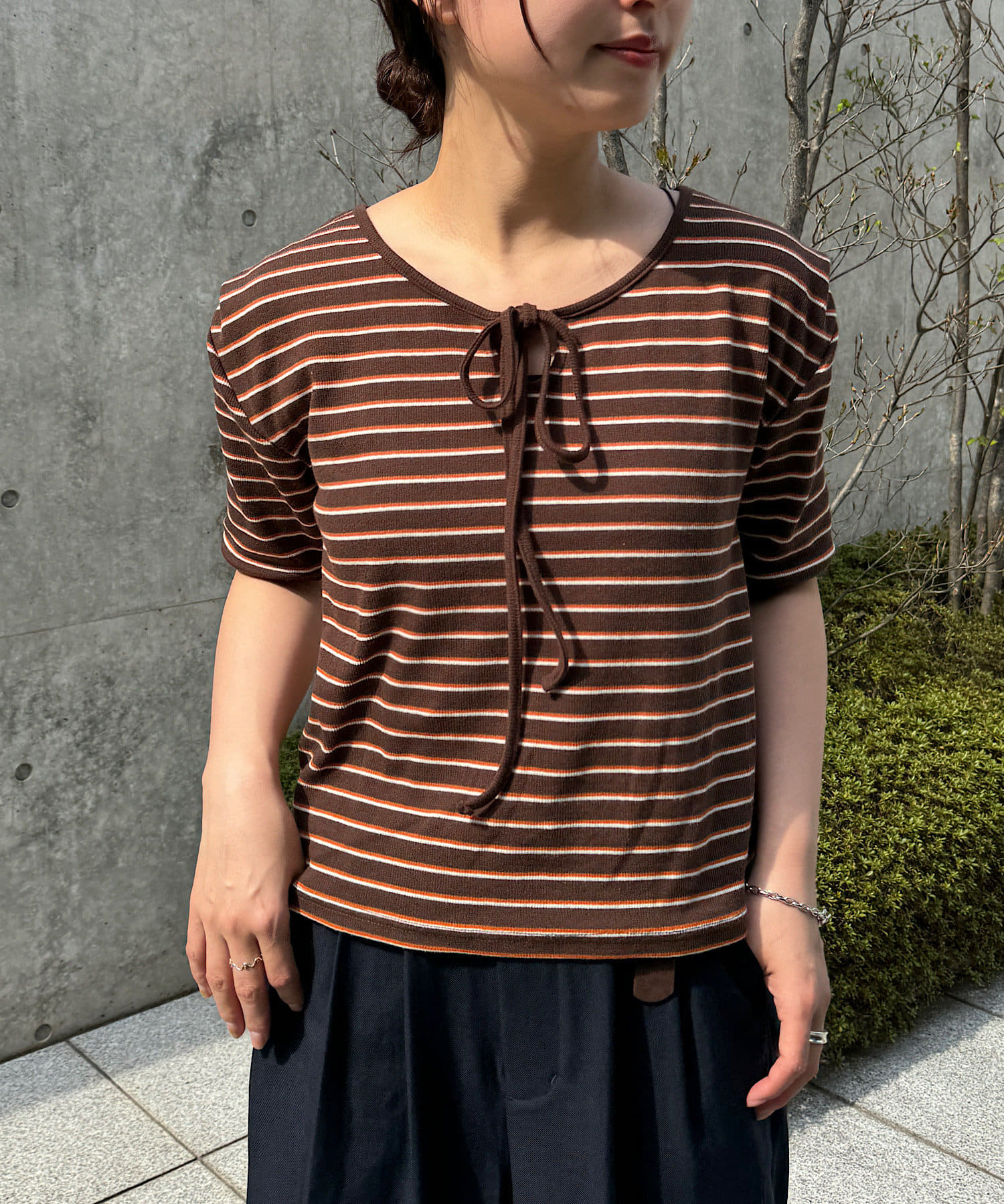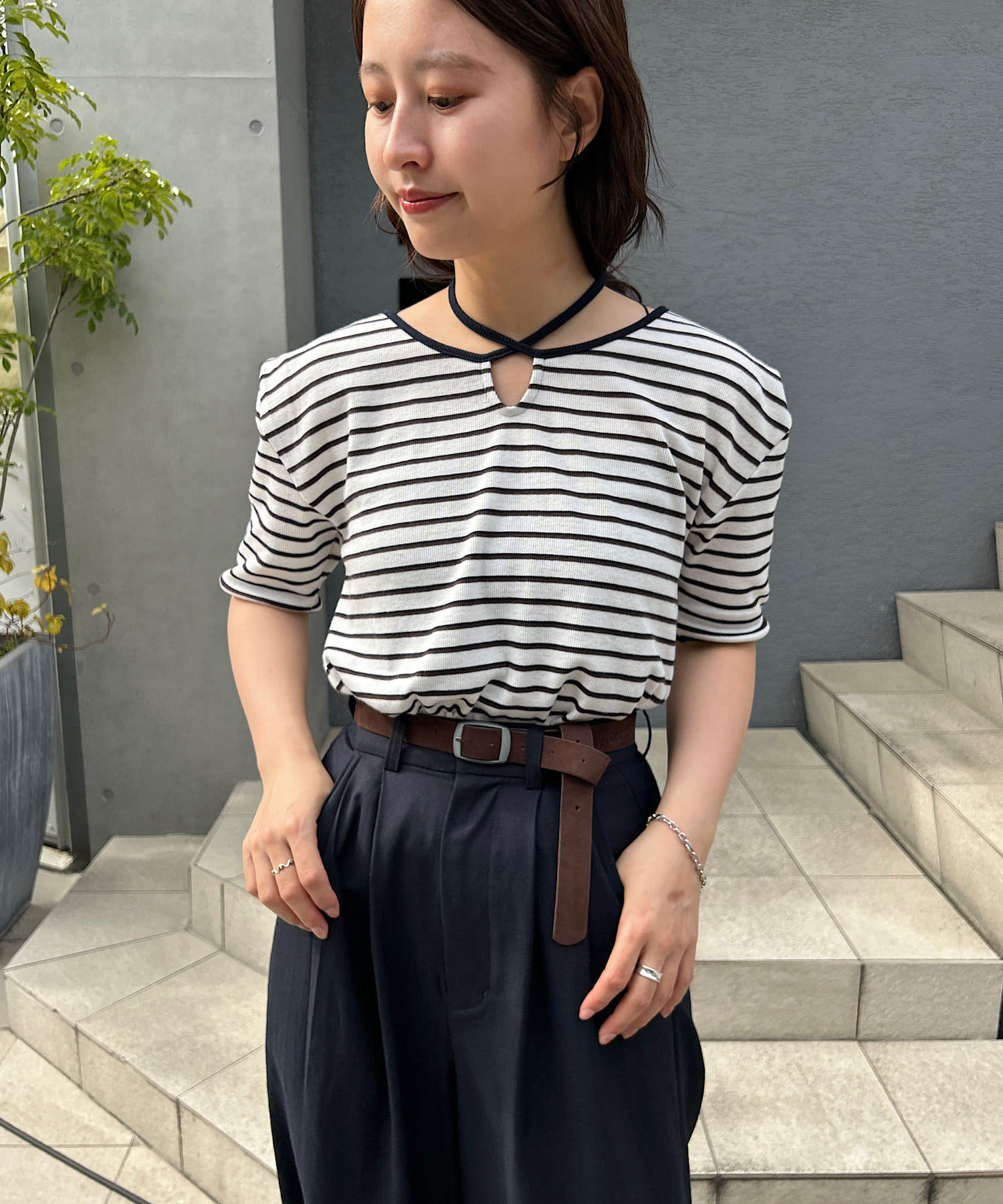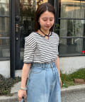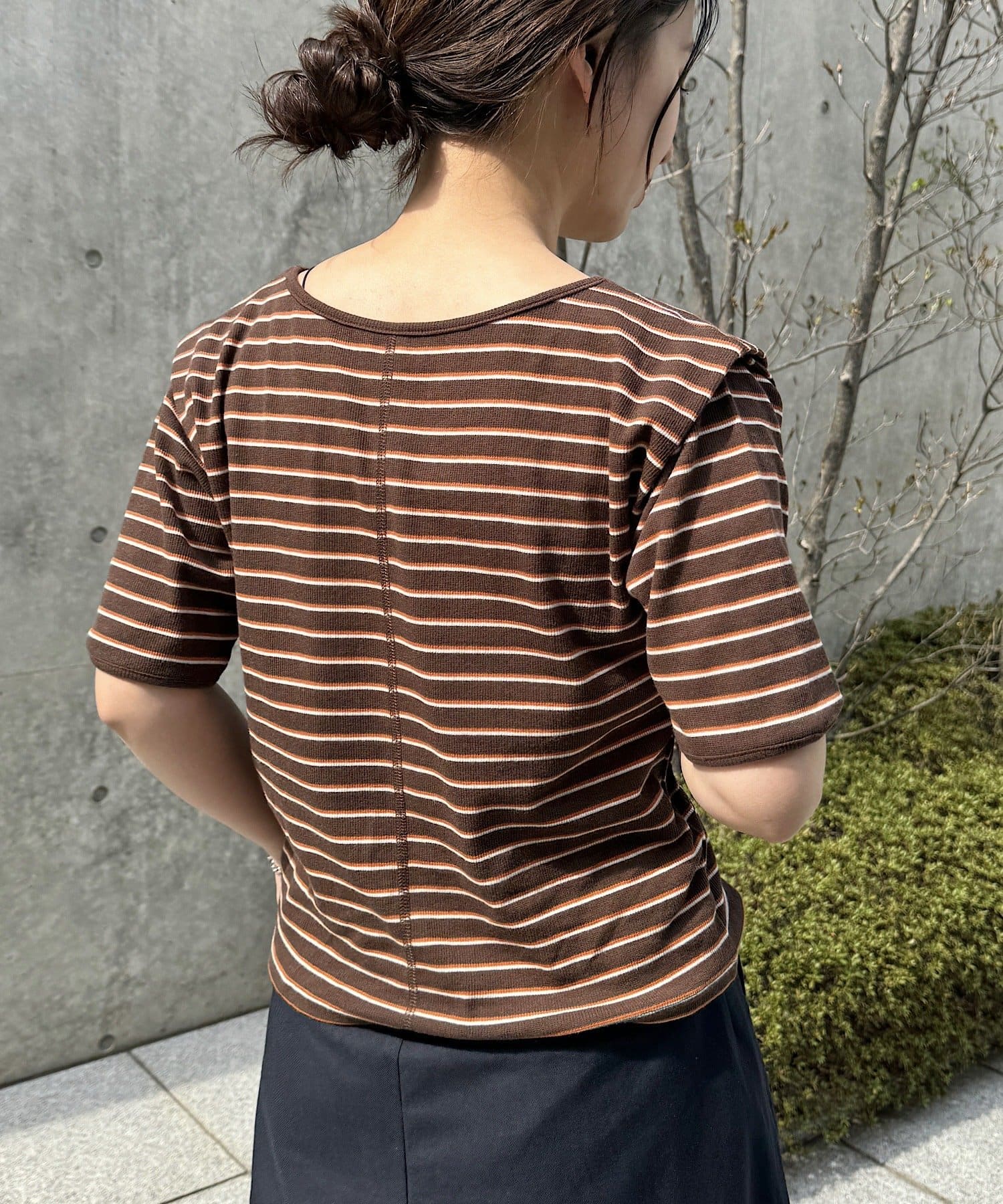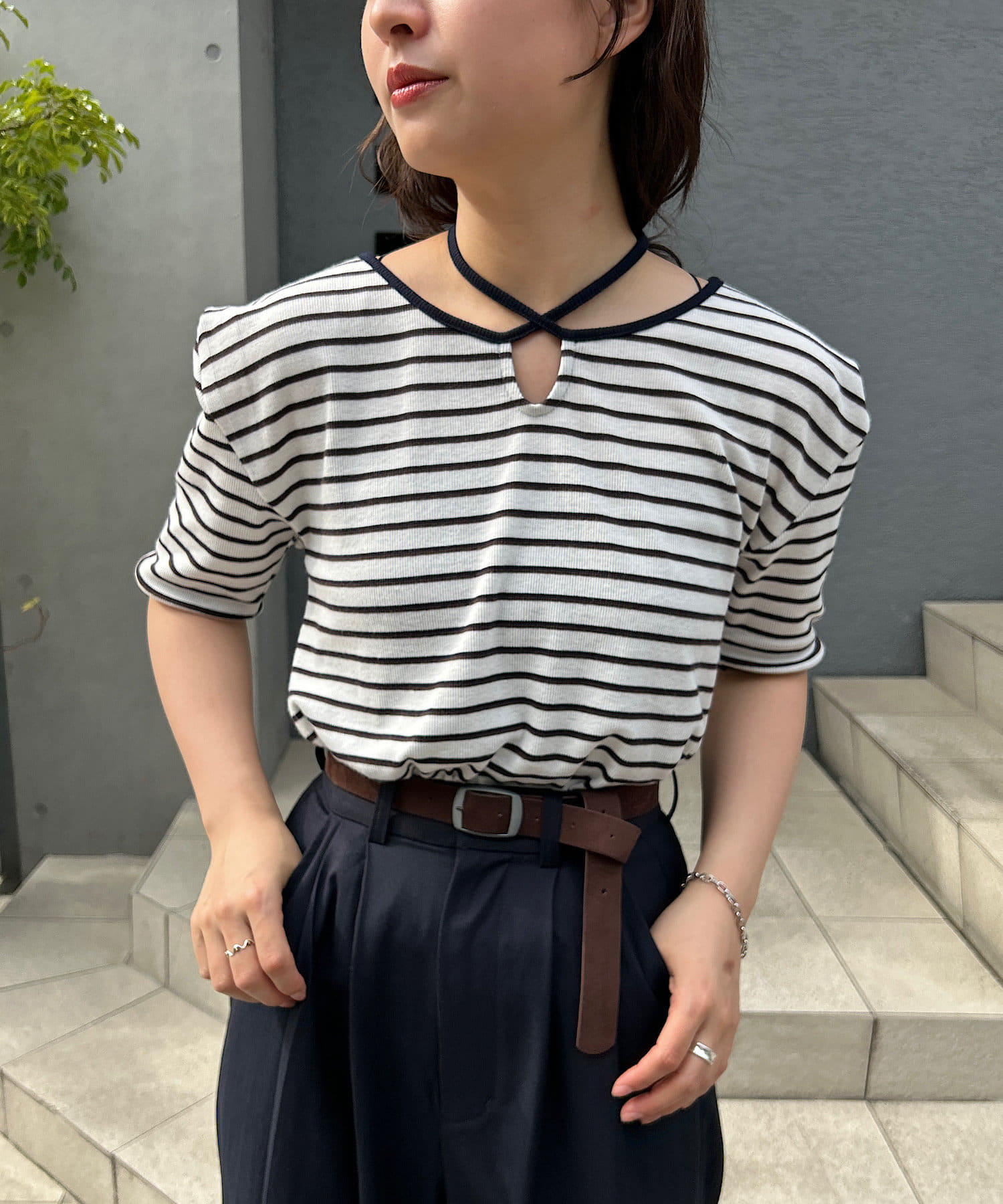 ベーシックに使えるボーダーにアレンジを加えたデザイントップスです。