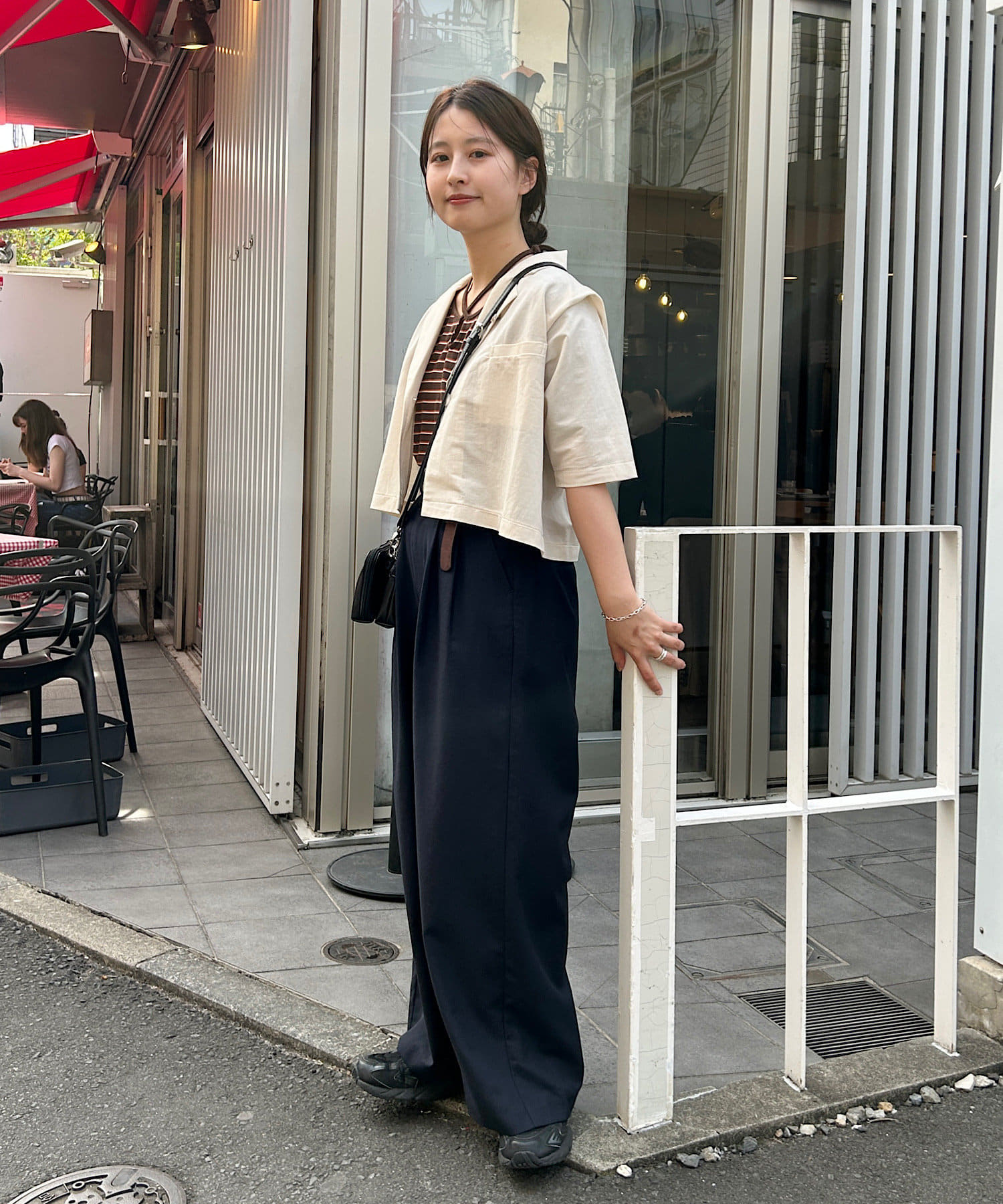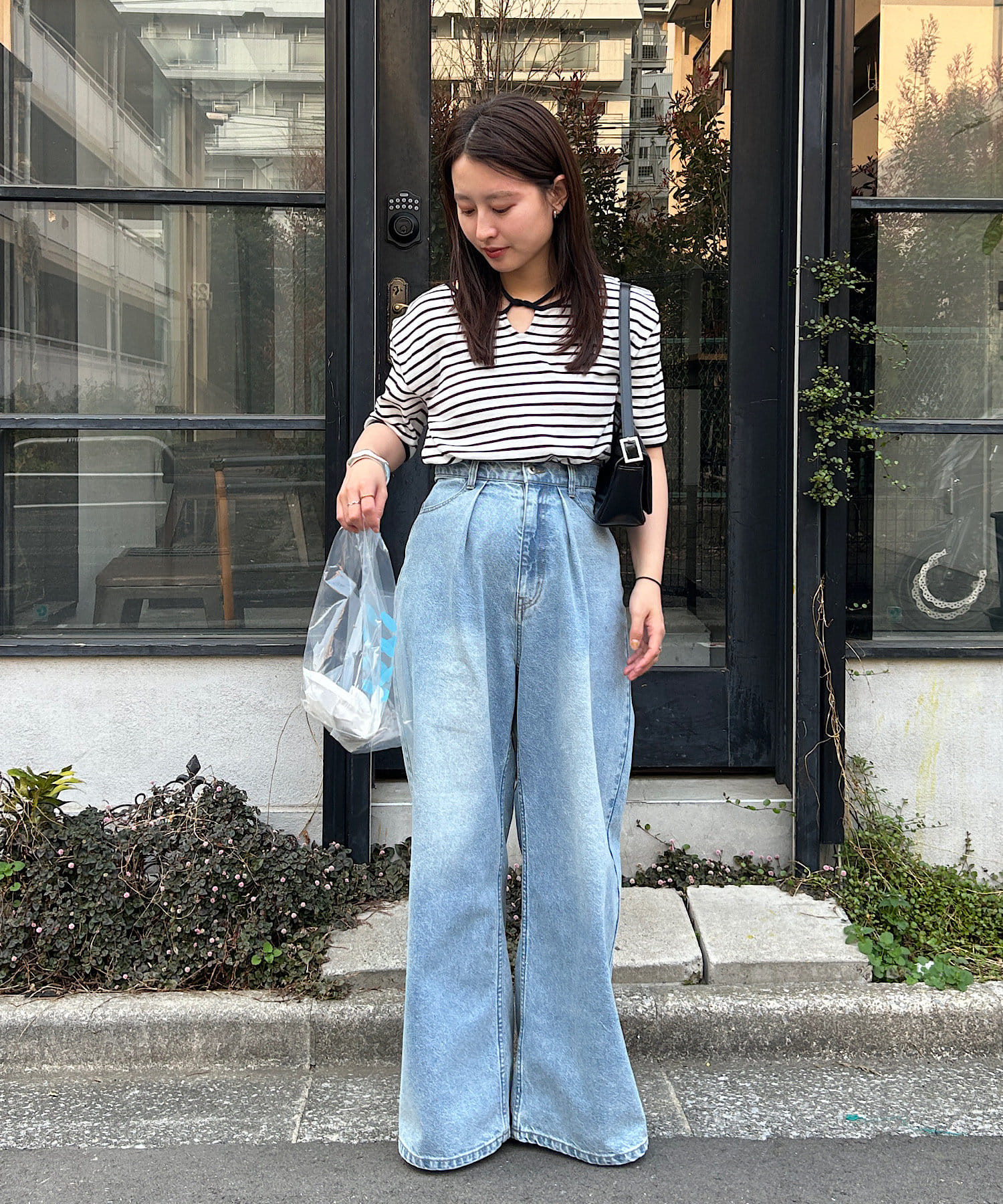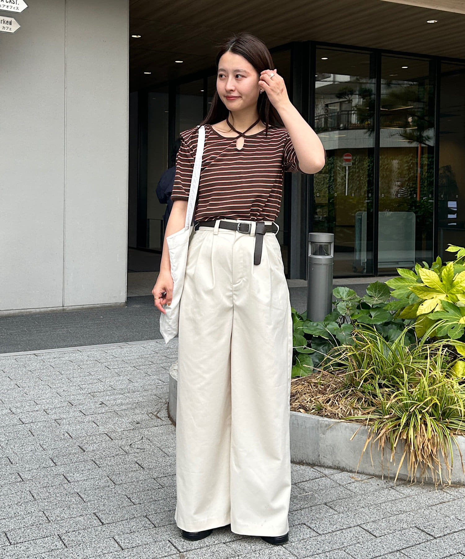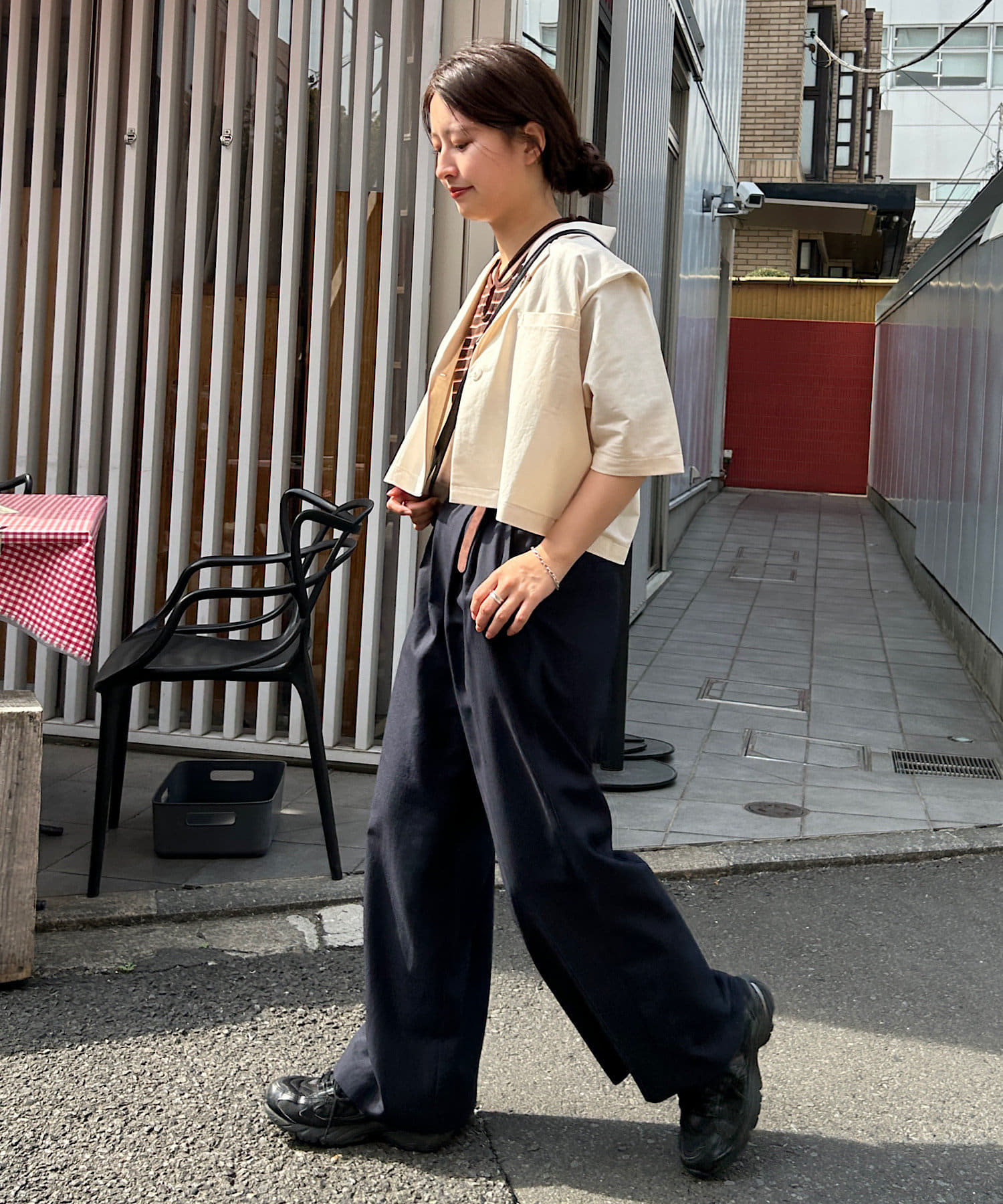 コンパクトトップスにはボトムでボリュームを入れるバランスがオススメです。