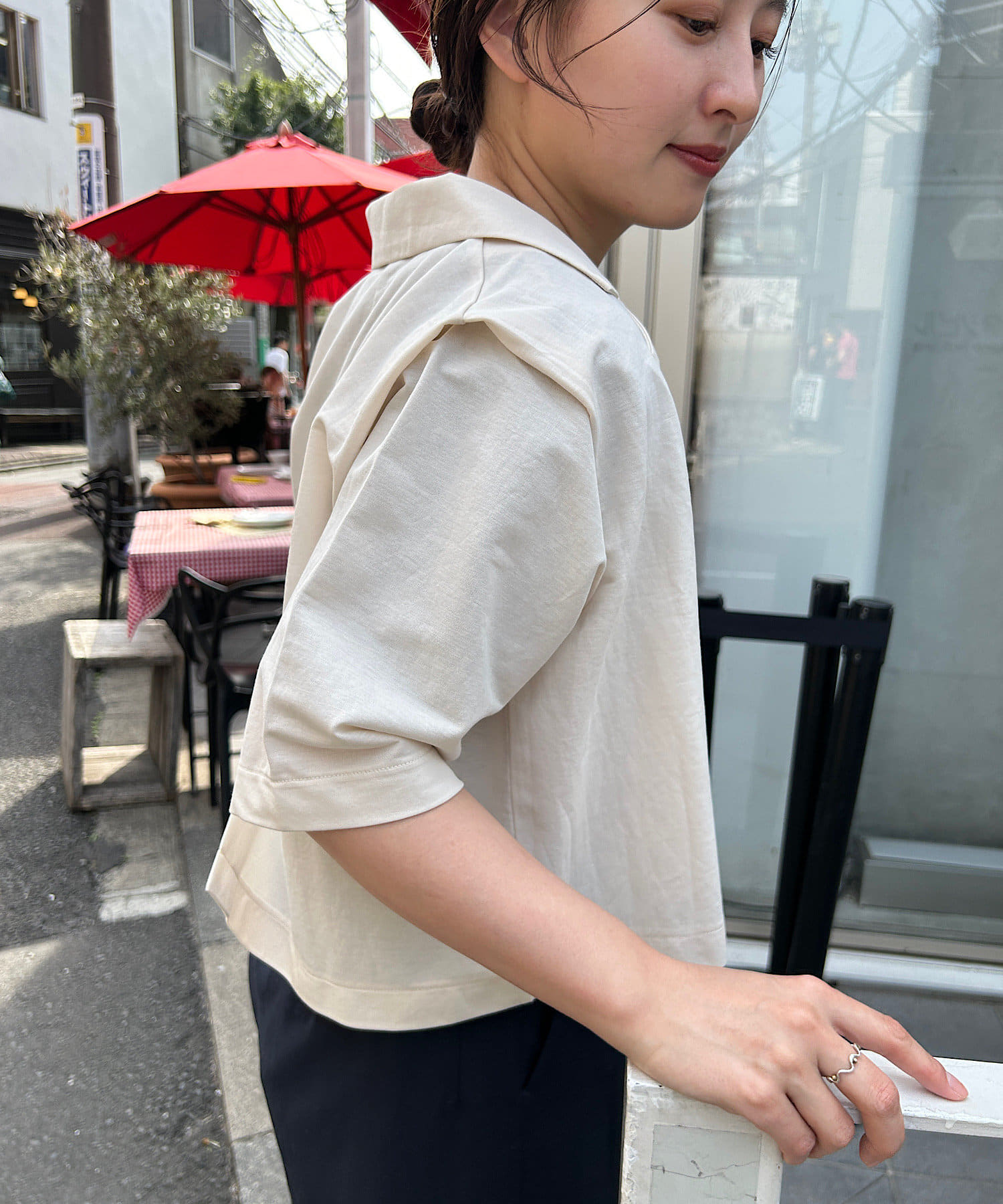 肩のタック部分を加えたことによりアクセントに◎