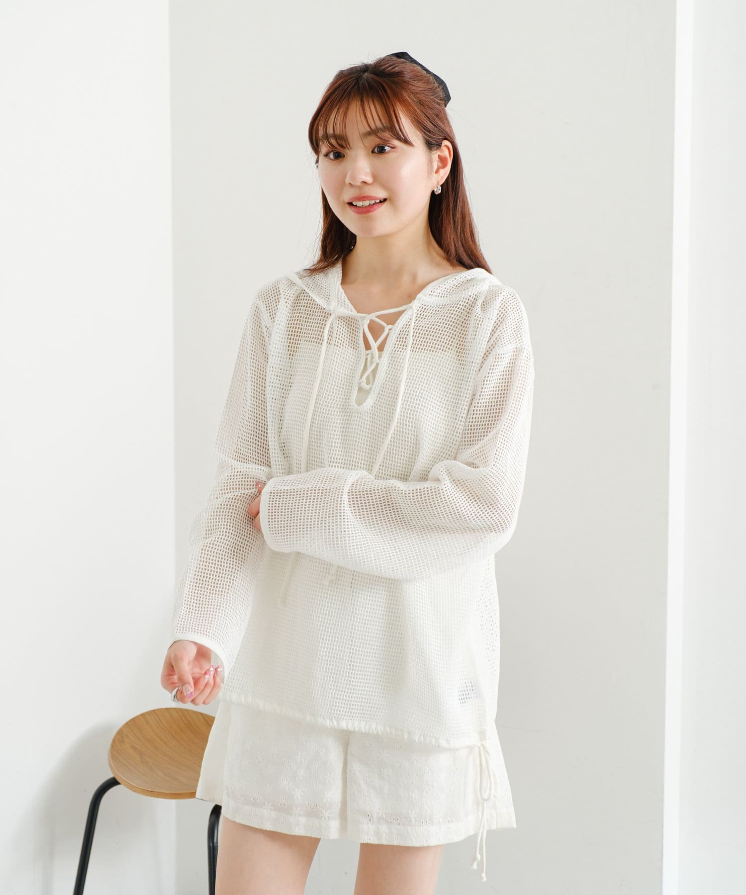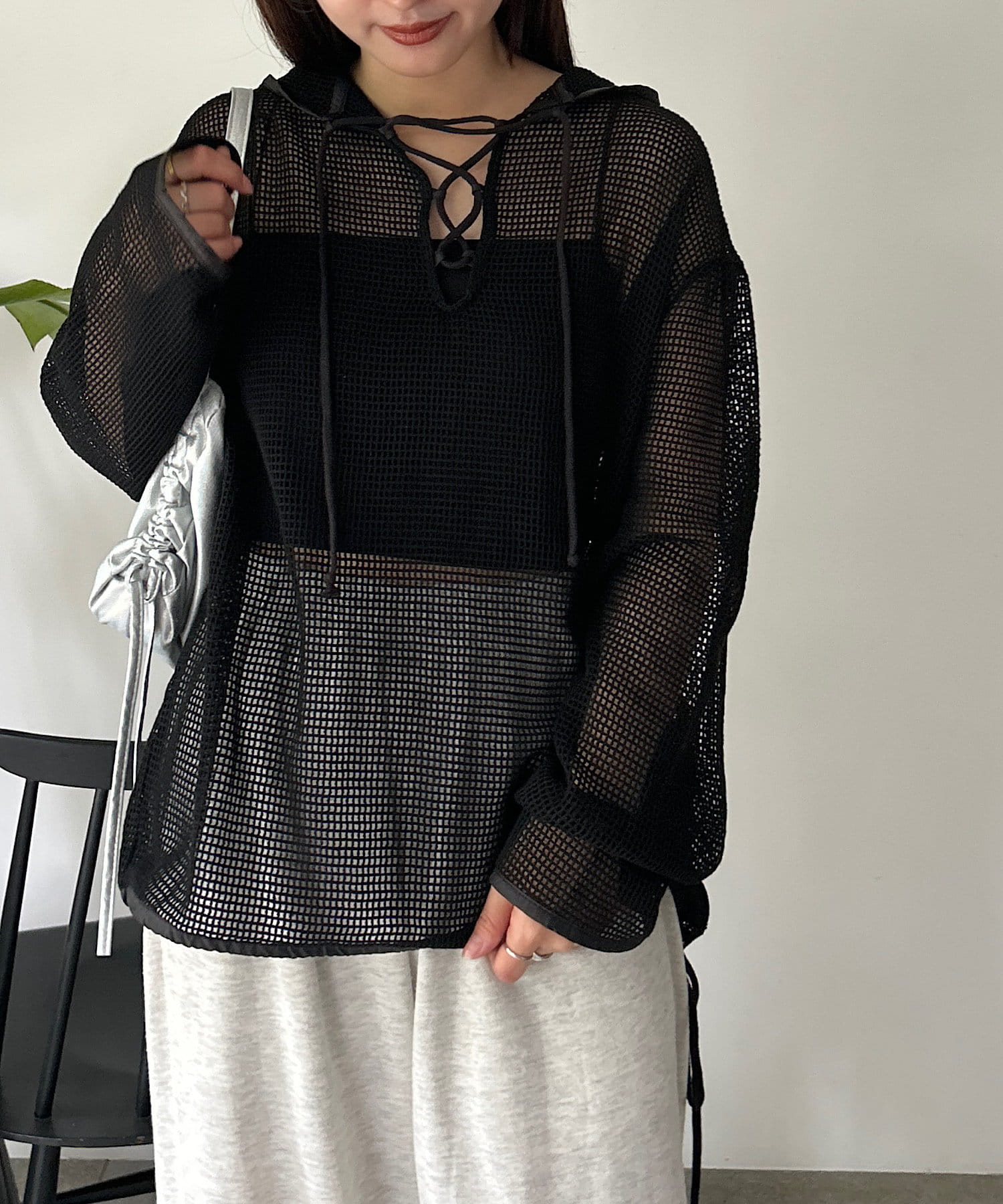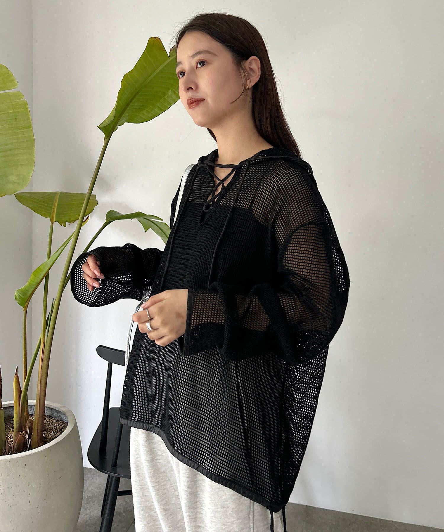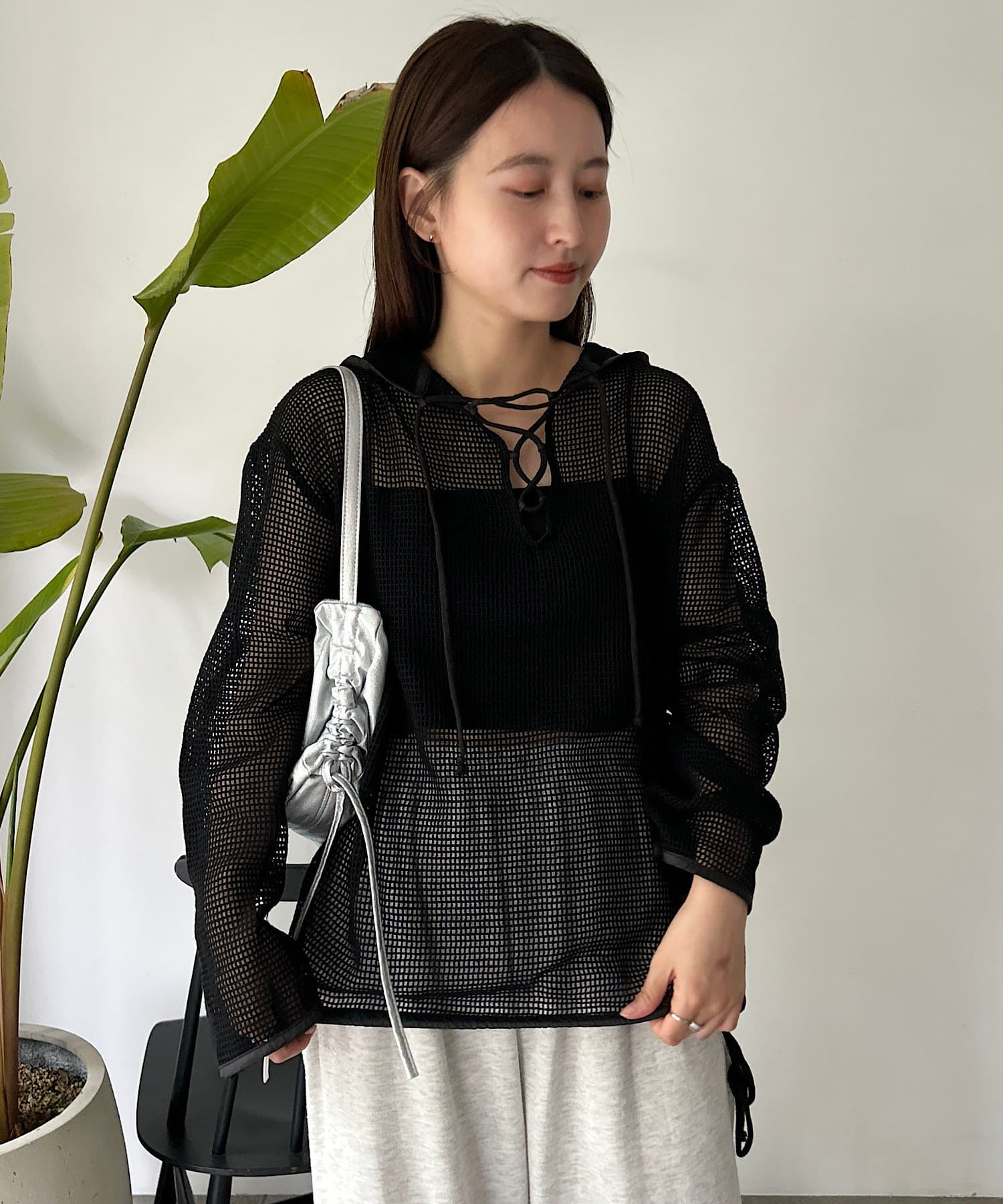 首元の紐を結んだり、垂らしたりして雰囲気を変えられるのも嬉しいポイント。
