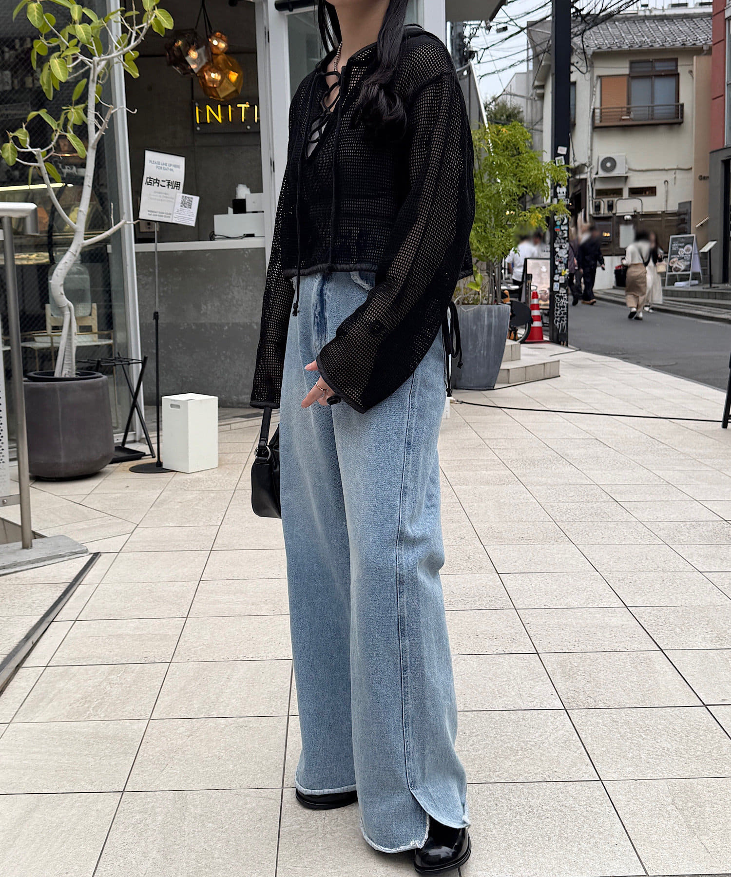 ●着用の際は、ベルト・バックル・アクセサリー・爪等の突起物により引っかかりが生じますのでご注意ください。