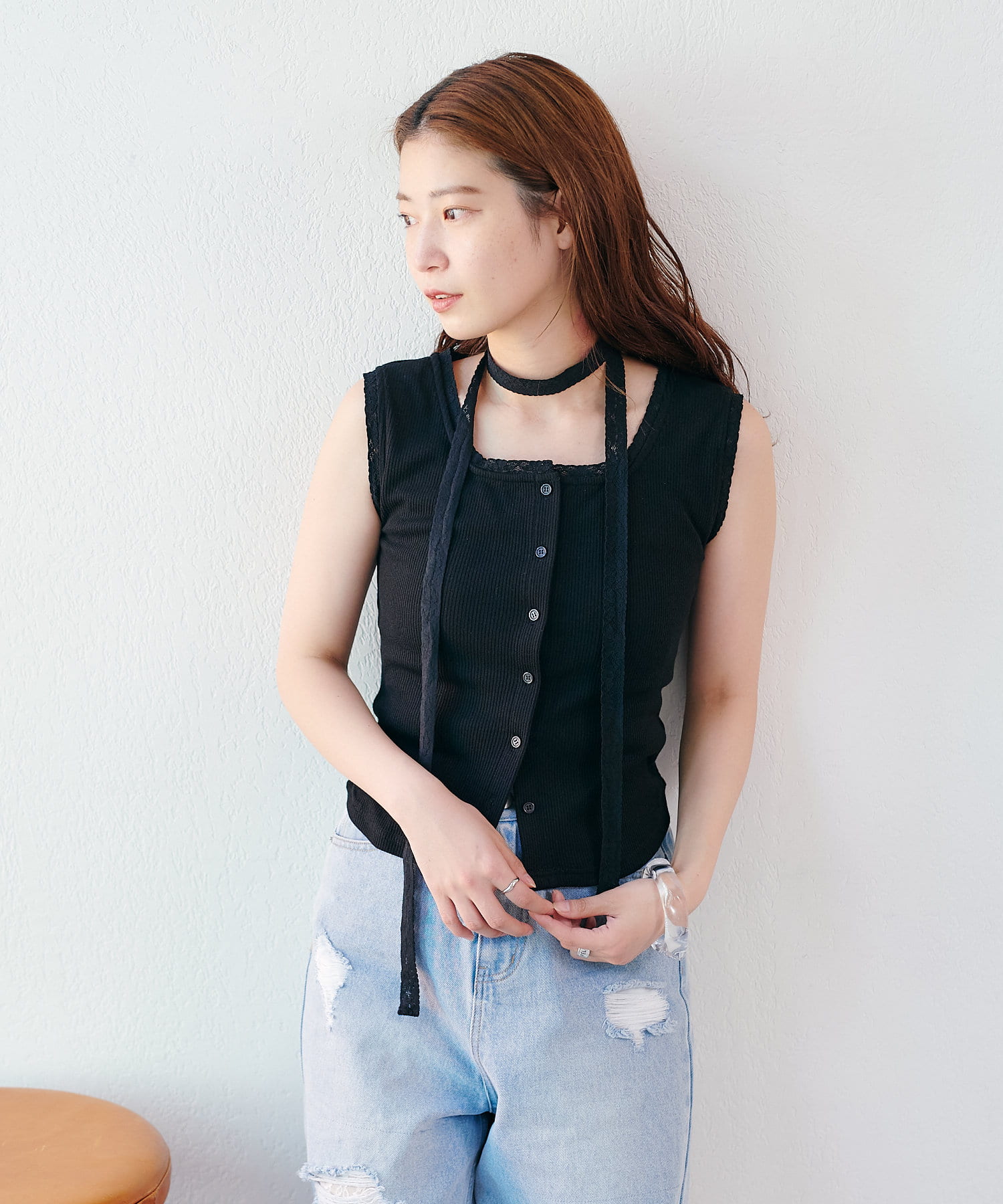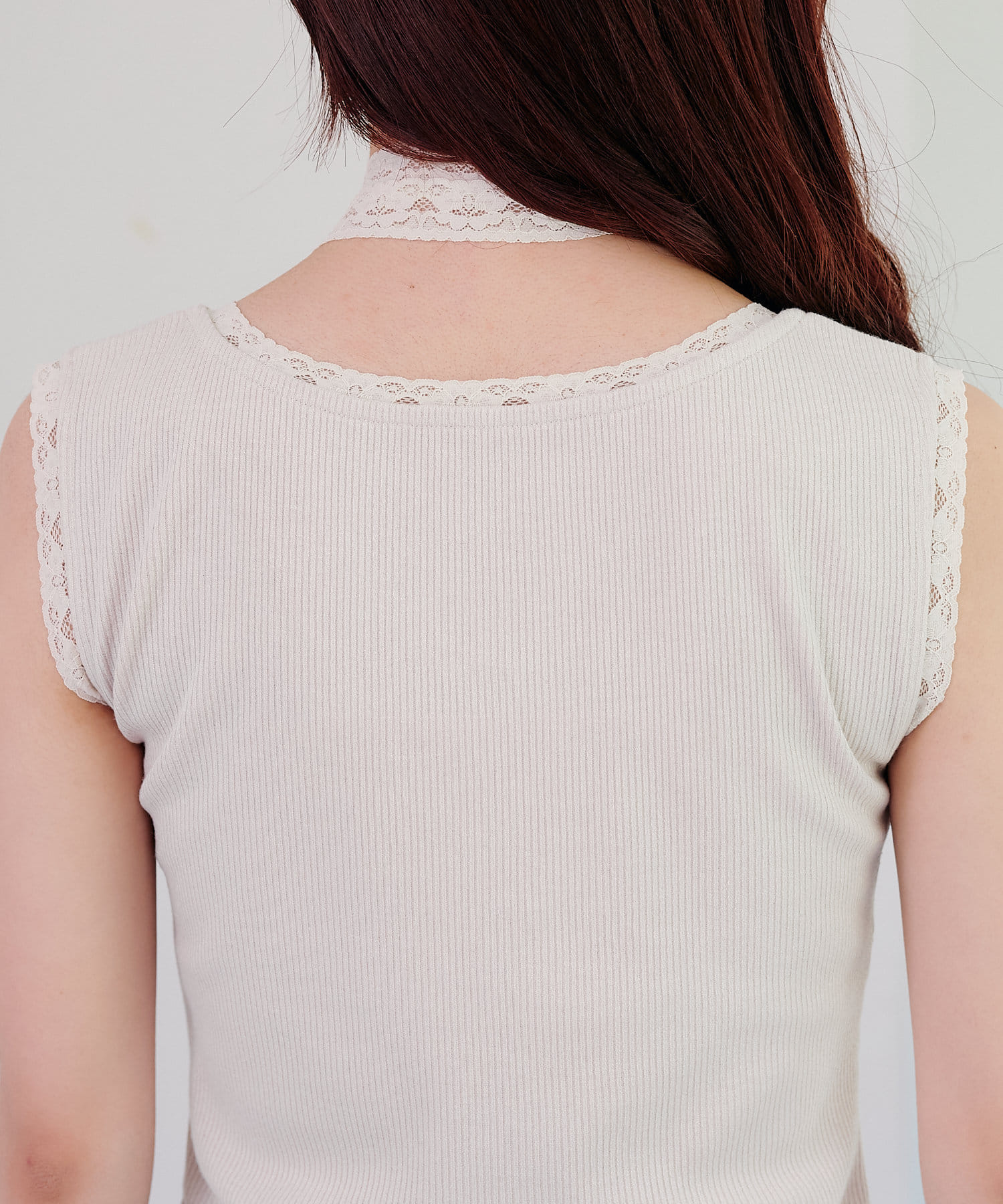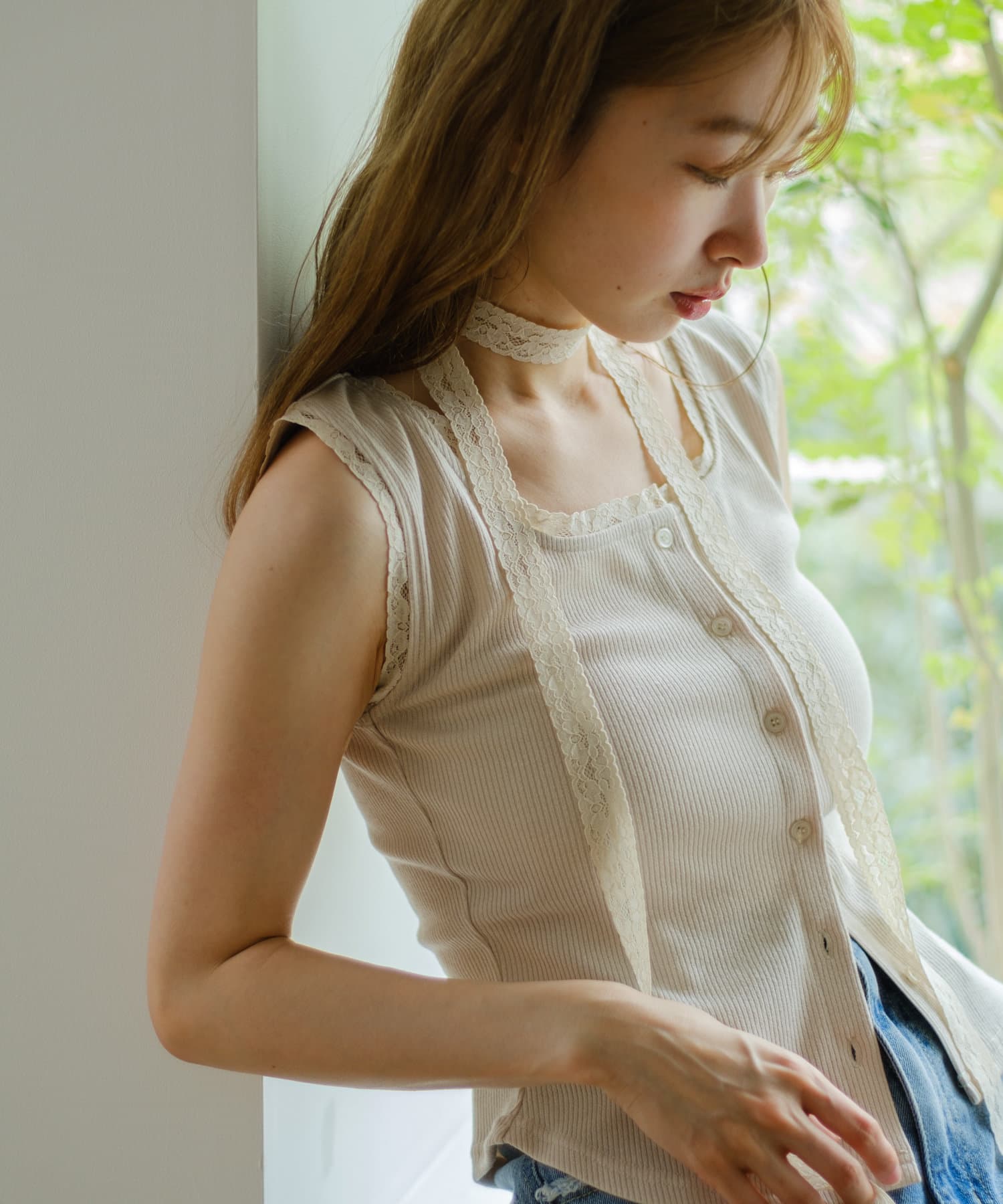 上品なレースをあしらった、女性らしさ漂うリブタンク。