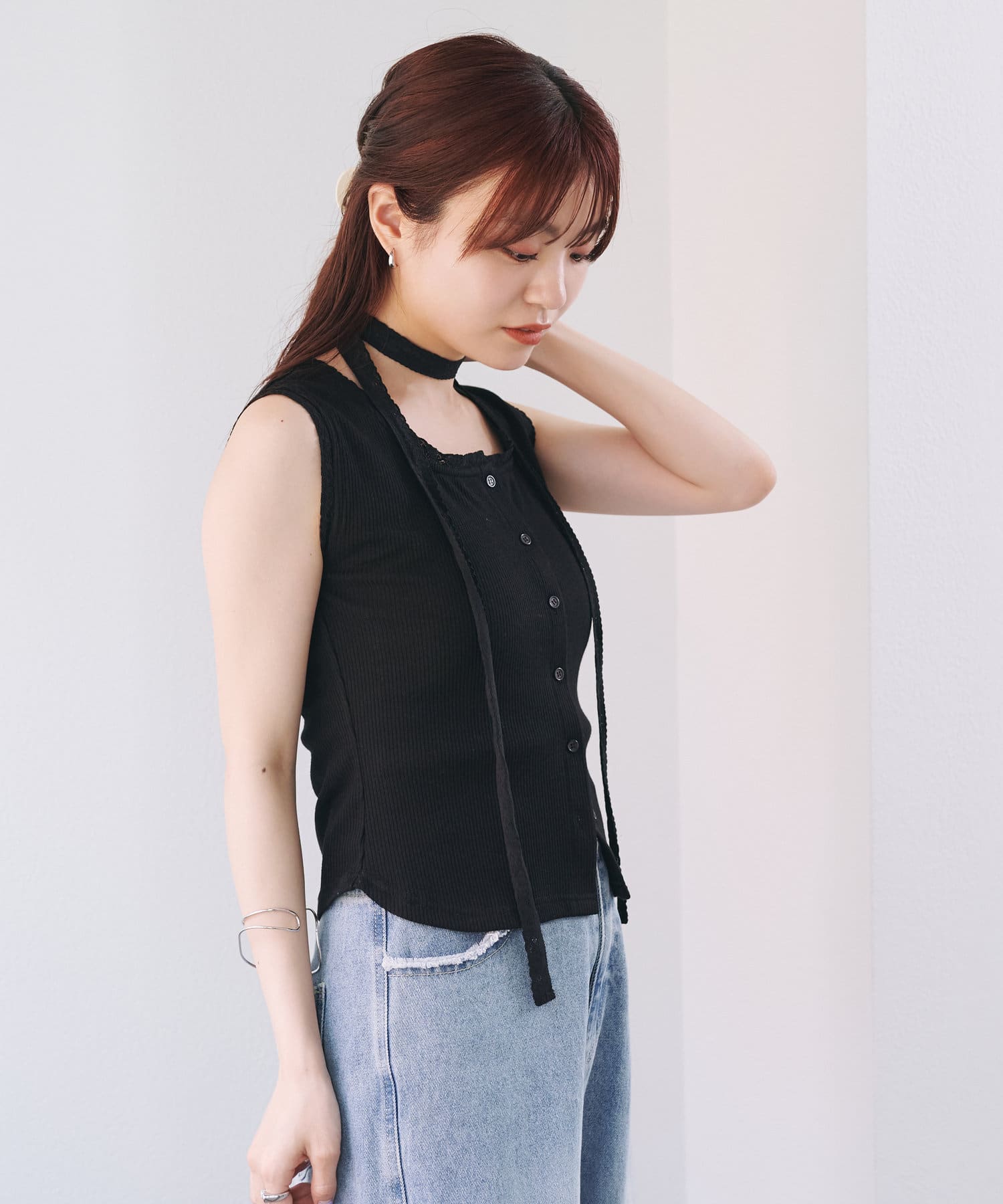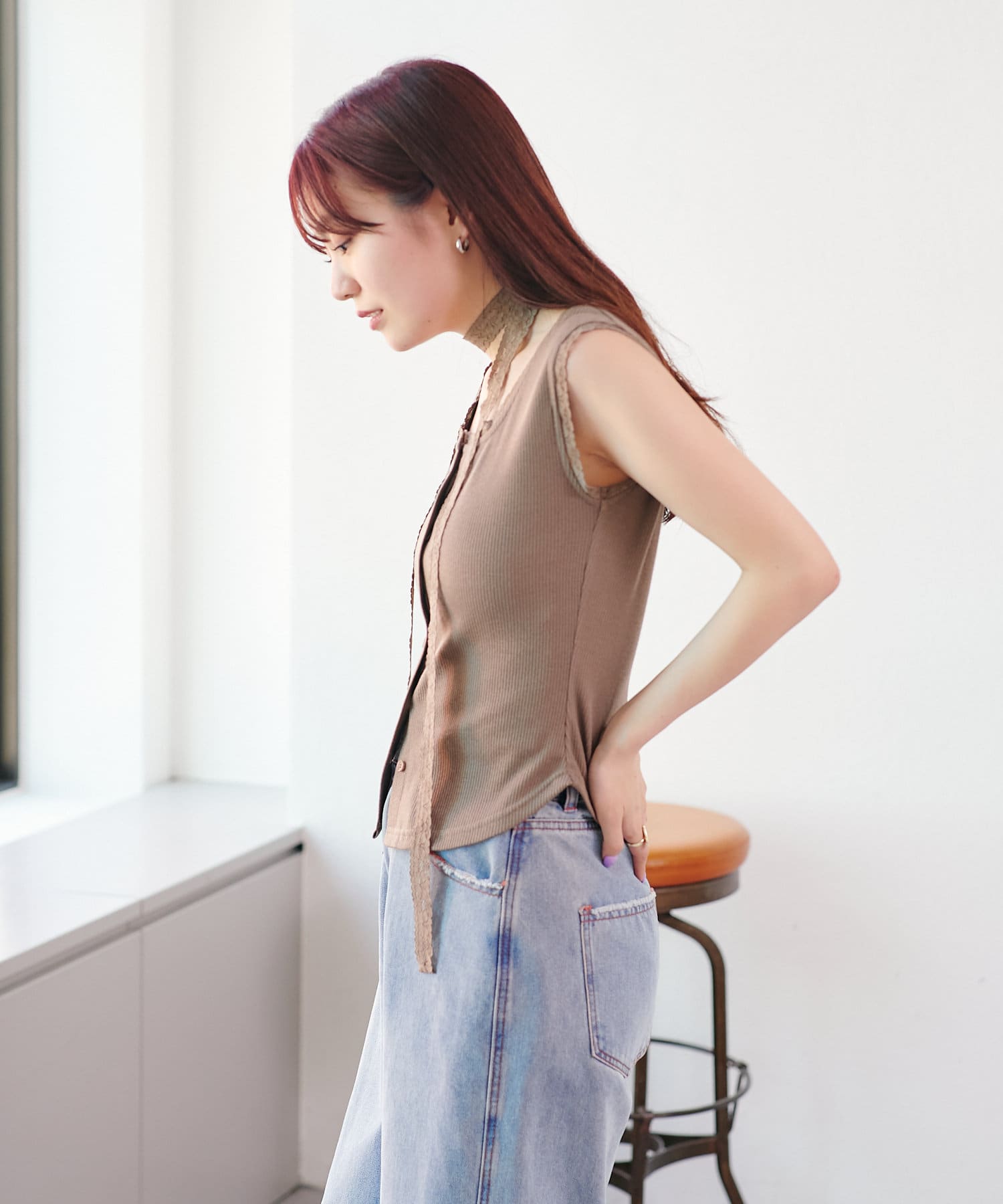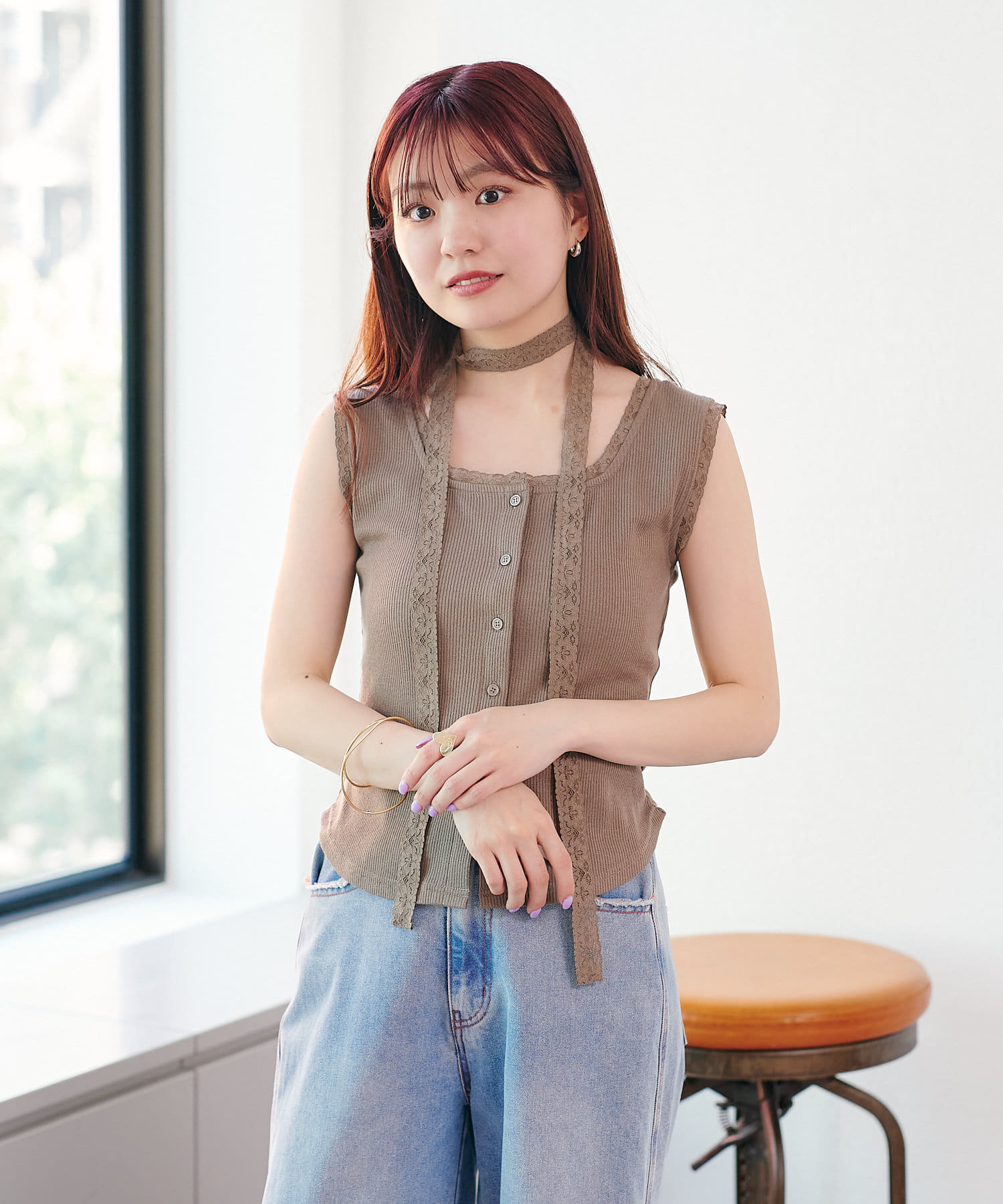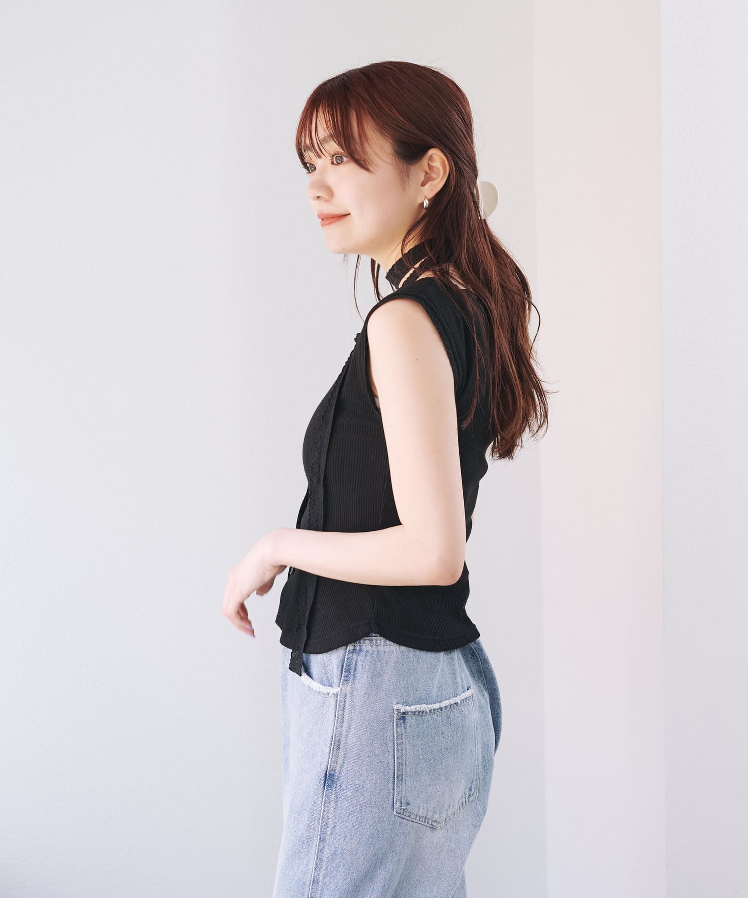 上品なレースをあしらった、女性らしさ漂うリブタンク。