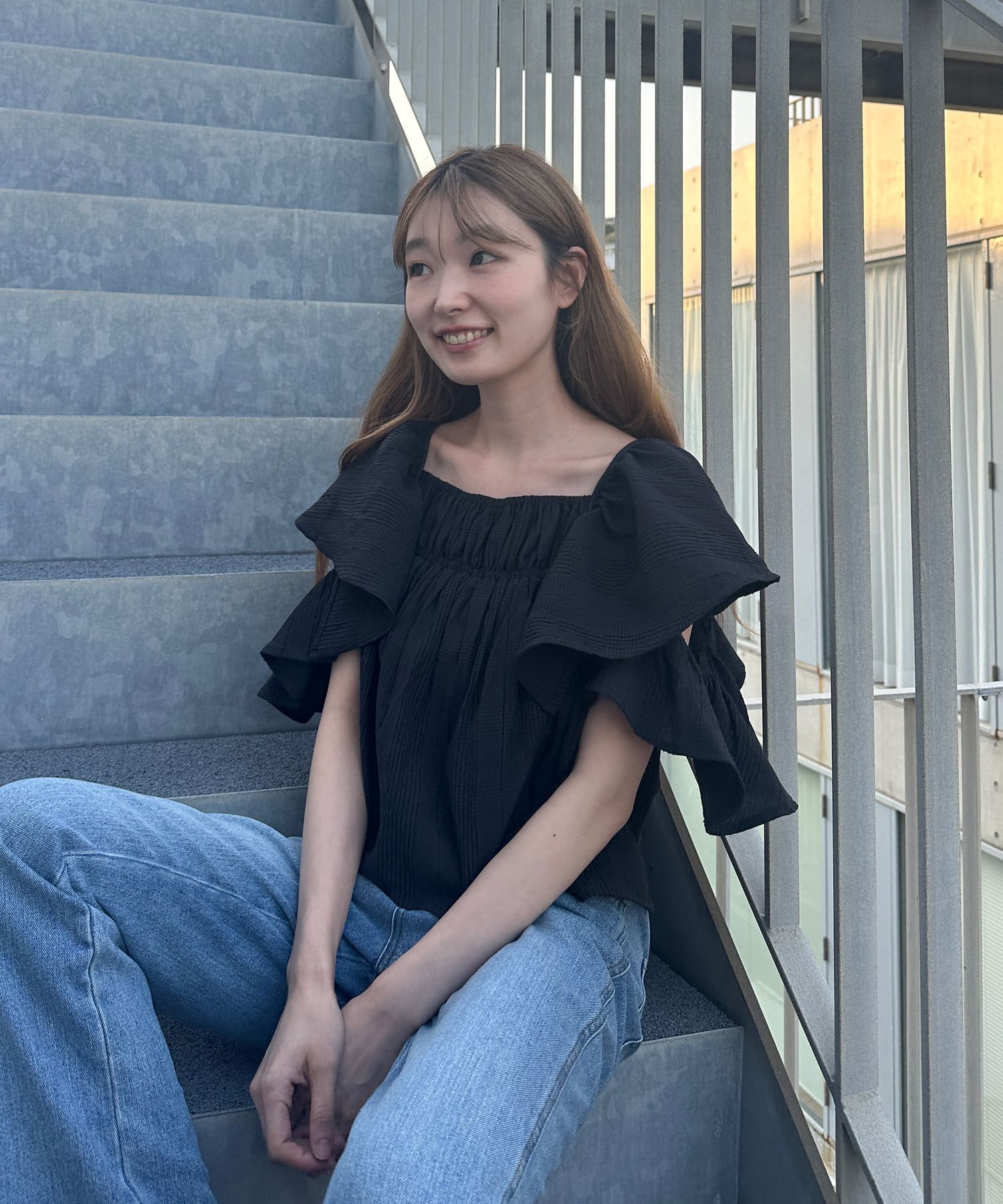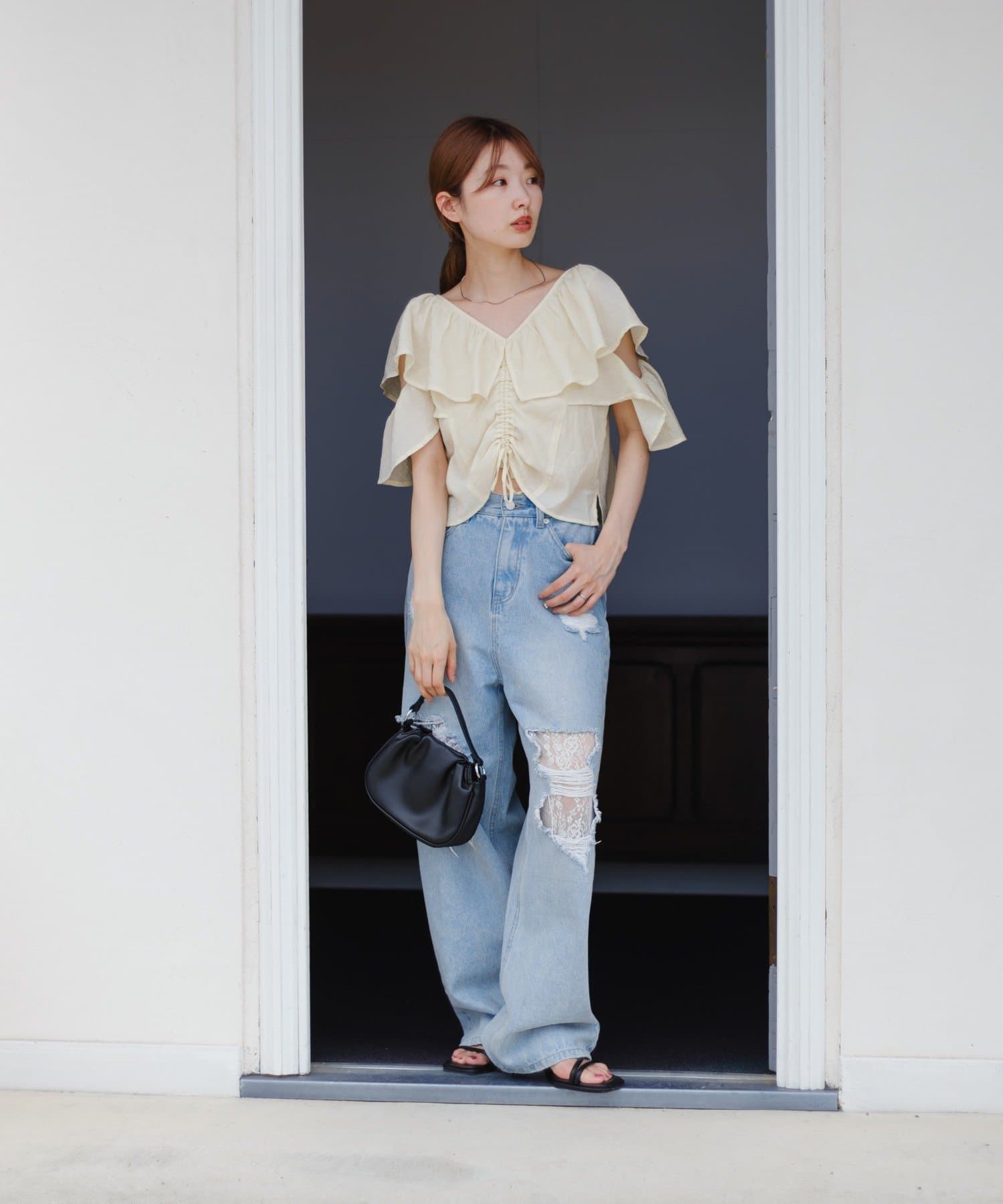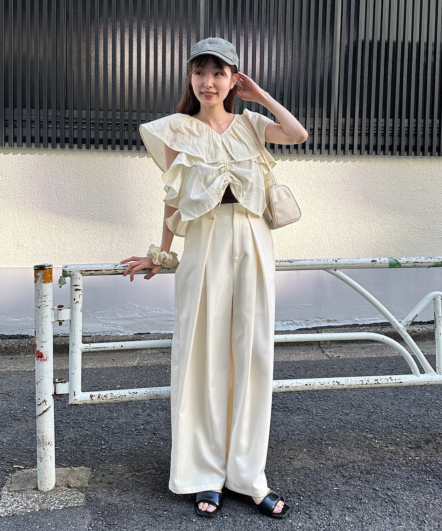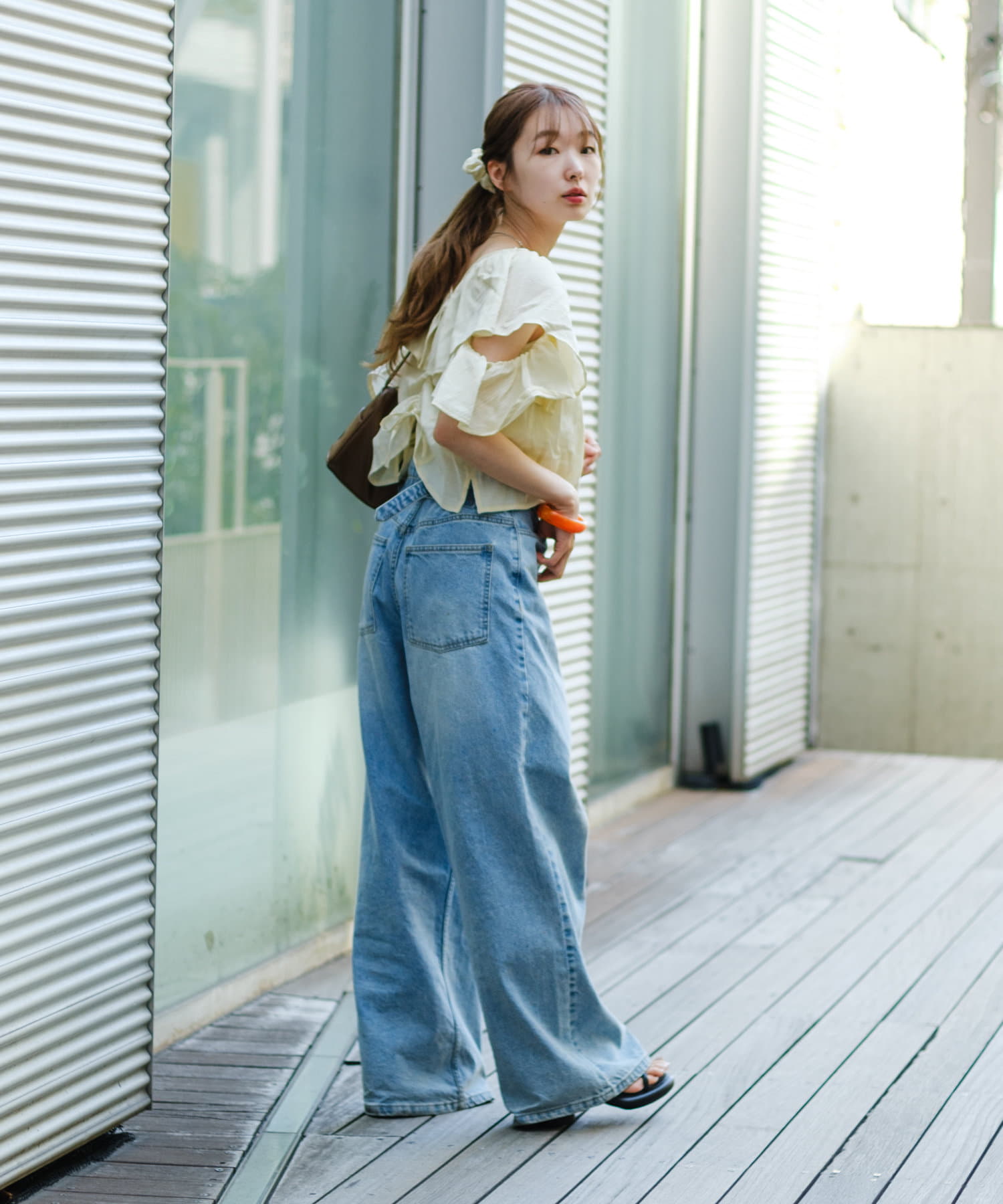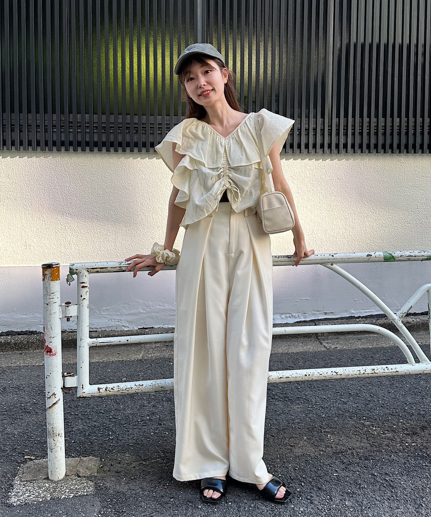 肩周りにフリルがあるので、サロペットなどを合わせるのもおすすめです。
