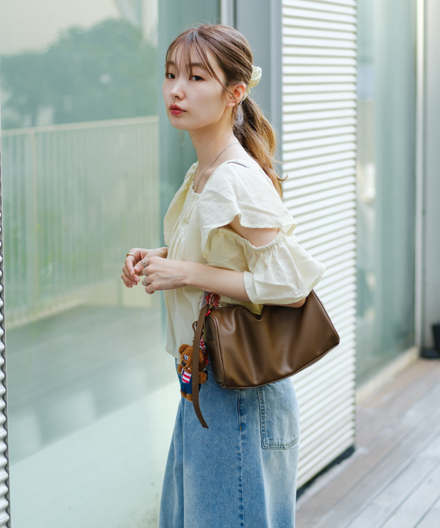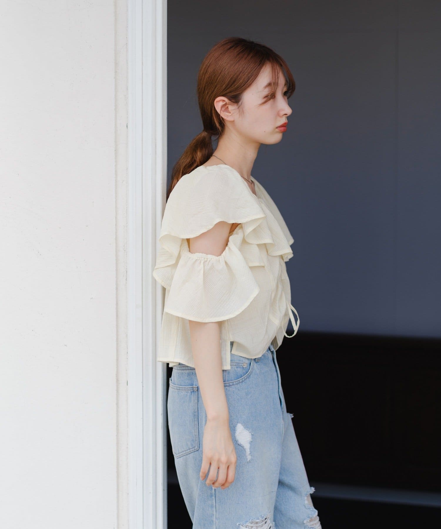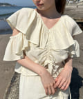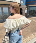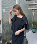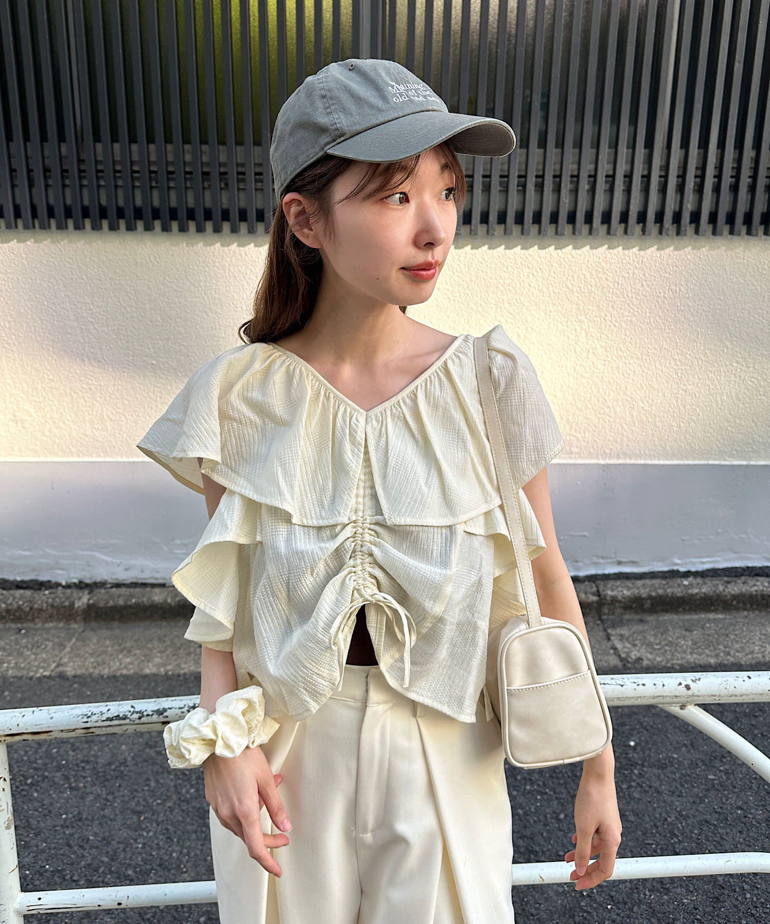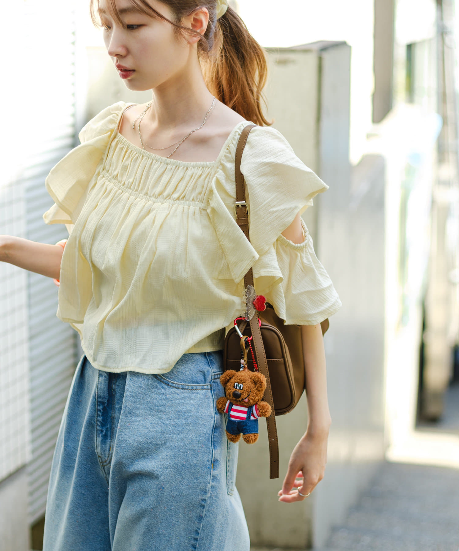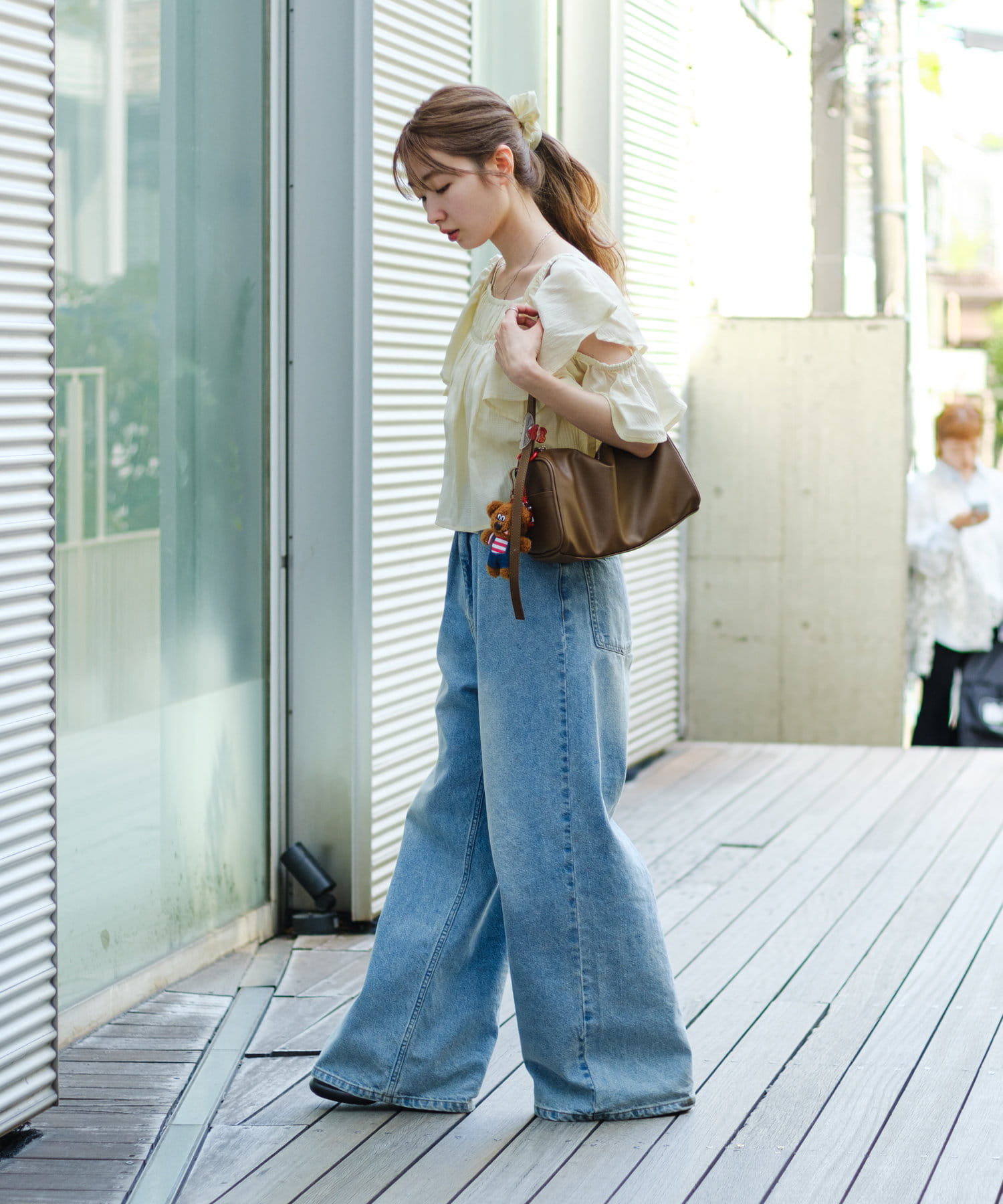 肩周りにフリルがあるので、サロペットなどを合わせるのもおすすめです。