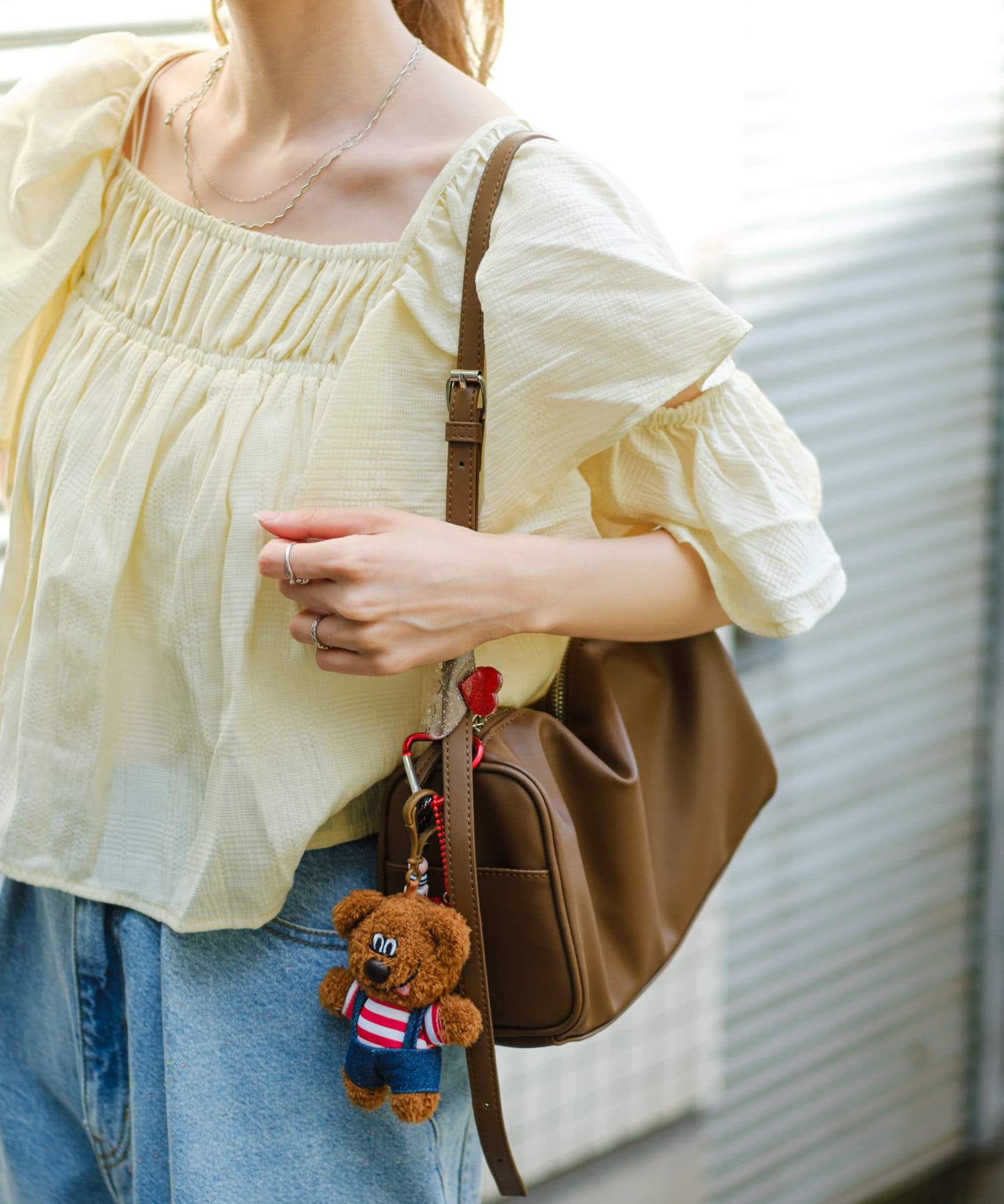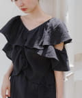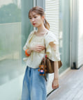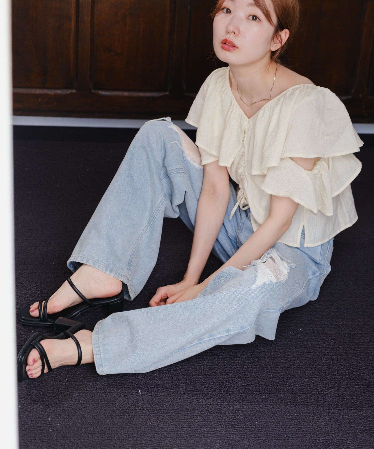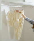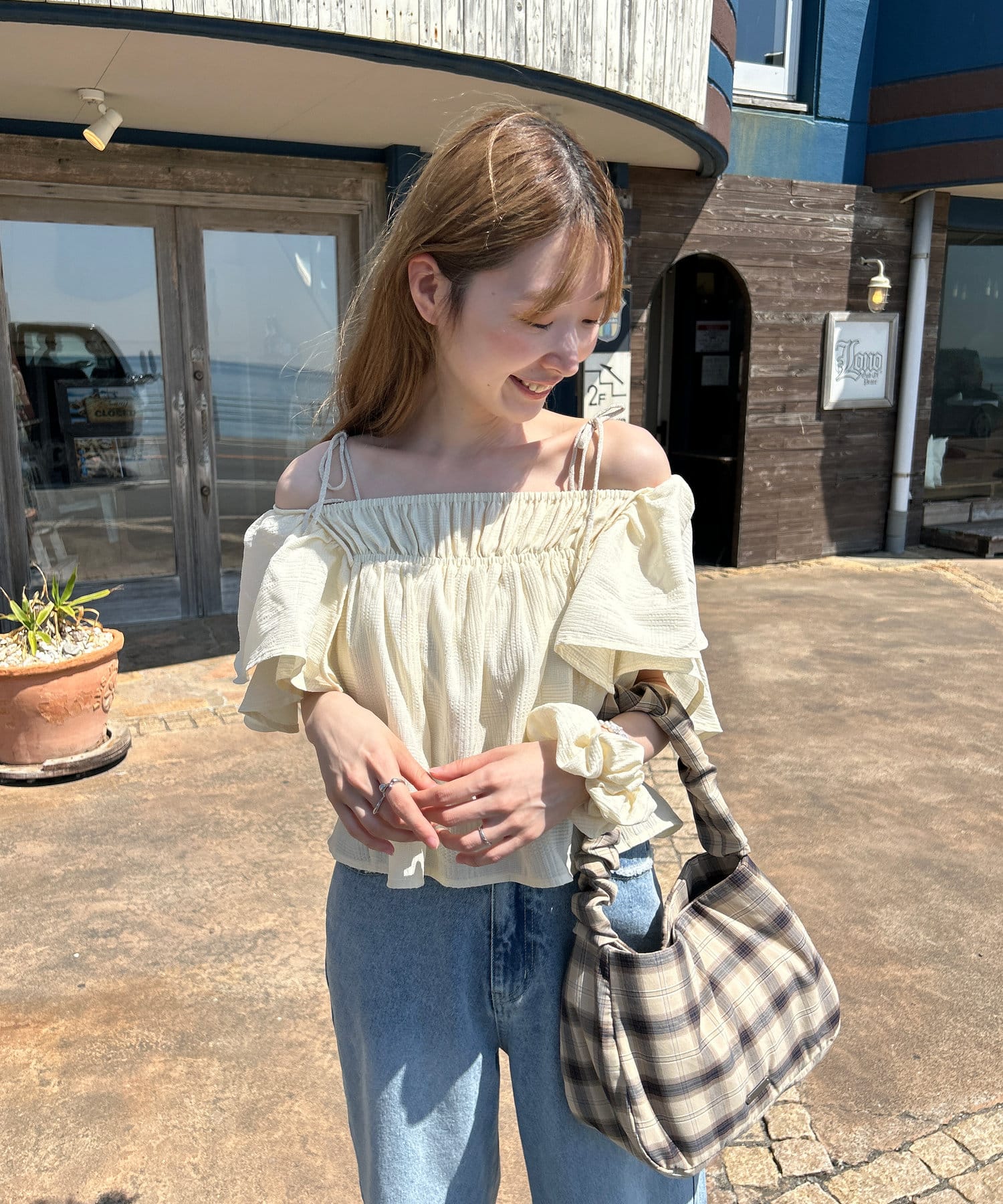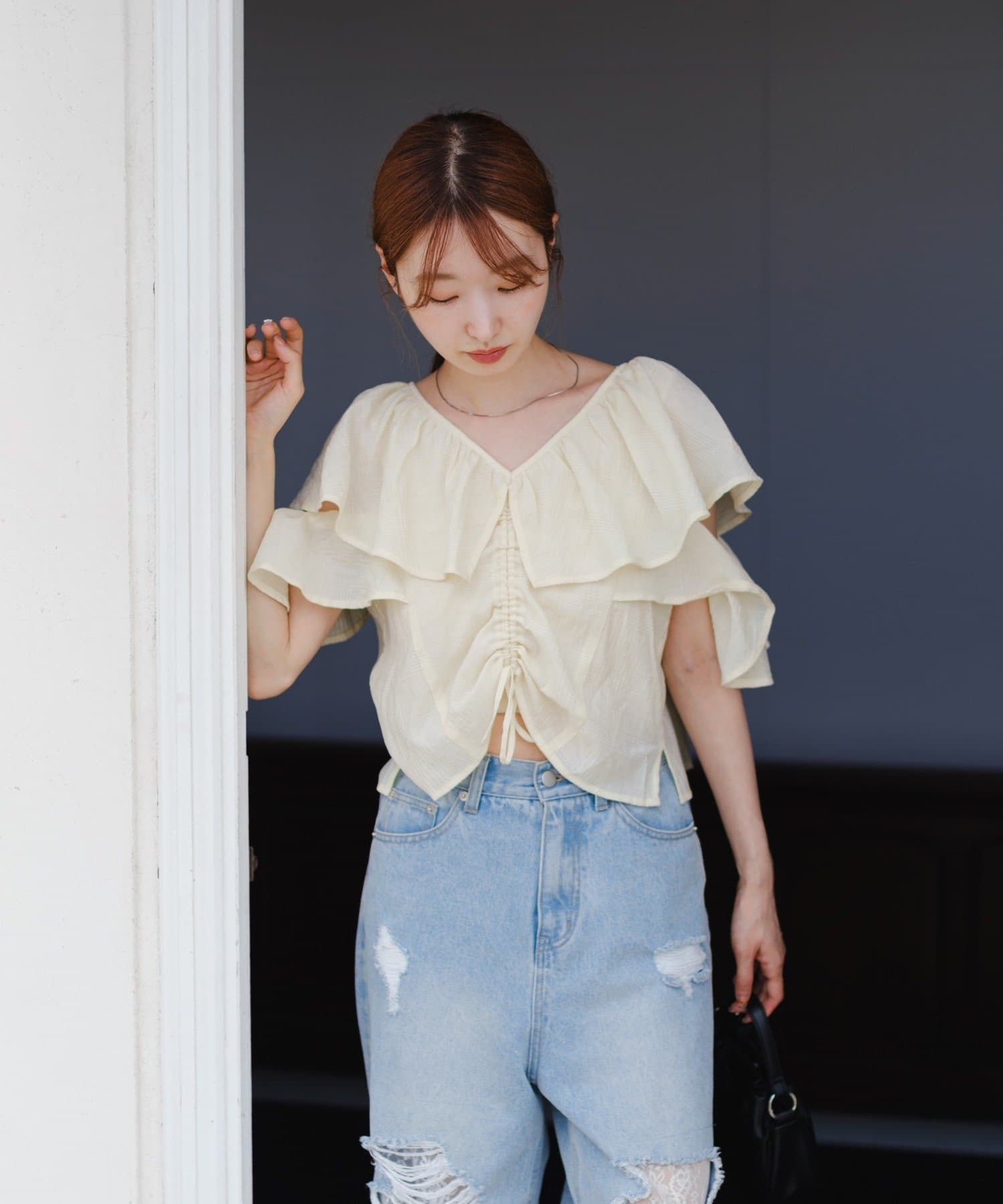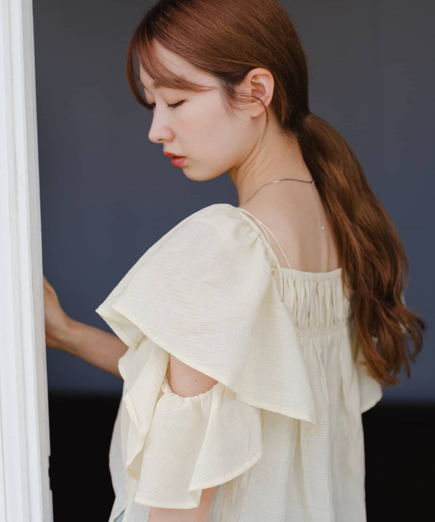 肩周りにフリルがあるので、サロペットなどを合わせるのもおすすめです。