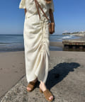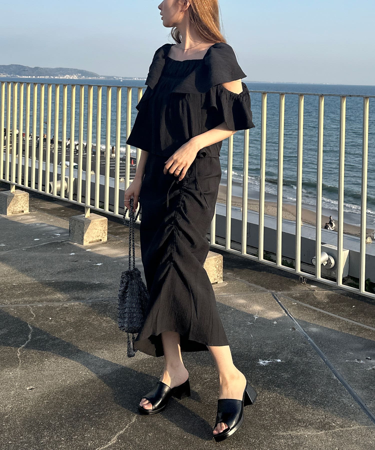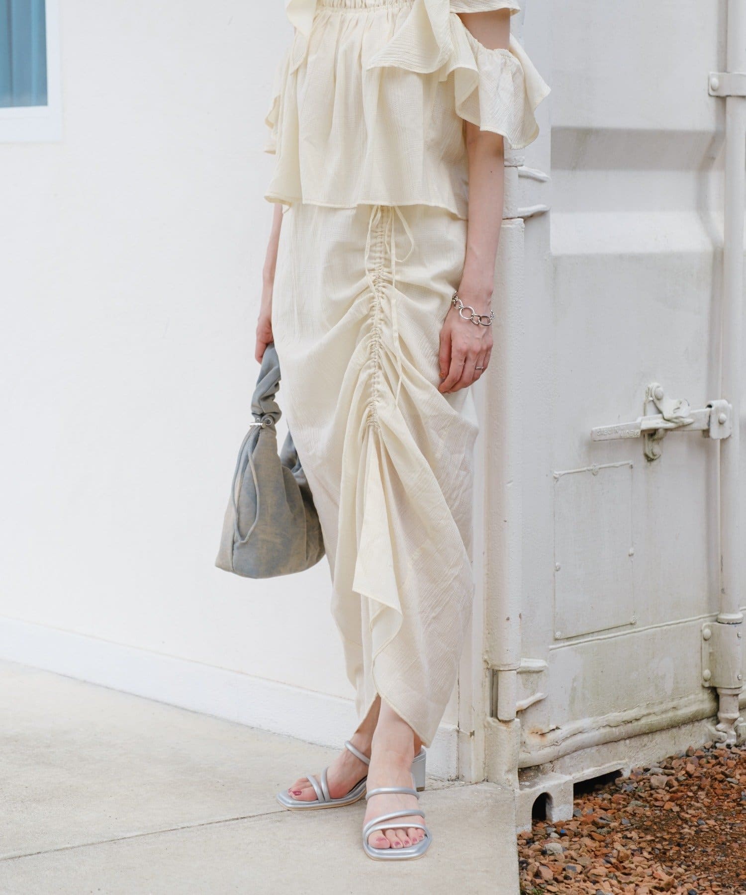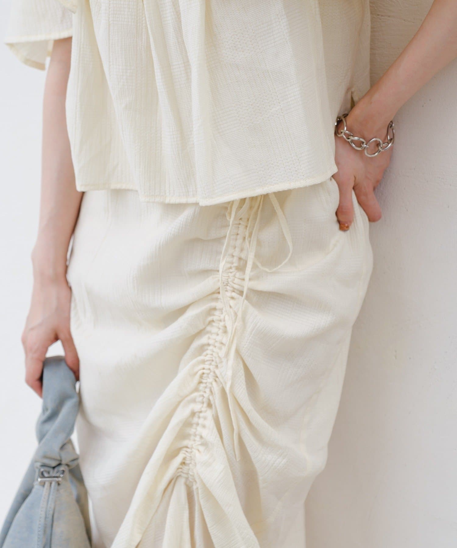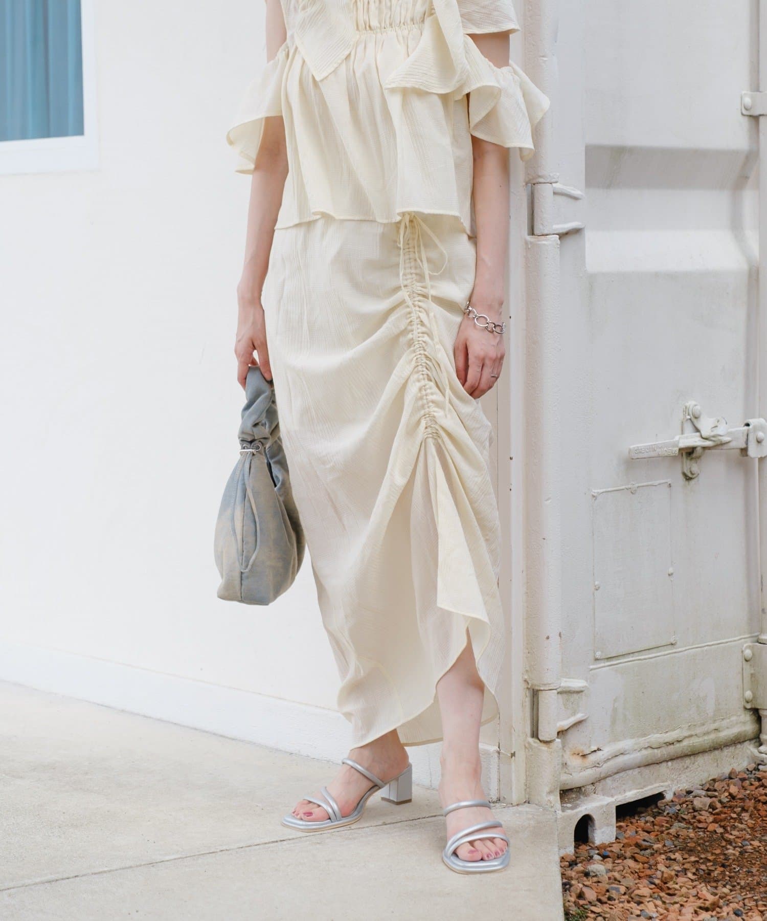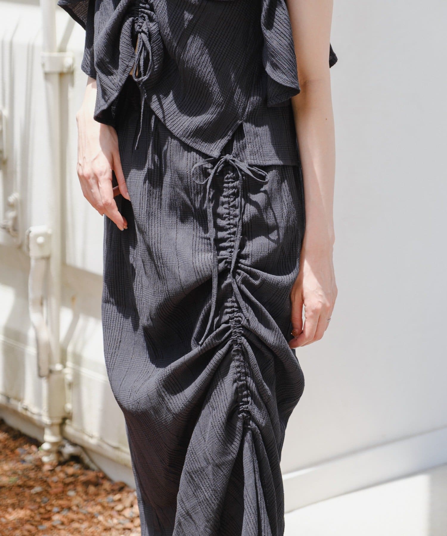 スカートはフロント部分が絞れるようになっているので、丈感やシルエットを変えることができるデザイン。