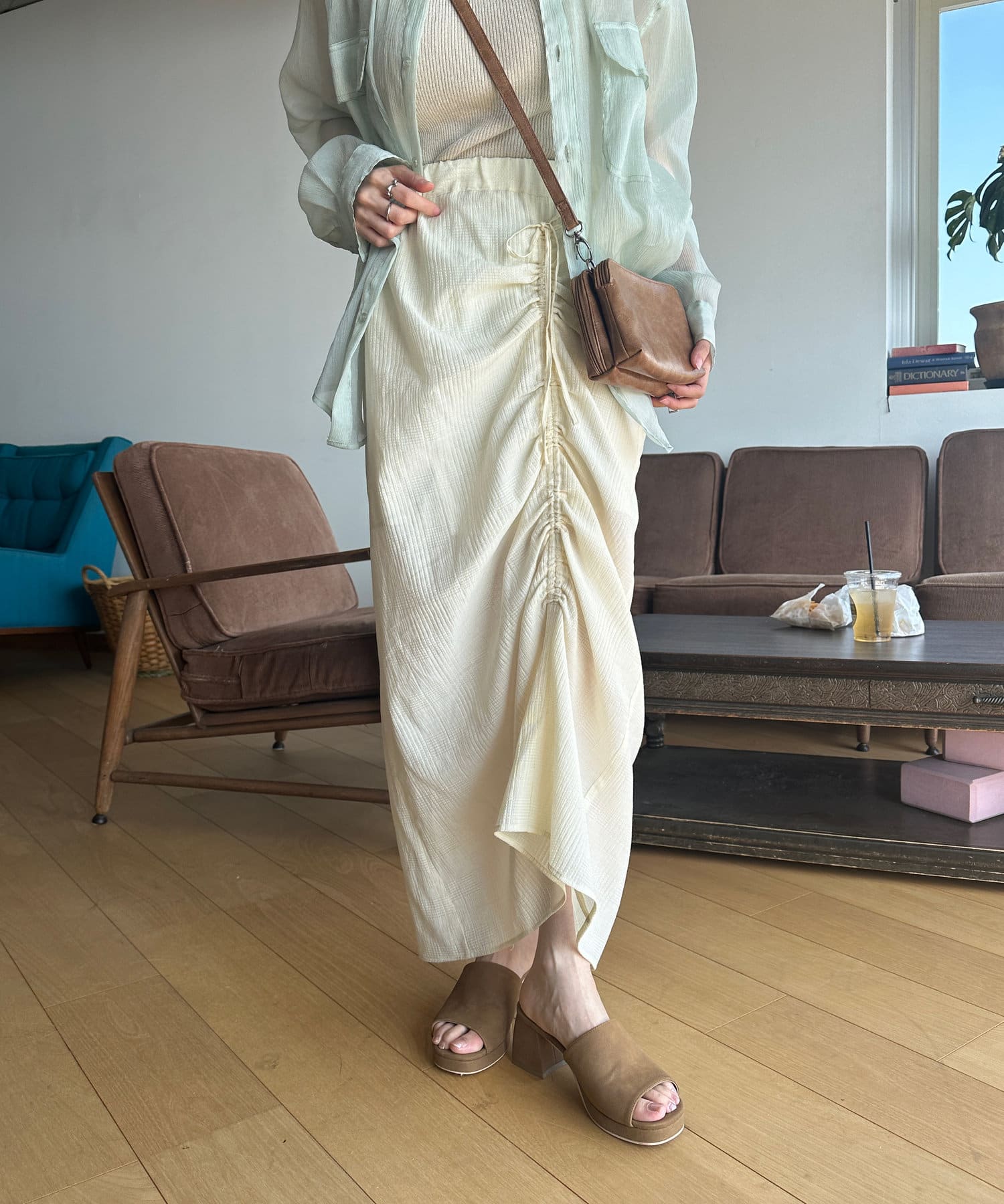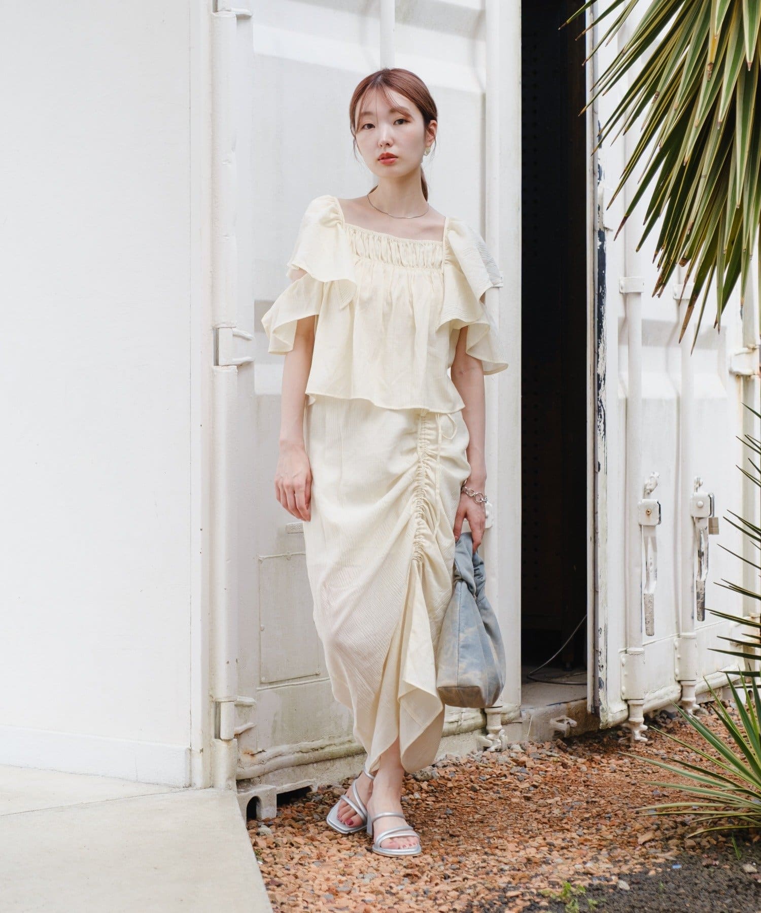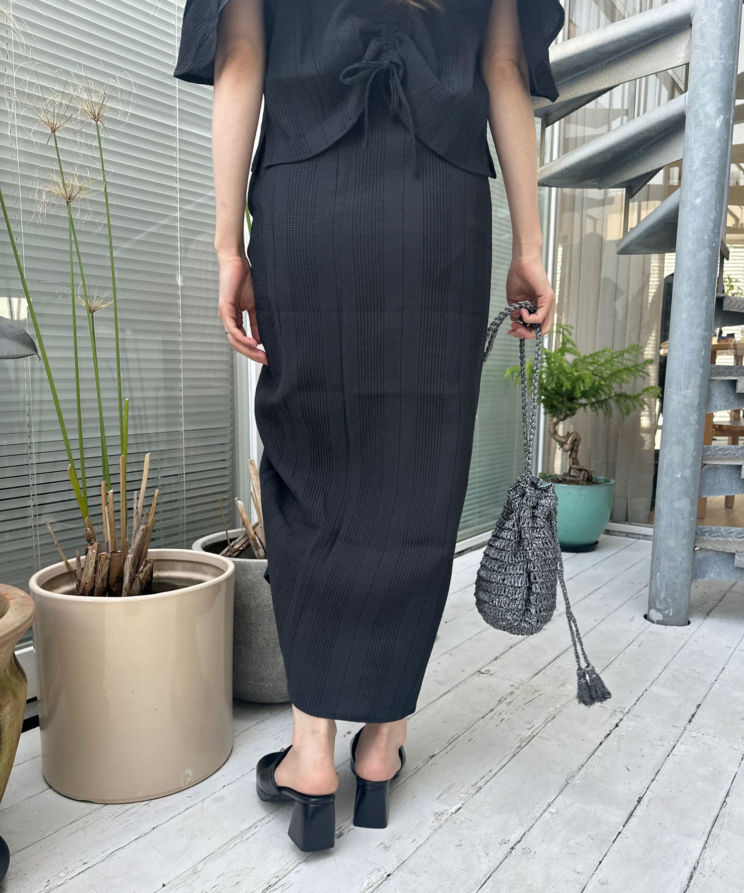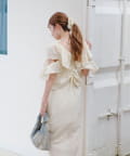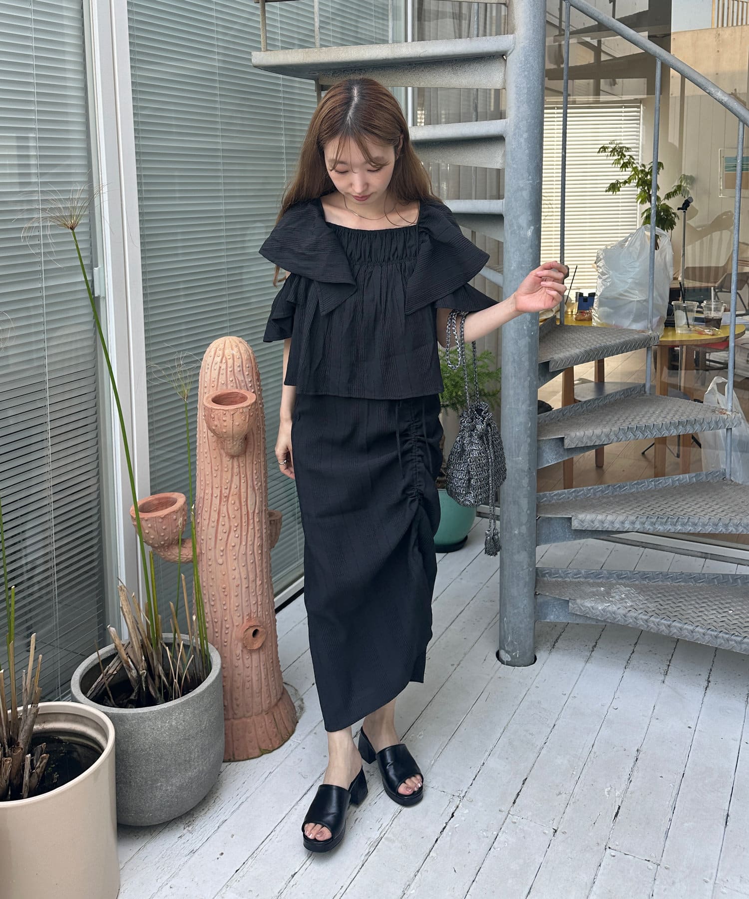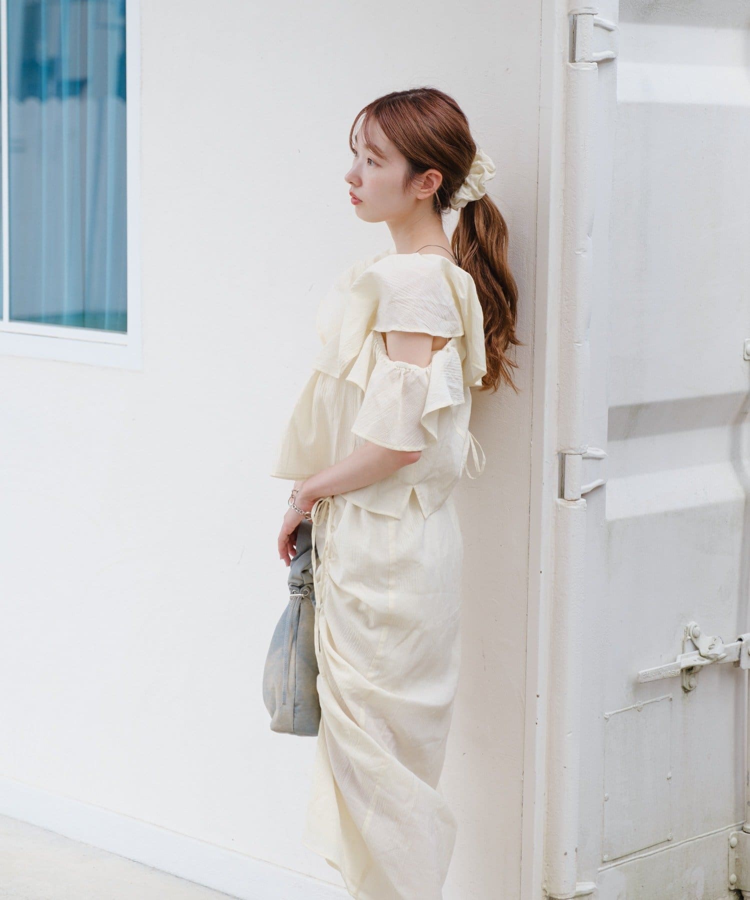 スカートはフロント部分が絞れるようになっているので、丈感やシルエットを変えることができるデザイン。