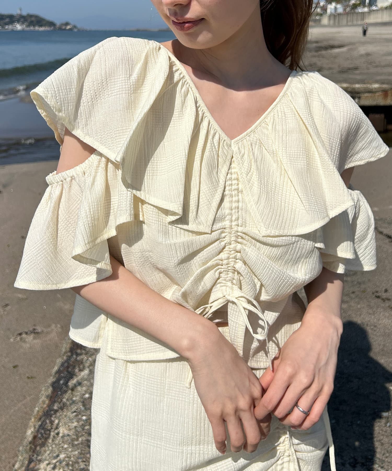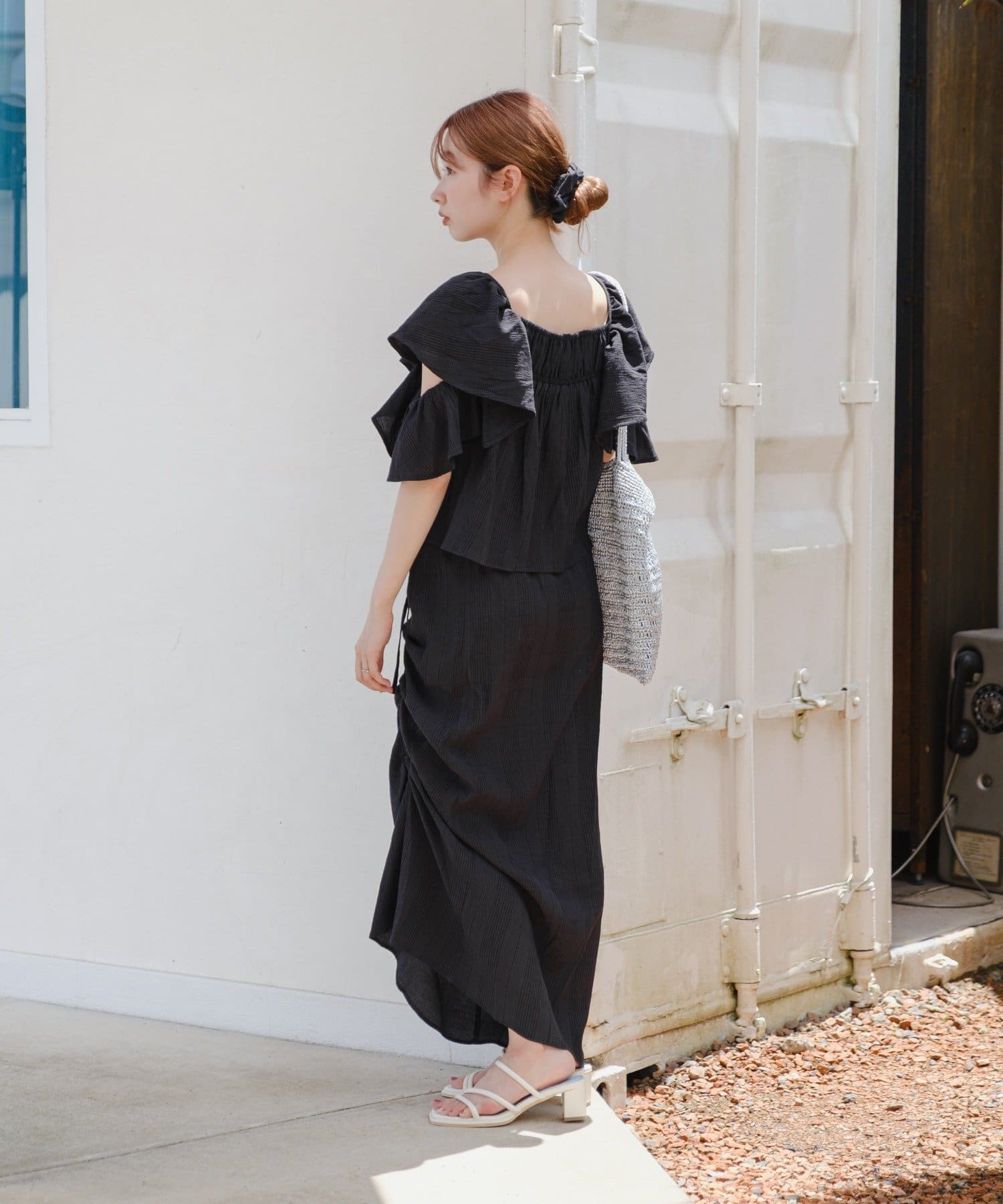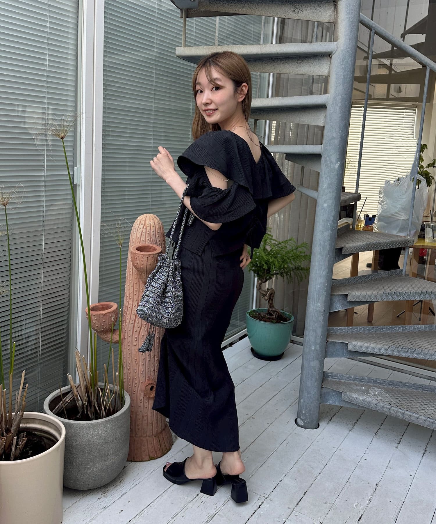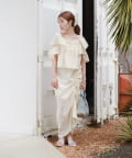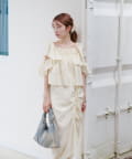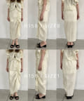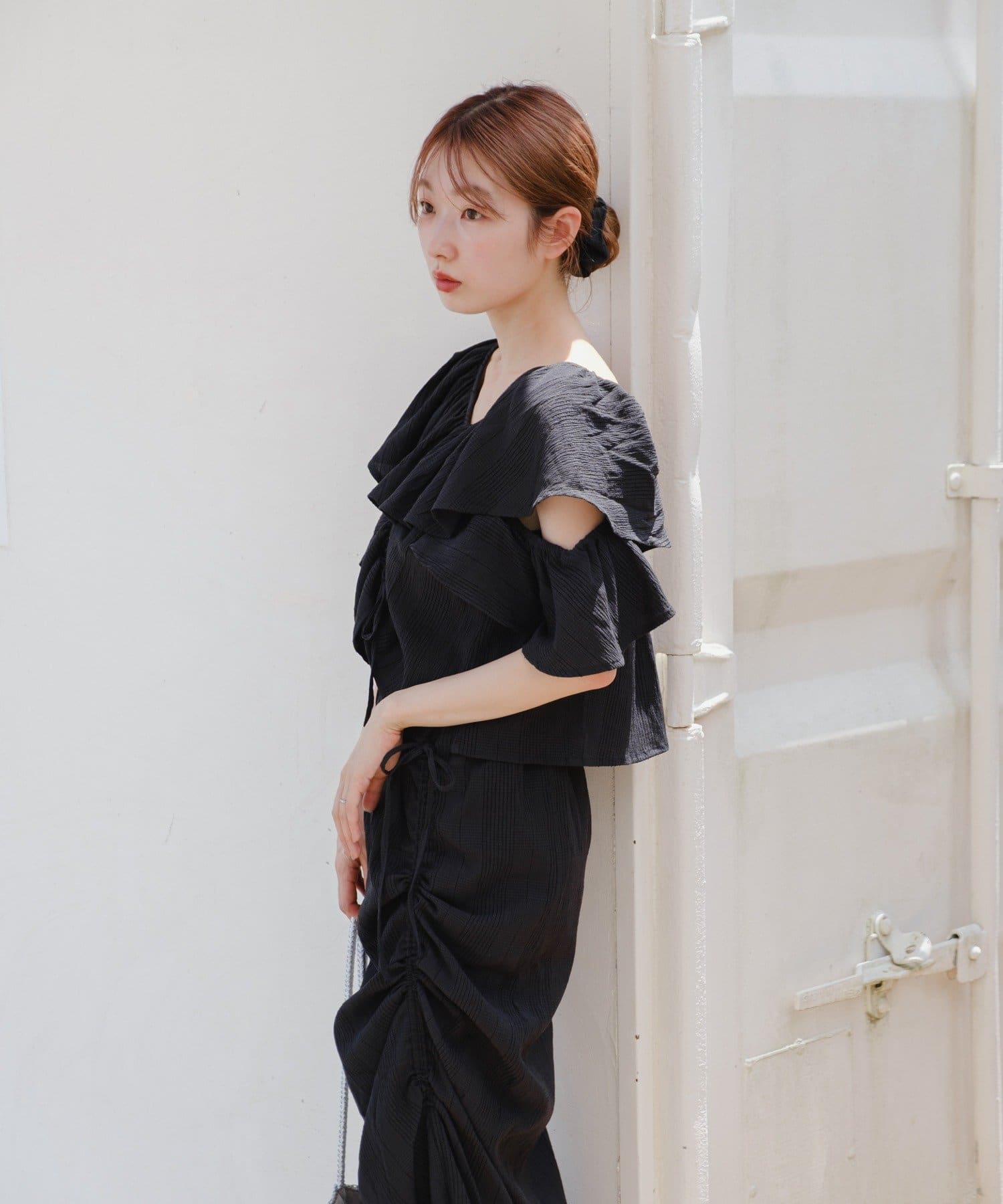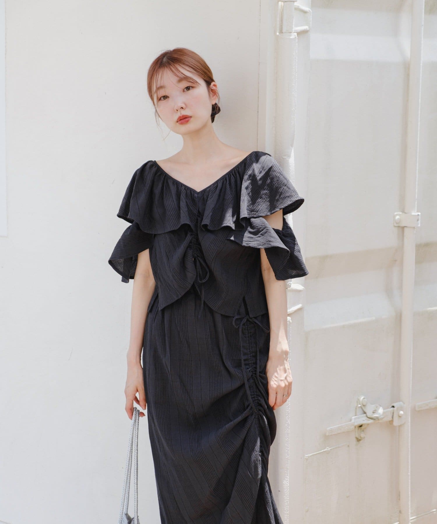 スカートはフロント部分が絞れるようになっているので、丈感やシルエットを変えることができるデザイン。