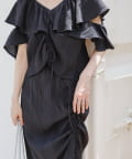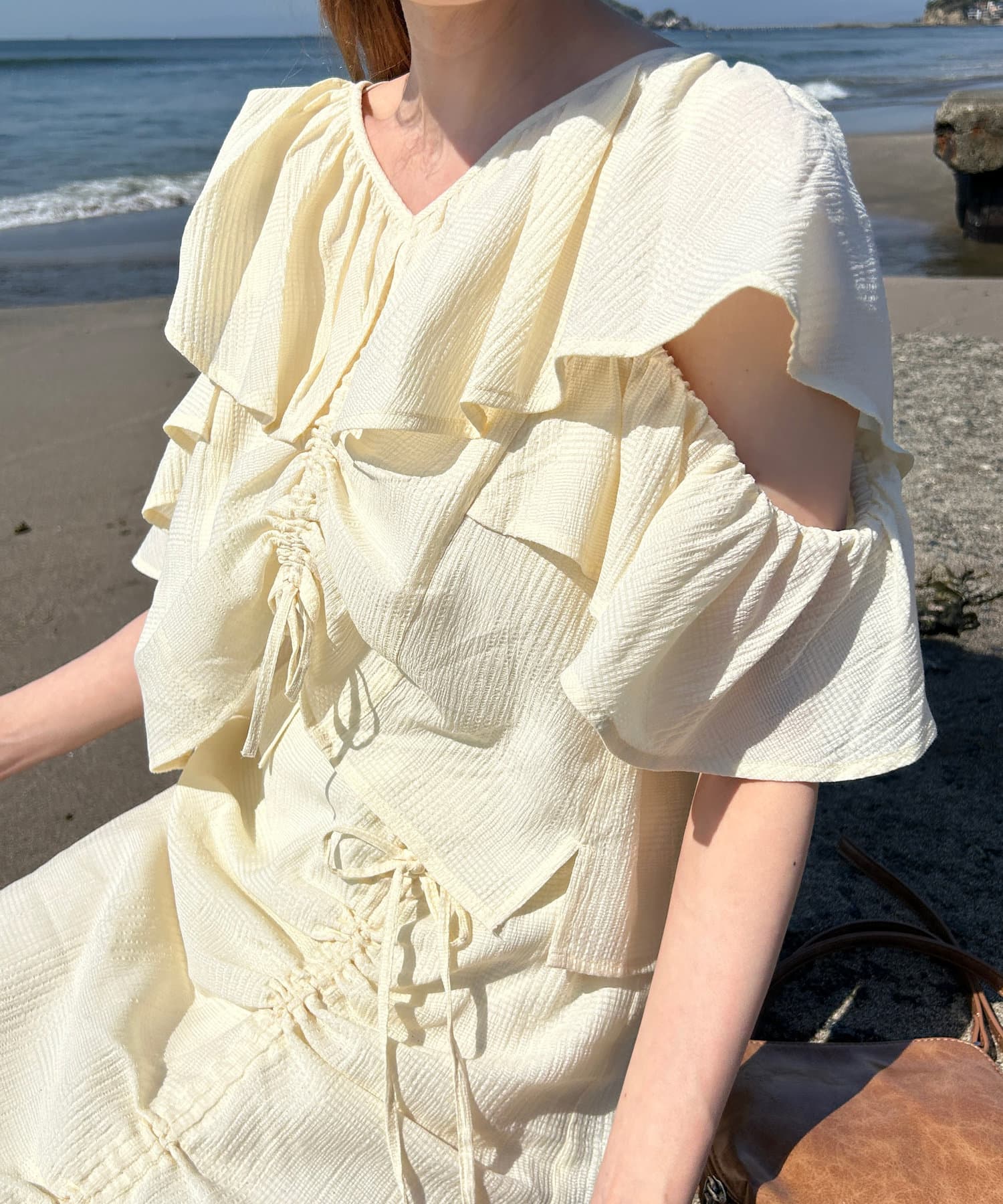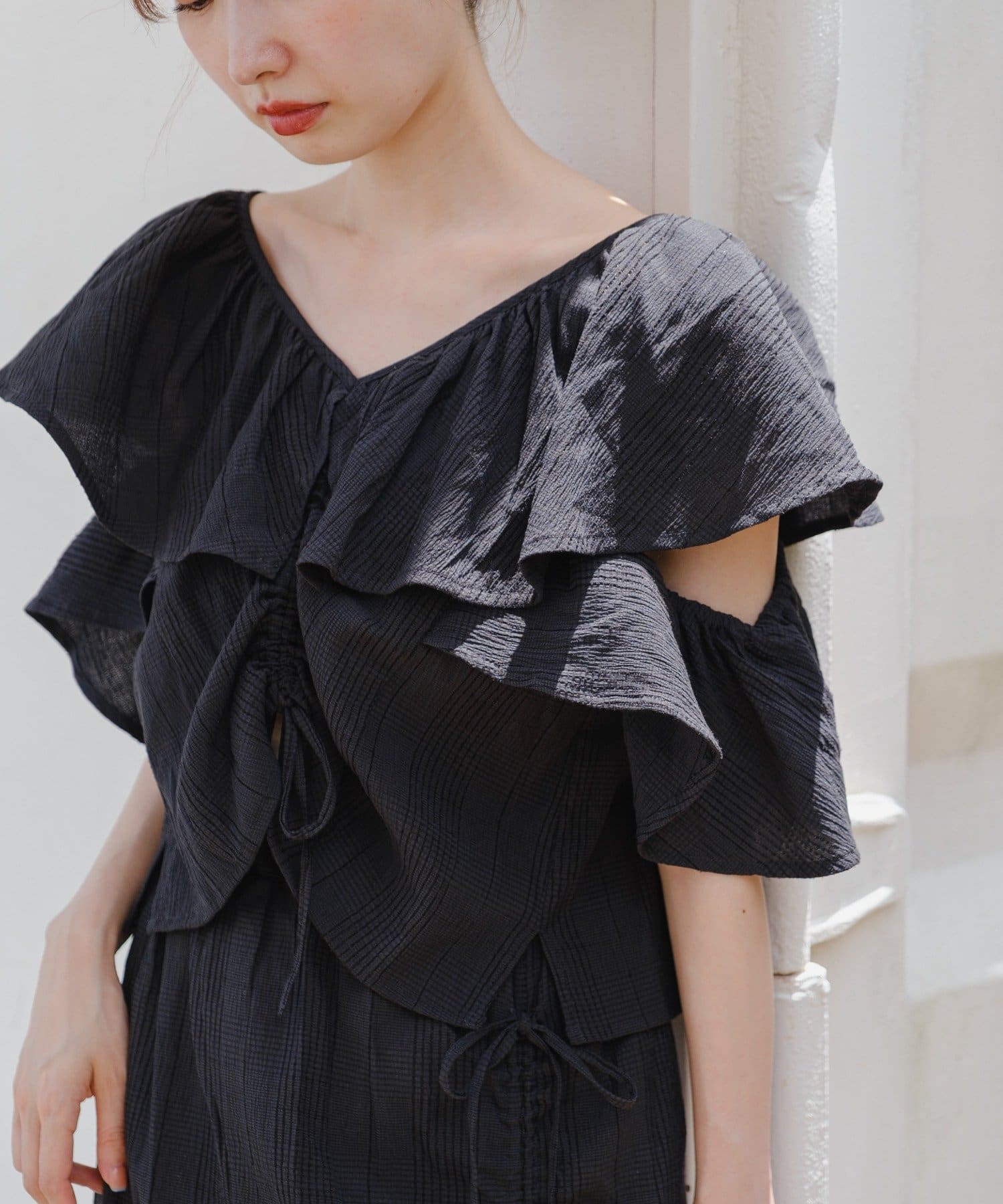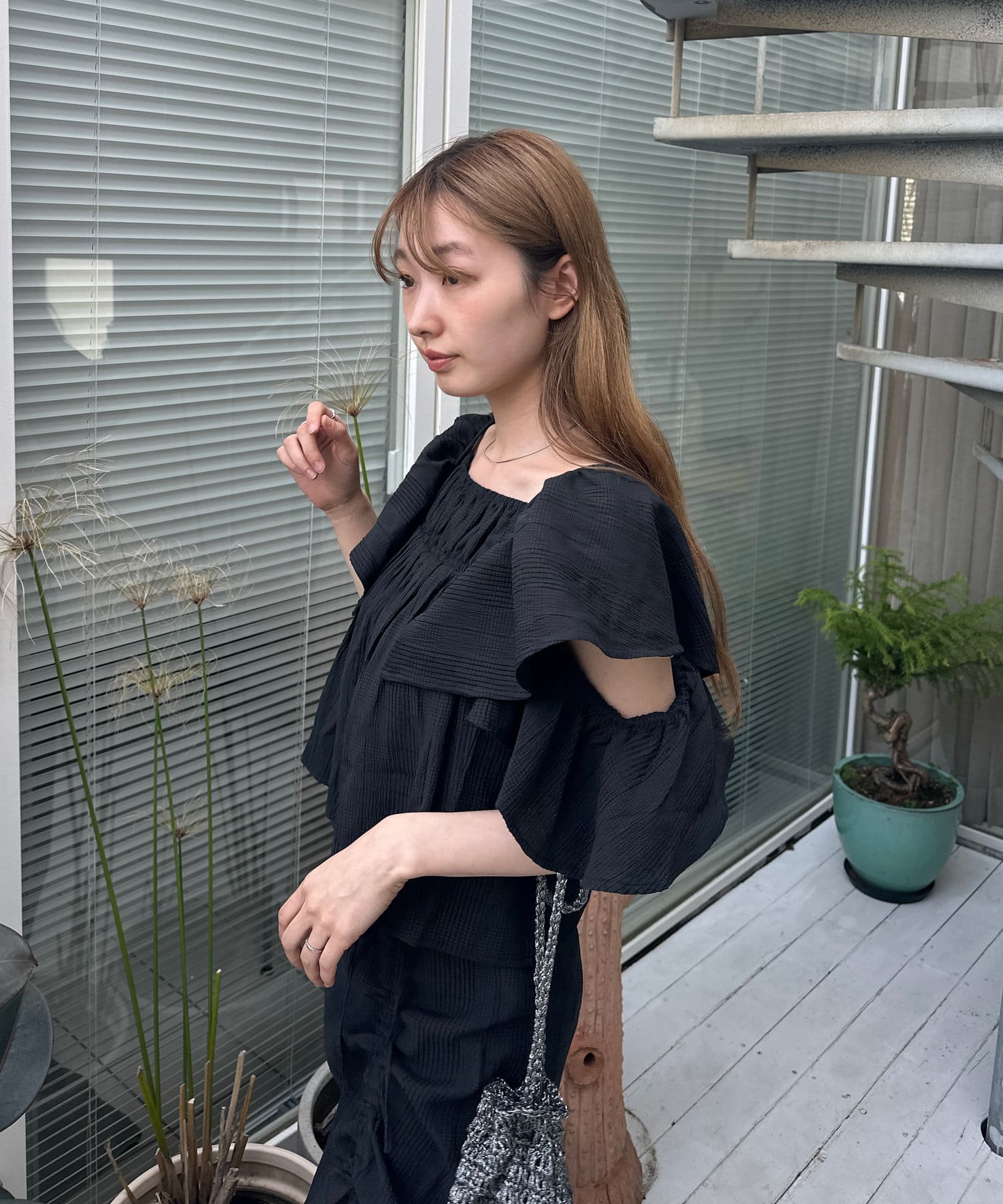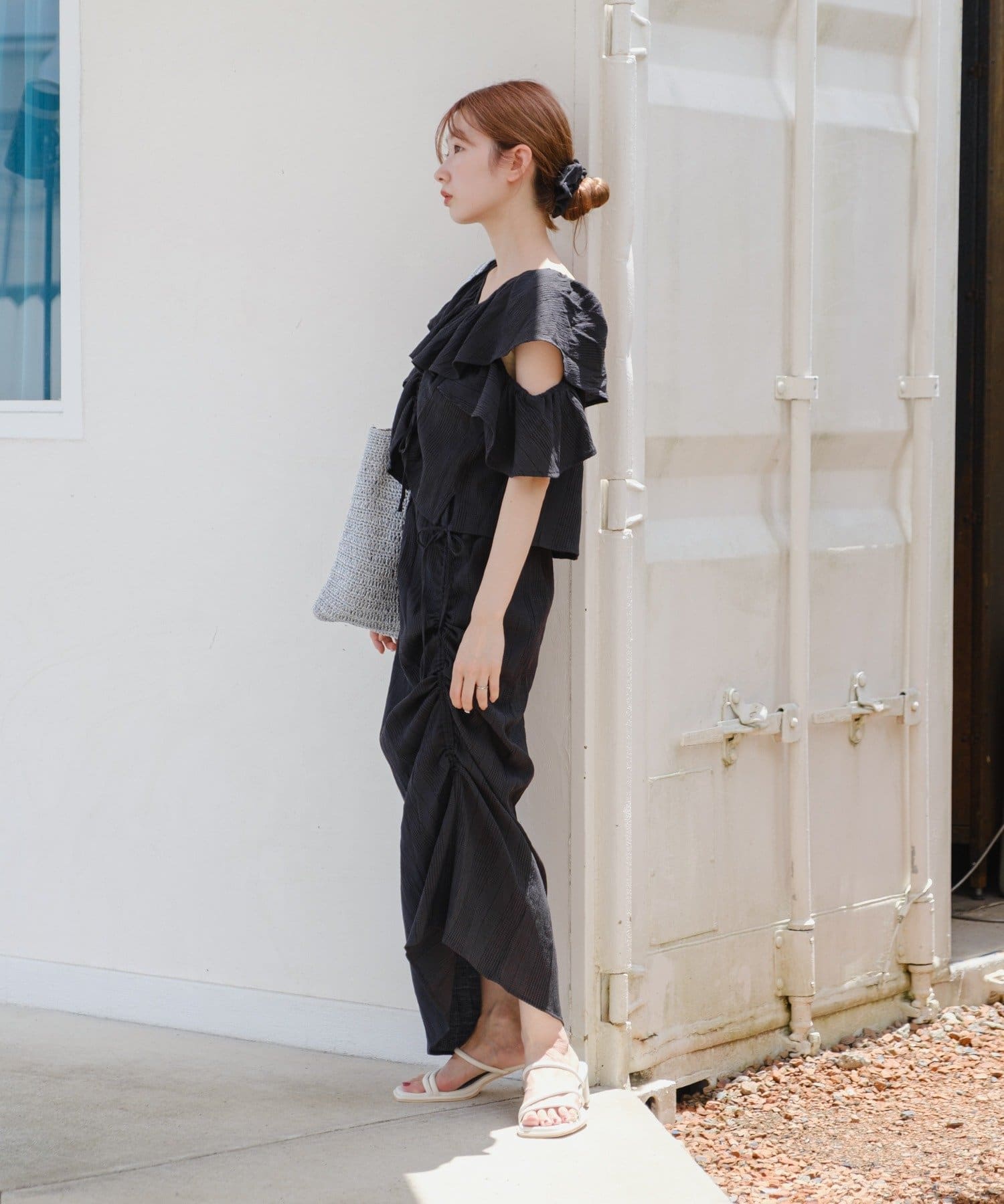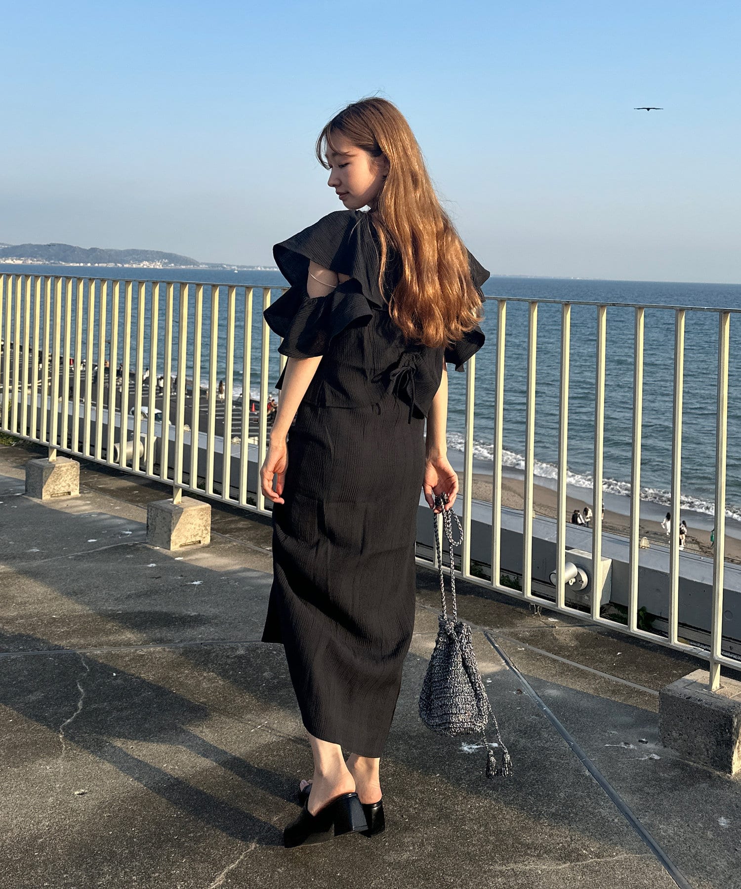 スカートはフロント部分が絞れるようになっているので、丈感やシルエットを変えることができるデザイン。